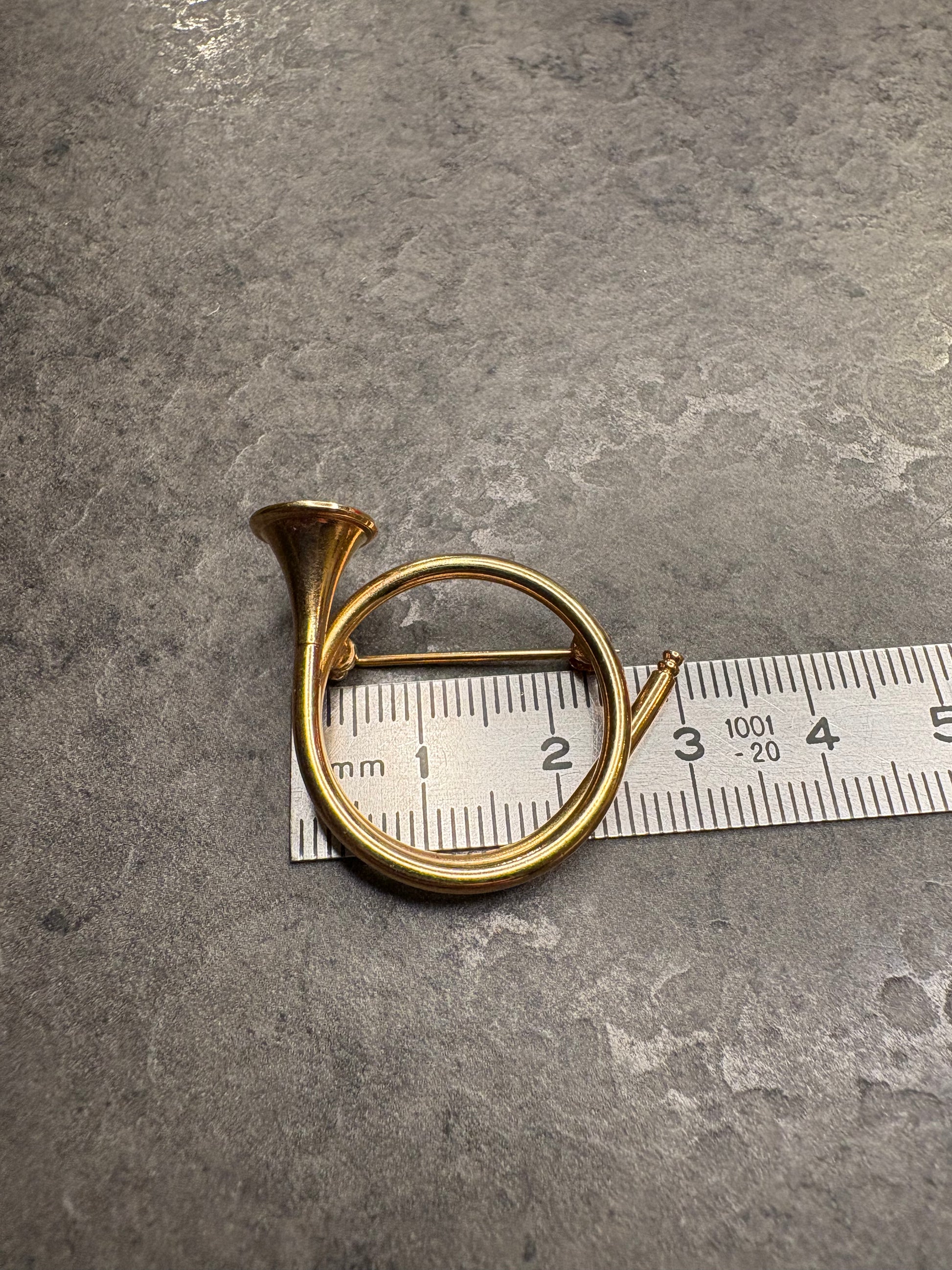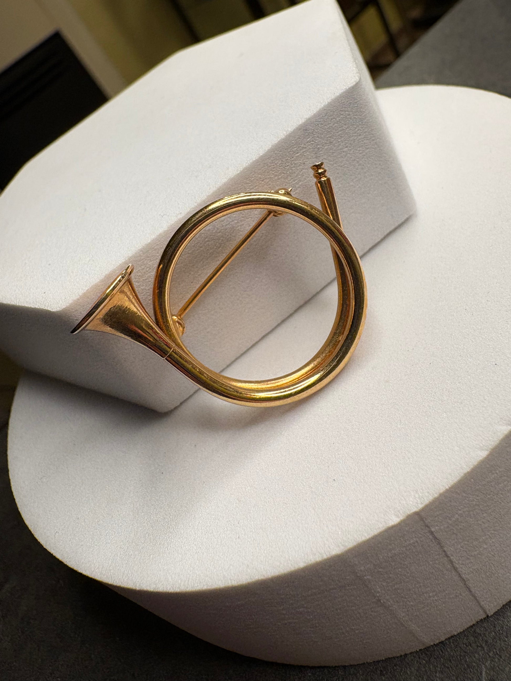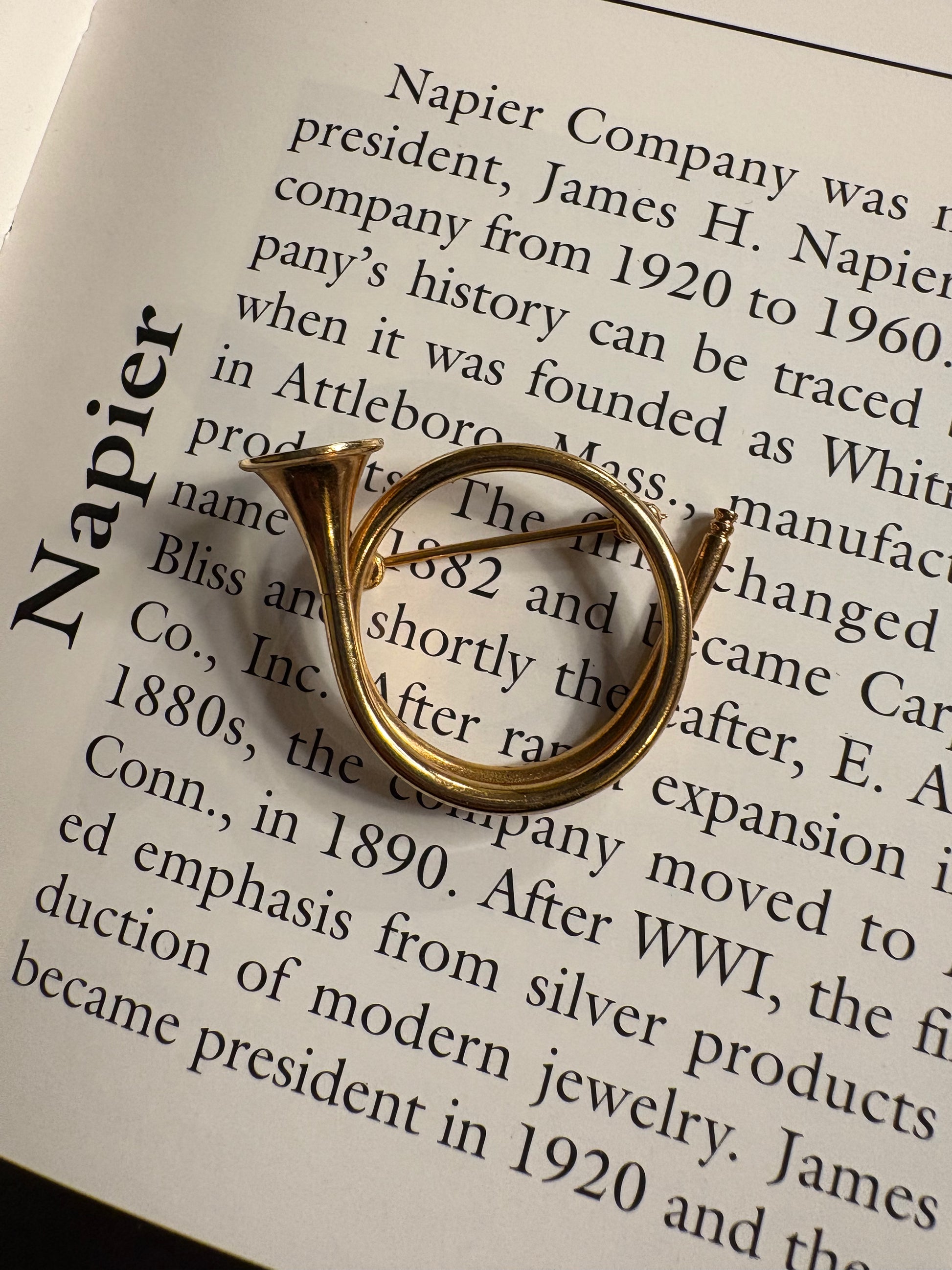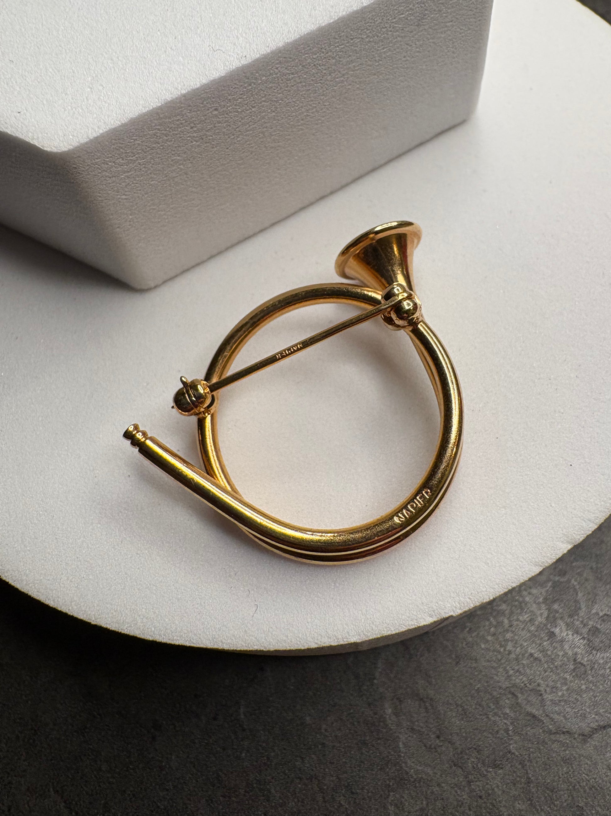 Originalissima spilla vintage firmata Napier, realizzata in metallo dorato, raffigurante uno strumento musicale a fiato stilizzato (tromba/corno).