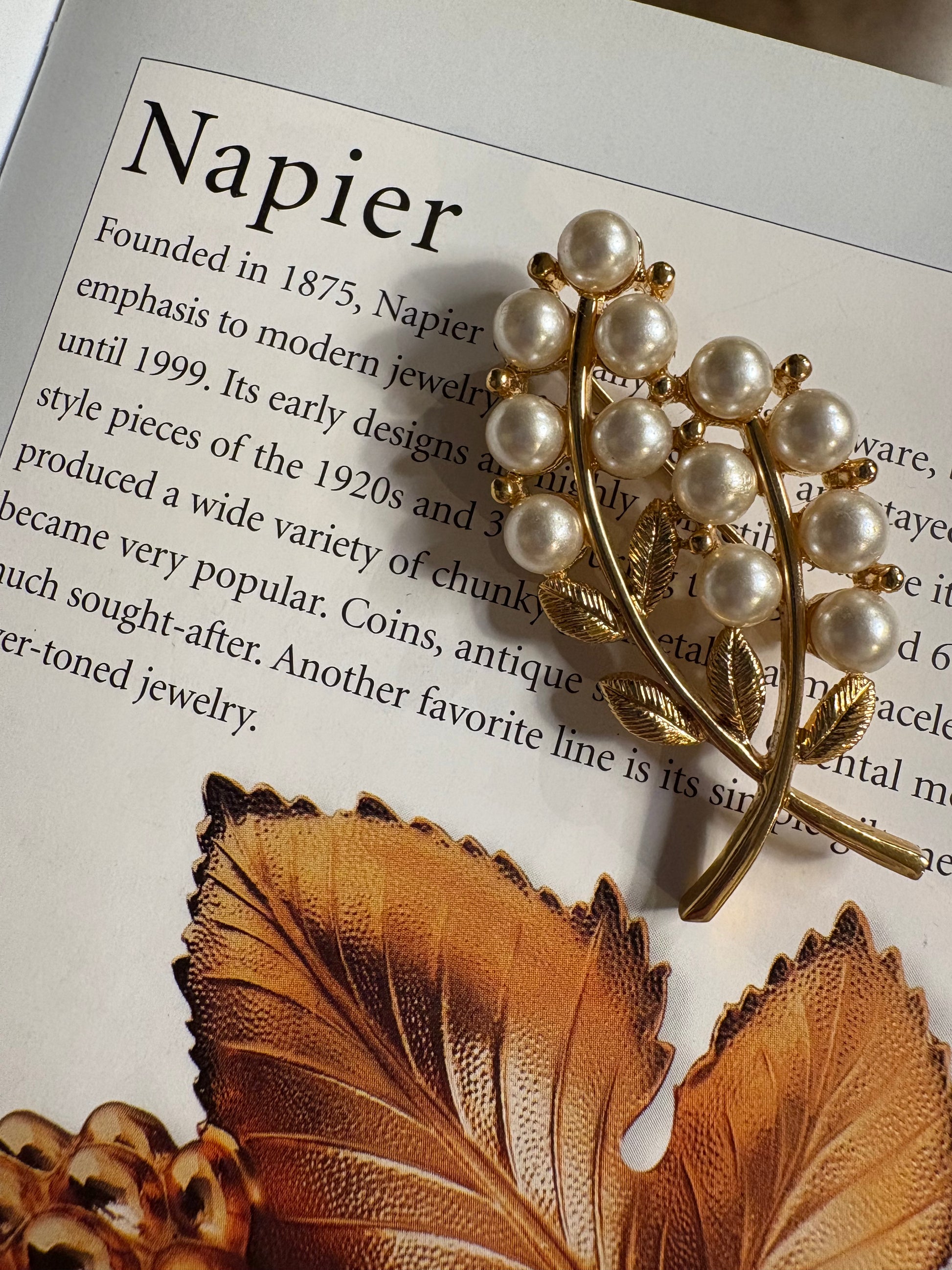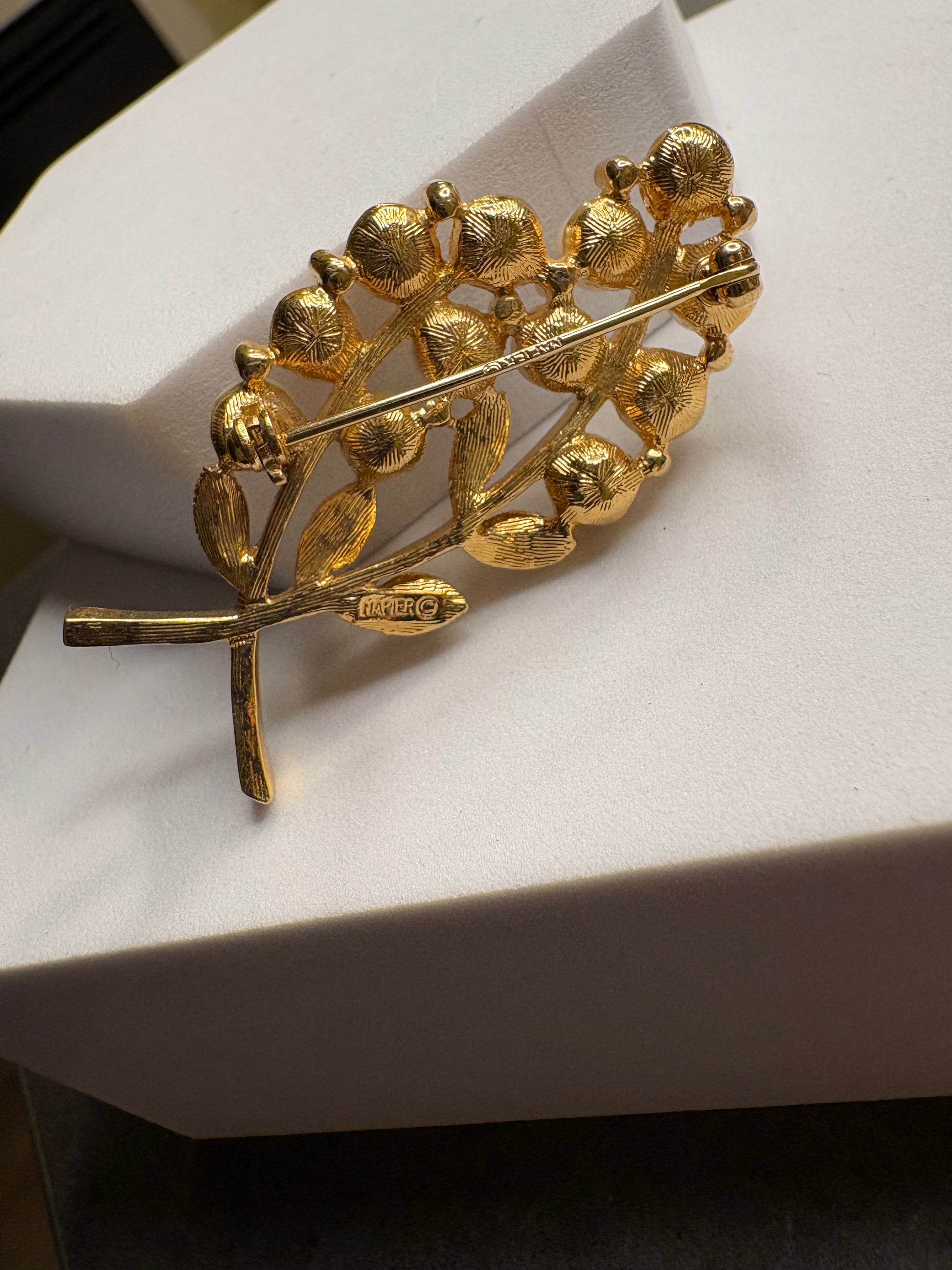 Questa splendida spilla vintage firmata Napier cattura subito l’attenzione con il suo design elegante, ispirato a un ramo fiorito, come mosso da una leggera brezza. Il metallo dorato, lavorato con finitura satinata e lucida , crea giochi di luce caldi e sofisticati, mettendo in risalto ogni curva del motivo botanico.