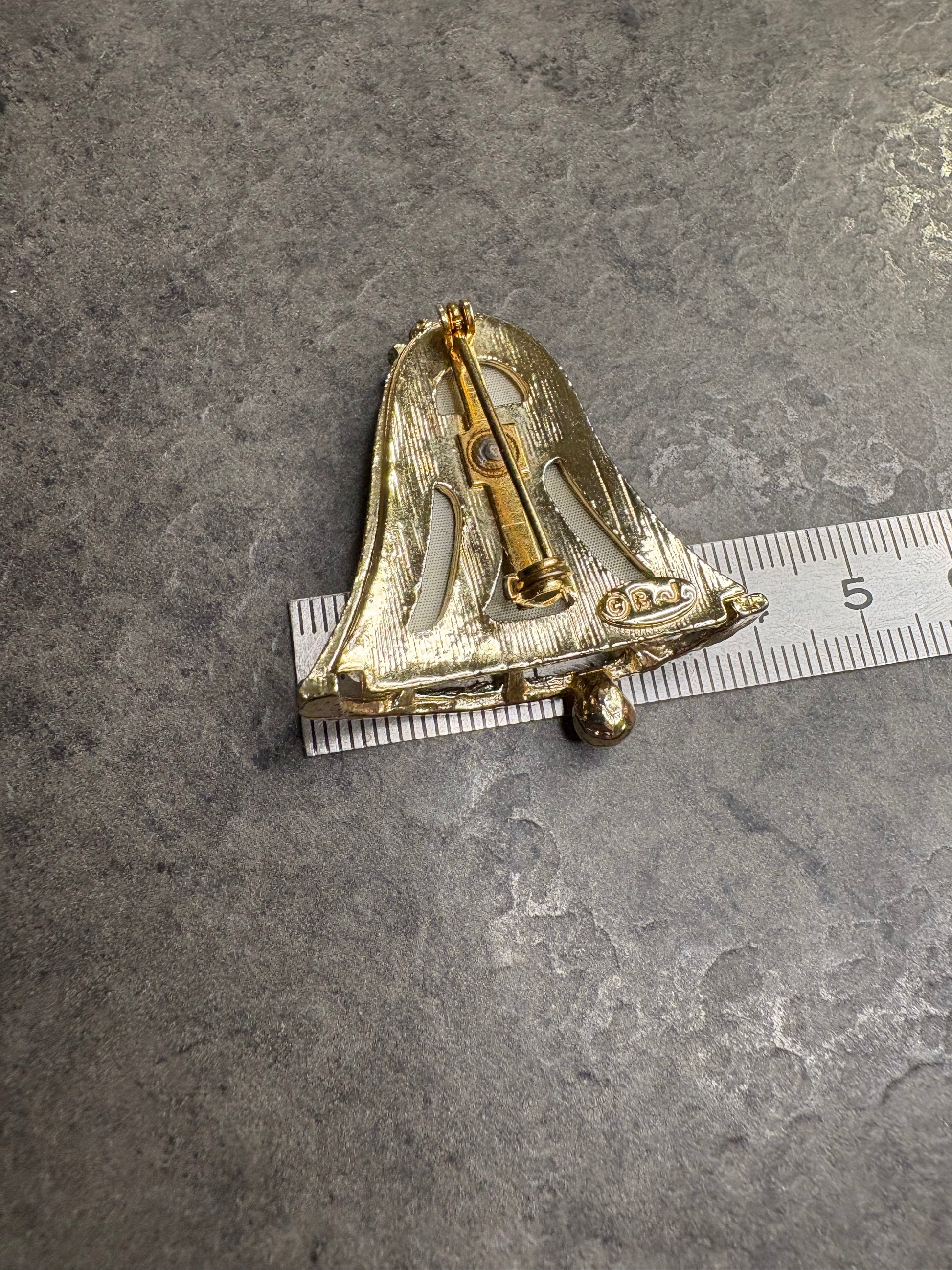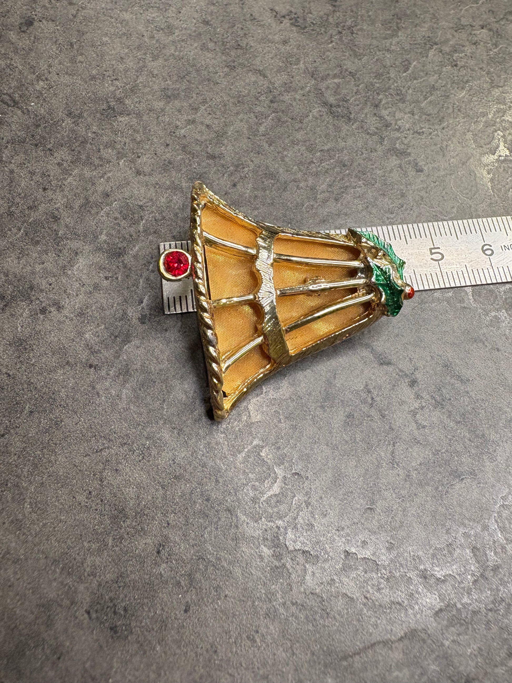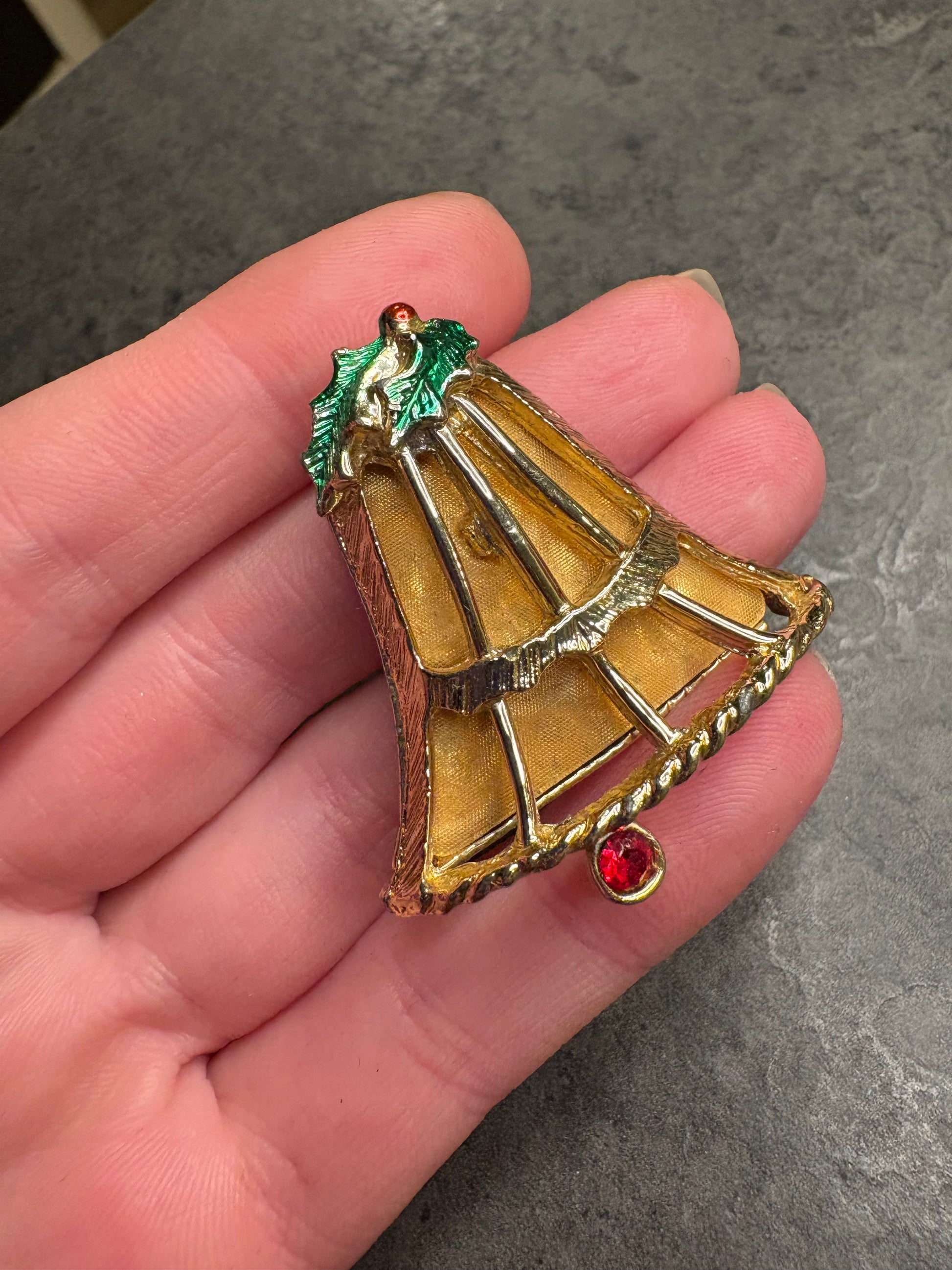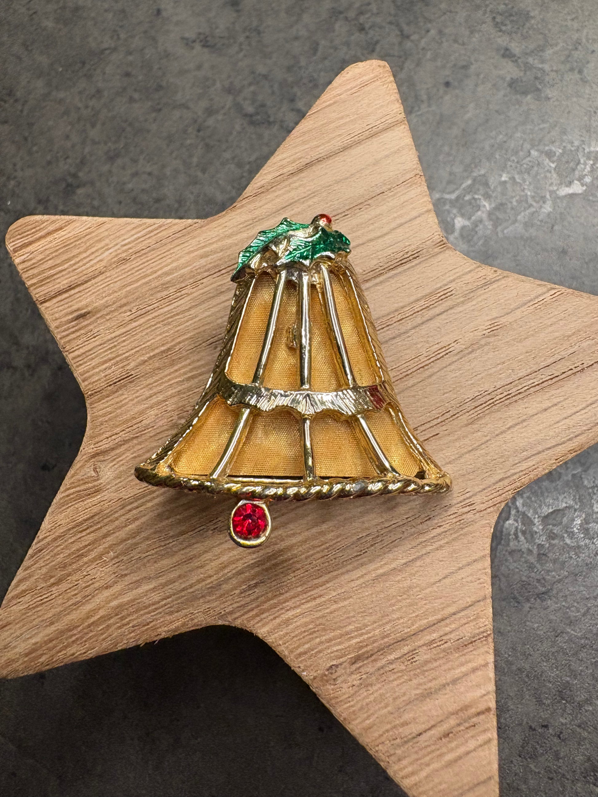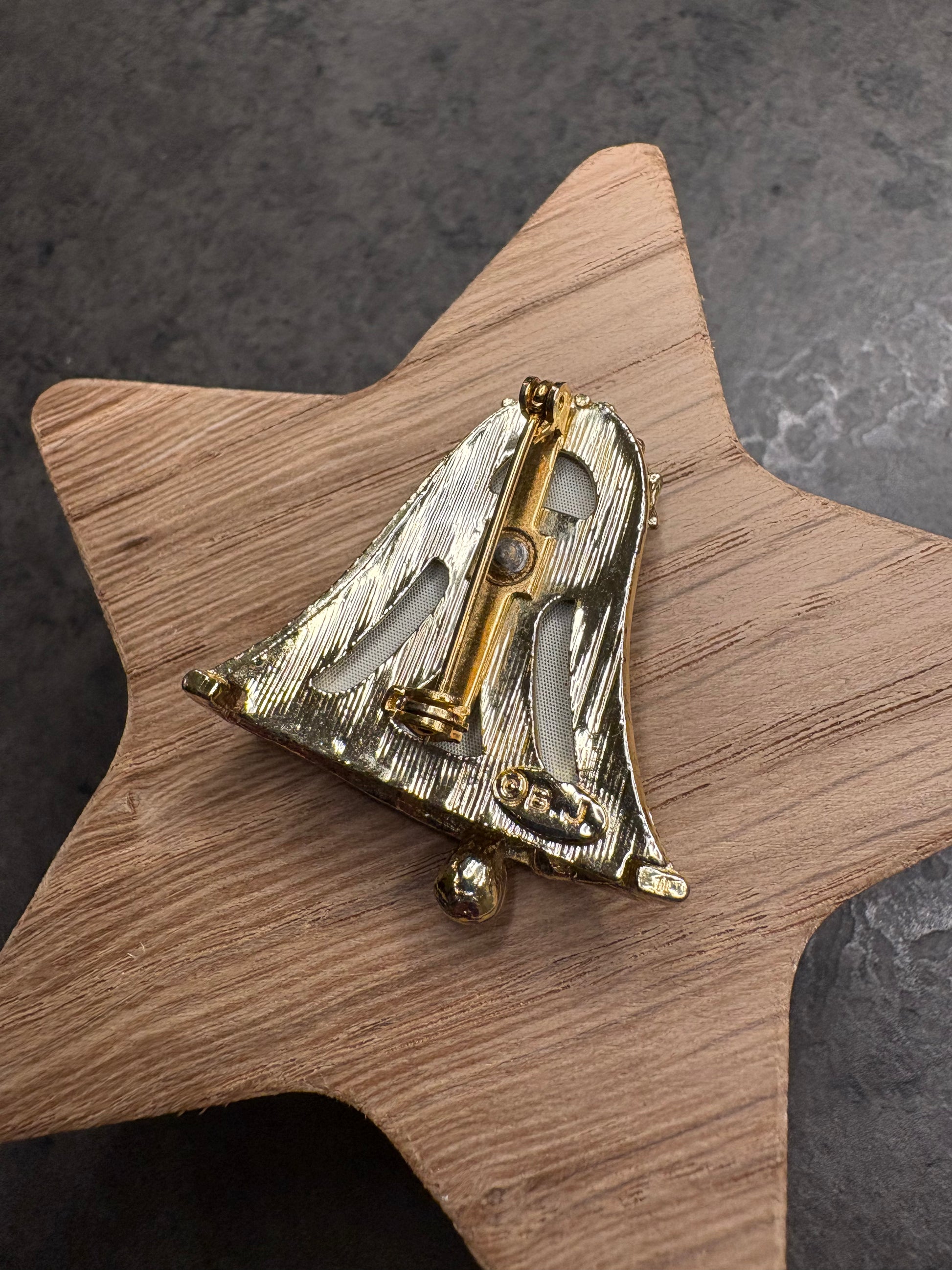 Questa splendida spilla natalizia vintage, realizzata tra la fine degli anni ’70 e i primi ’80 e firmata B.J. (Beatrix’s Jewels), incanta con il suo design caldo e luminoso. Rappresenta una campana festiva dal profilo elegante, modellata in metallo dorato con una lavorazione a rilievo che ricrea l’effetto del tessuto drappeggiato. L’interno della campana è rivestito da un raffinato fondo dorato satinato, attraversato da linee lucide che ne esaltano la tridimensionalità. La parte superiore è impreziosita da una piccola foglia di agrifoglio smaltata in verde brillante, con una bacca rossa a donare il tocco natalizio per eccellenza. Alla base, come pendente, scintilla un cristallo rosso sfaccettato che richiama il movimento del batacchio. Sul retro compare la caratteristica firma B.J., testimonianza dell’origine e del periodo produttivo. Nonostante l’età, mostra soltanto lievissimi segni del tempo, mantenendo intatto tutto il suo fascino. Un gioiello decorativo delizioso, perfetto per aggiungere un dettaglio elegante e nostalgico ai look delle feste.