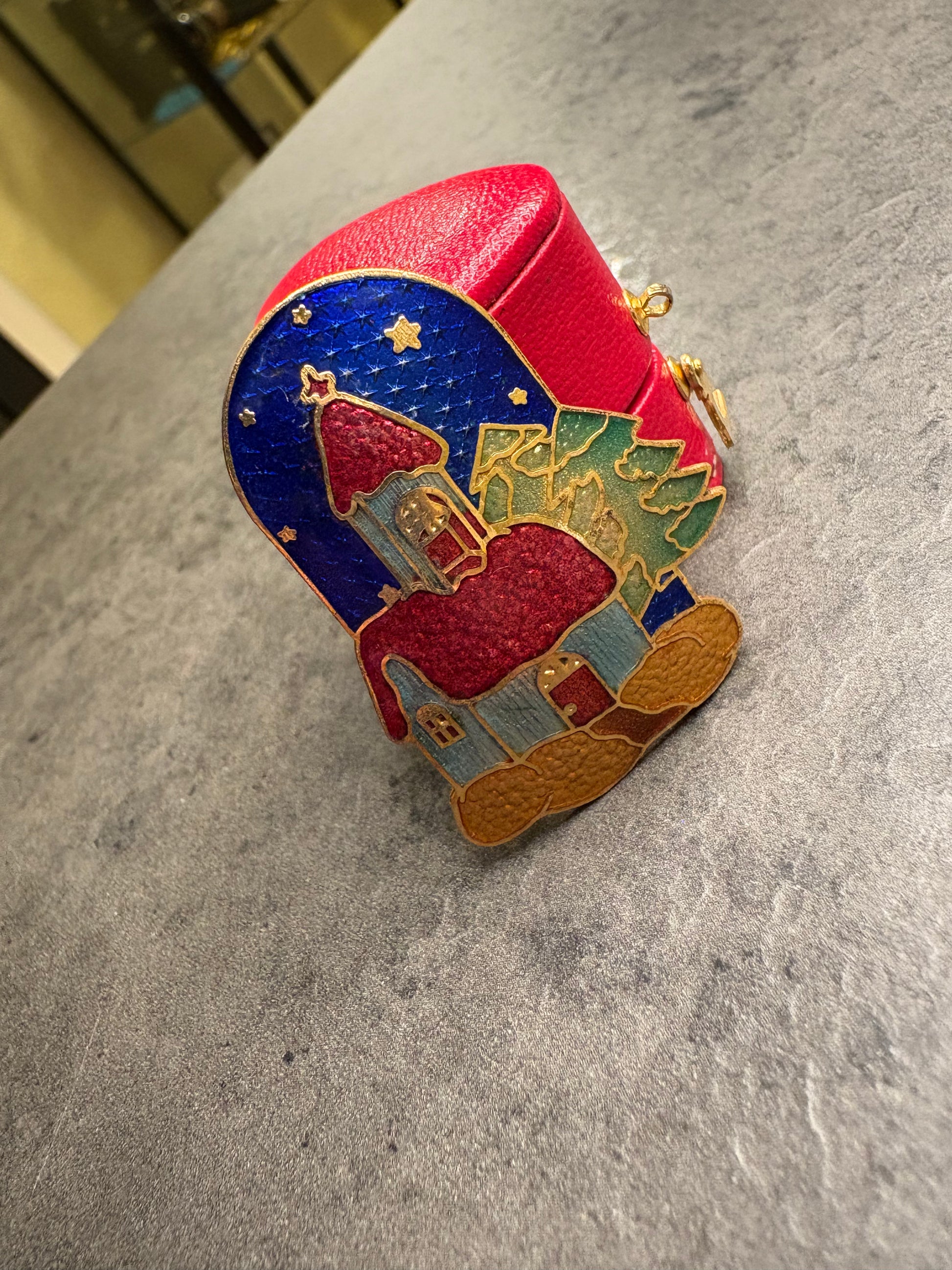 Dolcissima spilla natalizia vintage realizzata in metallo dorato con smalti luminosi.