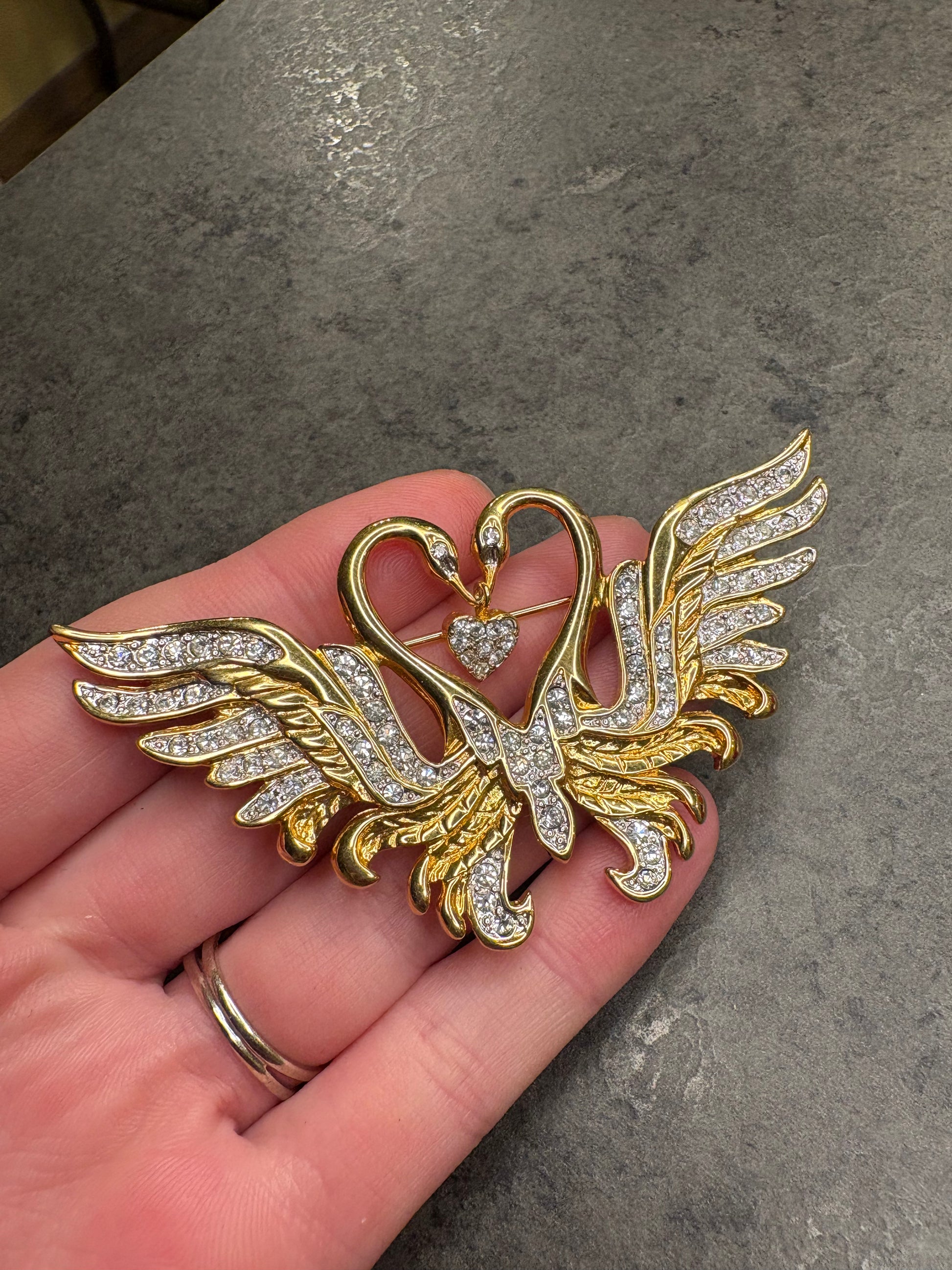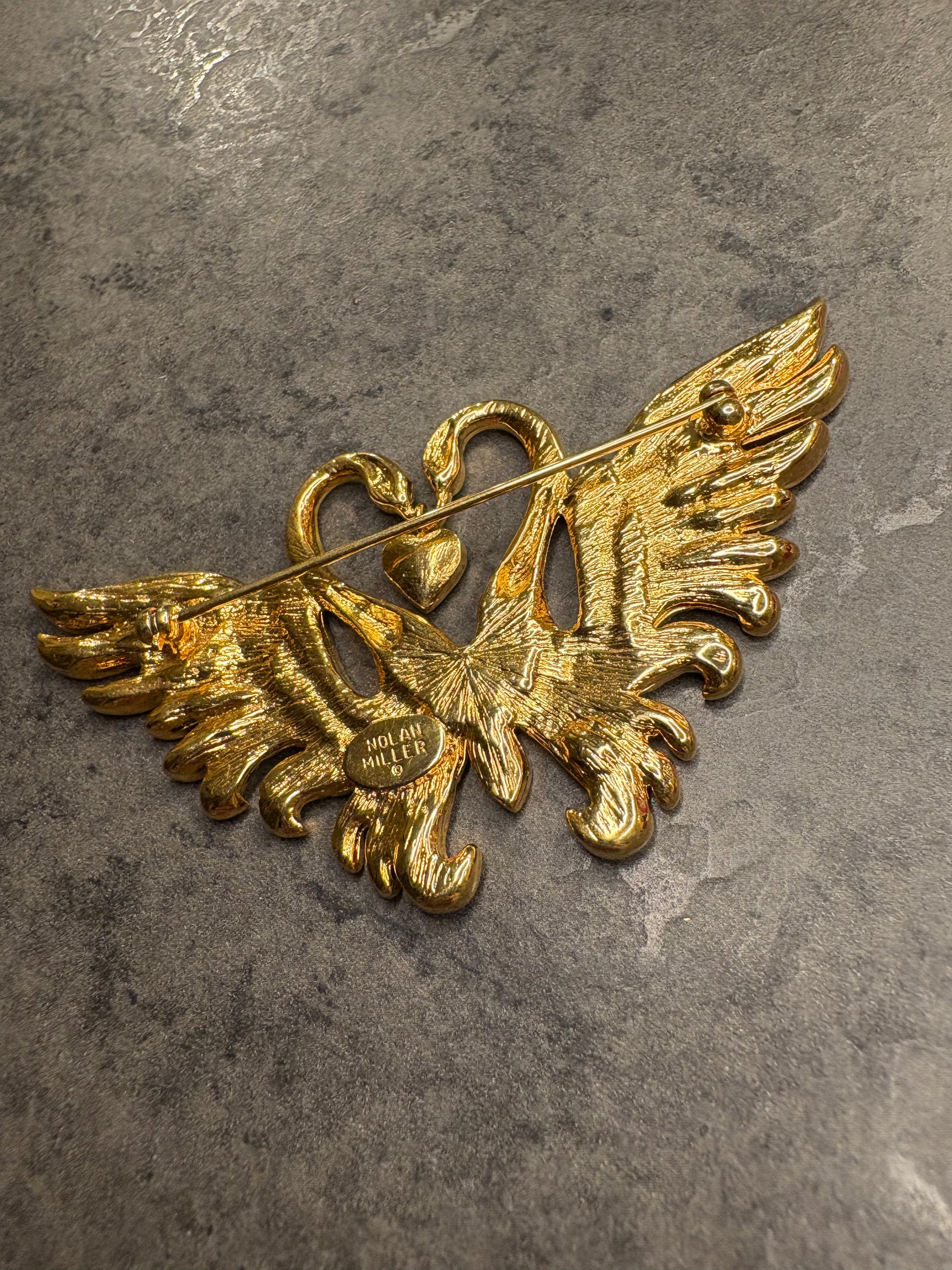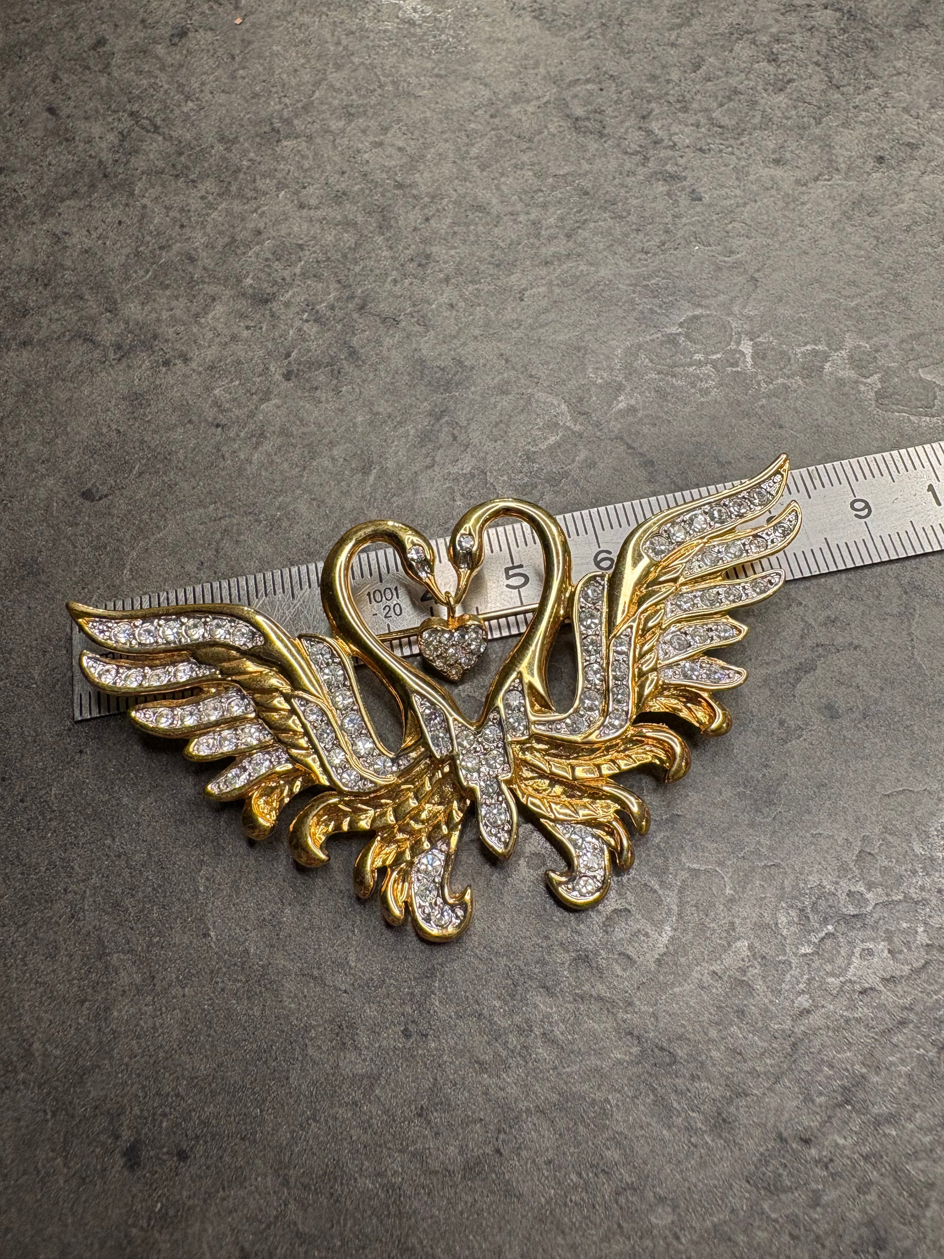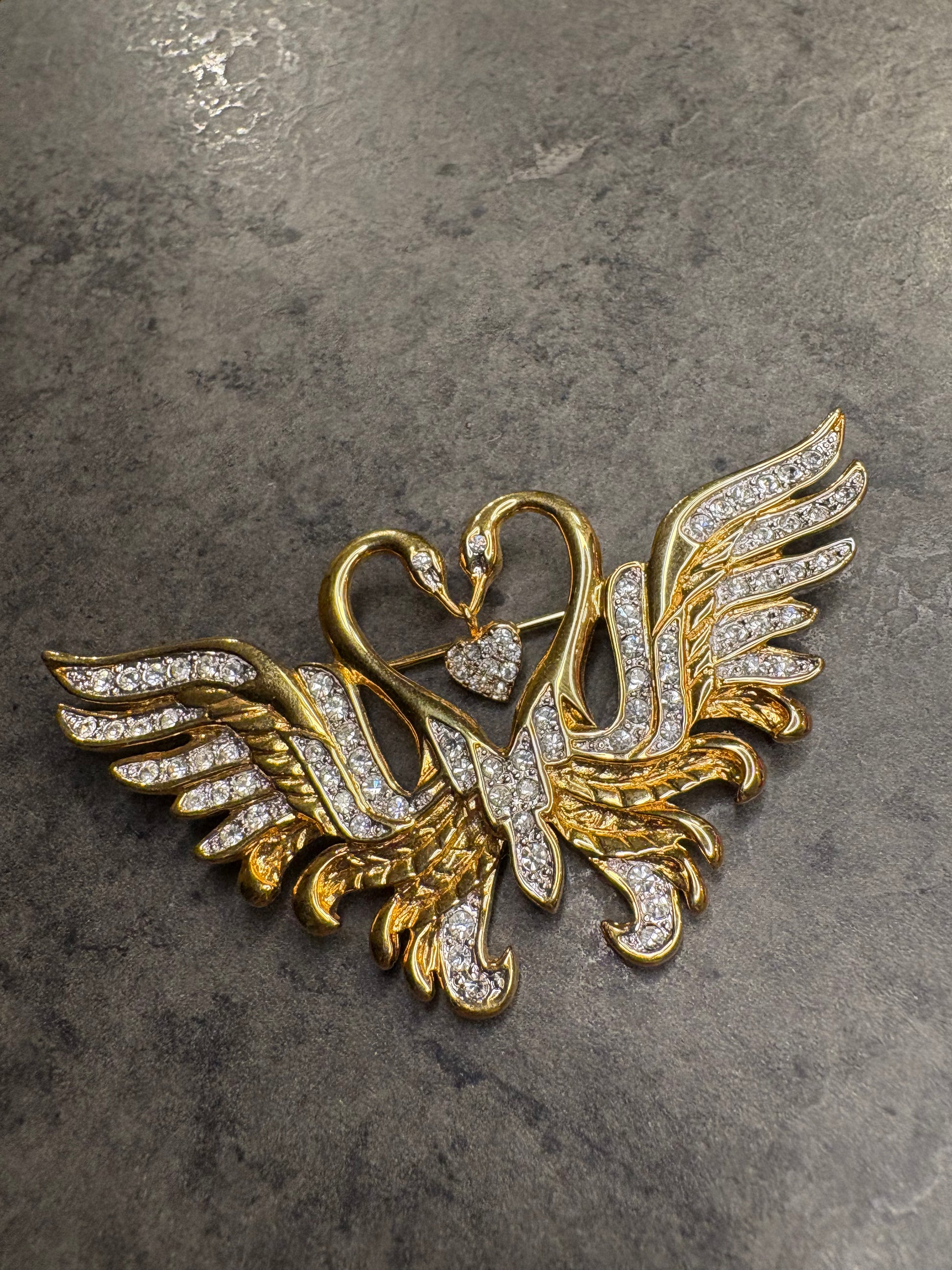 Una meravigliosa spilla da collezione firmata Nolan Miller, caratterizzata da un design scenografico che unisce raffinatezza e simbolismo. Il gioiello raffigura due maestosi cigni dorati, le cui ali spiegate sono completamente impreziosite da una ricca pavé di cristalli luminosi. Le loro eleganti silhouette si incontrano al centro formando un cuore, da cui pende un piccolo charm a forma di cuore, anch’esso tempestato di cristalli scintillanti, che aggiunge un tocco romantico e prezioso alla composizione.