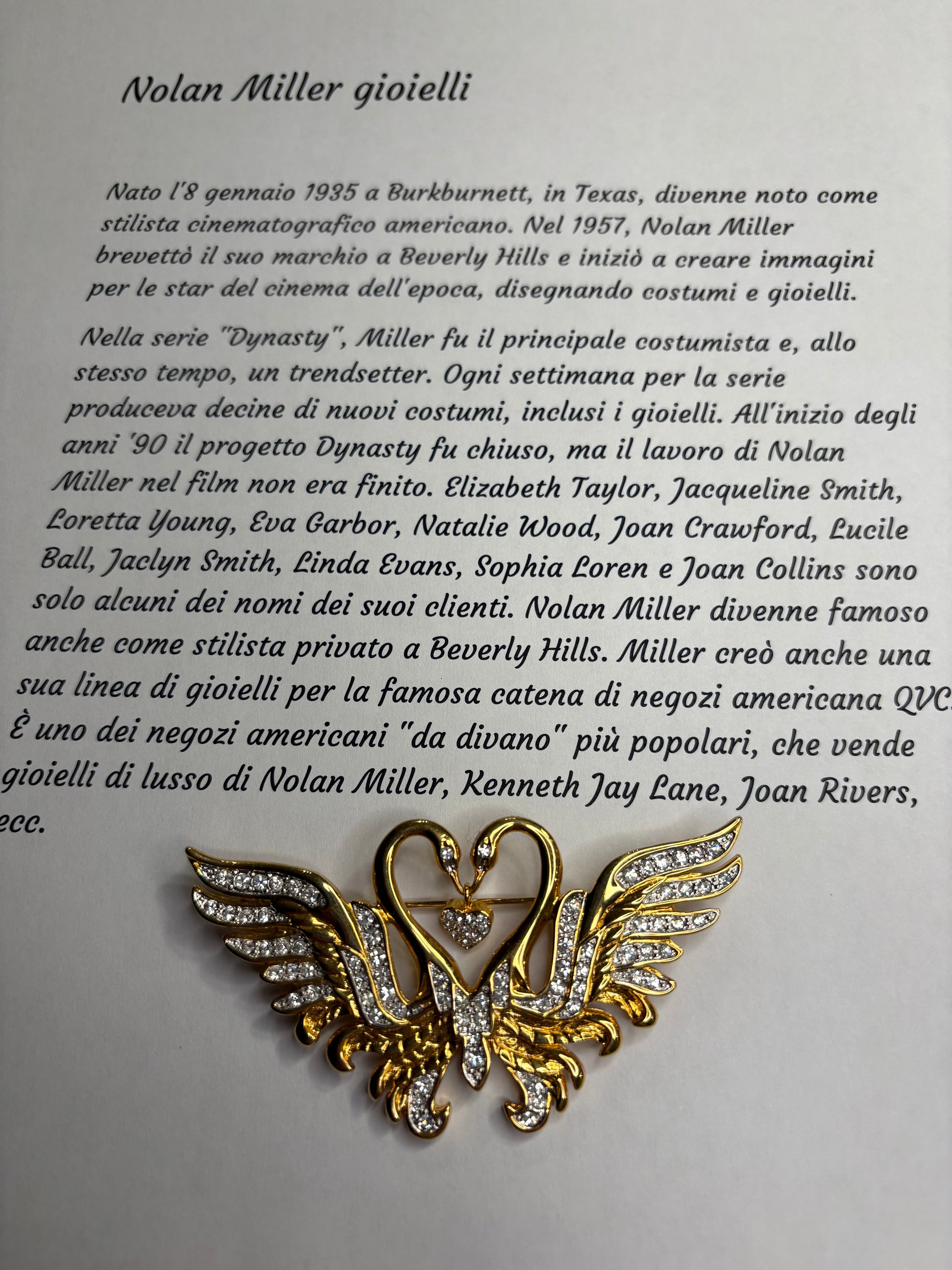 Il metallo dorato è lavorato con estrema cura, con dettagli fluidi e dinamici che valorizzano le piume e i profili dei cigni, esaltando la qualità artigianale tipica delle creazioni di Nolan Miller. Sul retro compare la firma incisa dell’artista, garanzia di autenticità e parte integrante della storia di questo designer iconico, noto per i suoi gioielli glamour amati dalle star e dai collezionisti.