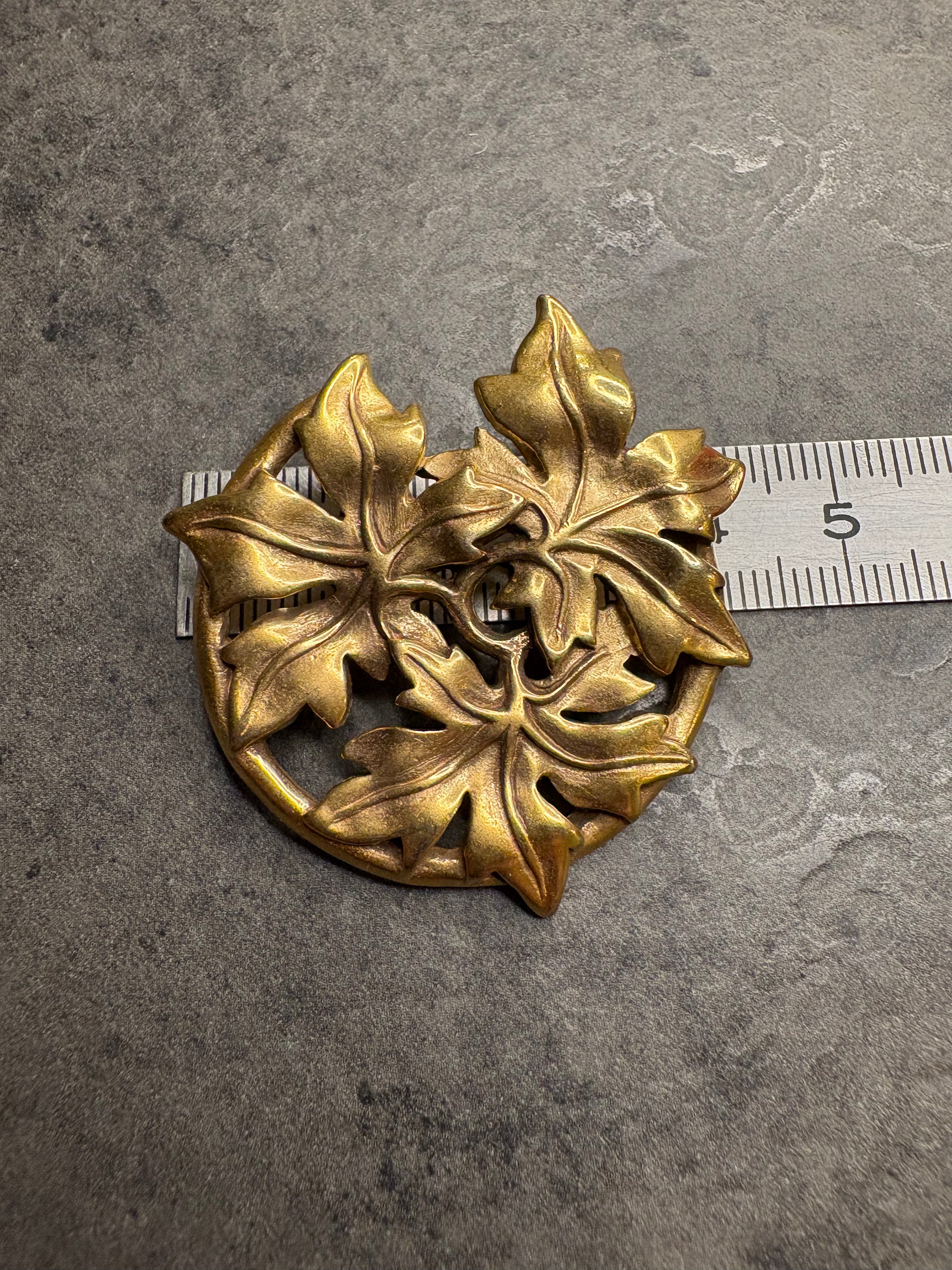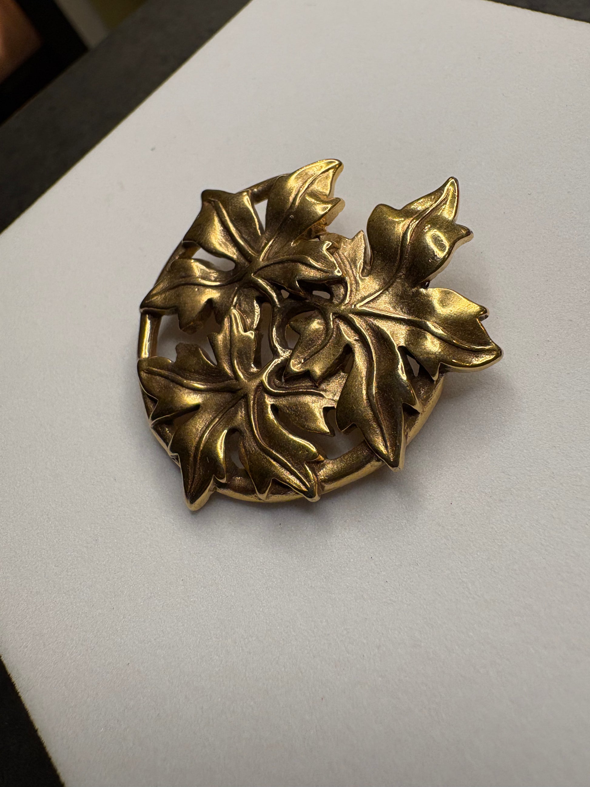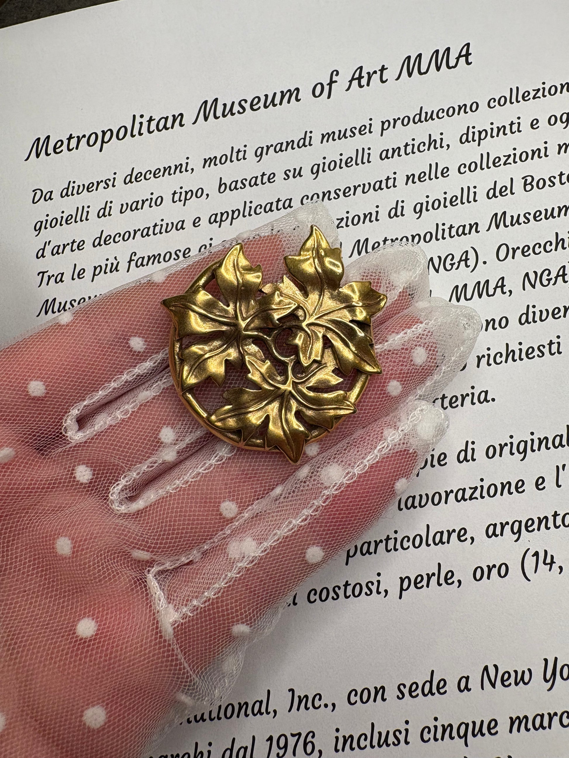 Incantevole spilla–pendente MMA (Metropolitan Museum of Art) del 1986, realizzata in metallo color oro brunito. Il design rappresenta tre foglie intrecciate, modellate con grande attenzione ai dettagli delle venature e ai profili leggermente incurvati che donano movimento e tridimensionalità. La finitura brunita crea un raffinato gioco di chiaroscuri che valorizza la lavorazione scultorea. Pezzo collezionabile, tipico delle riproduzioni artistiche museali di alta qualità