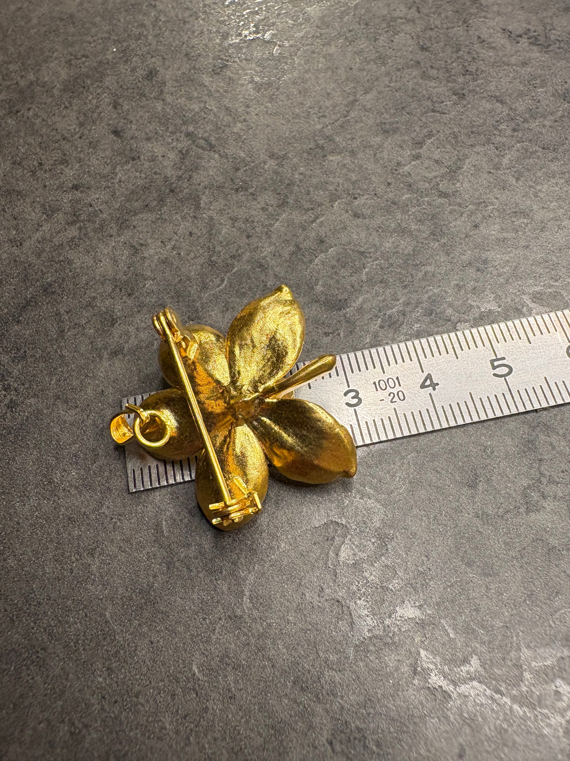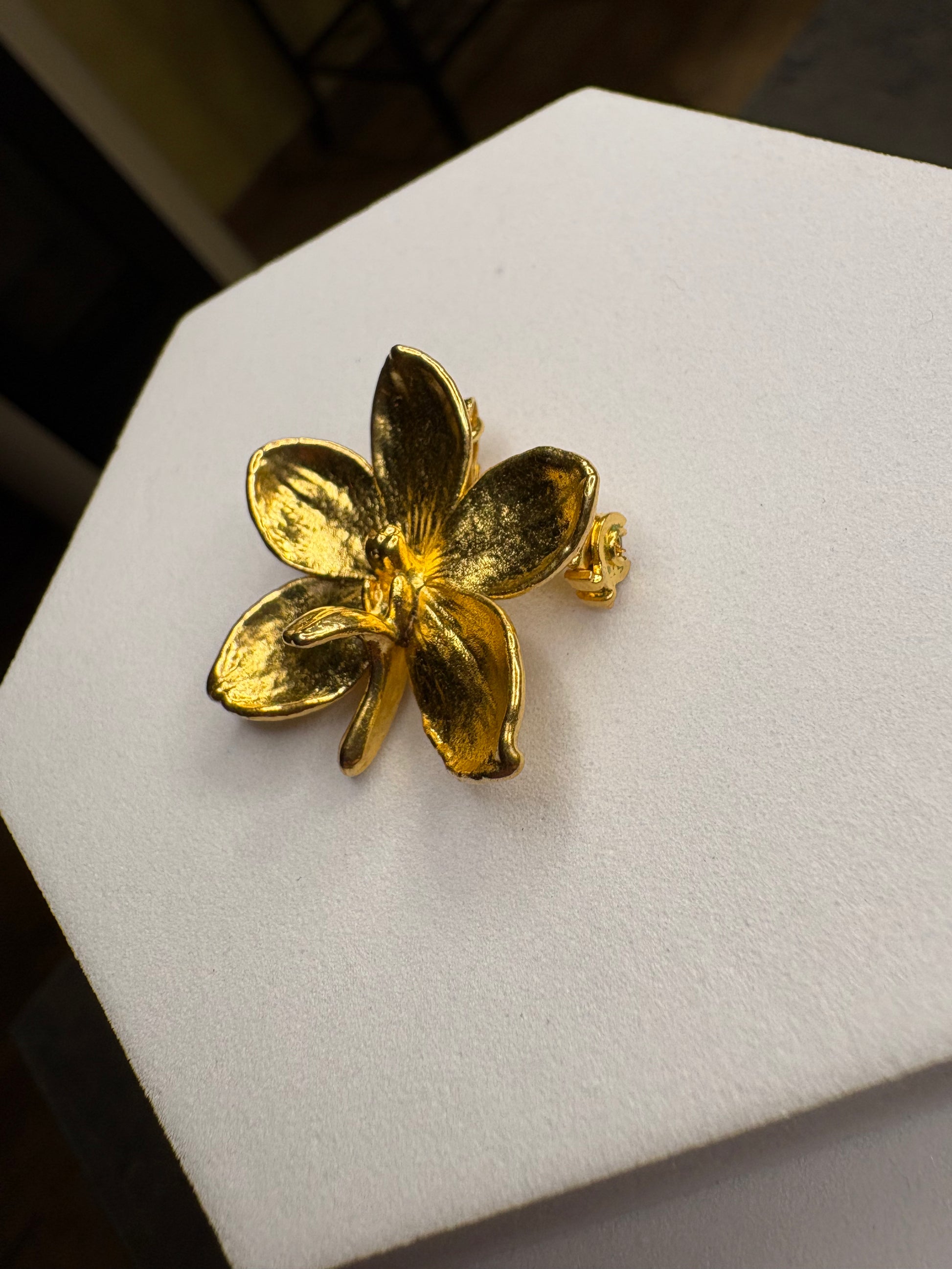 Splendida spilla–pendente tridimensionale raffigurante un’orchidea in piena fioritura, realizzata in metallo dorato con una bellissima lavorazione naturale. I petali sono bombati, leggermente ondulati e modellati uno per uno, con una finitura lucida e satinata che cattura la luce in modo molto elegante.