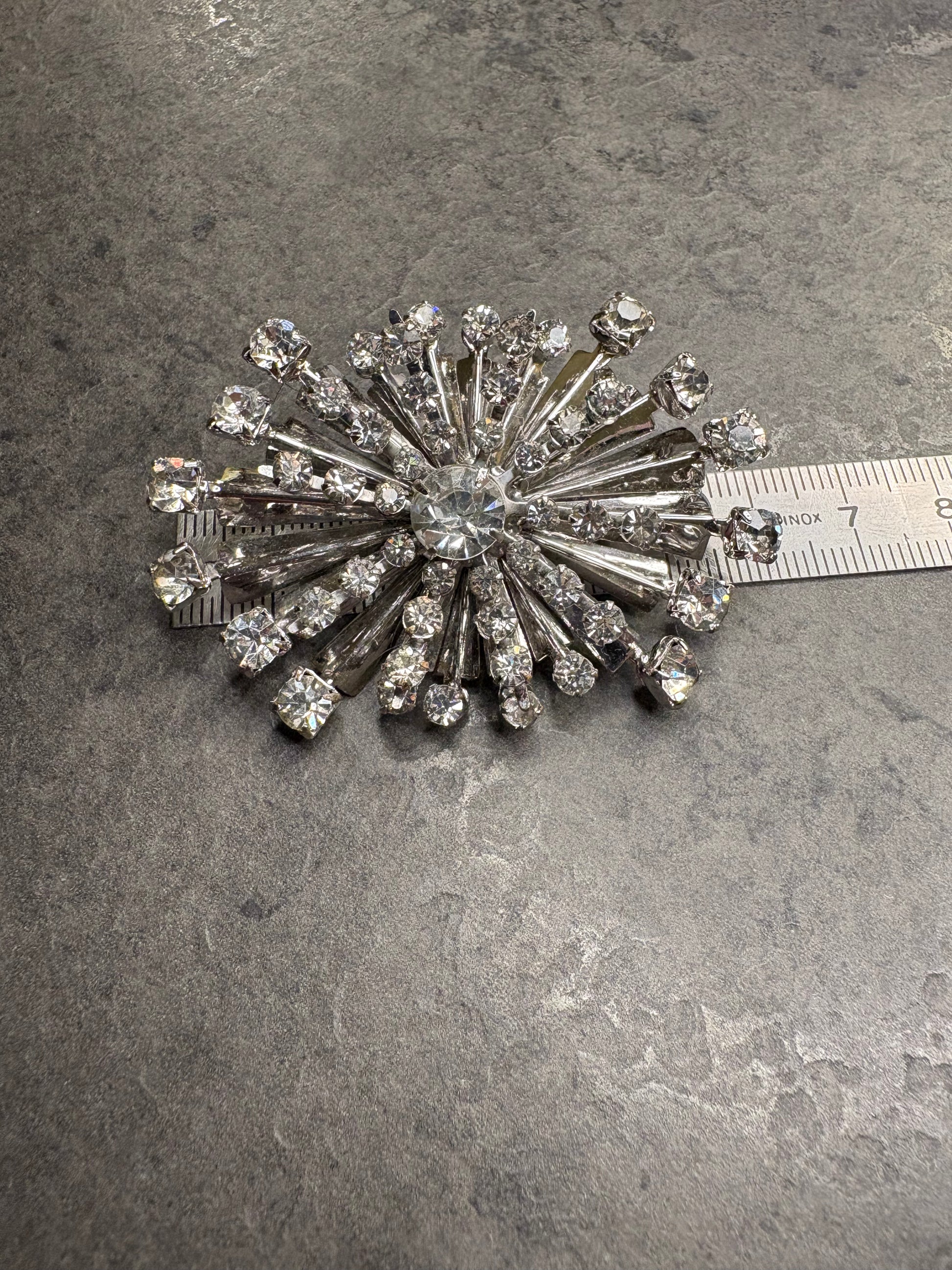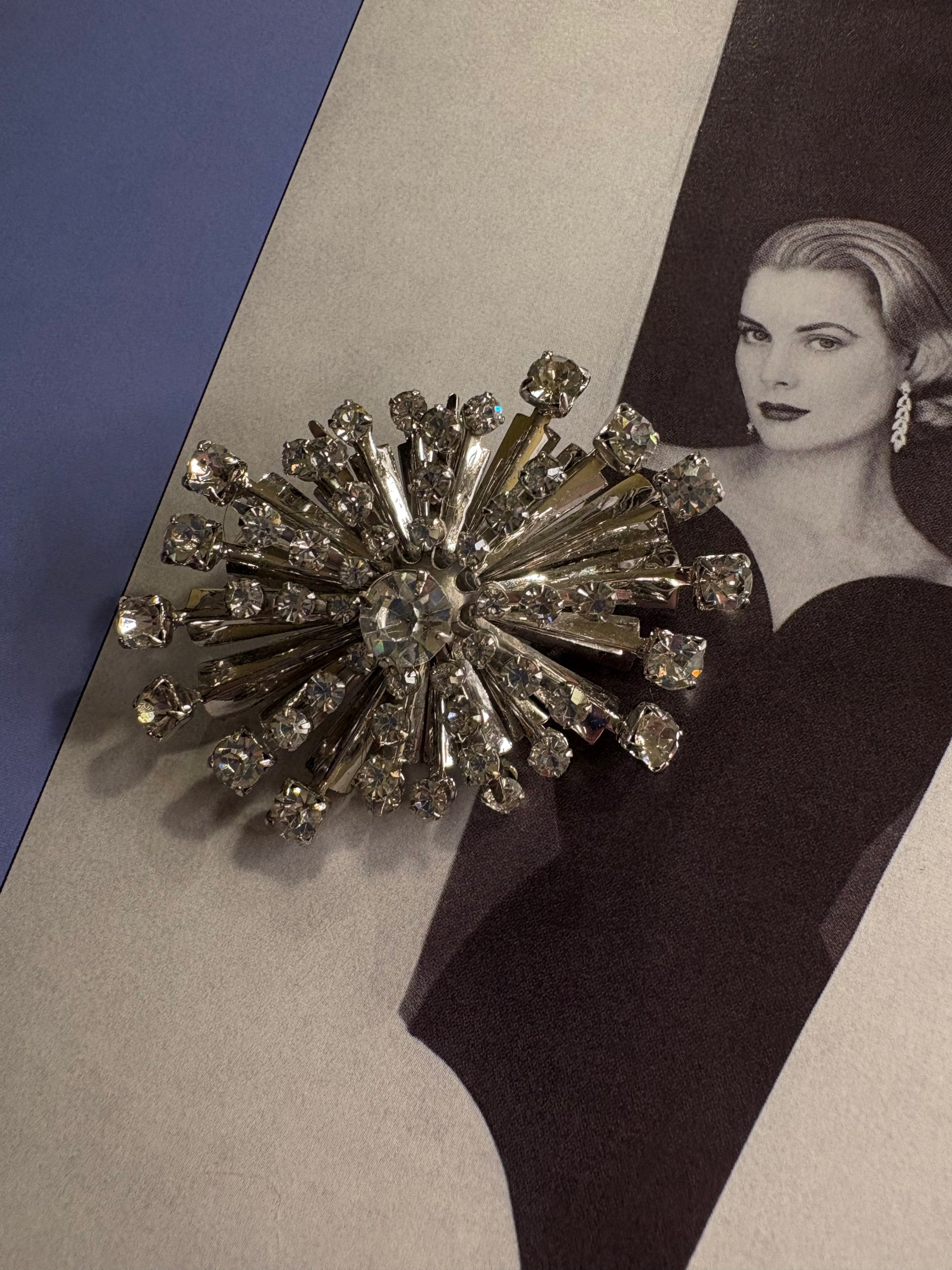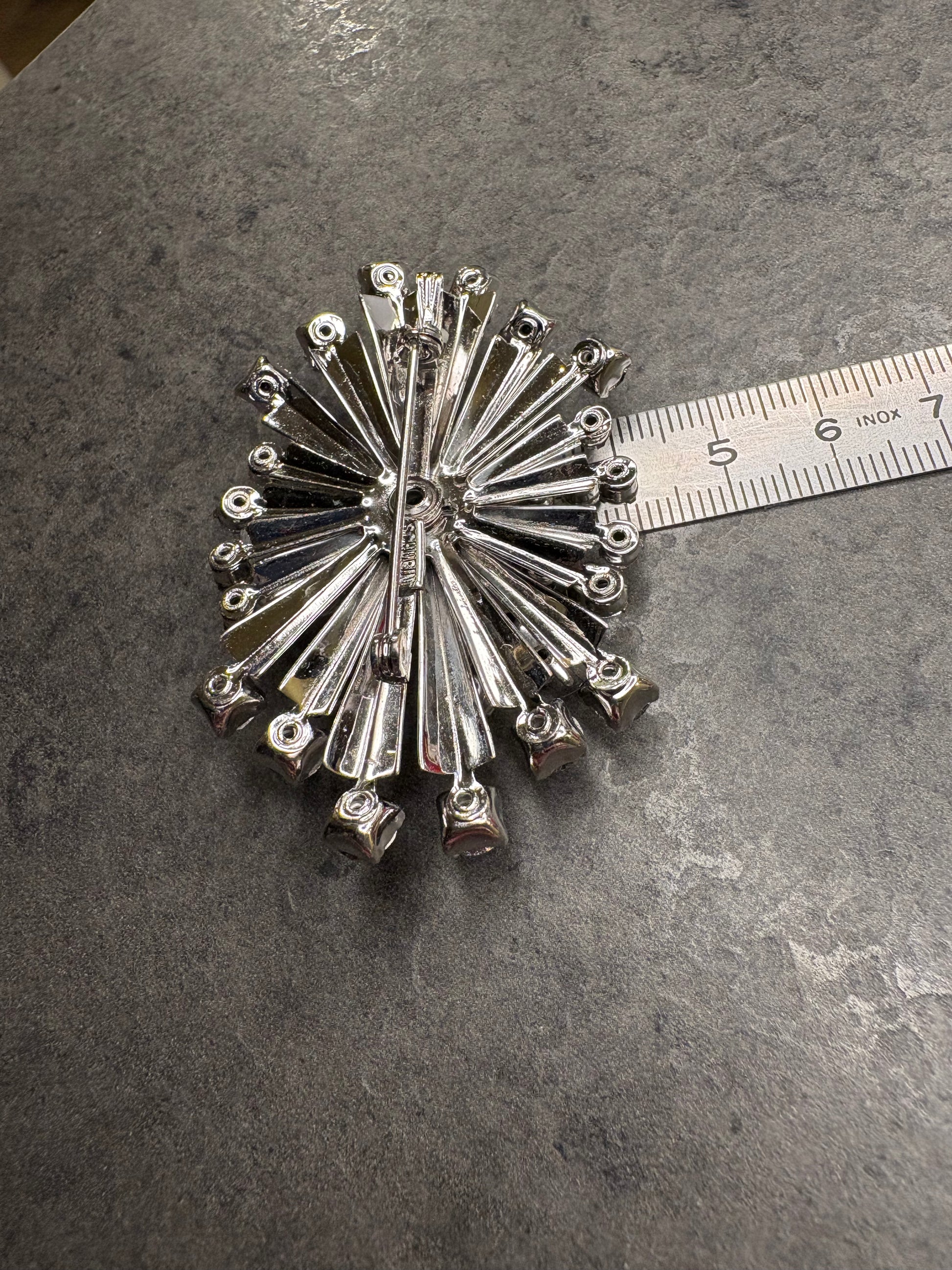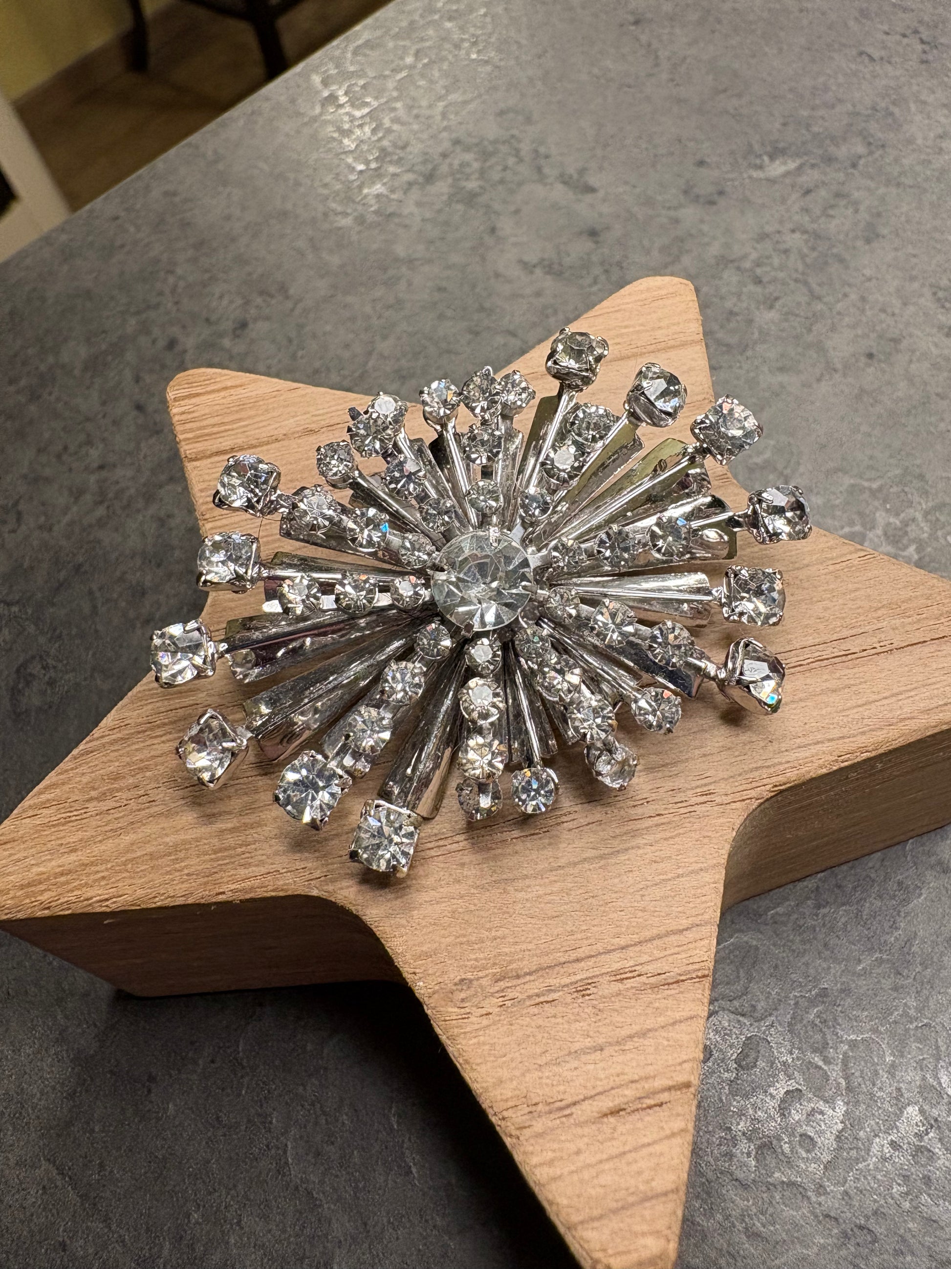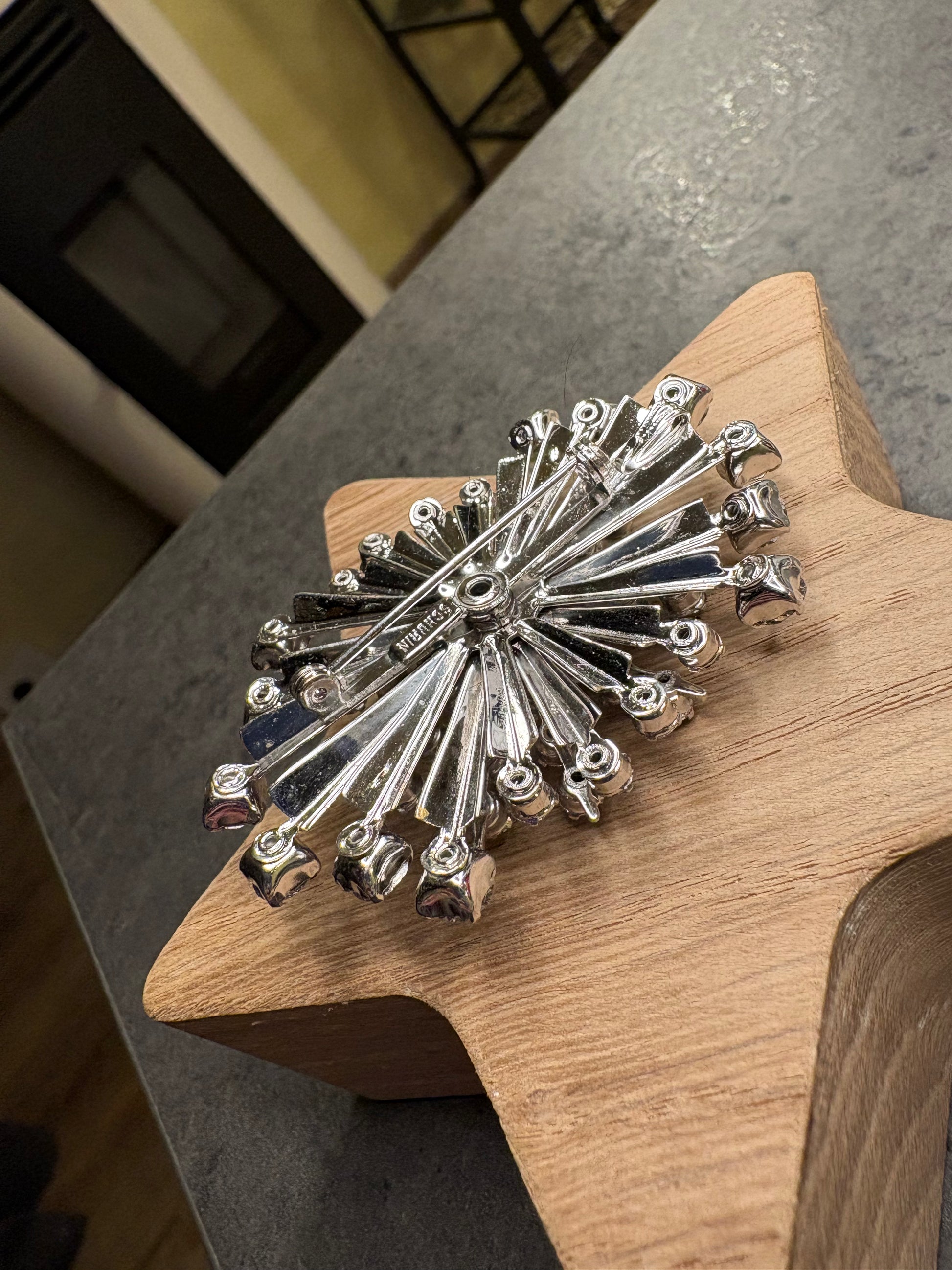 Spettacolare spilla–pendente firmata Schurin, realizzata in metallo color argento con un imponente design a stella esplosiva o fuoco d’artificio. L’intera superficie è completamente ricoperta da cristalli trasparenti sfaccettati di diverse dimensioni, montati sia su raggi che in grappoli, creando un effetto di luce straordinario e tridimensionale.