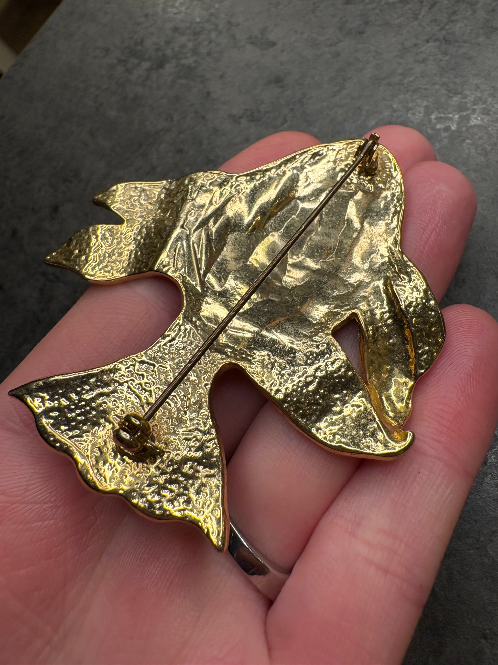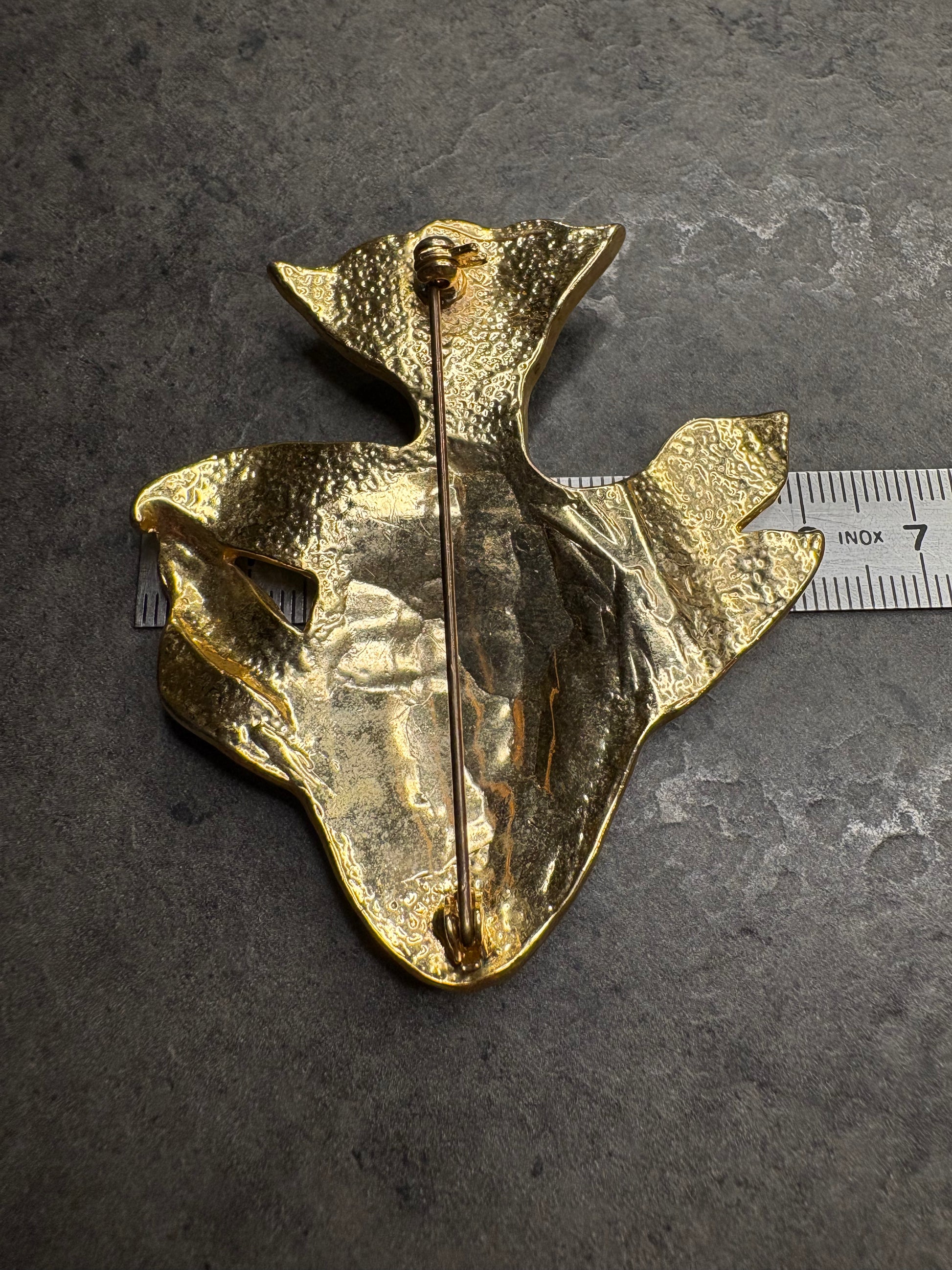 Questa spilla vintage cattura subito lo sguardo grazie al suo adorabile pesce tropicale, modellato con linee morbide e un’esplosione di colori vivaci. Il corpo, smaltato in un arancio luminoso punteggiato da bolle tondeggianti, è incorniciato da pinne verde-giallo che sembrano muoversi come in un guizzo d’acqua.