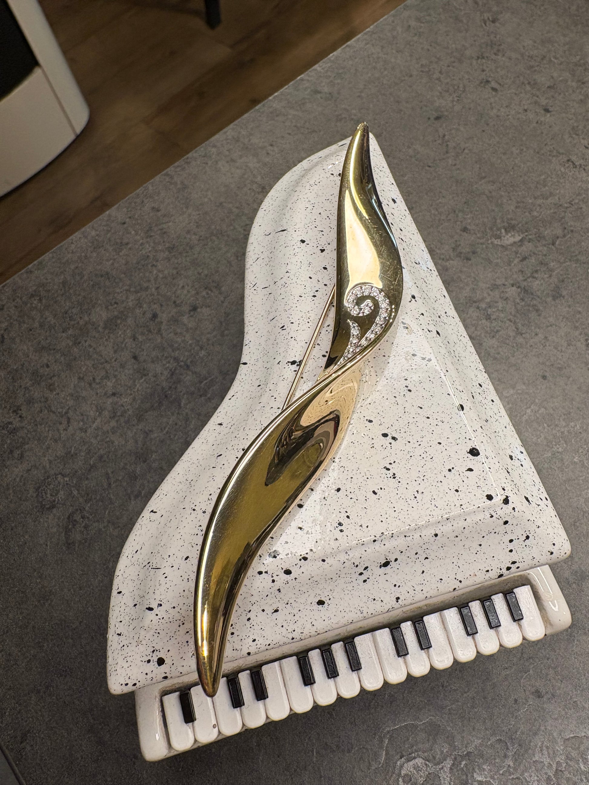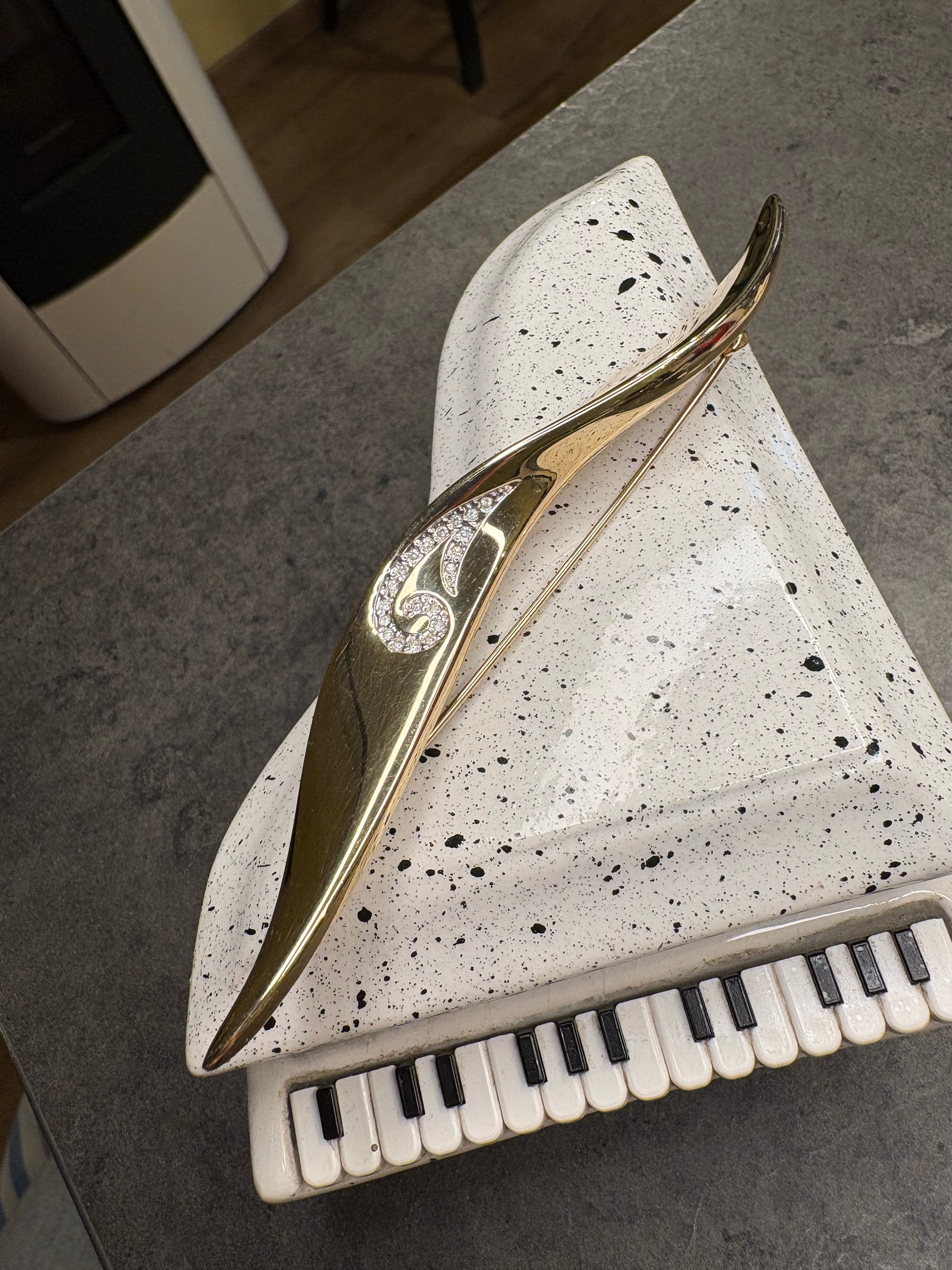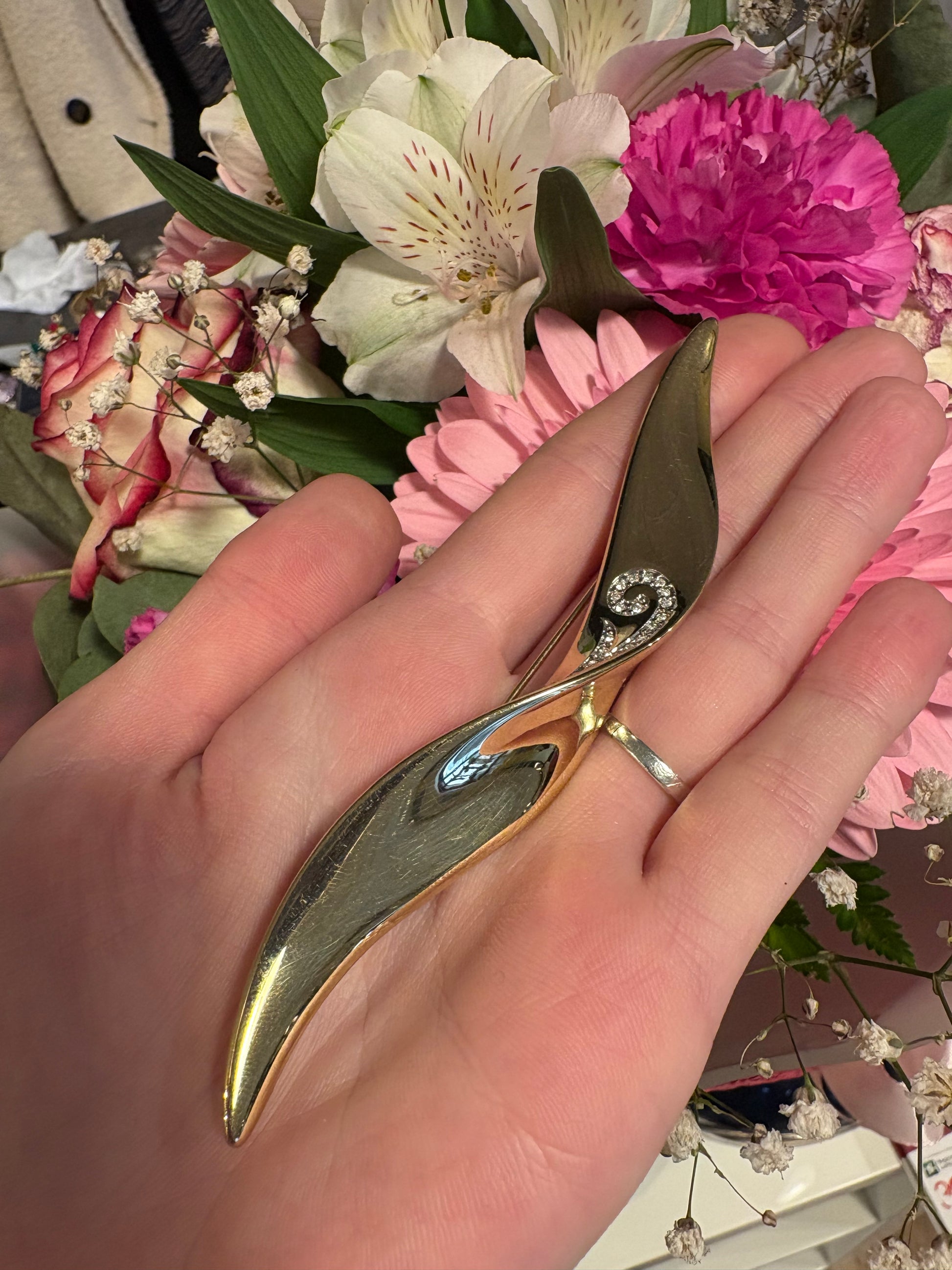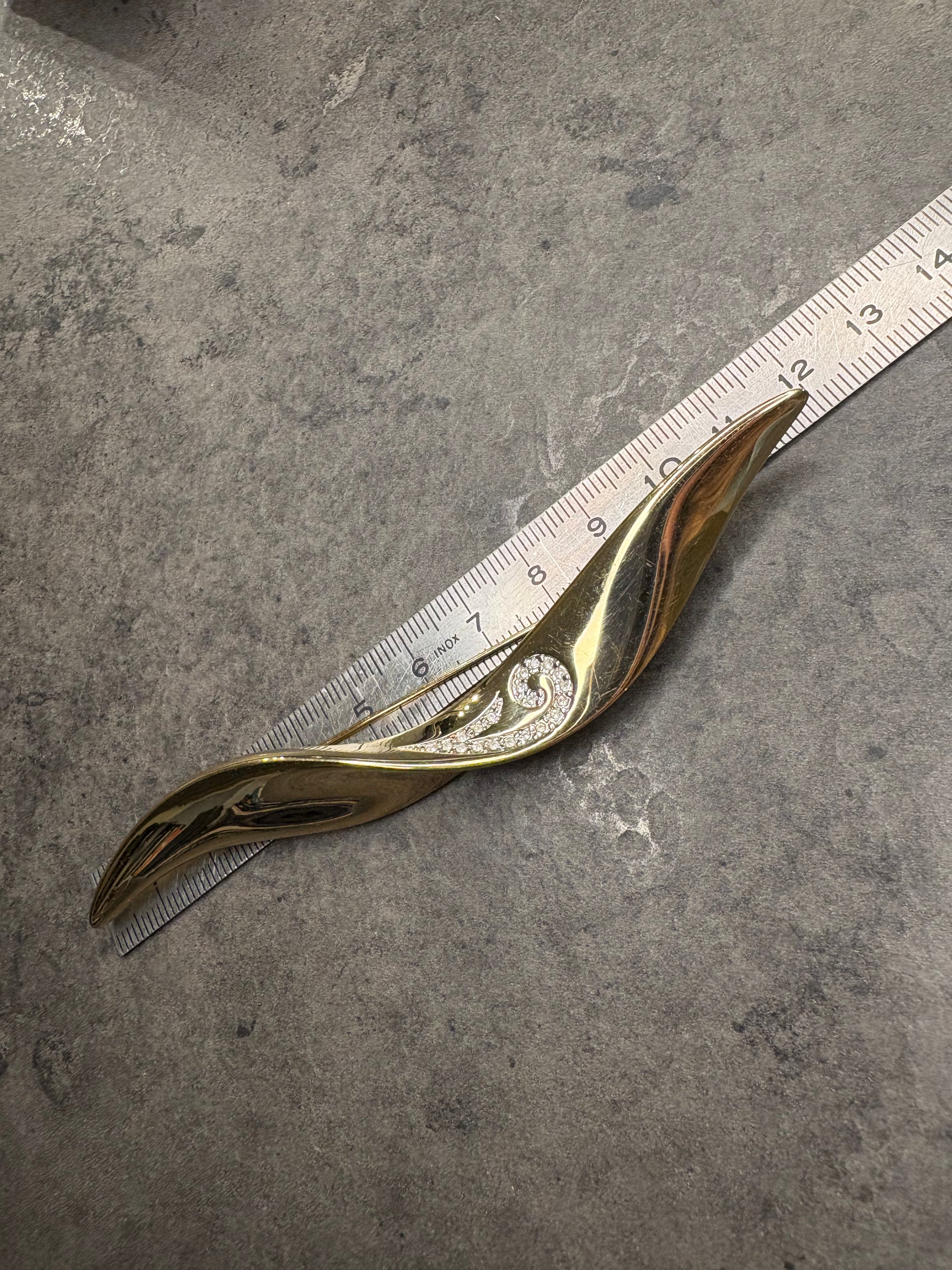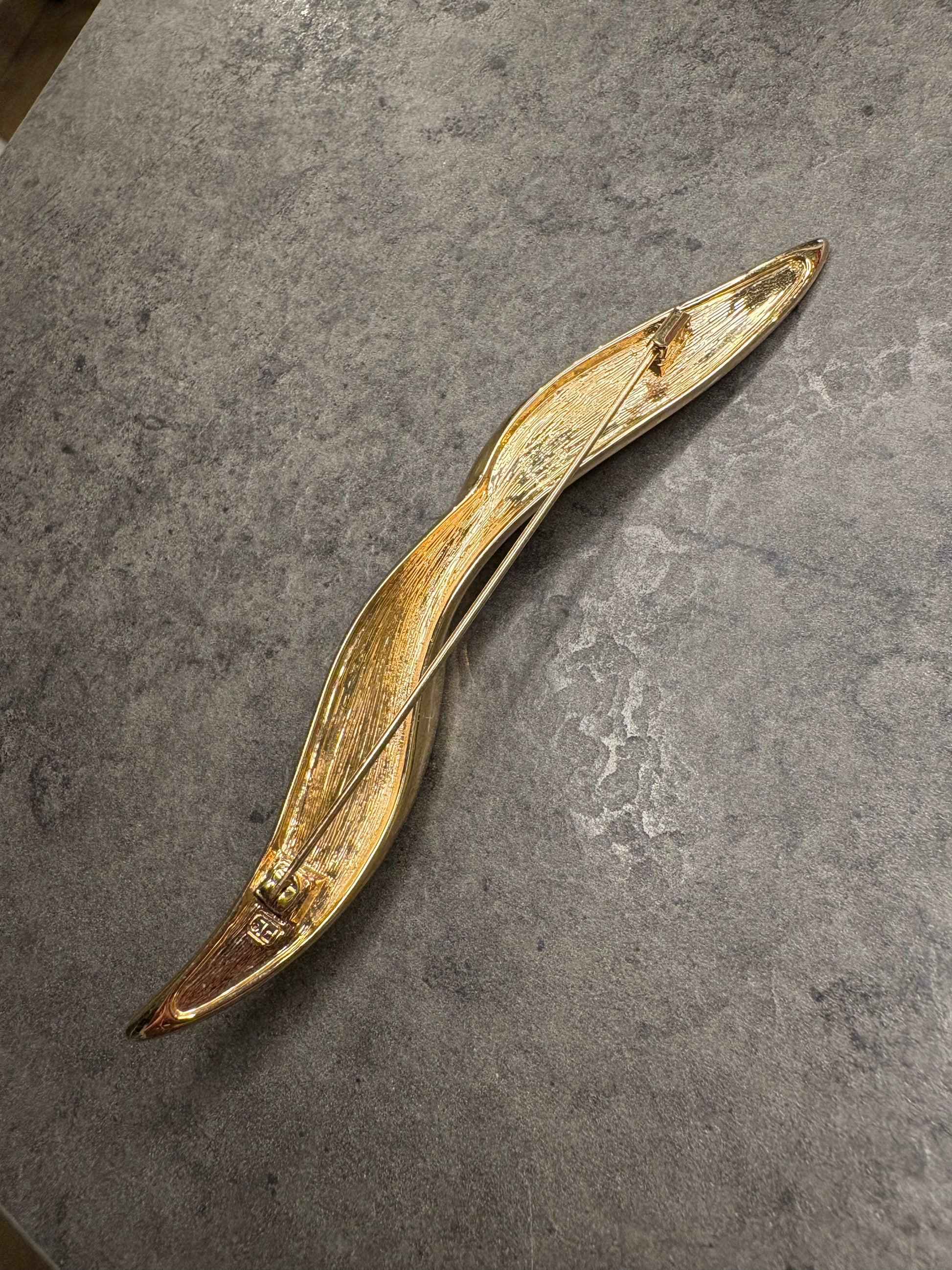 Elegante e raffinata spilla firmata Pierre Lang, dal design sinuoso e contemporaneo.