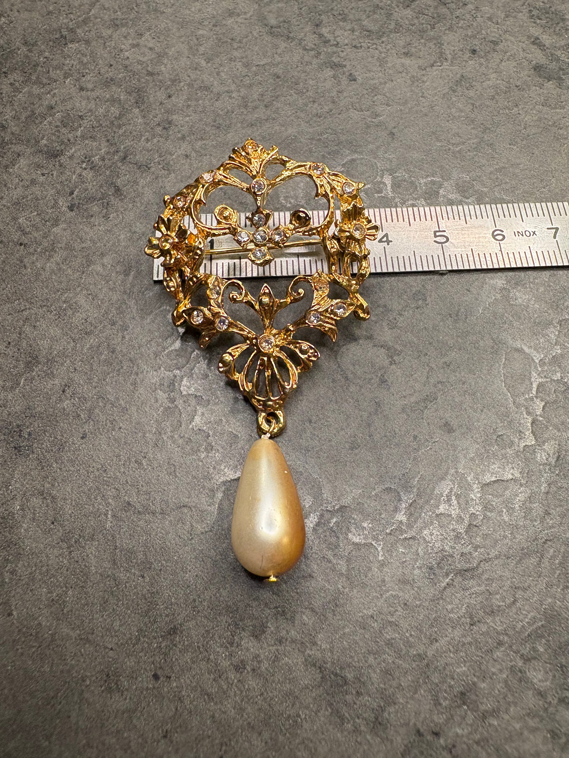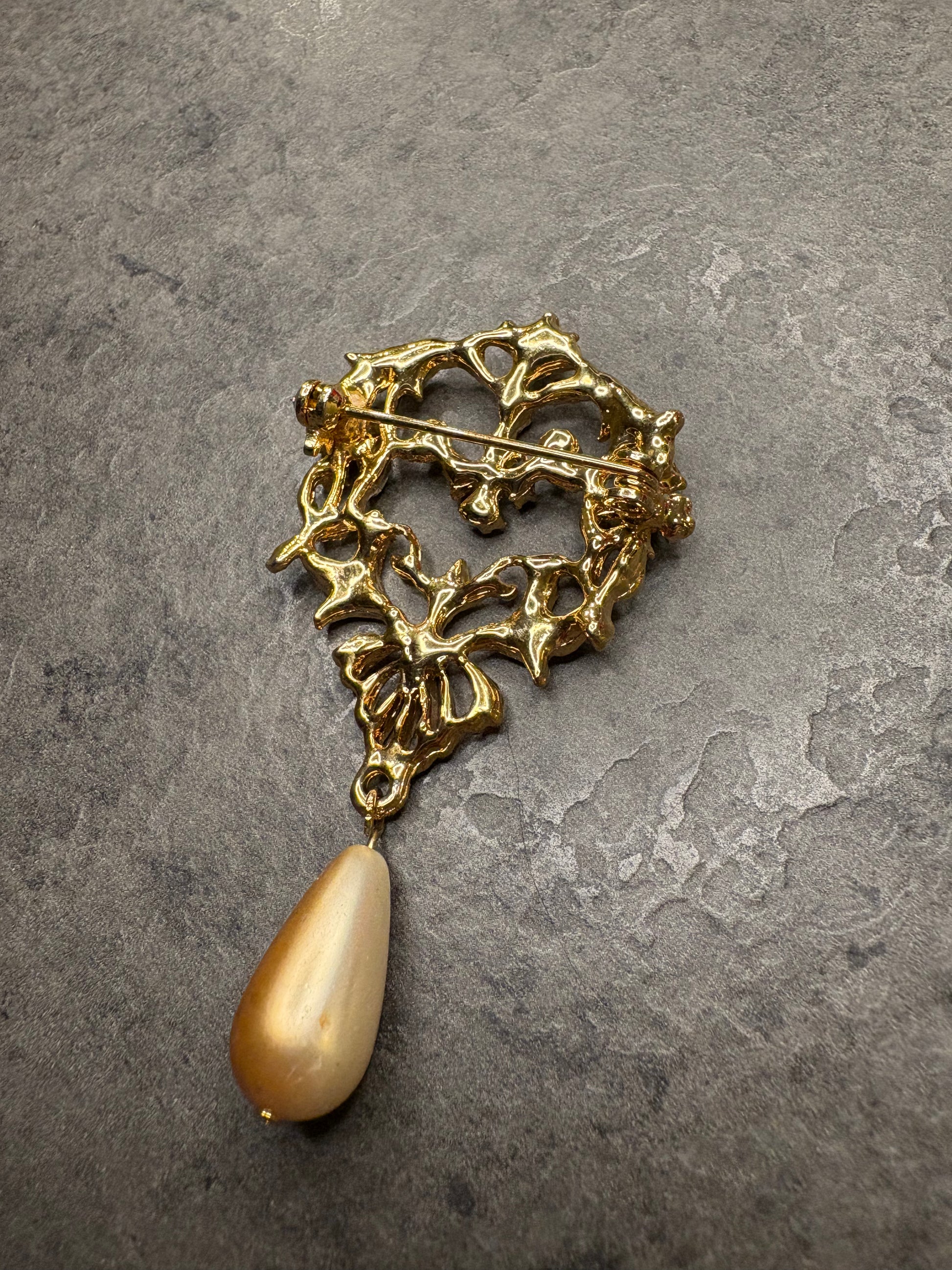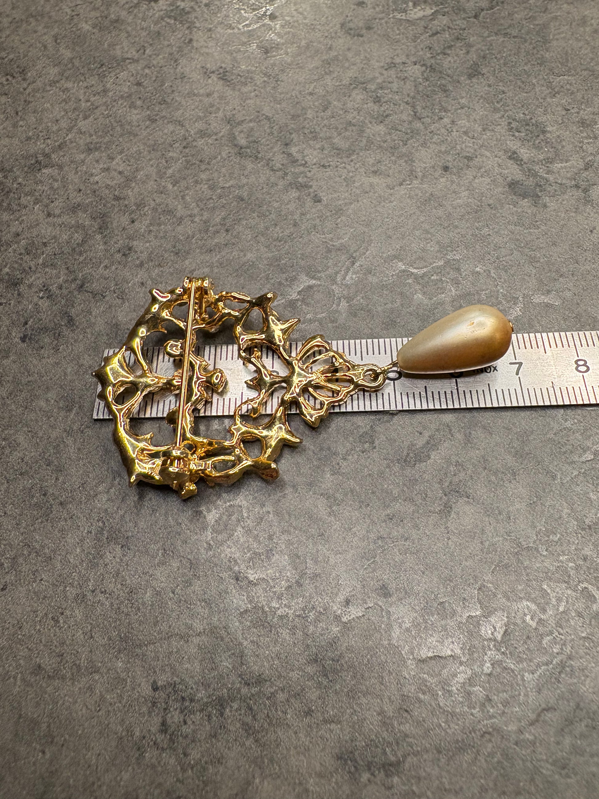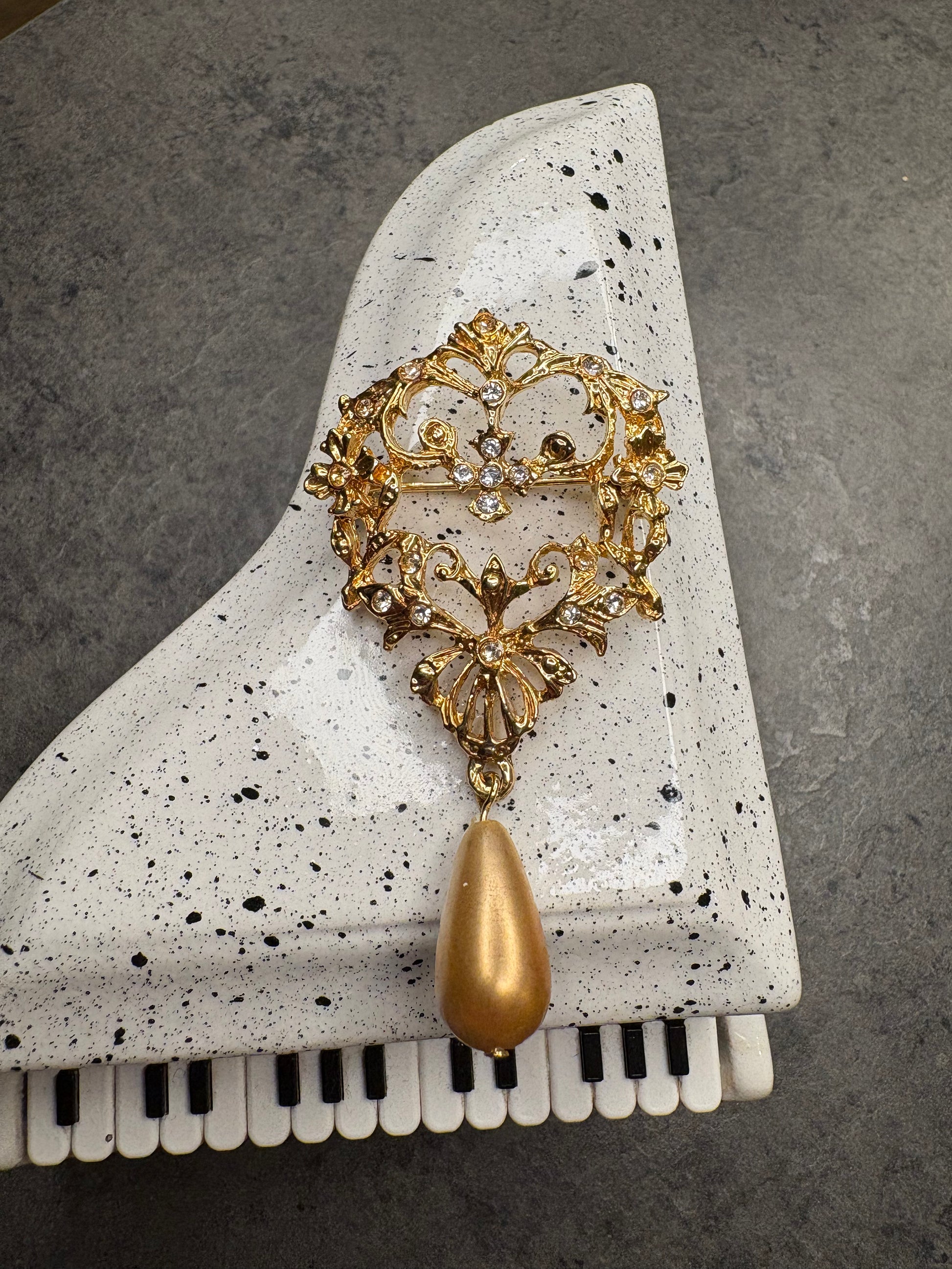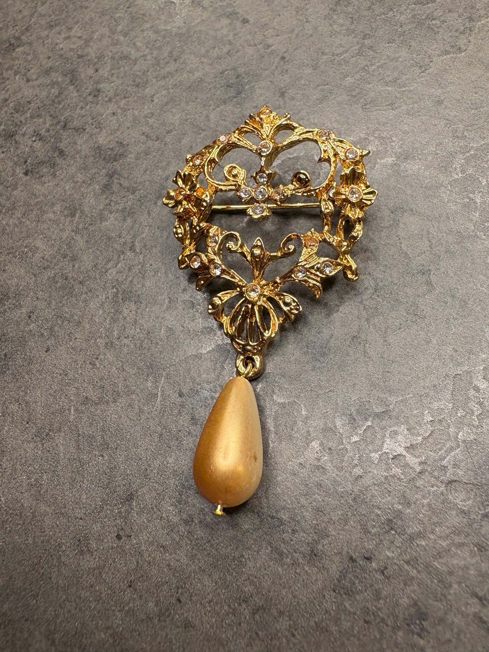 Elegante spilla vintage realizzata in metallo dorato, dal design raffinato e riccamente lavorato con motivi floreali e riccioli ornamentali. La montatura, luminosa e tridimensionale, è impreziosita da cristalli trasparenti che donano punti luce discreti ma brillanti.