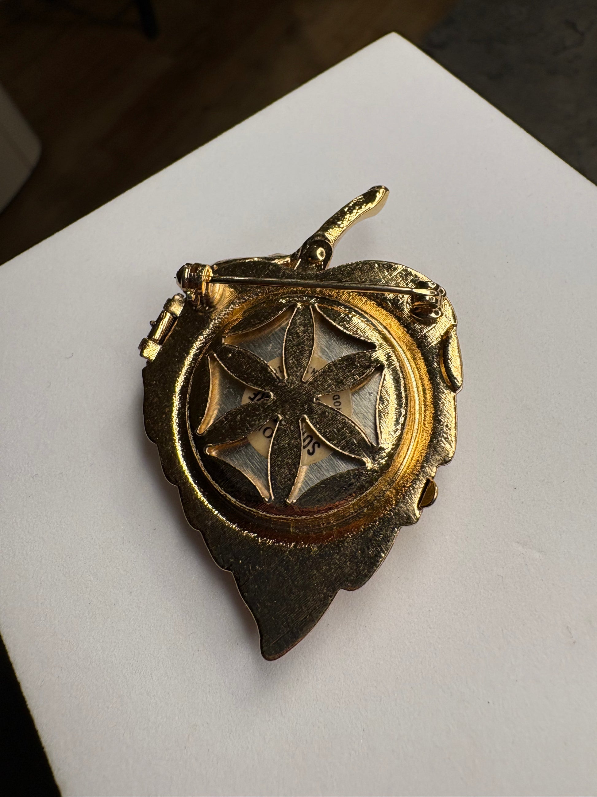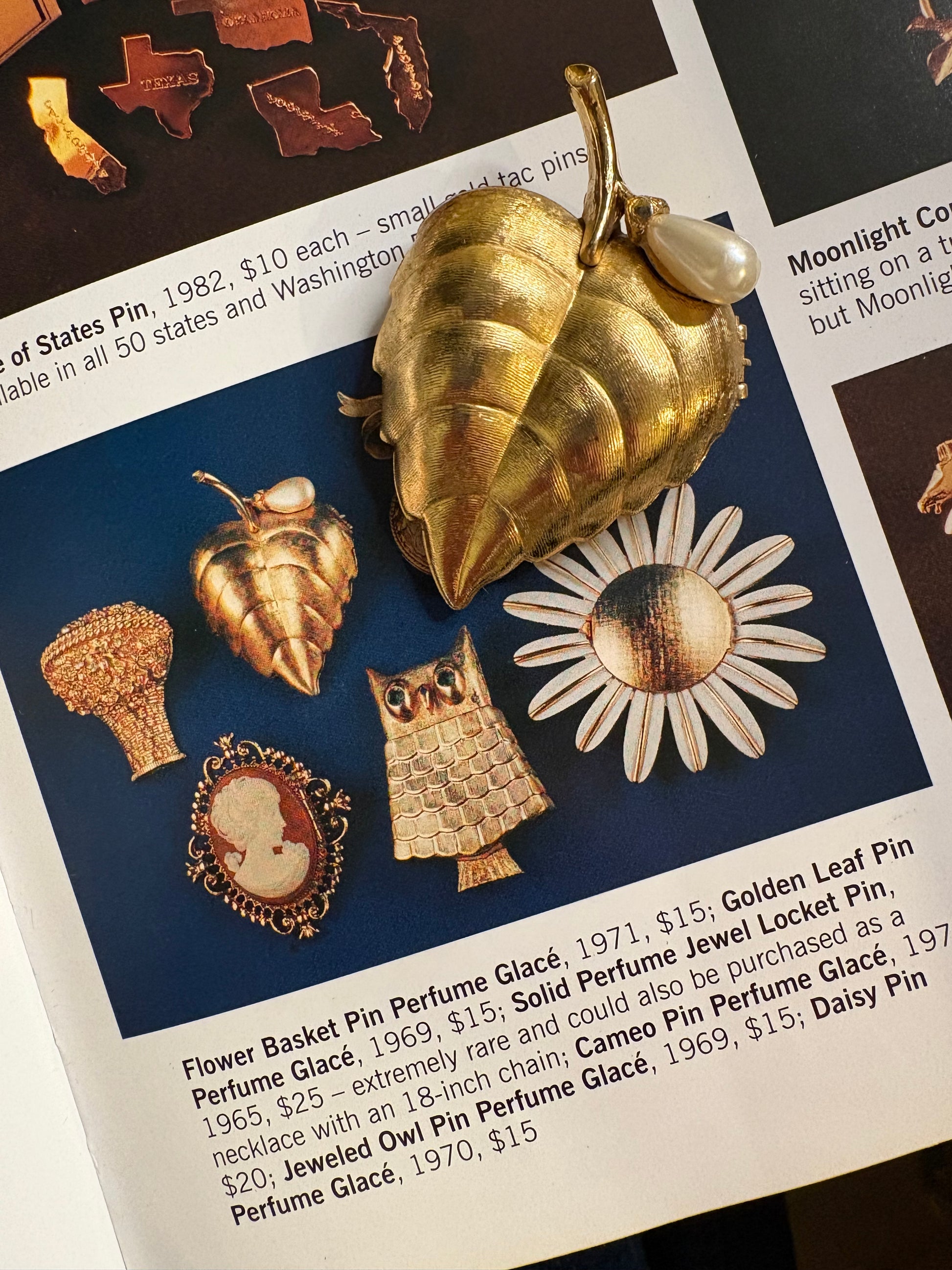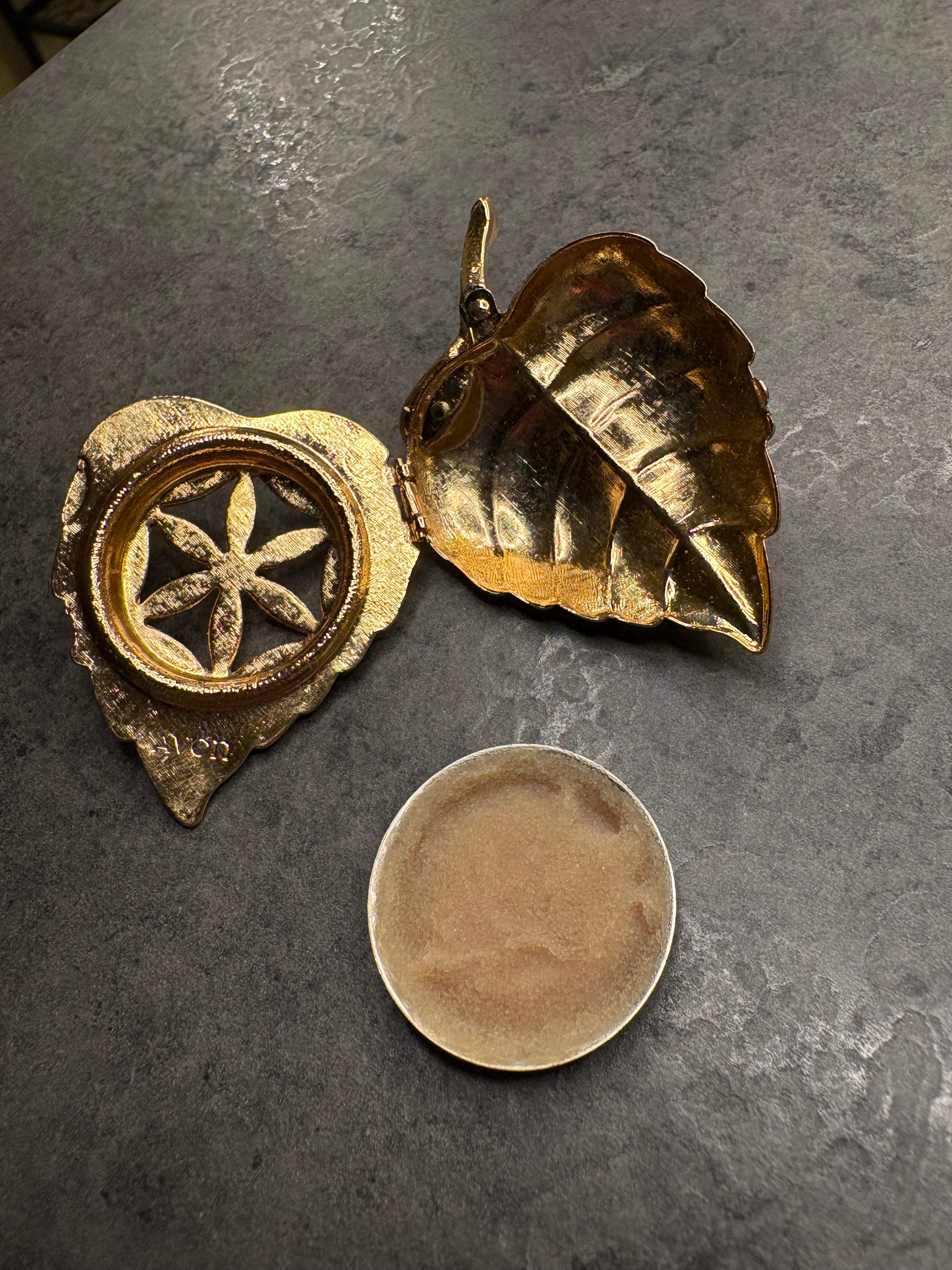 Meravigliosa spilla–locket contenitore per profumo solido firmata Avon, datata 1969, conosciuta come “Golden Leaf Pin Perfume Glacé”. Realizzata in metallo color oro, presenta una raffinata forma di foglia stilizzata, con venature incise che conferiscono profondità e realismo al design. All’interno era originariamente contenuto il profumo solido, rendendo questo gioiello non solo decorativo ma anche funzionale. Un pezzo iconico della produzione Avon, molto apprezzato dai collezionisti, che unisce eleganza, storia e originalità.