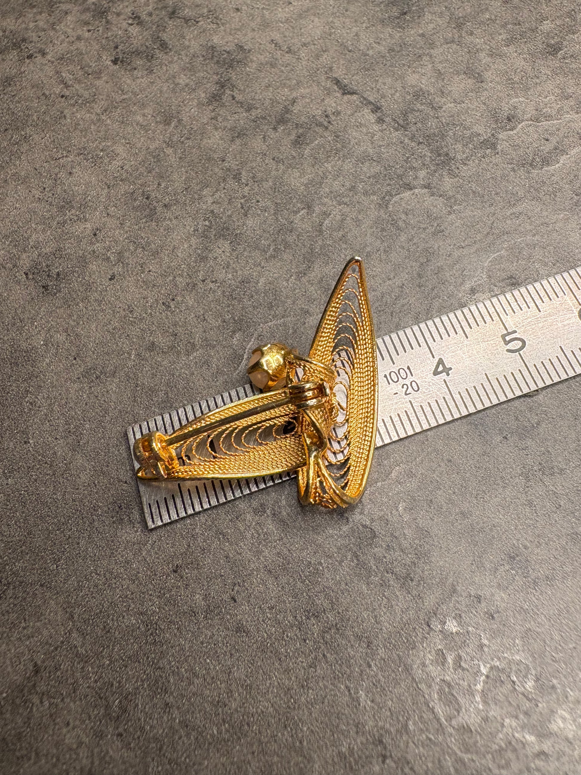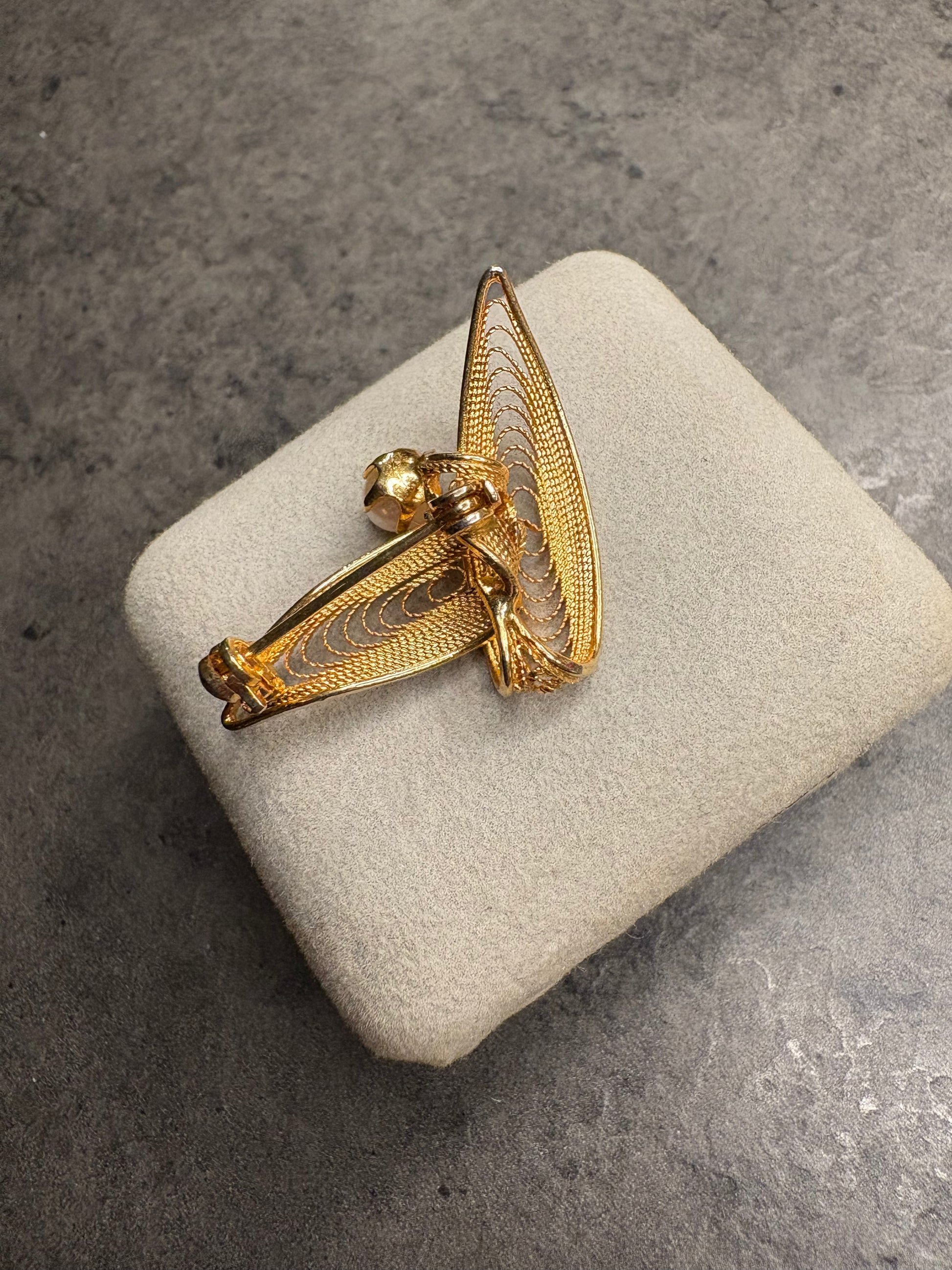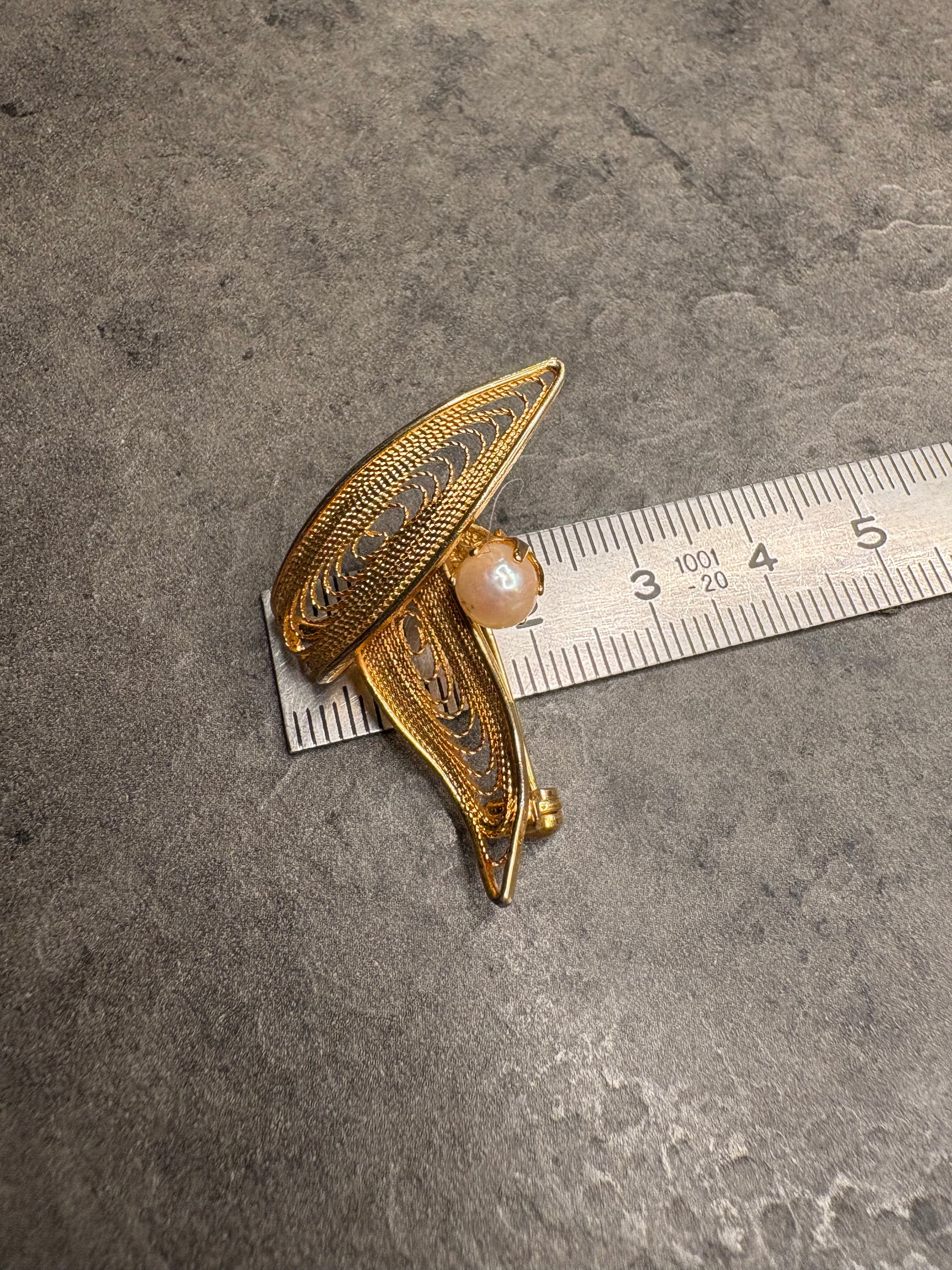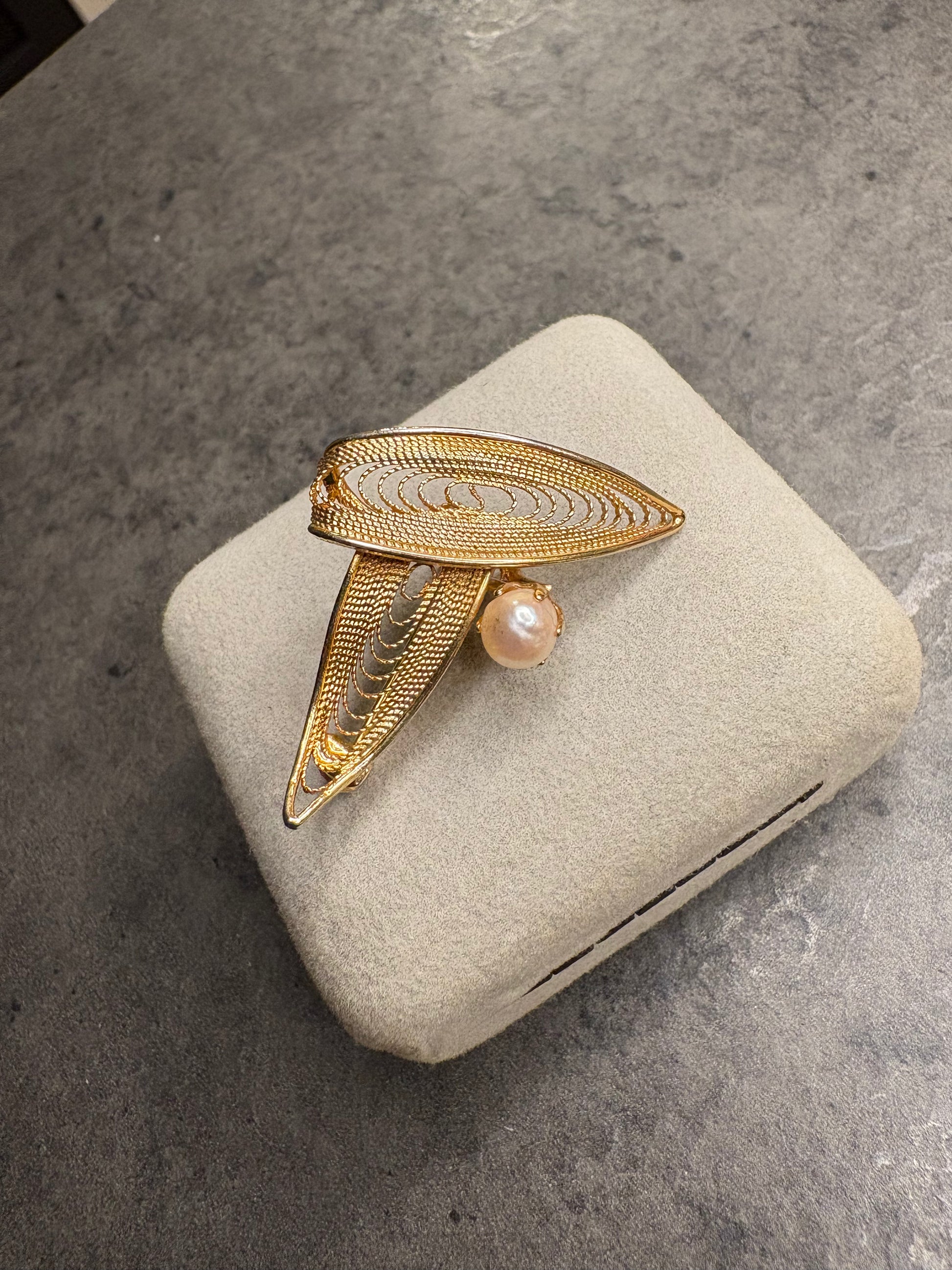 Elegante spilla vintage in metallo dorato, dal design originale e raffinato. La struttura è composta da due elementi allungati e sovrapposti, realizzati con una fine lavorazione traforata che crea un delicato gioco di geometrie e leggerezza. A impreziosire la composizione, nella parte inferiore, spicca una perla dal tono luminoso e delicato, che aggiunge un tocco di classicità al carattere moderno delle linee dorate.