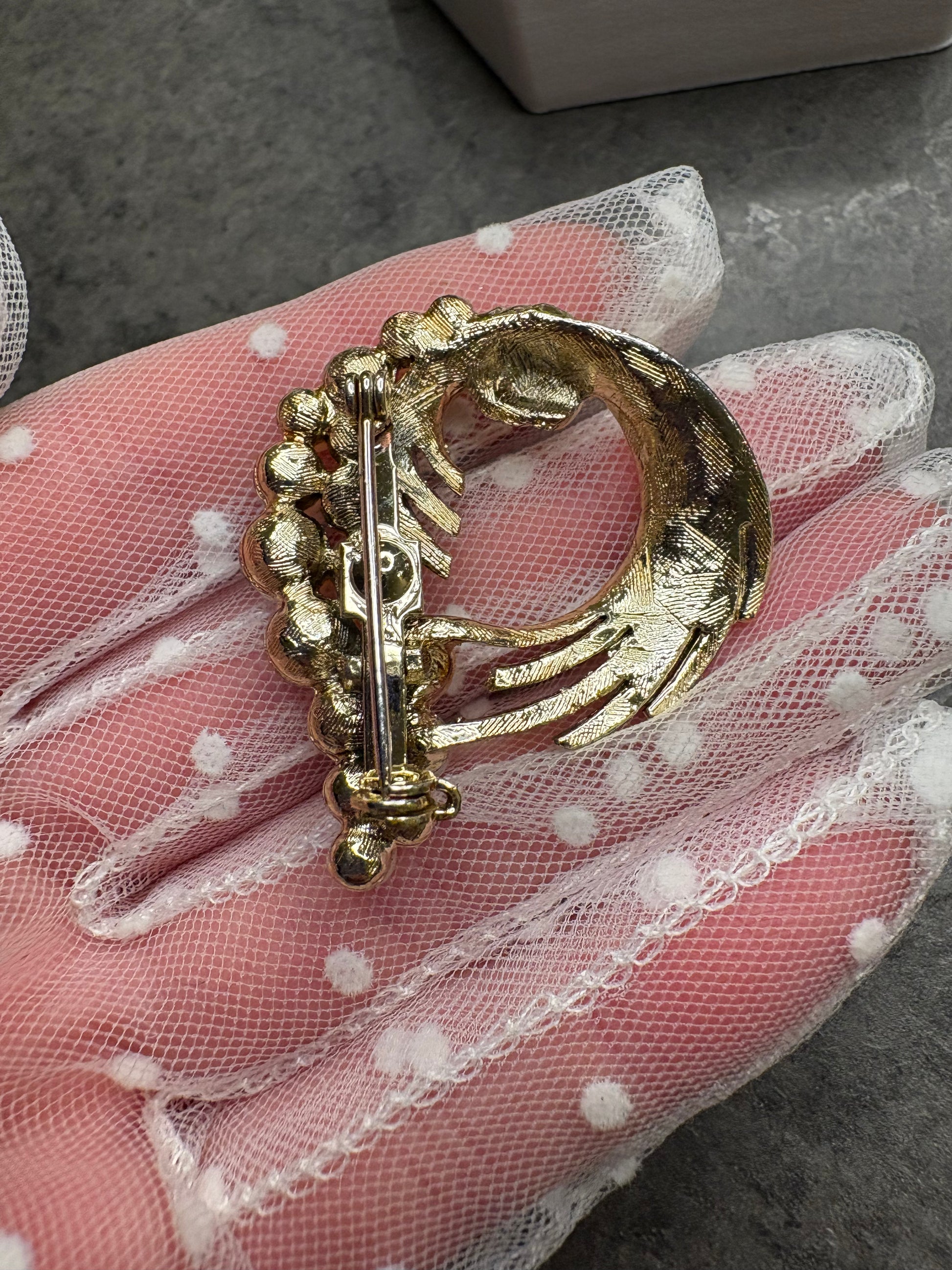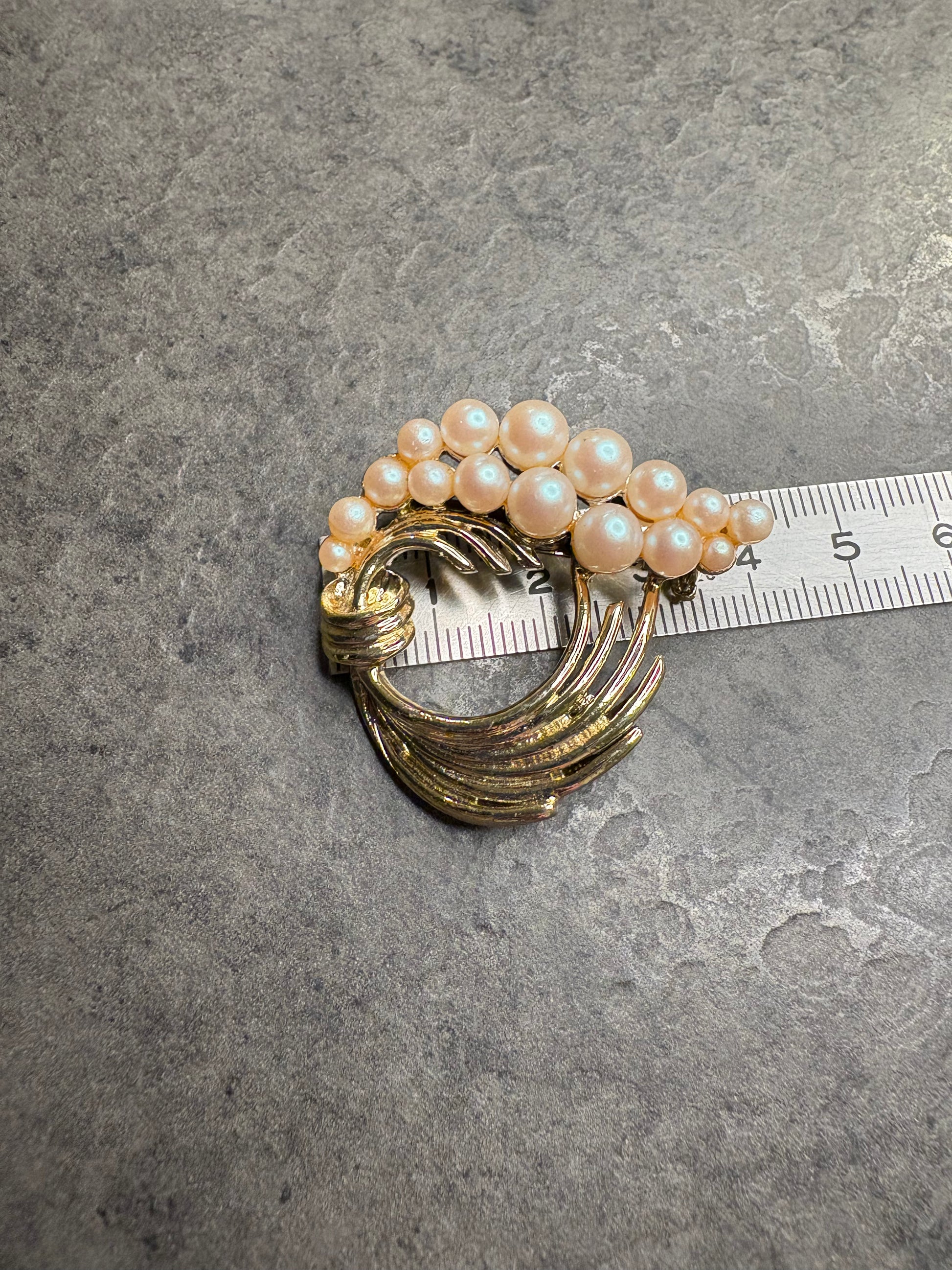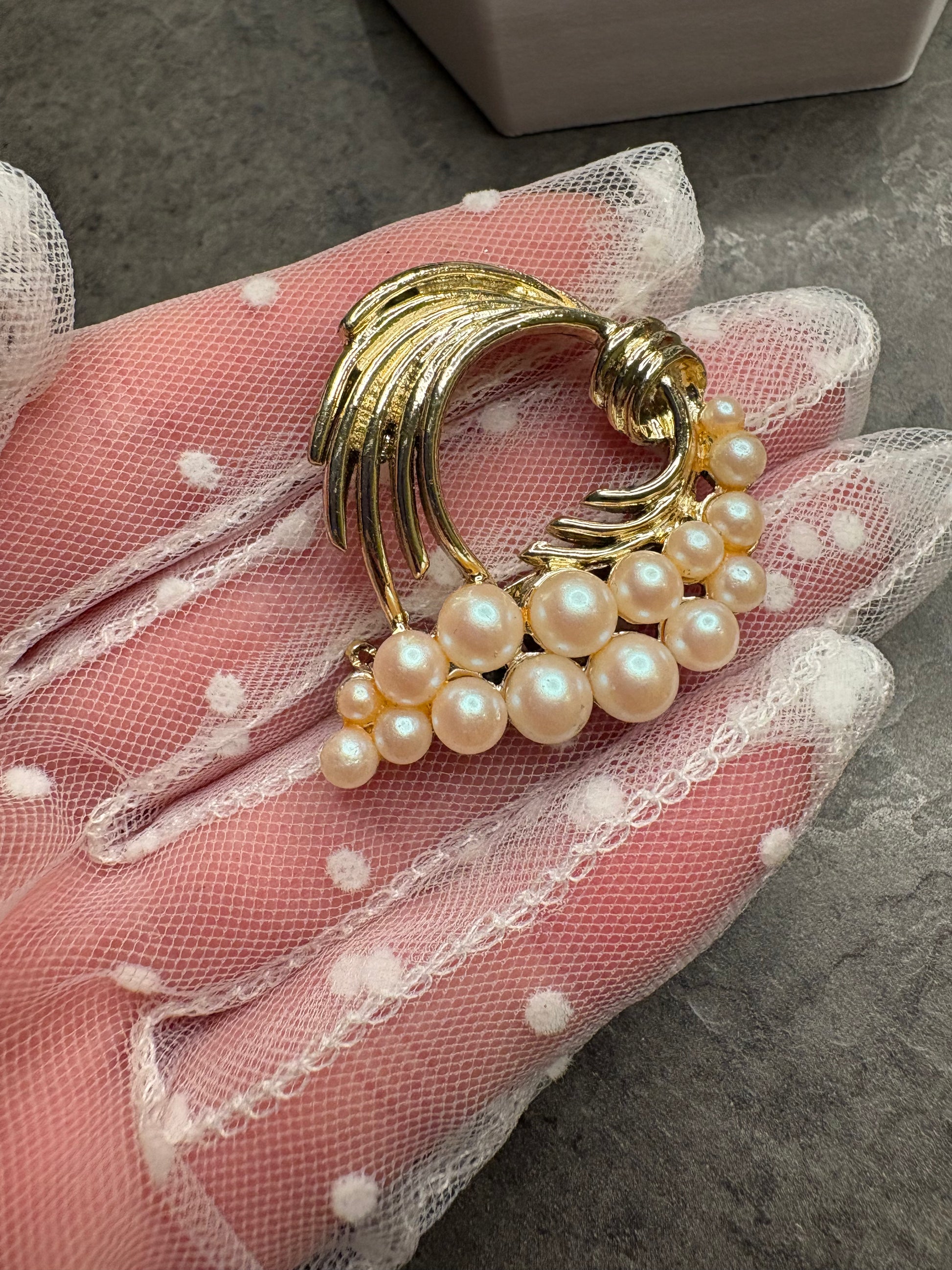 Elegante spilla vintage realizzata in metallo color oro con composizione armoniosa di perle artificiali color crema. Le perle, luminose e perfettamente sferiche, sono disposte su una struttura ondulata dorata che crea movimento e tridimensionalità. Design classico e femminile, ideale su blazer, cardigan o abiti eleganti. Ottima fattura con chiusura funzionante e sicura.