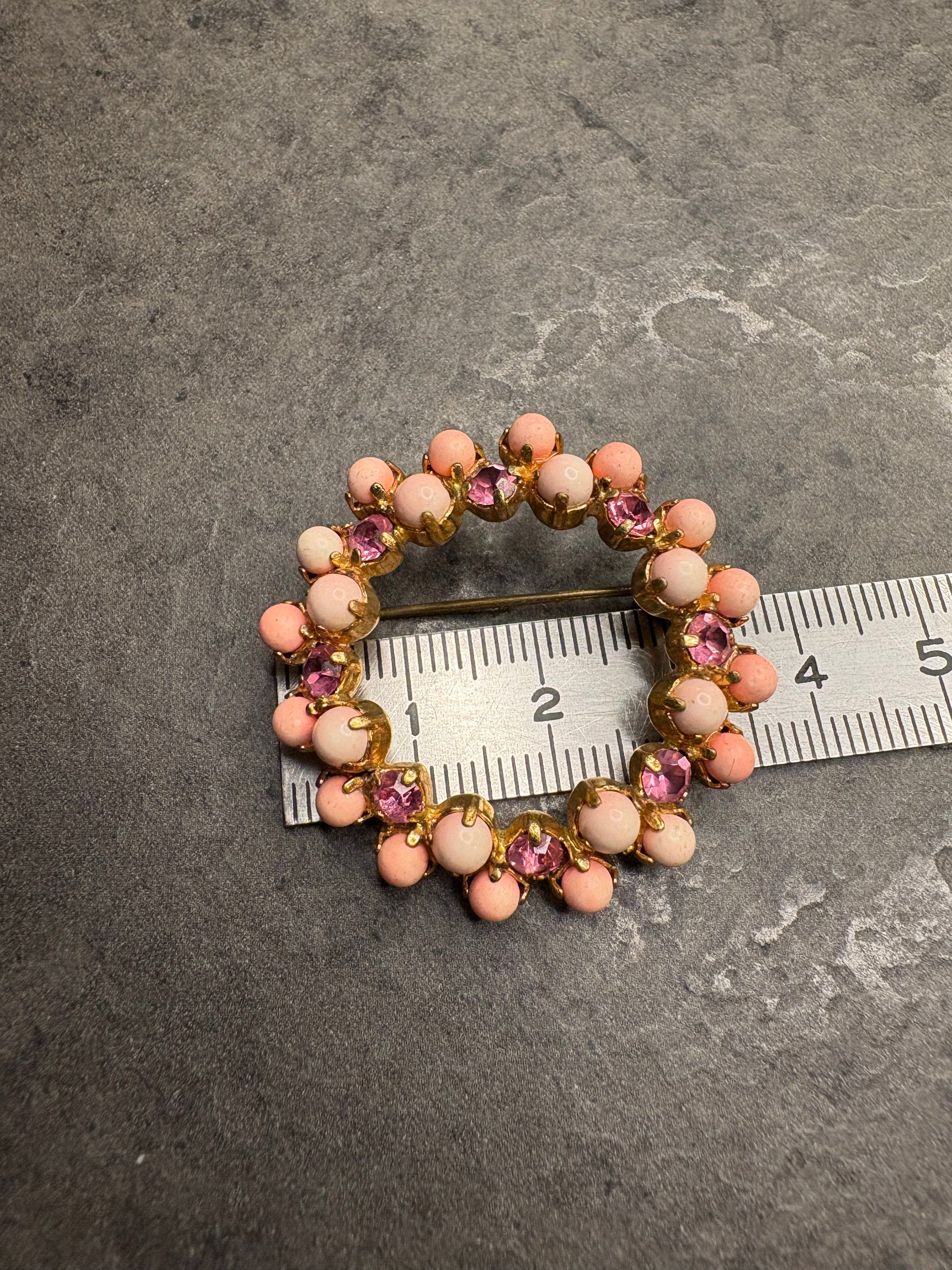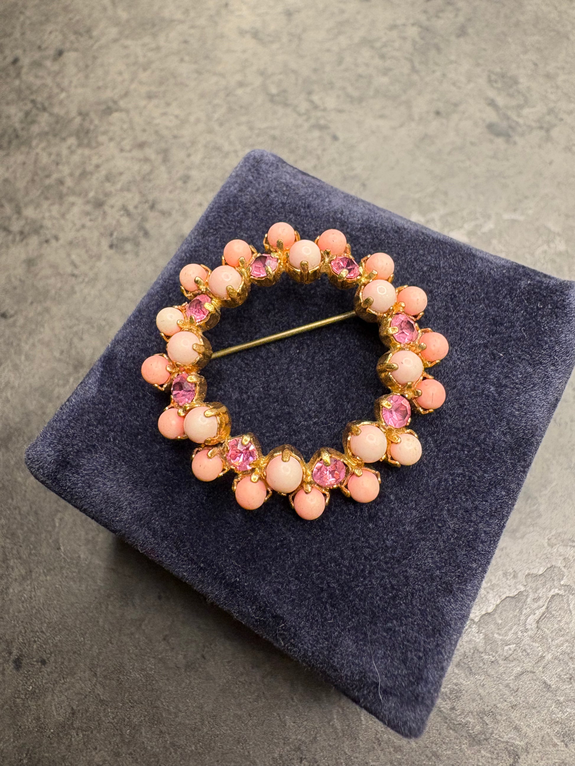 La montatura dorata, finemente lavorata, valorizza la brillantezza dei cristalli e il tono cipriato delle perline, mentre sul retro si nota una classica chiusura a spilla tipica dell’epoca. Sono visibili lievi segni del tempo, che testimoniano l’età e l’autenticità del pezzo, aggiungendo ulteriore fascino vintage.