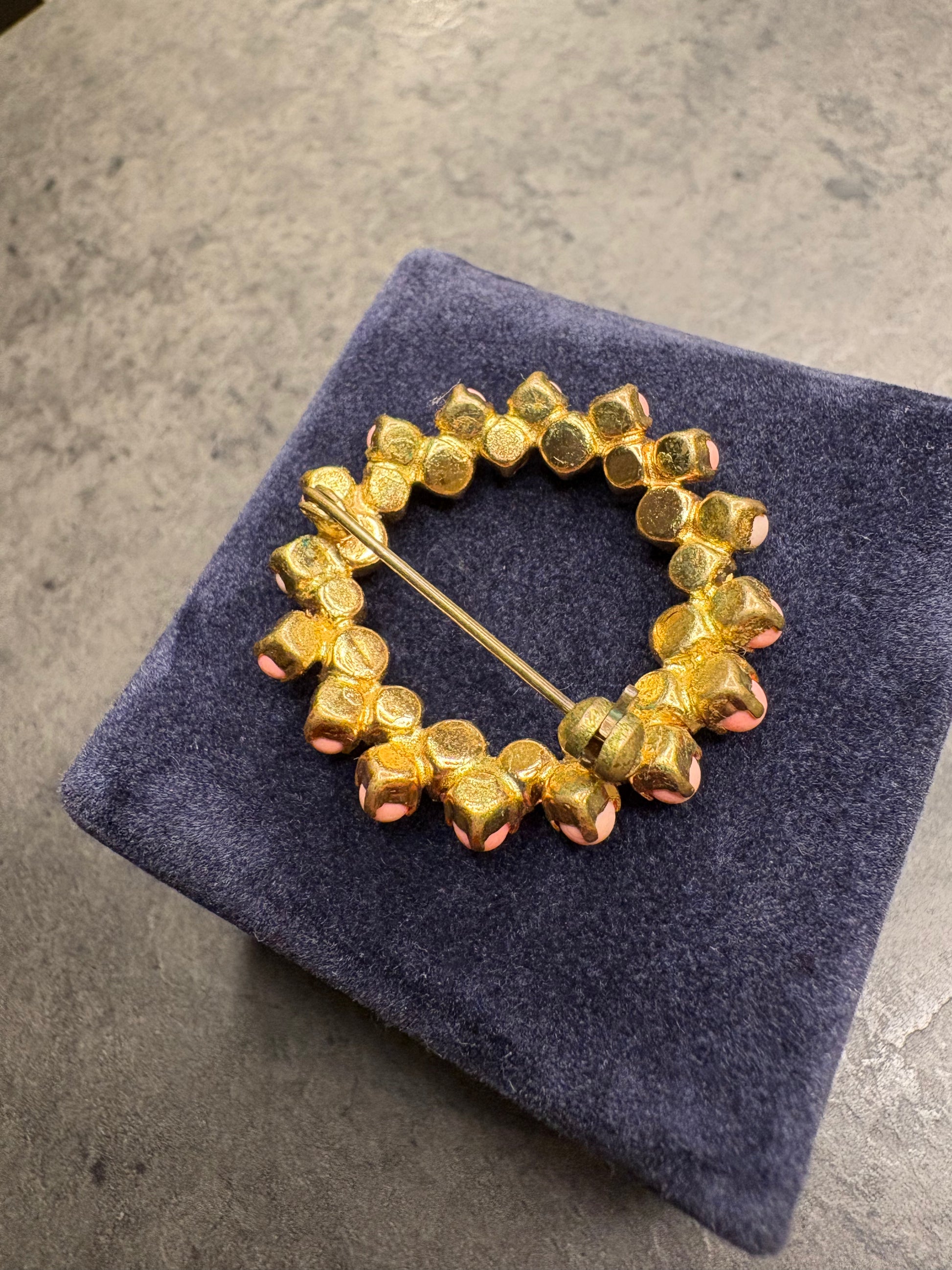 Deliziosa spilla vintage degli anni ’60 realizzata in metallo color oro, dalla forma circolare e dal fascino intramontabile.