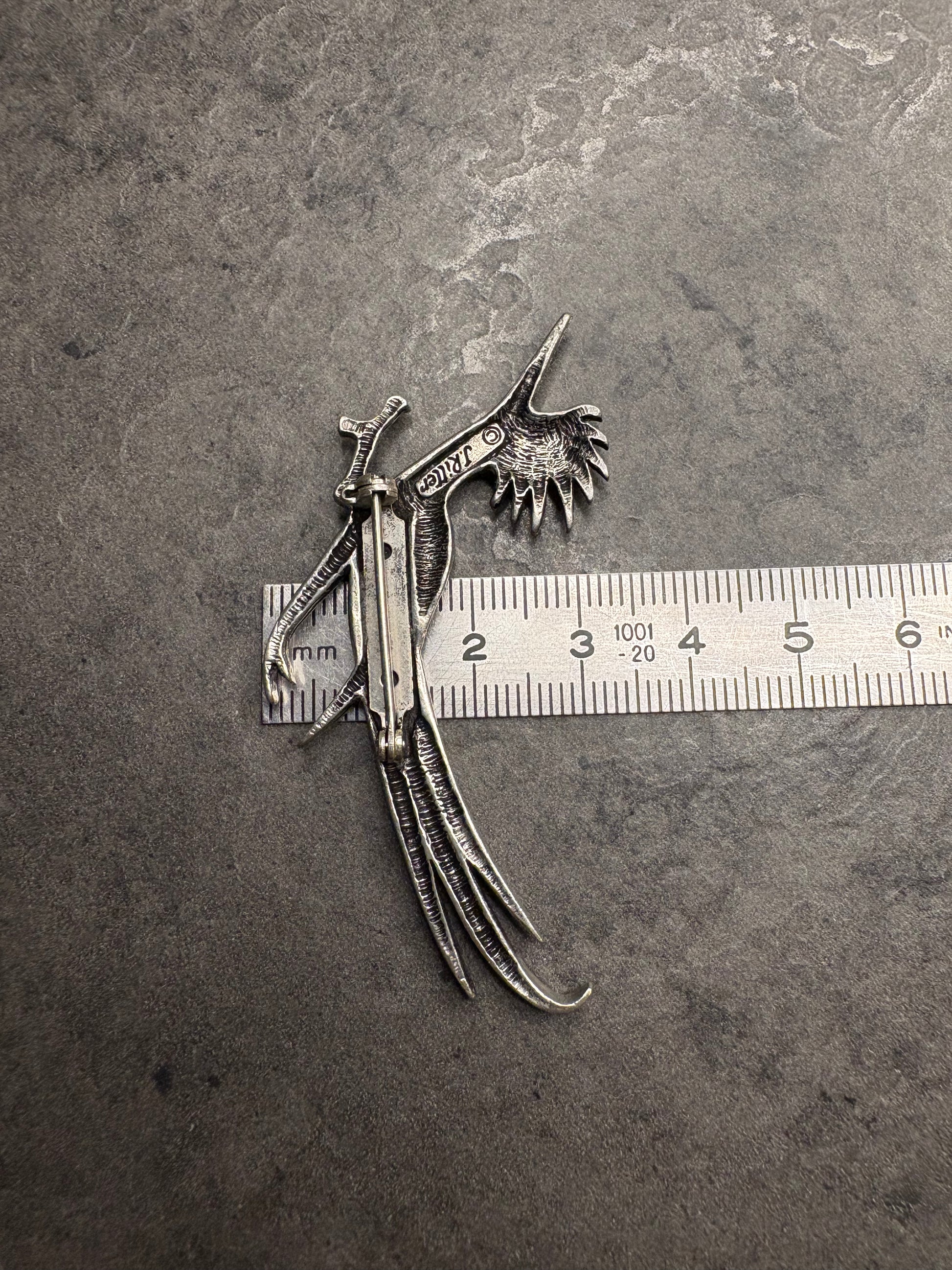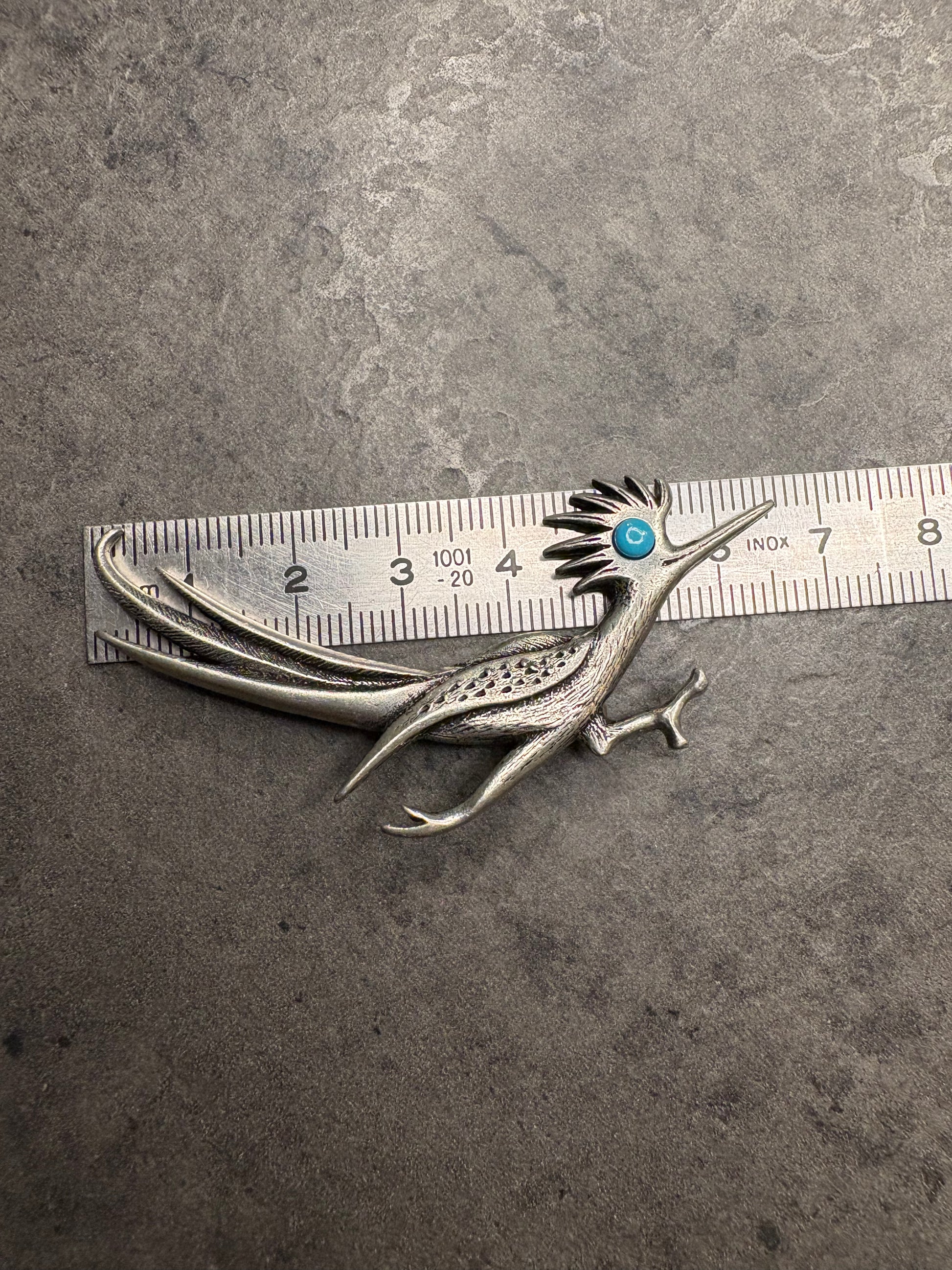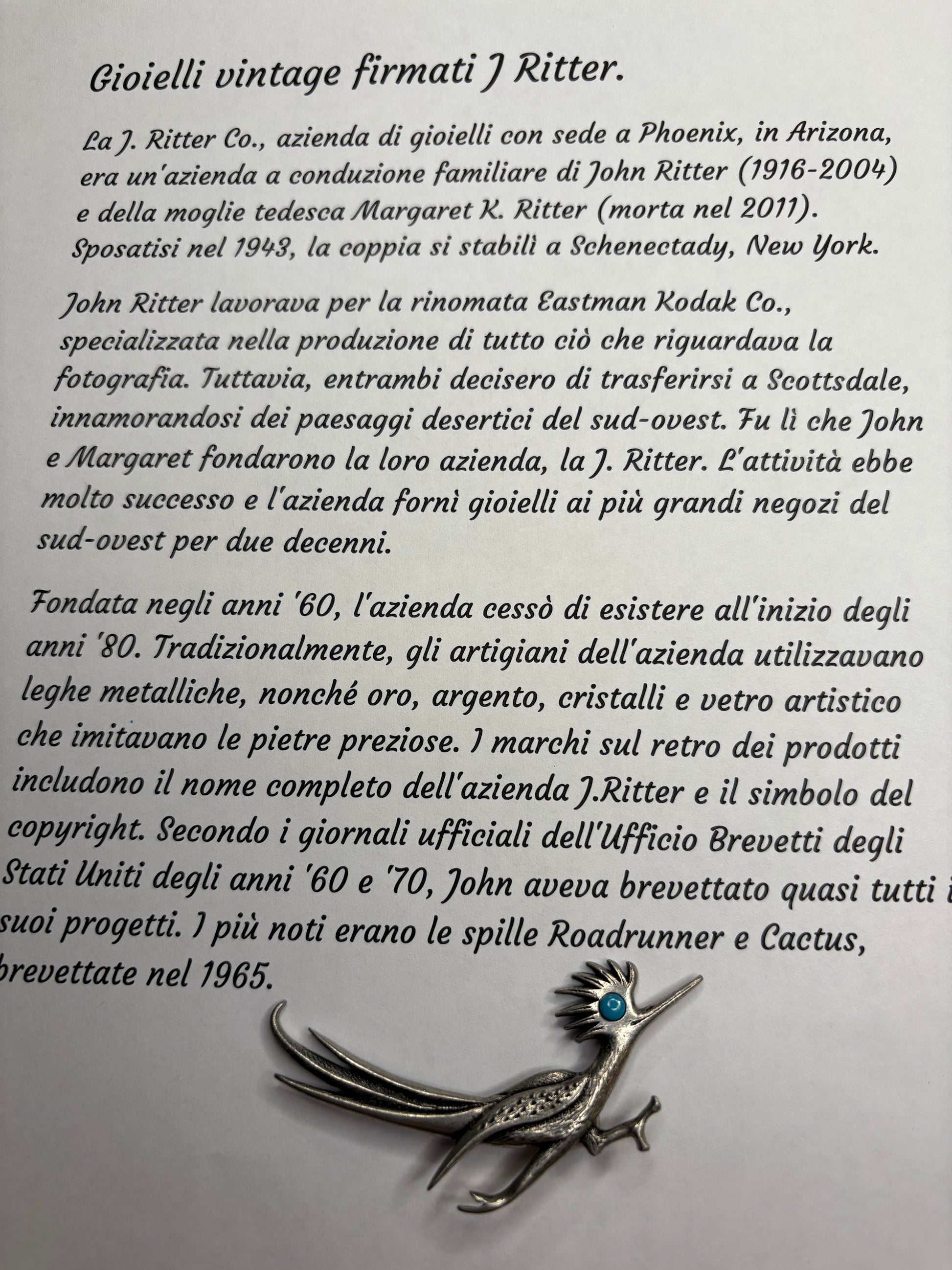 Iconica spilla vintage raffigurante un roadrunner, firmata J. Ritter, celebre designer americano noto per le sue creazioni ispirate alla natura. Realizzata in metallo argentato, la spilla è caratterizzata da linee moderne e stilizzate, con coda allungata e corpo slanciato che suggeriscono velocità e leggerezza. L’occhio è impreziosito da un cabochon turchese, dettaglio distintivo che dona colore e personalità al design. Un gioiello dal forte impatto grafico, simbolo del modernismo americano.