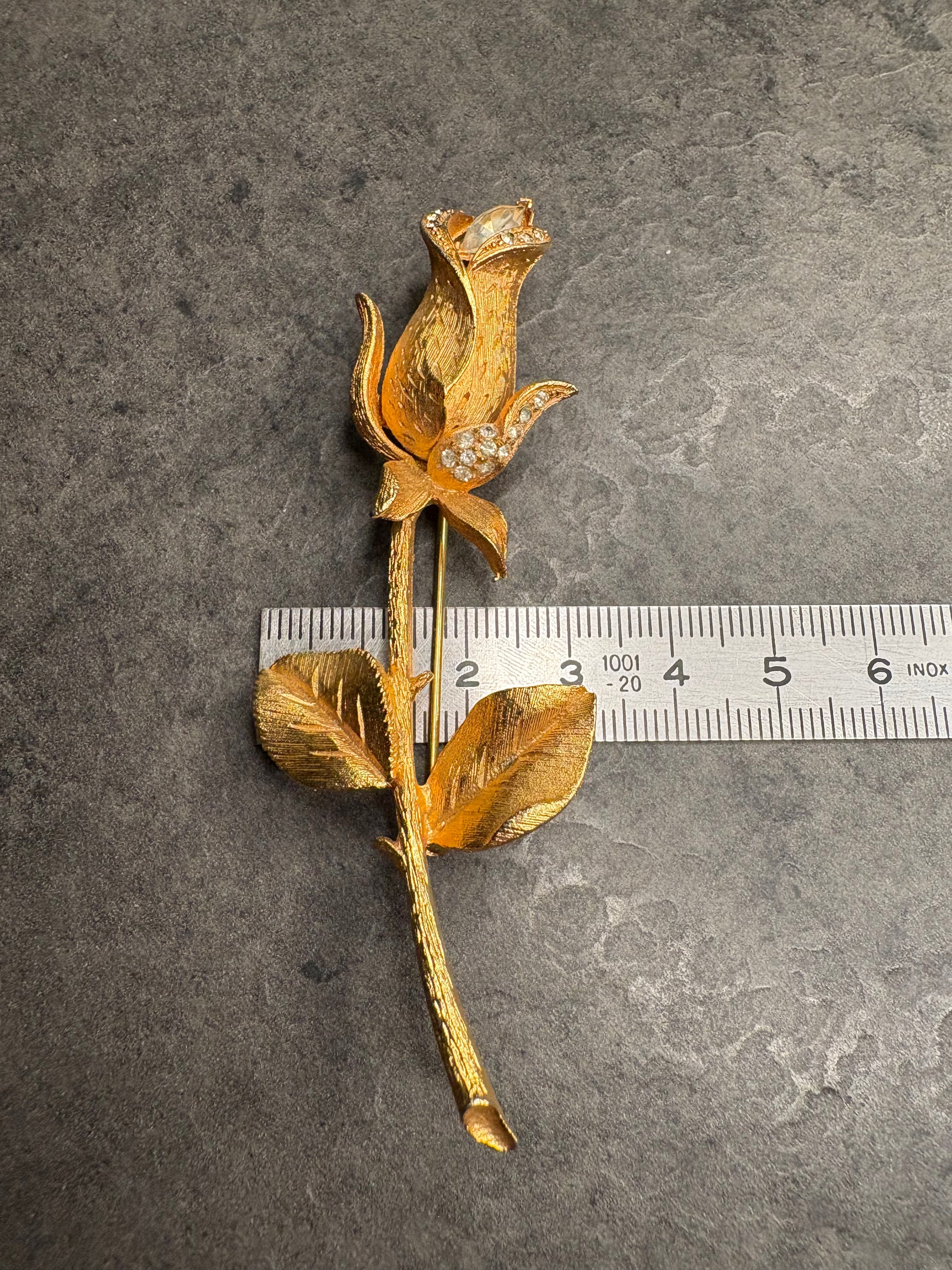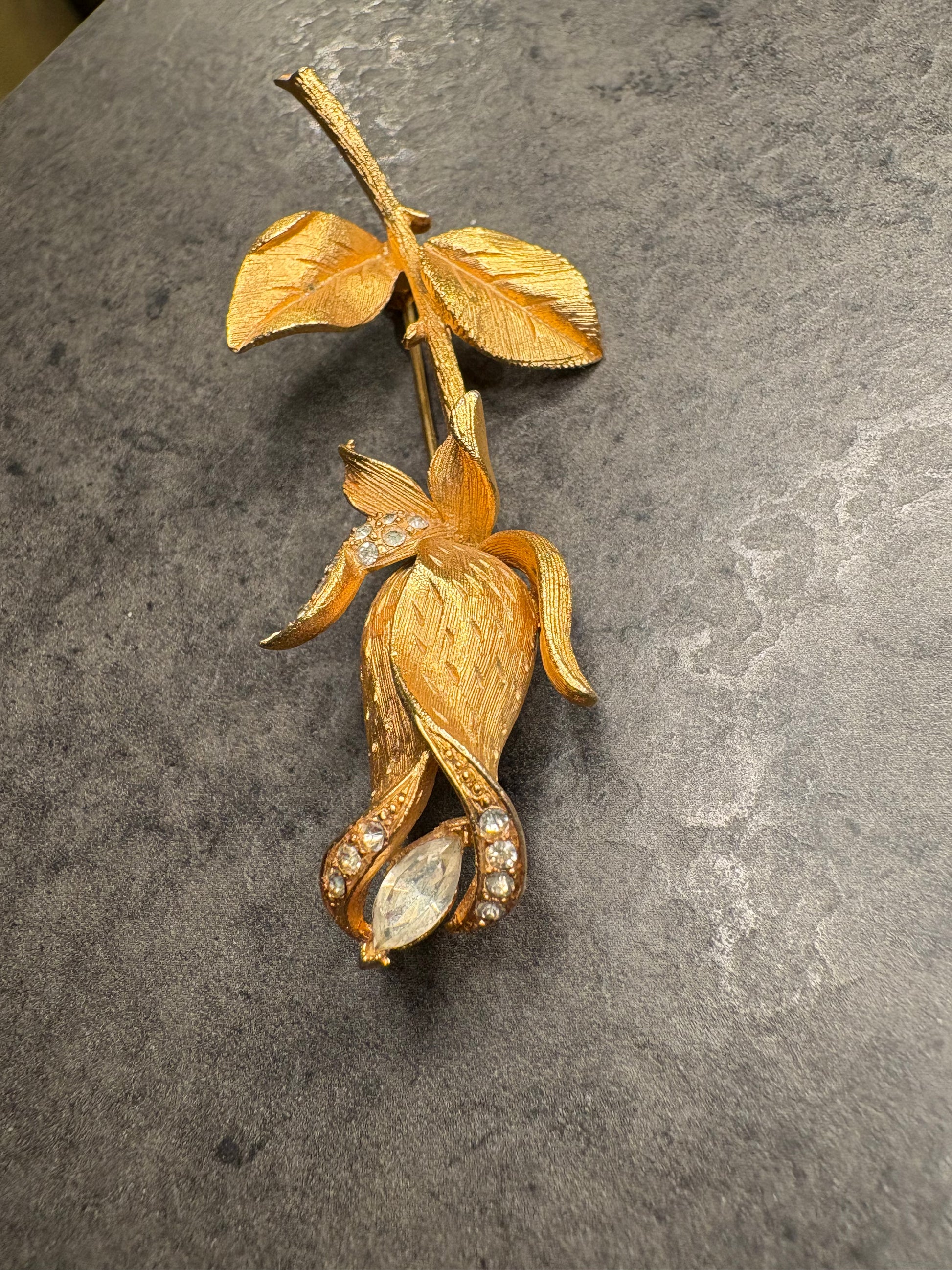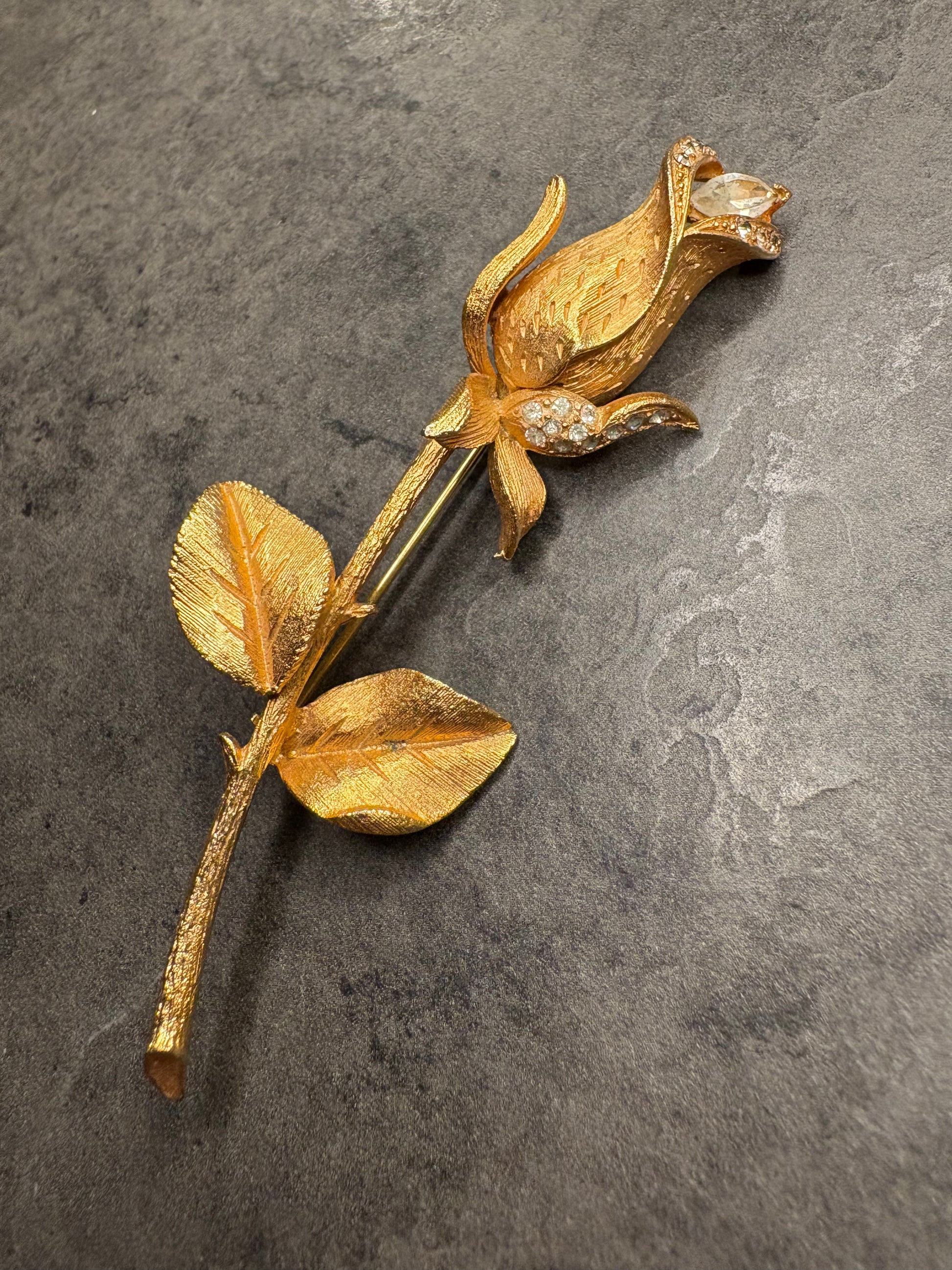 Il bocciolo, raccolto in petali sinuosi, custodisce al centro un cristallo marquise sfaccettato, mentre piccoli strass chiari decorano la base del fiore, aggiungendo un tocco di luce. Il tempo ha leggermente velato la loro brillantezza, ma senza intaccare il fascino romantico dell’insieme: anzi, questo lieve vissuto contribuisce al carattere autentico del pezzo.