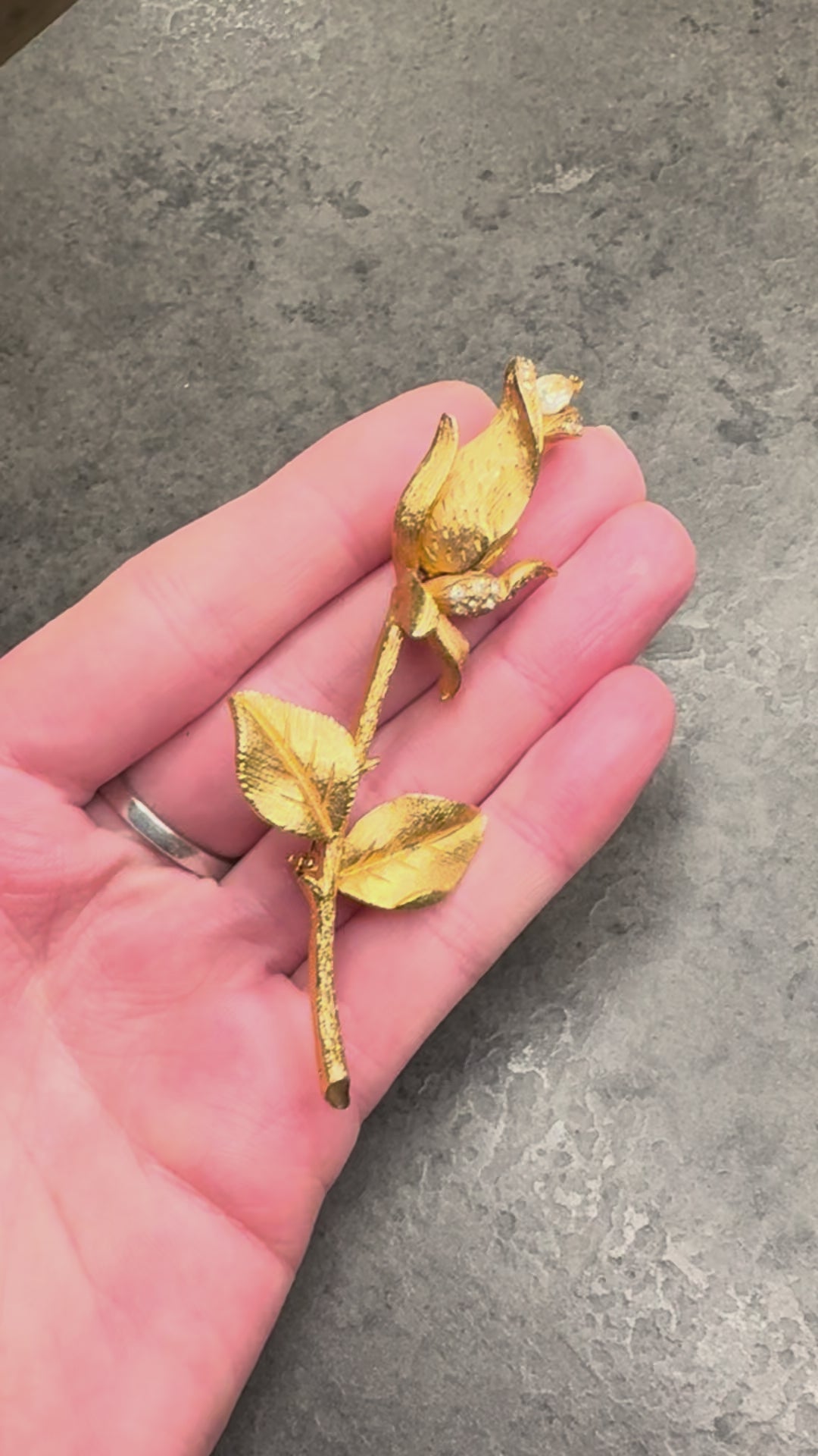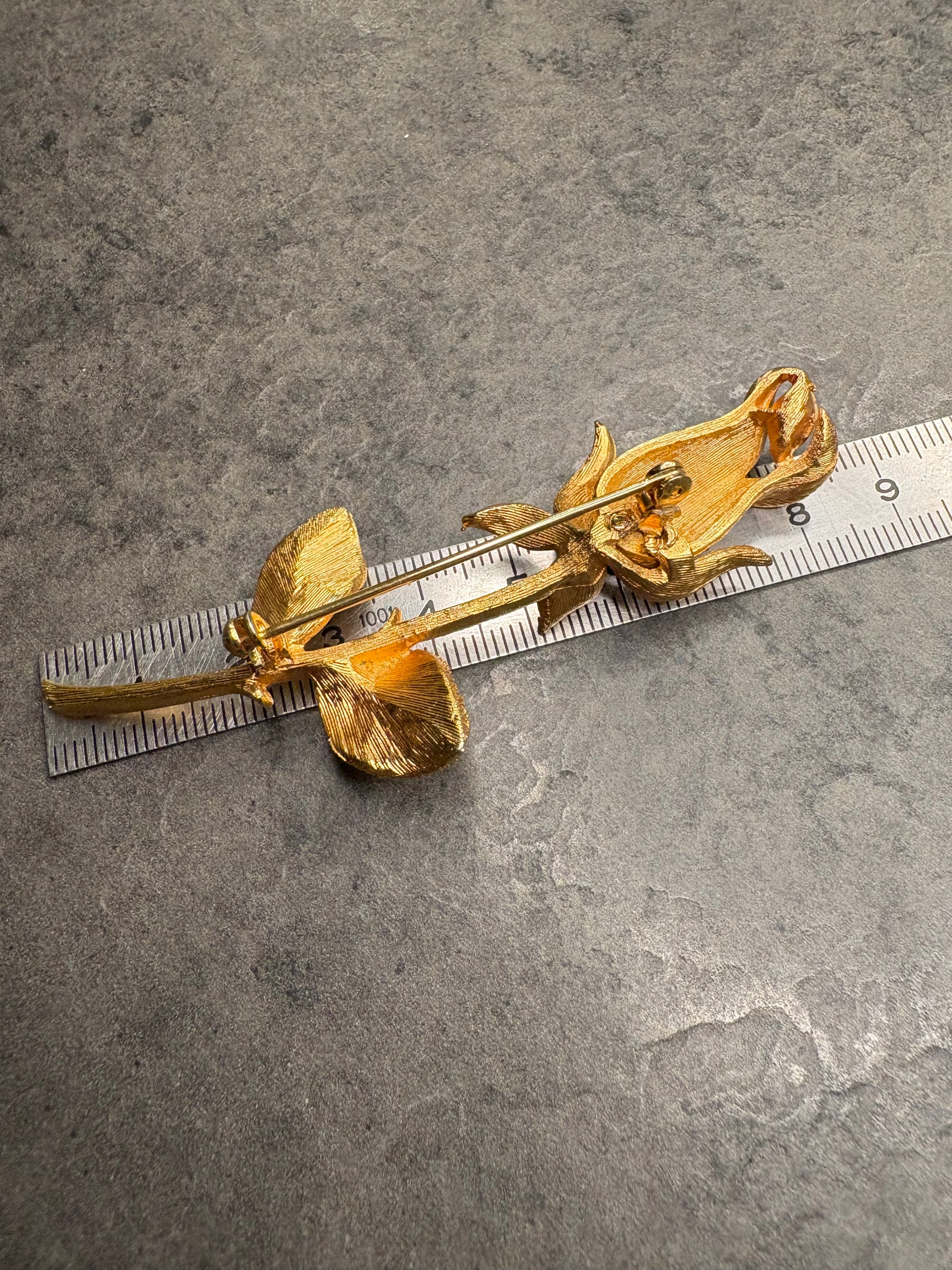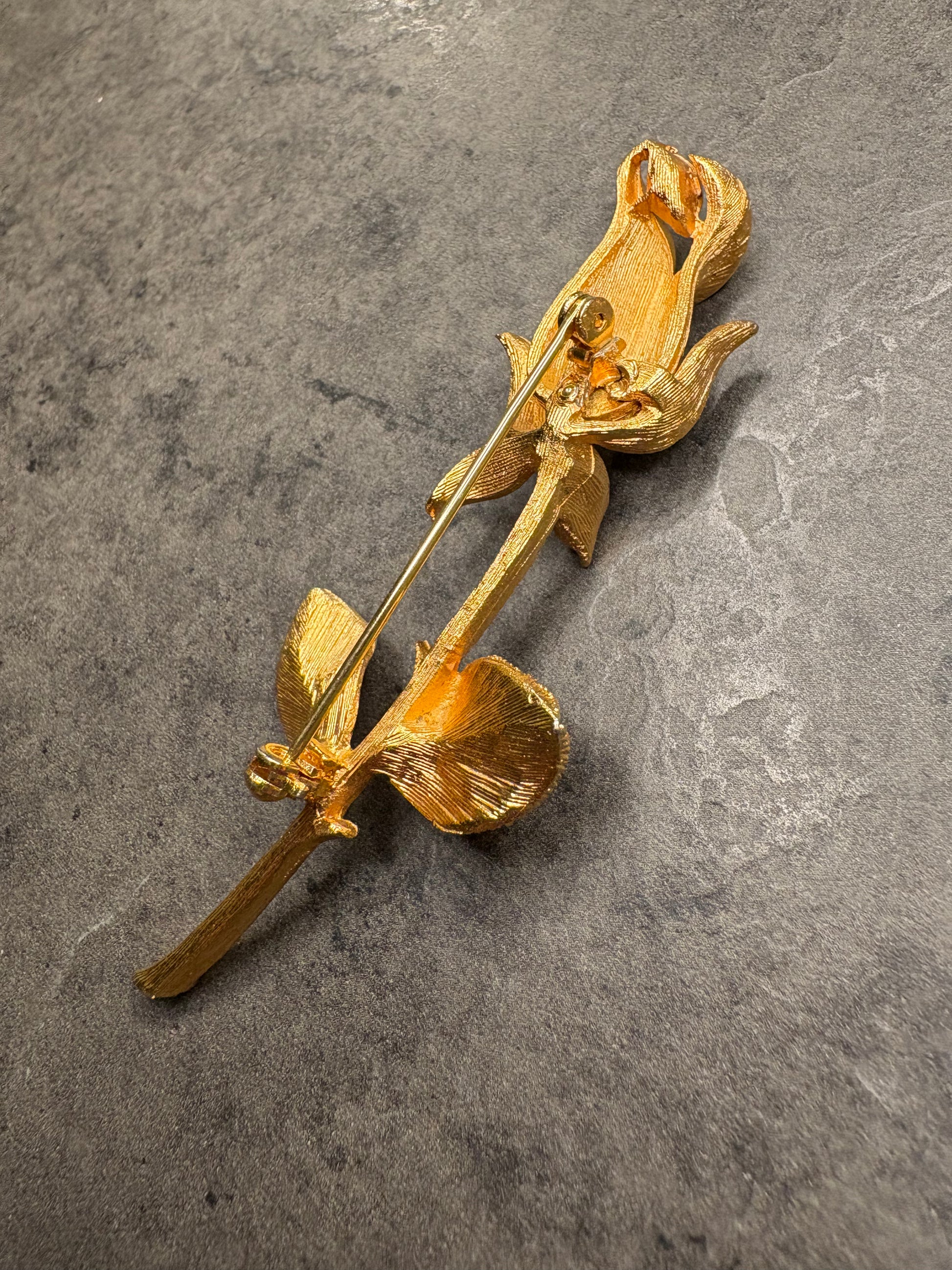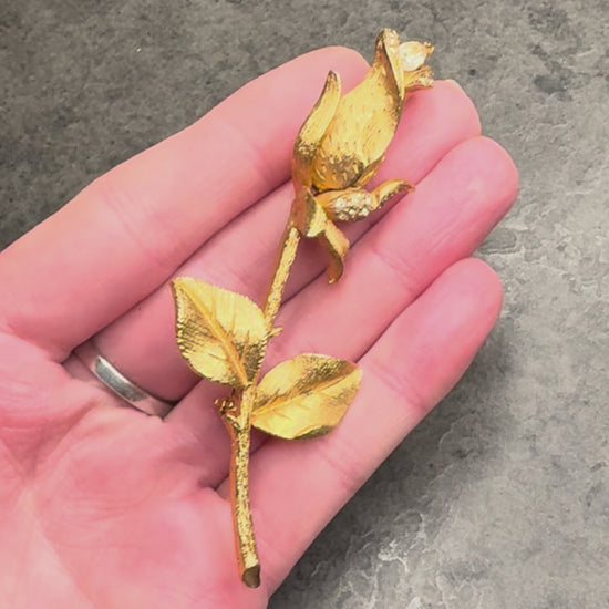 Questa splendida spilla vintage raffigura una rosa appena sbocciata, modellata in metallo dorato con una lavorazione ricca di texture che imita alla perfezione le venature di petali e foglie. È un gioiello che cattura immediatamente lo sguardo grazie alla sua forma allungata e armoniosa, pensata per impreziosire una giacca, un cappotto o un abito elegante.