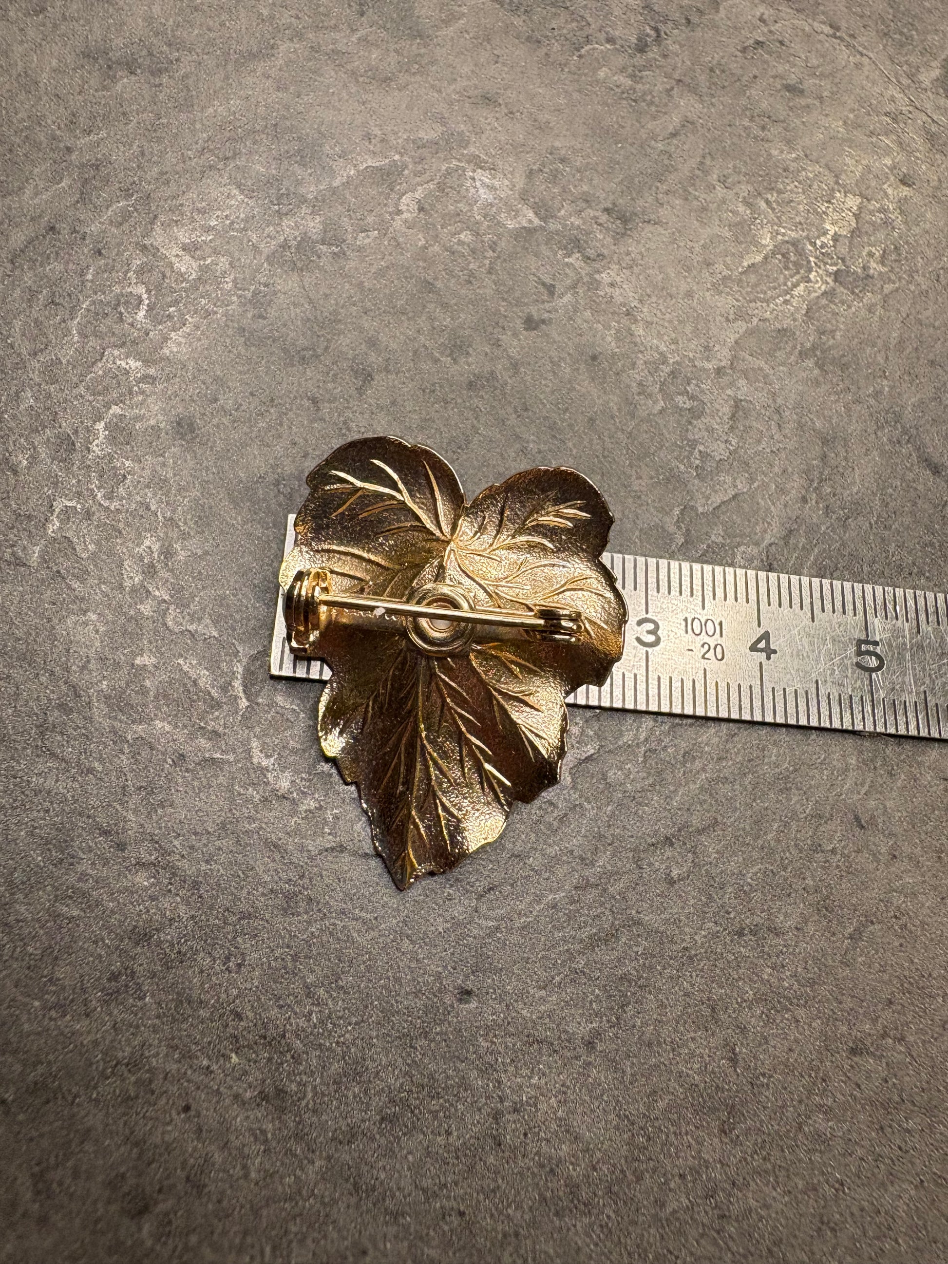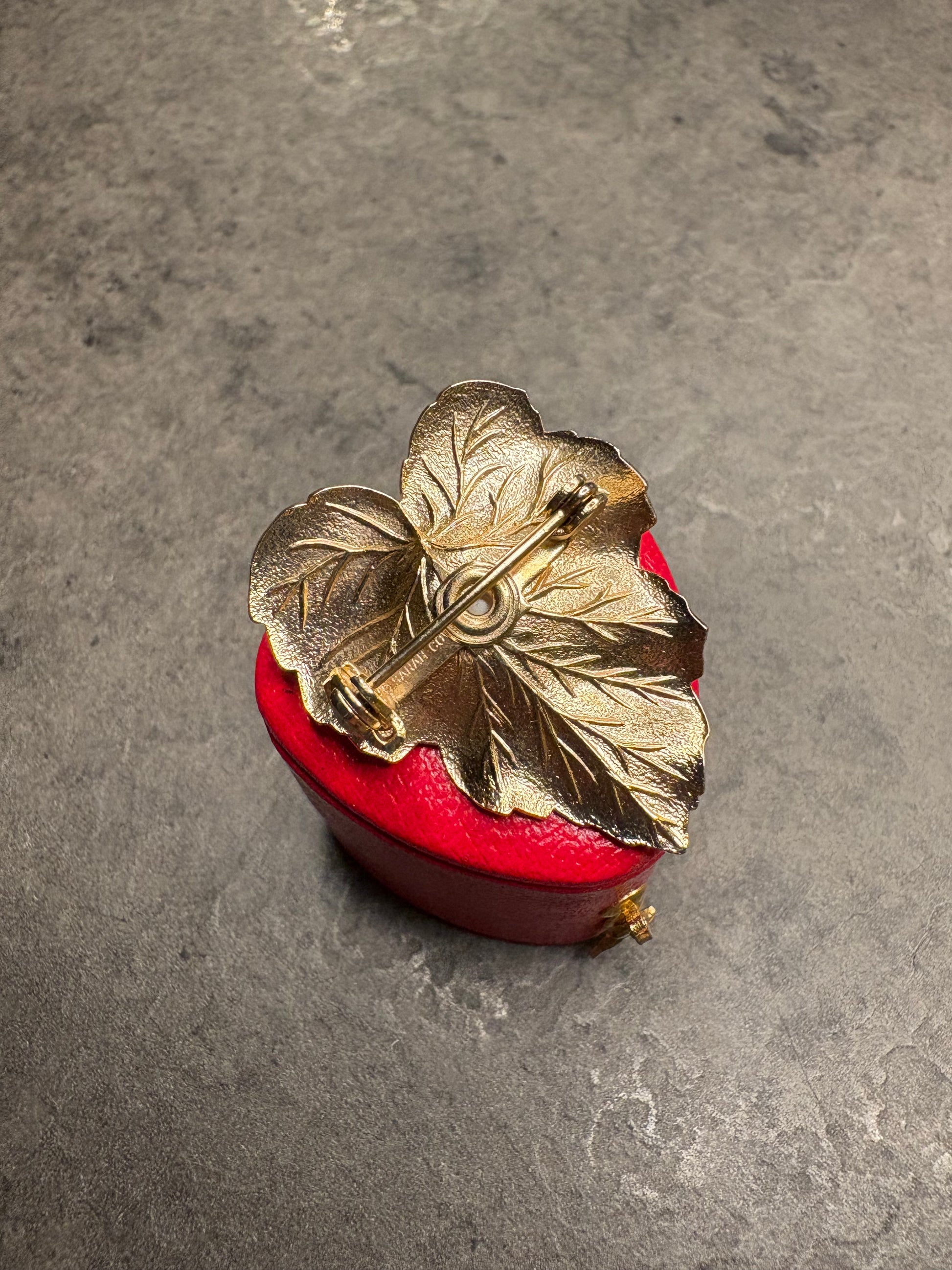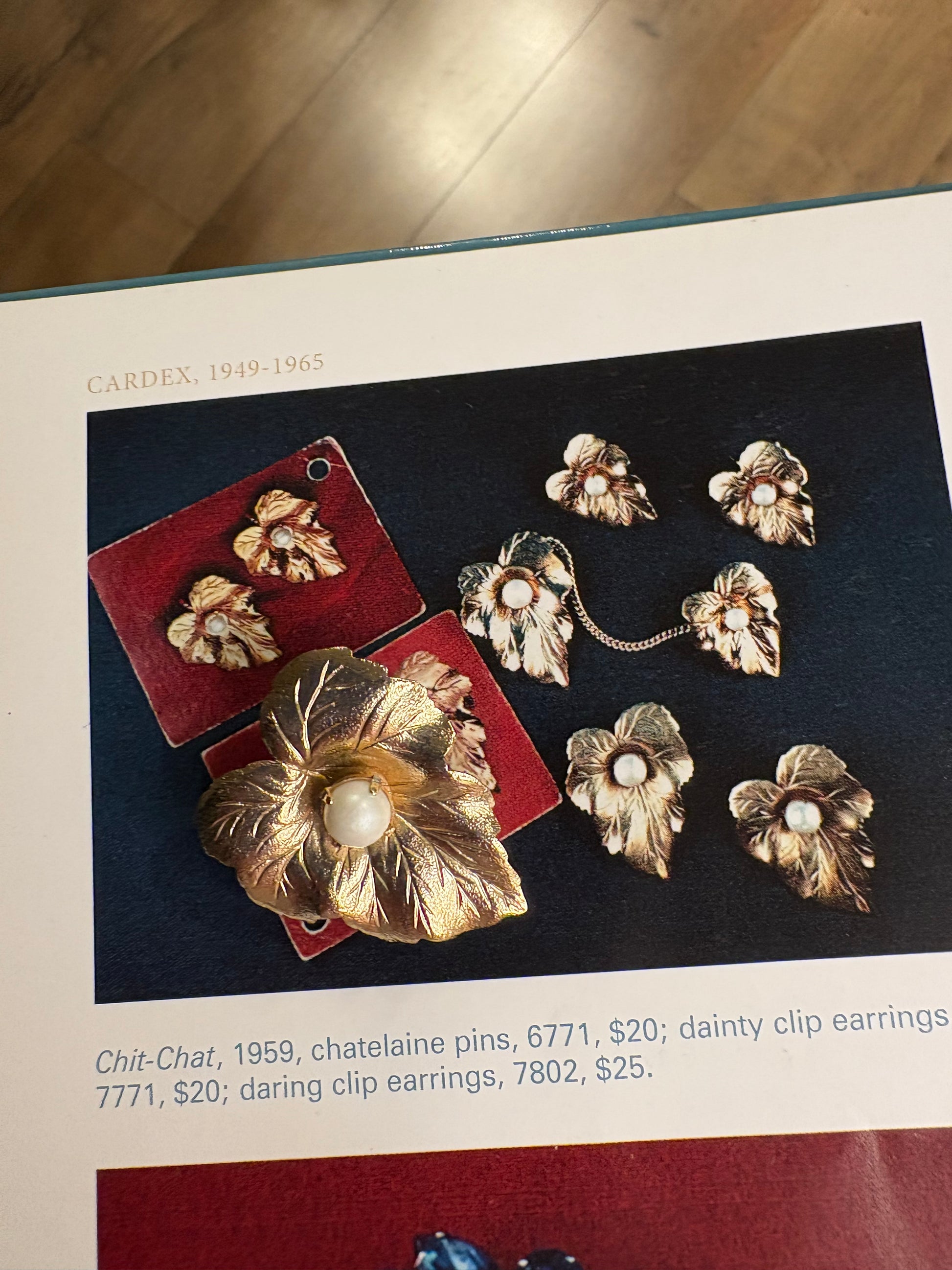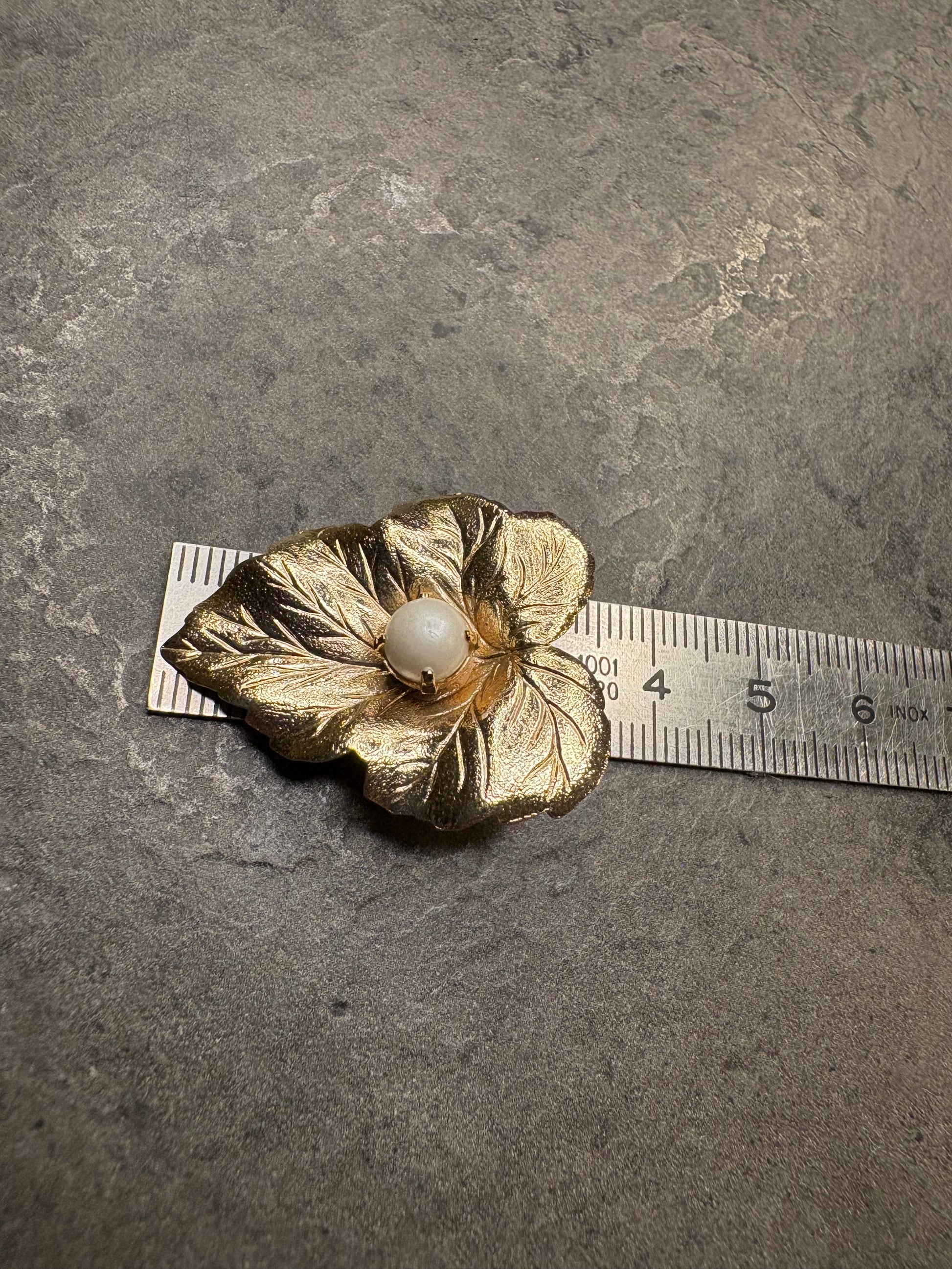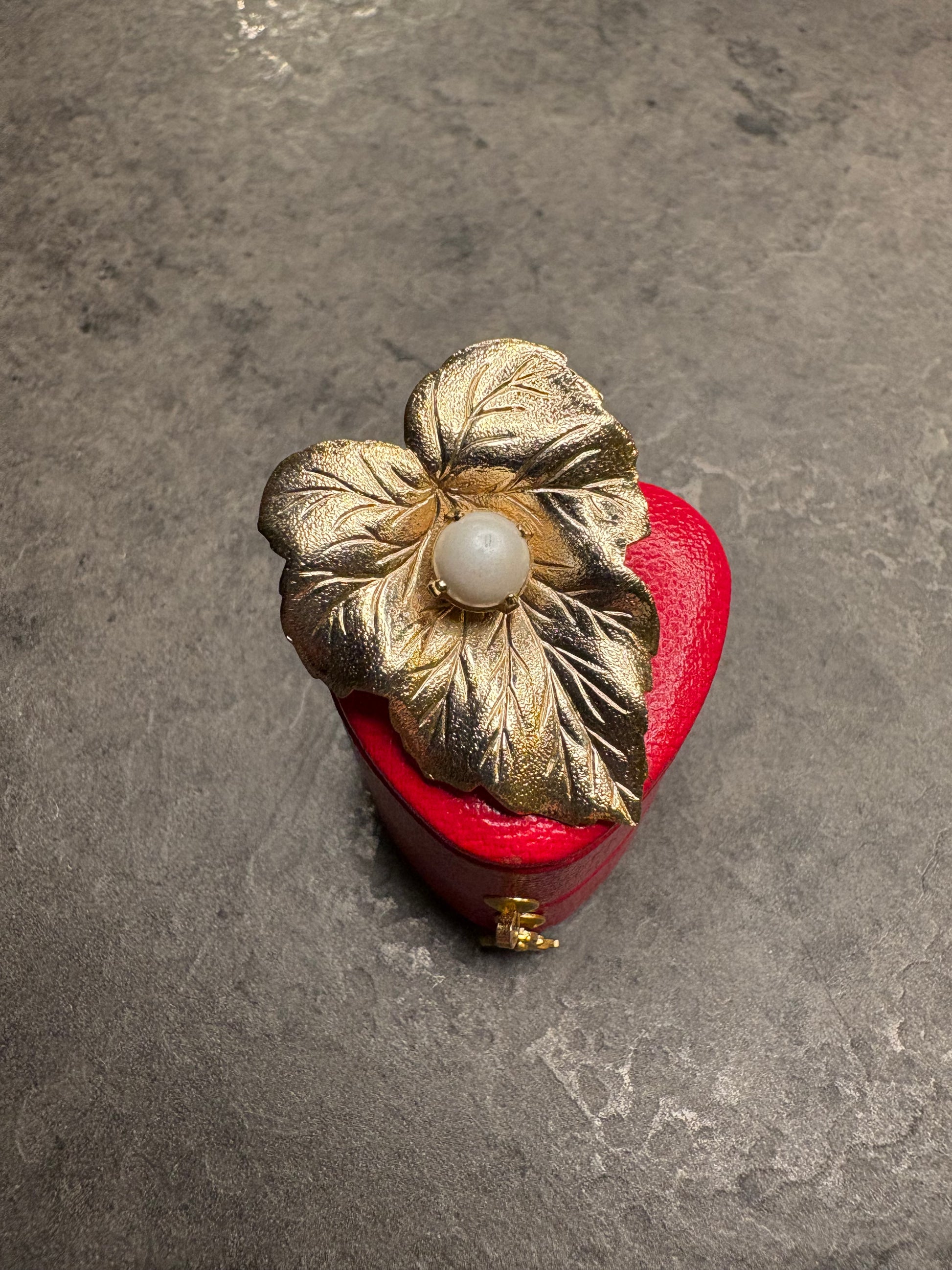 Questa splendida spilla vintage di Sarah Coventry, realizzata nel 1959 e appartenente alla collezione “Chit-Chat”, è un esempio raffinato dello stile naturalistico tipico degli anni ’50. La superficie dorata satinata riproduce con grande realismo le venature di una foglia, donandole un aspetto elegante e tridimensionale. Al centro spicca una perla artificiale bianca che illumina il design con un tocco classico e sofisticato. Pensata per una donna elegante e moderna, questa creazione faceva parte di una parure che comprendeva anche orecchini clip coordinati, come riportato nei cataloghi originali dell’epoca. Un gioiello iconico e senza tempo, oggi molto ricercato dai collezionisti per il suo fascino intramontabile e il suo valore storico.