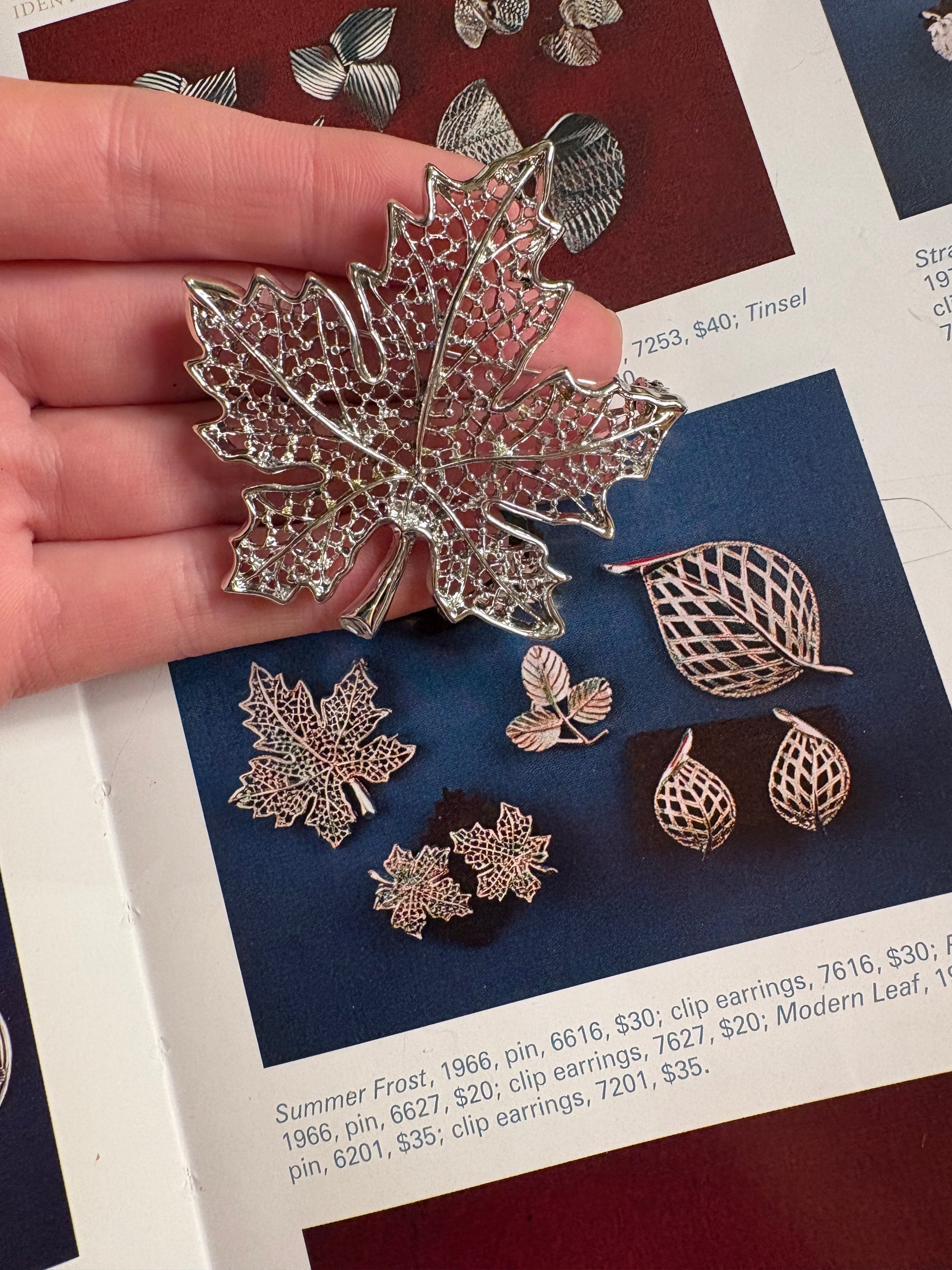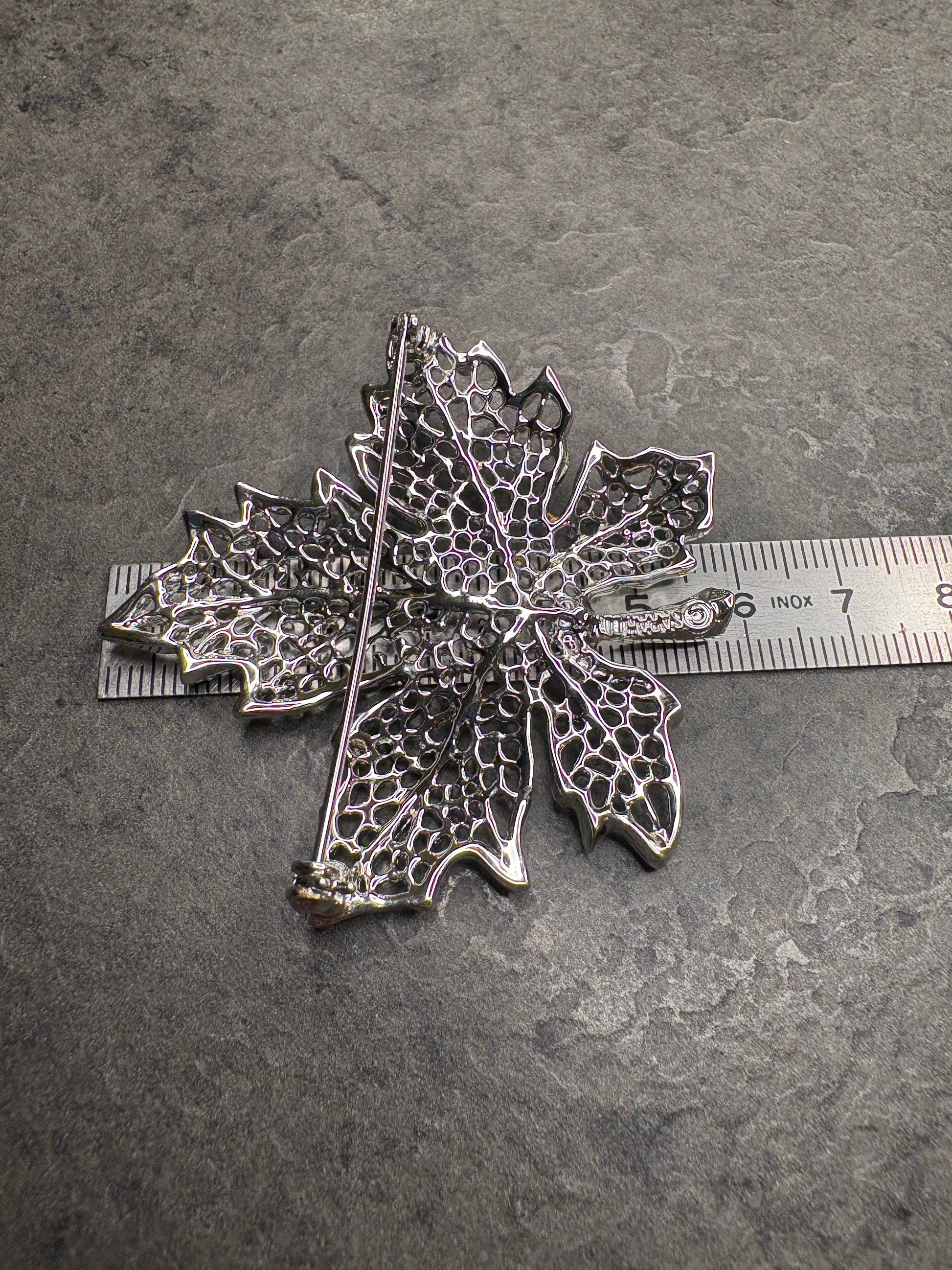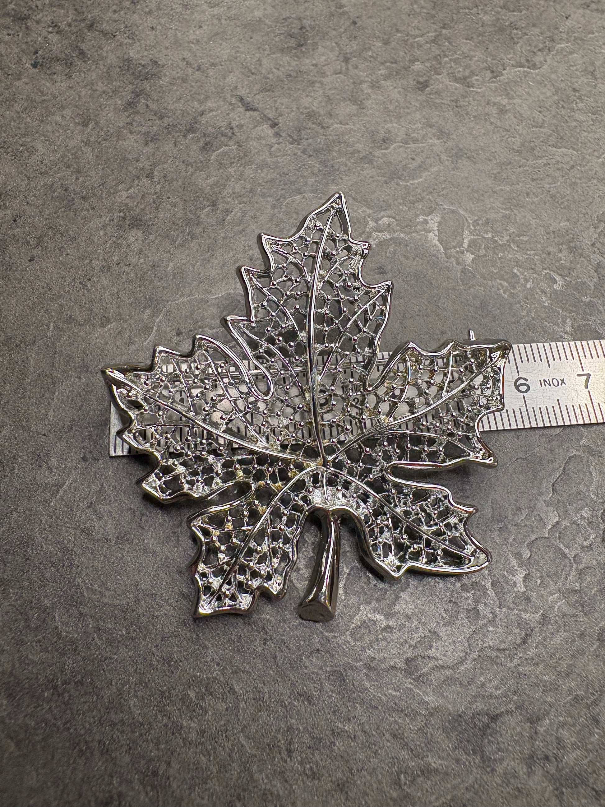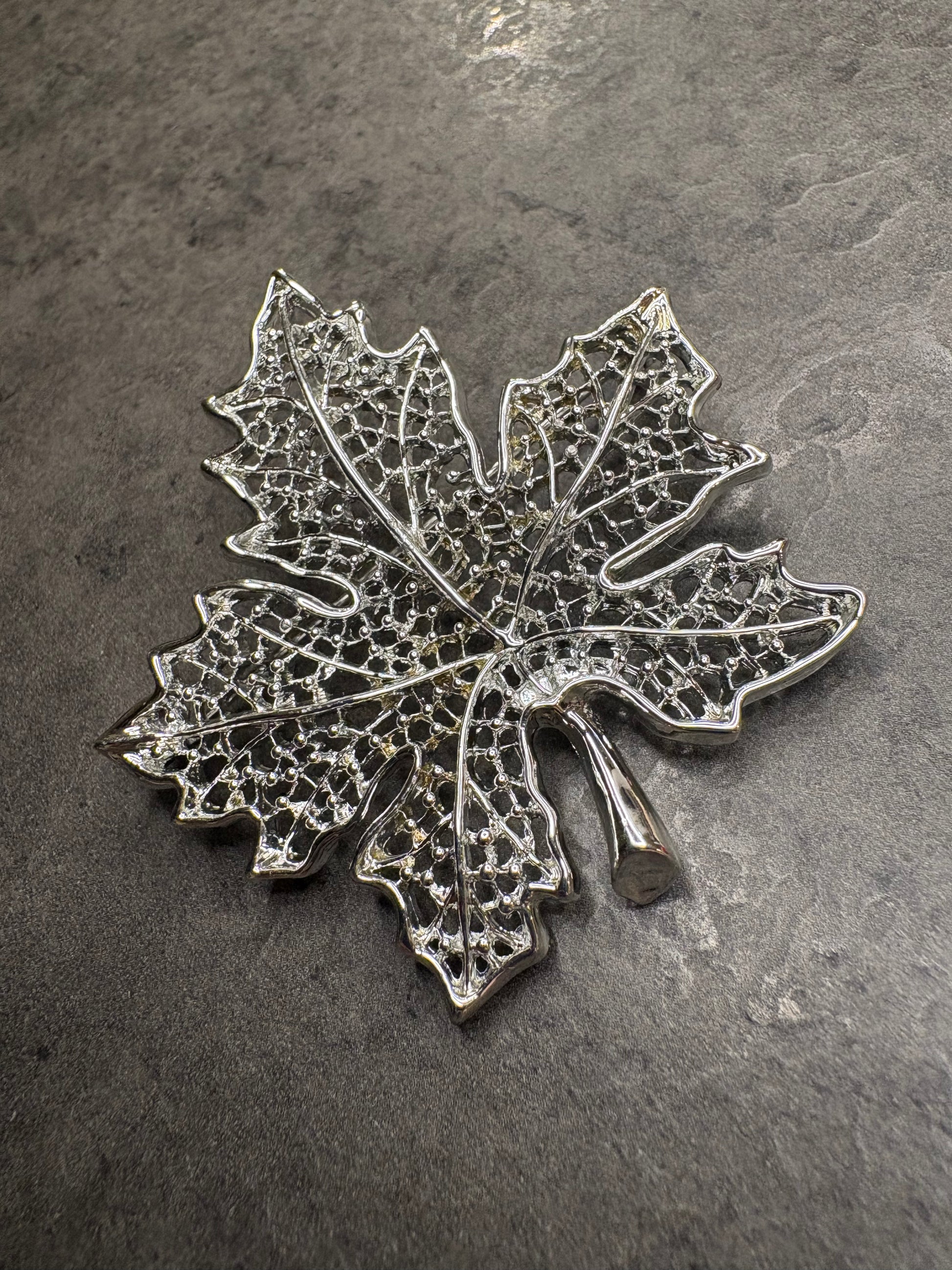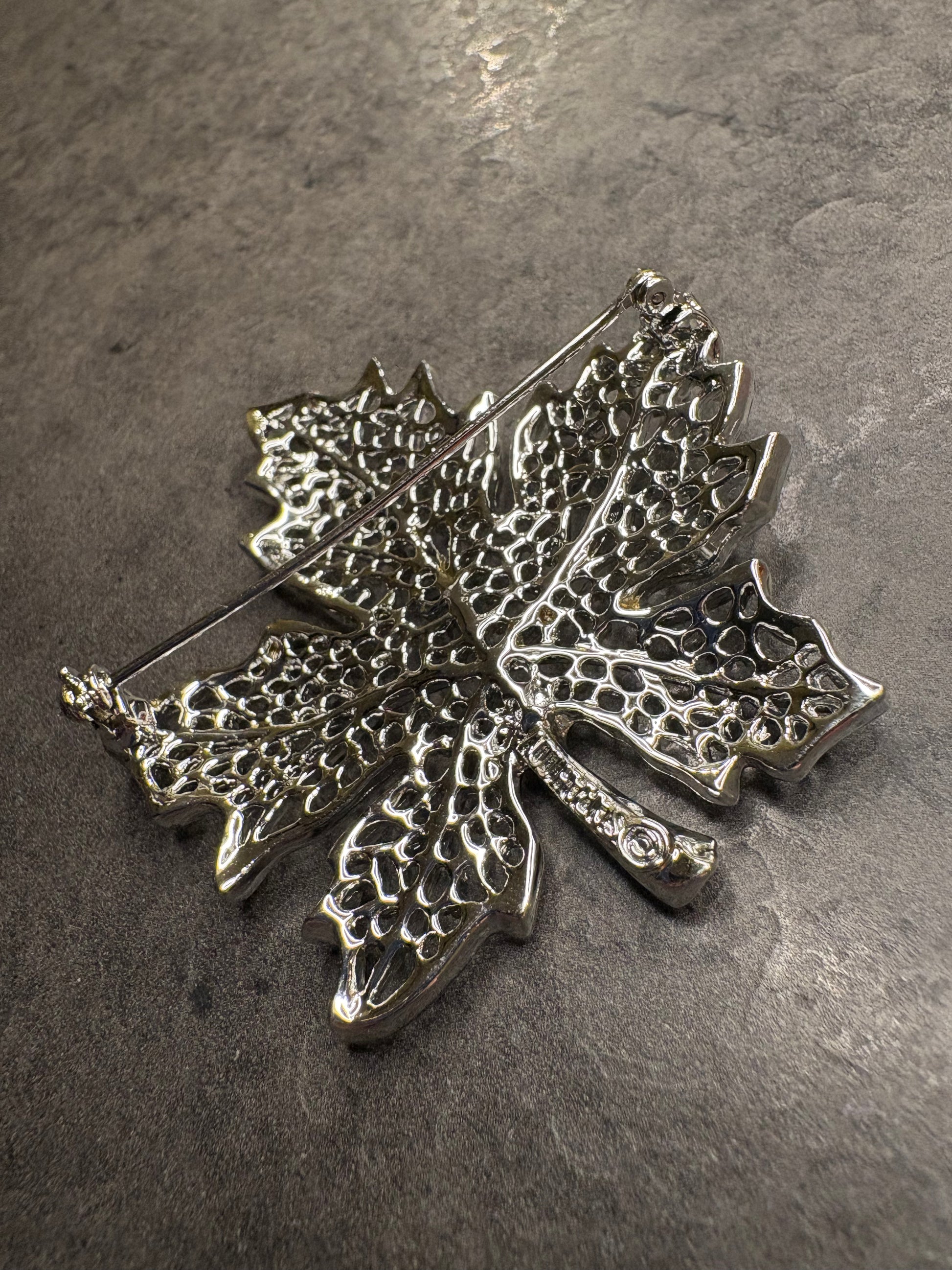 Realizzata in metallo argentato con finitura brillante, la spilla riproduce una foglia d’acero dal profilo elegante e realistico. Il delicato traforo che attraversa l’intera superficie crea un effetto leggero e arioso, mentre le piccole lavorazioni in rilievo aggiungono profondità e movimento, ricordando la trama delle nervature naturali.