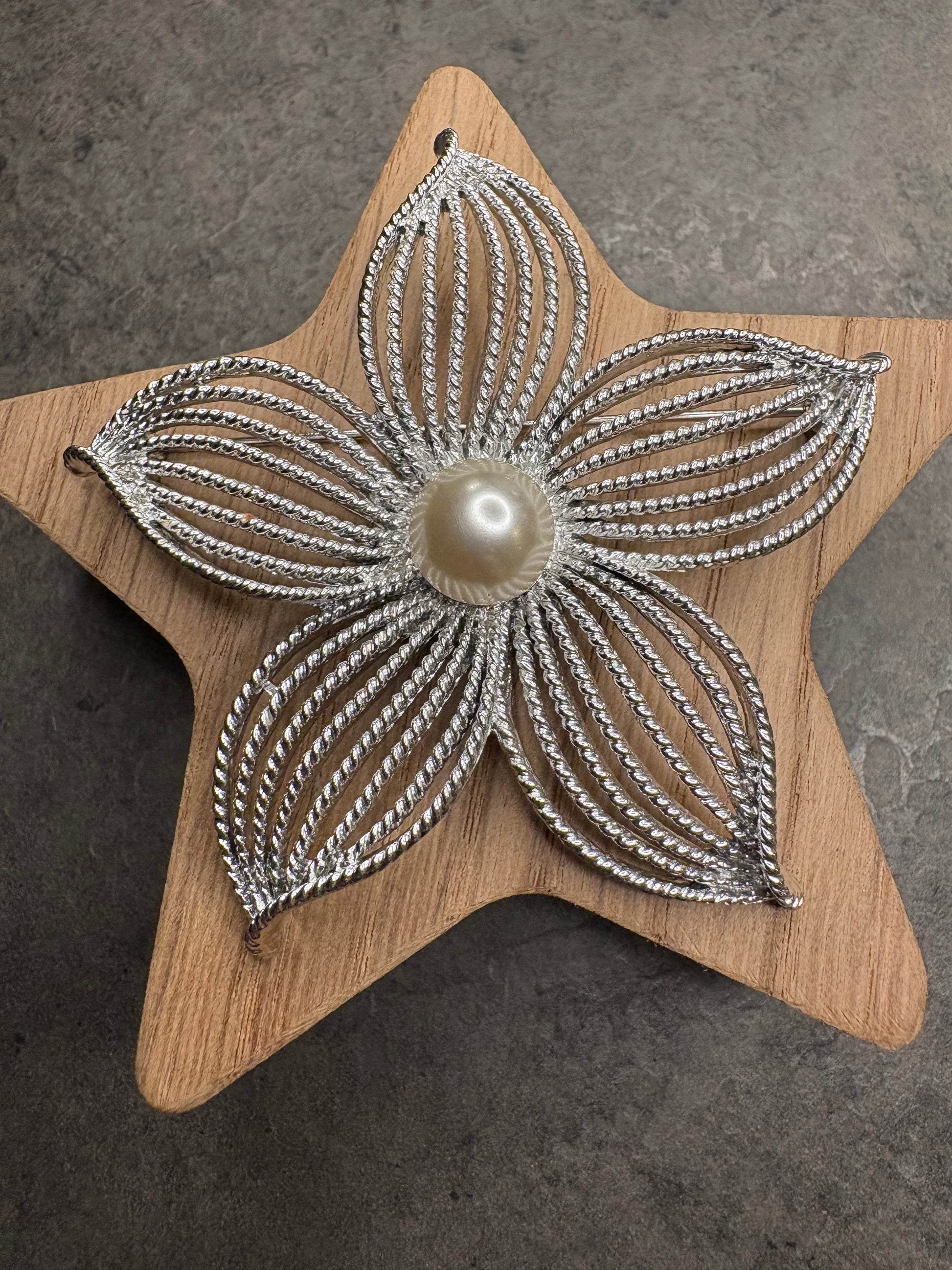 Al centro del fiore è incastonata una perla artificiale che dona morbidezza e un’eleganza senza tempo al design. La struttura leggera e ariosa richiama un fiore stilizzato illuminato dalla luce lunare, in perfetto stile anni ’60.