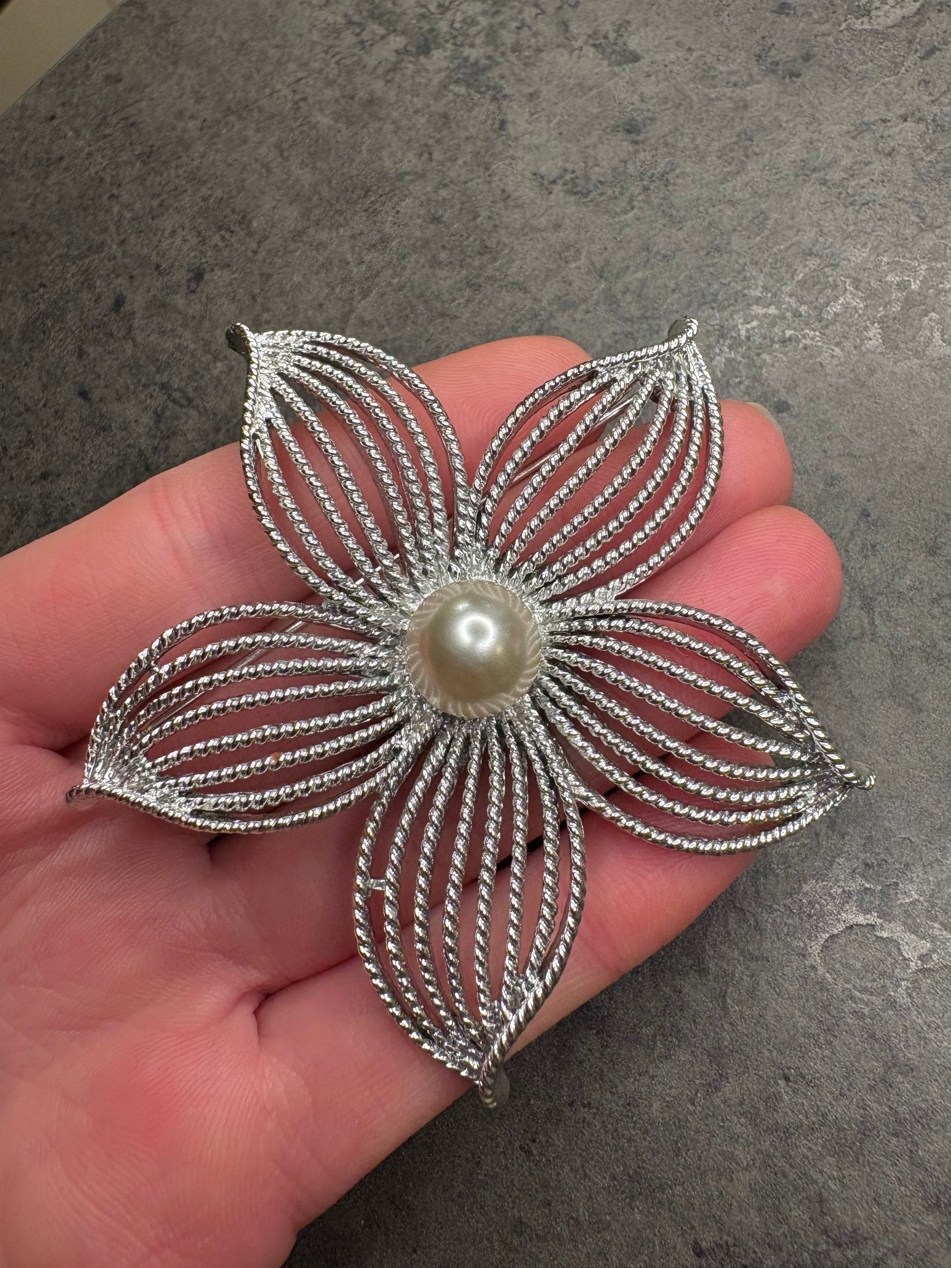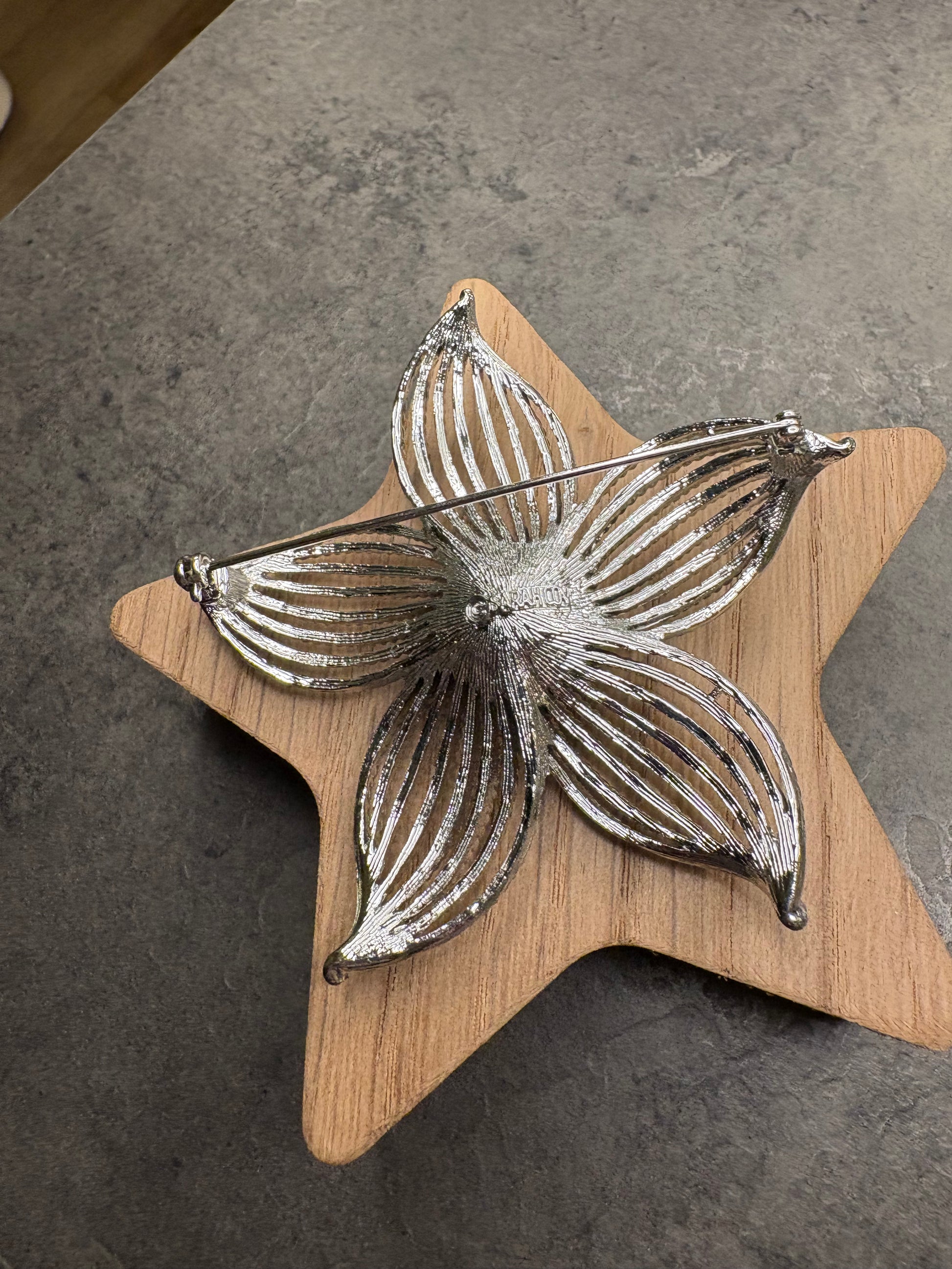 Delicata e raffinata spilla floreale Sarah Coventry della collezione “Moon Flower” del 1966, realizzata in metallo color argento con una splendida lavorazione a petali sottili e nervature decorative.