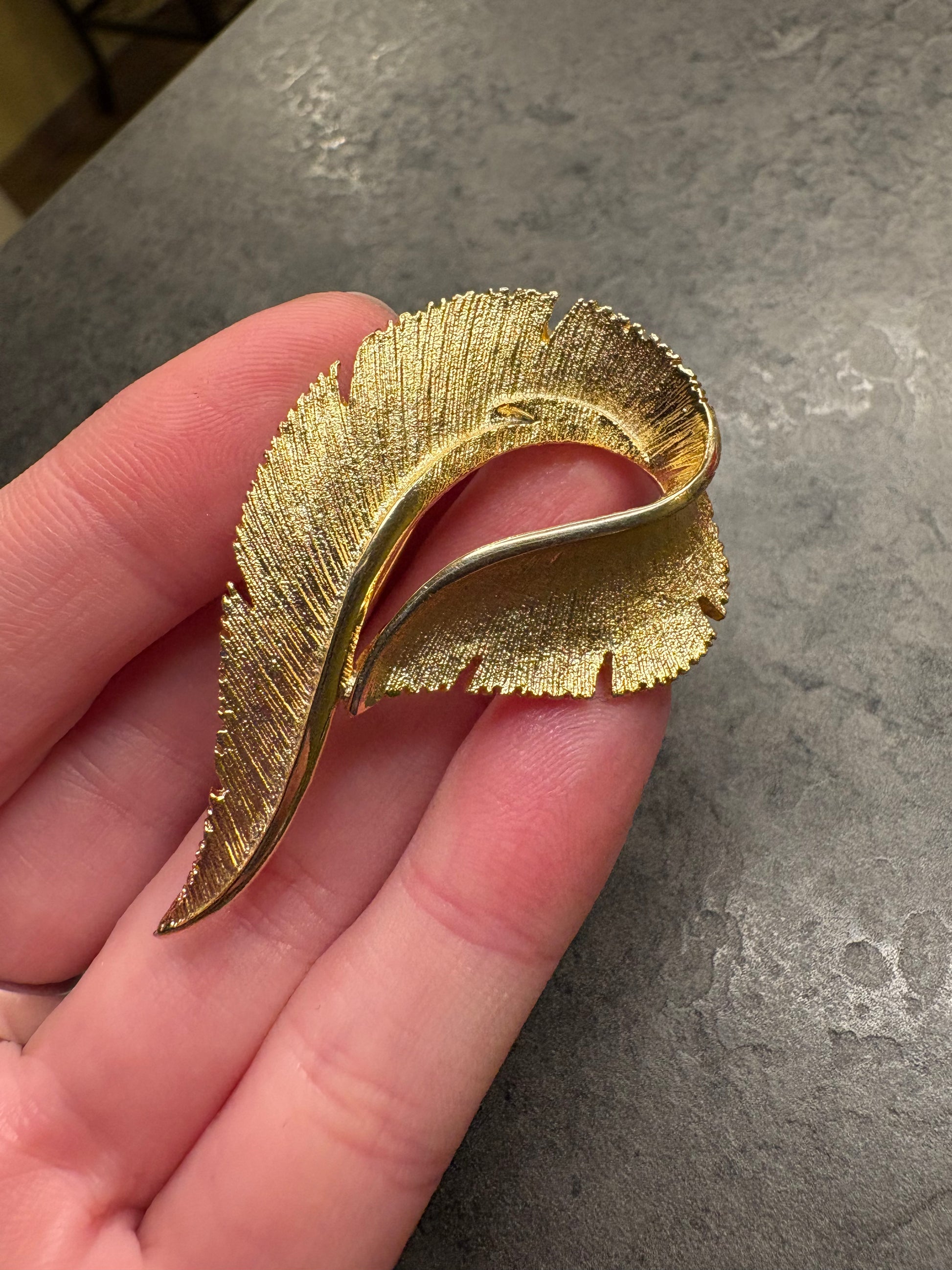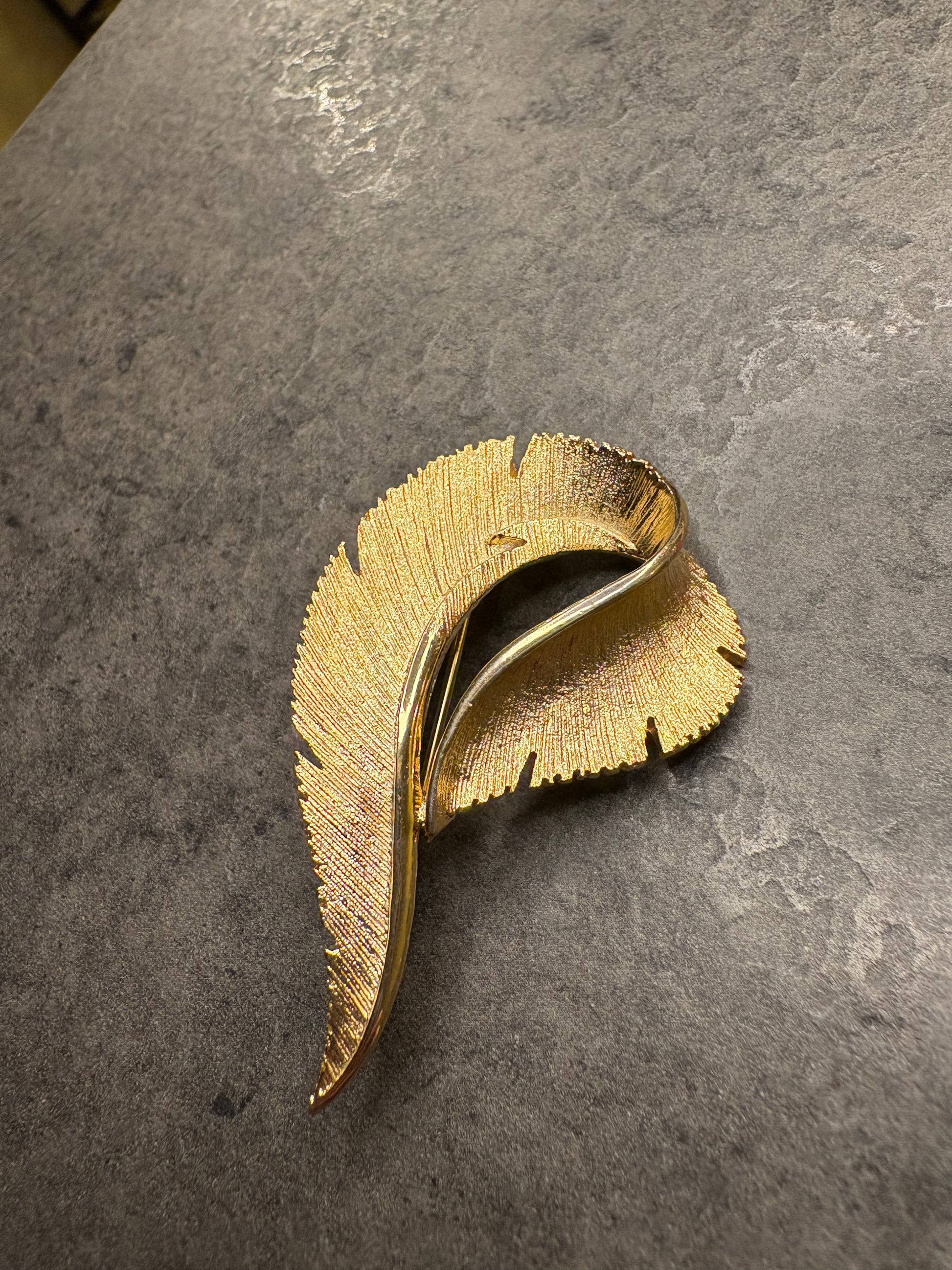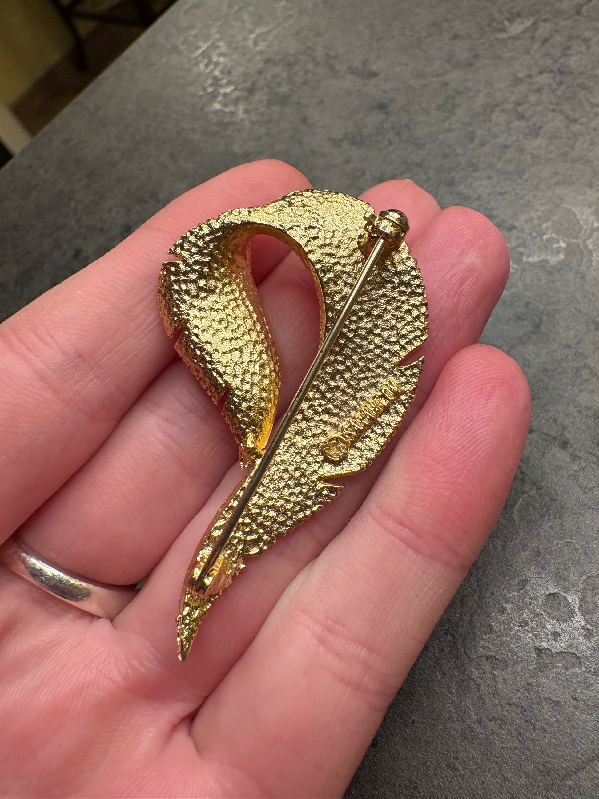 Questa raffinata spilla vintage “Feather-Brite” di Sarah Coventry (1968) è un magnifico esempio del design elegante e leggero che caratterizzò le creazioni della maison negli anni ’60. Realizzata con una placcatura dorata luminosa, presenta una forma piumata sinuosa, resa attraverso una lavorazione testurizzata finissima che imita le fibre delicate di una vera piuma. La linea centrale liscia e lucida crea un contrasto armonioso con la superficie graffiata, donando movimento e brillantezza.