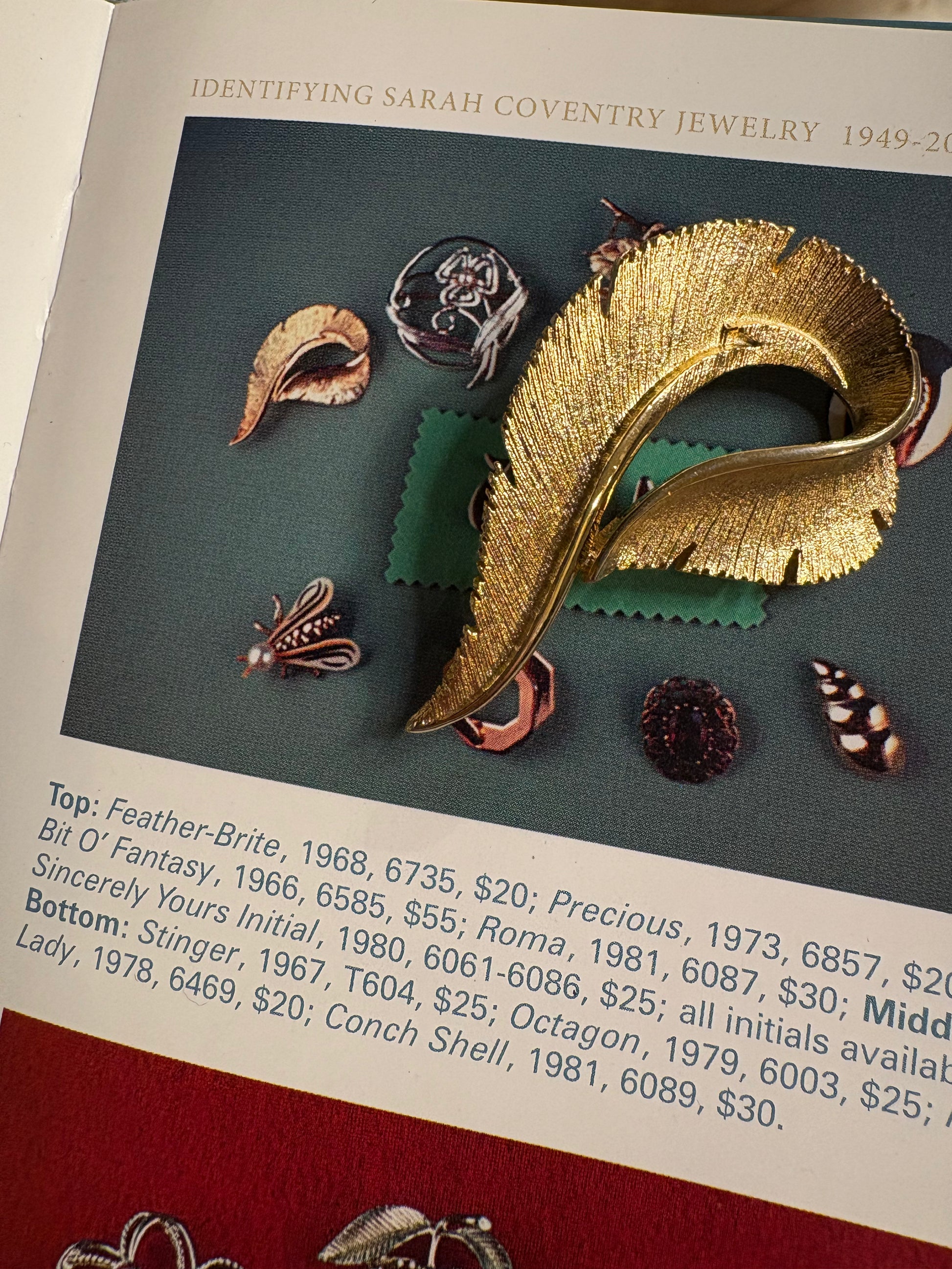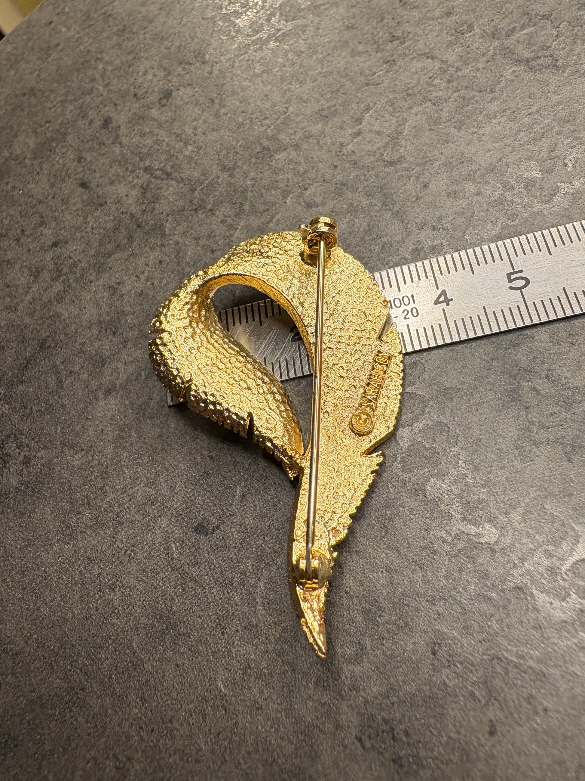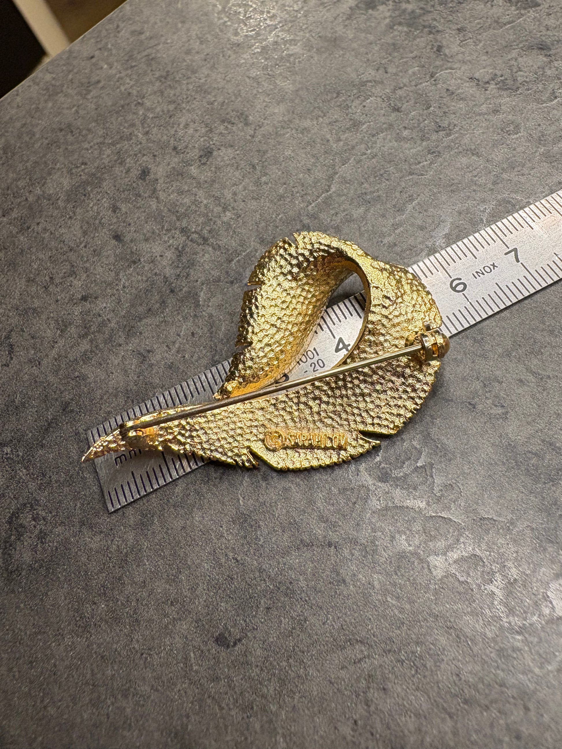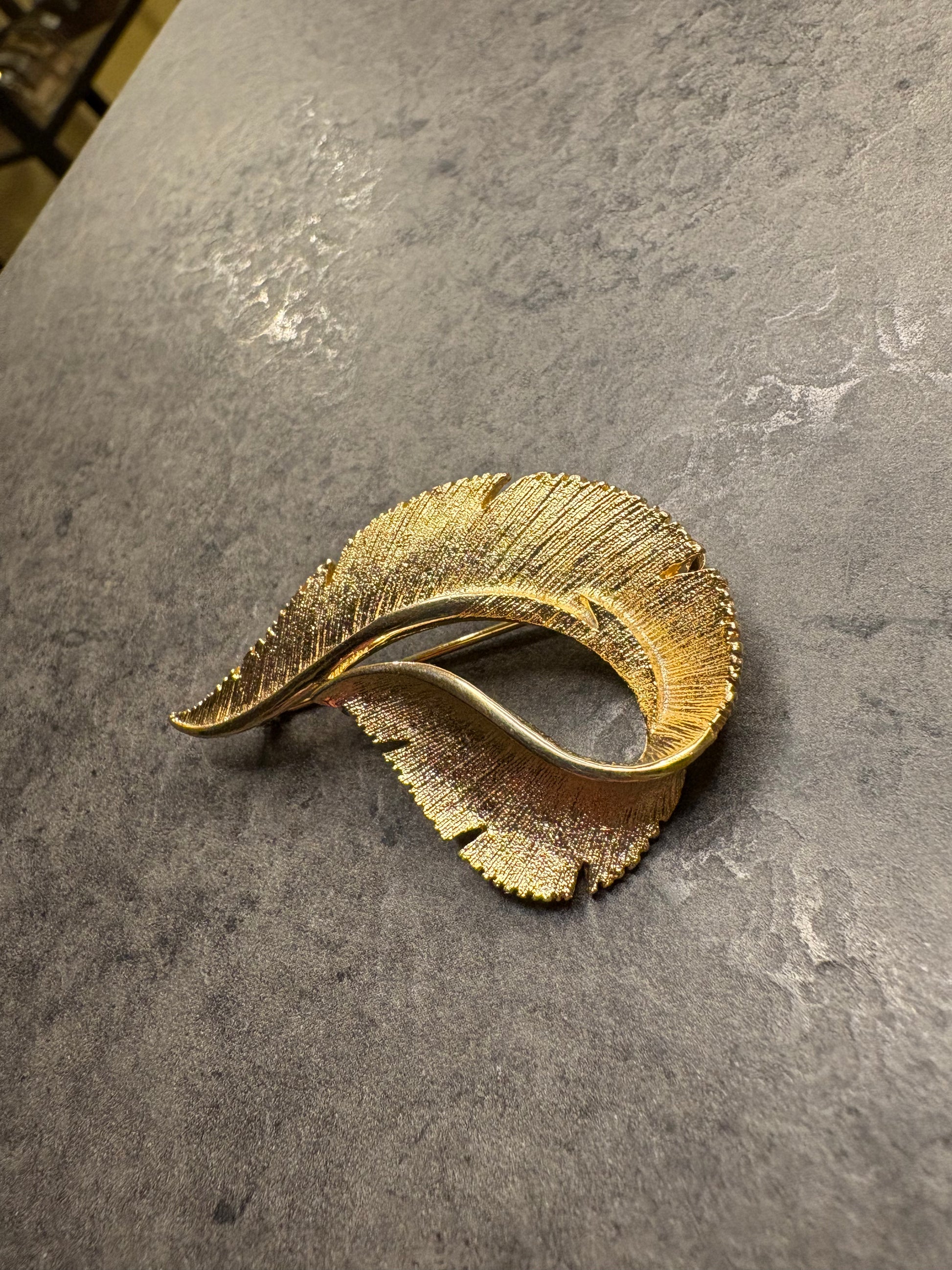 Questa raffinata spilla vintage “Feather-Brite” di Sarah Coventry (1968) è un magnifico esempio del design elegante e leggero che caratterizzò le creazioni della maison negli anni ’60. Realizzata con una placcatura dorata luminosa, presenta una forma piumata sinuosa, resa attraverso una lavorazione testurizzata finissima che imita le fibre delicate di una vera piuma. La linea centrale liscia e lucida crea un contrasto armonioso con la superficie graffiata, donando movimento e brillantezza.