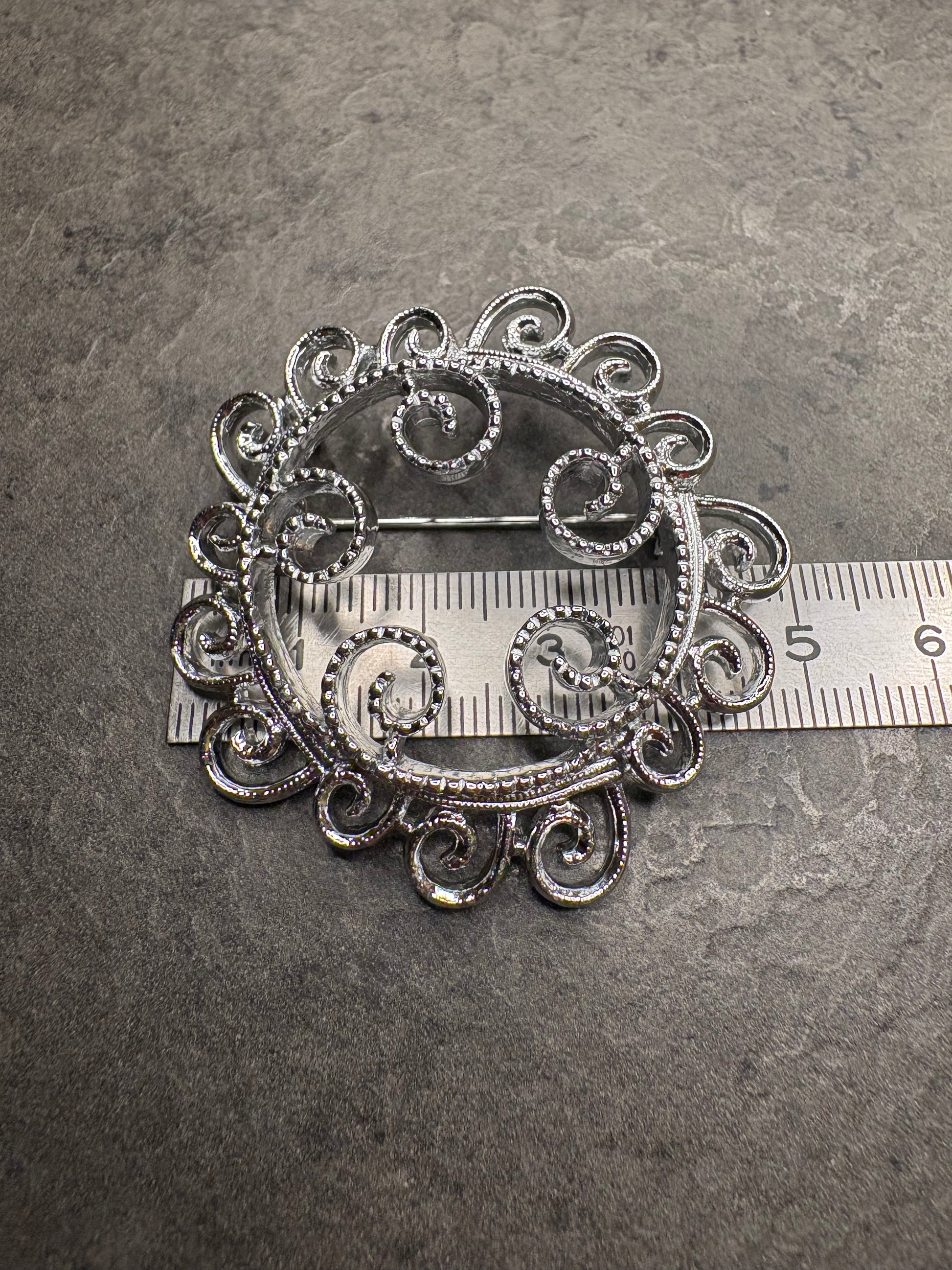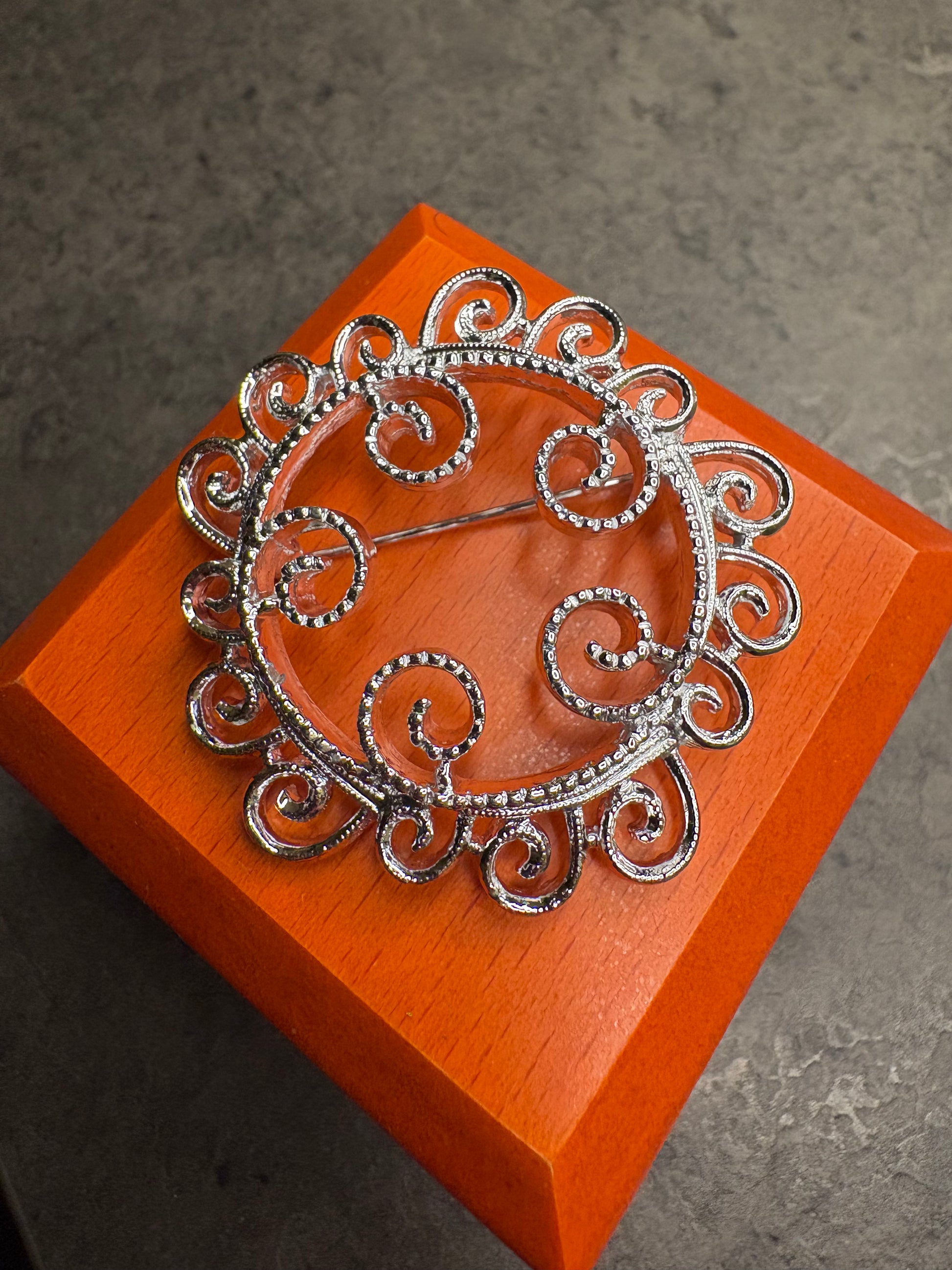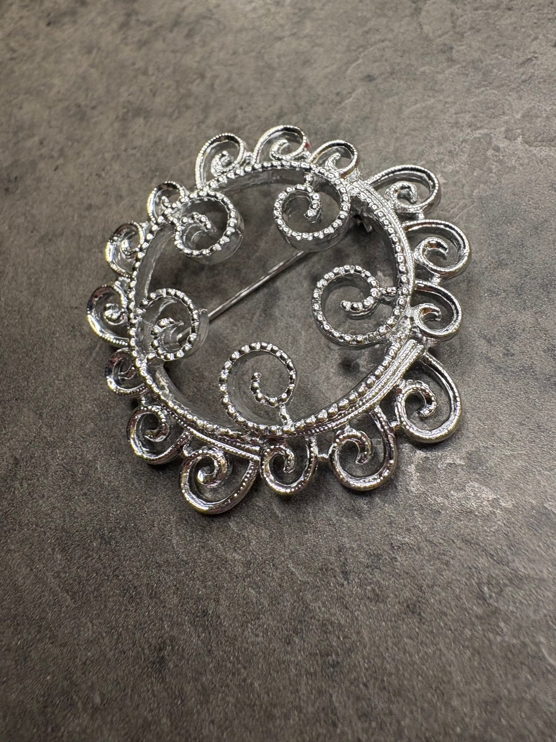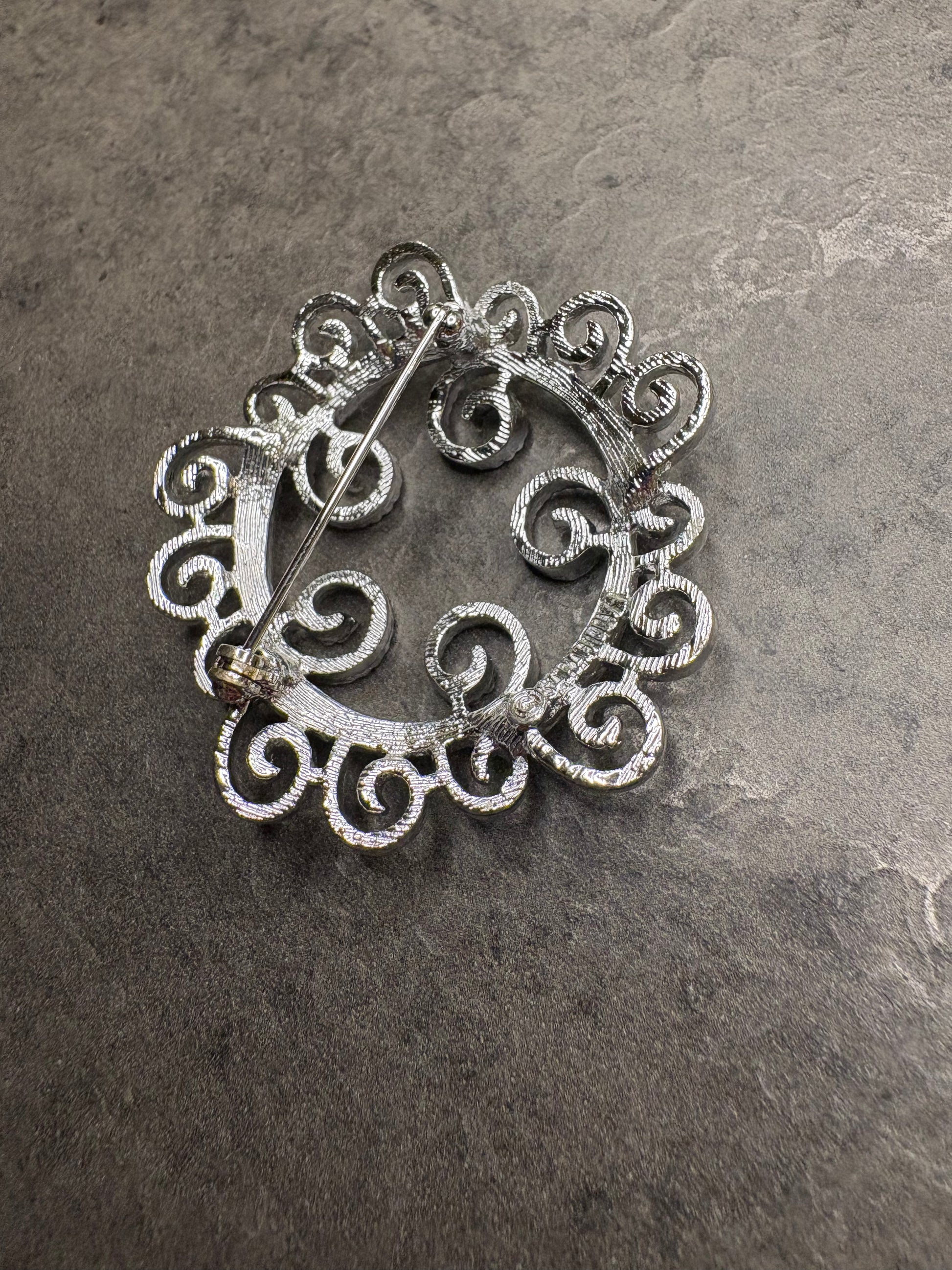 Questa spilla, luminosa e ricca di movimento, è realizzata in metallo argentato finemente lavorato con eleganti volute e dettagli testurizzati che creano un effetto leggero, etereo, quasi impalpabile – un vero omaggio alla bellezza delle decorazioni filigranate.