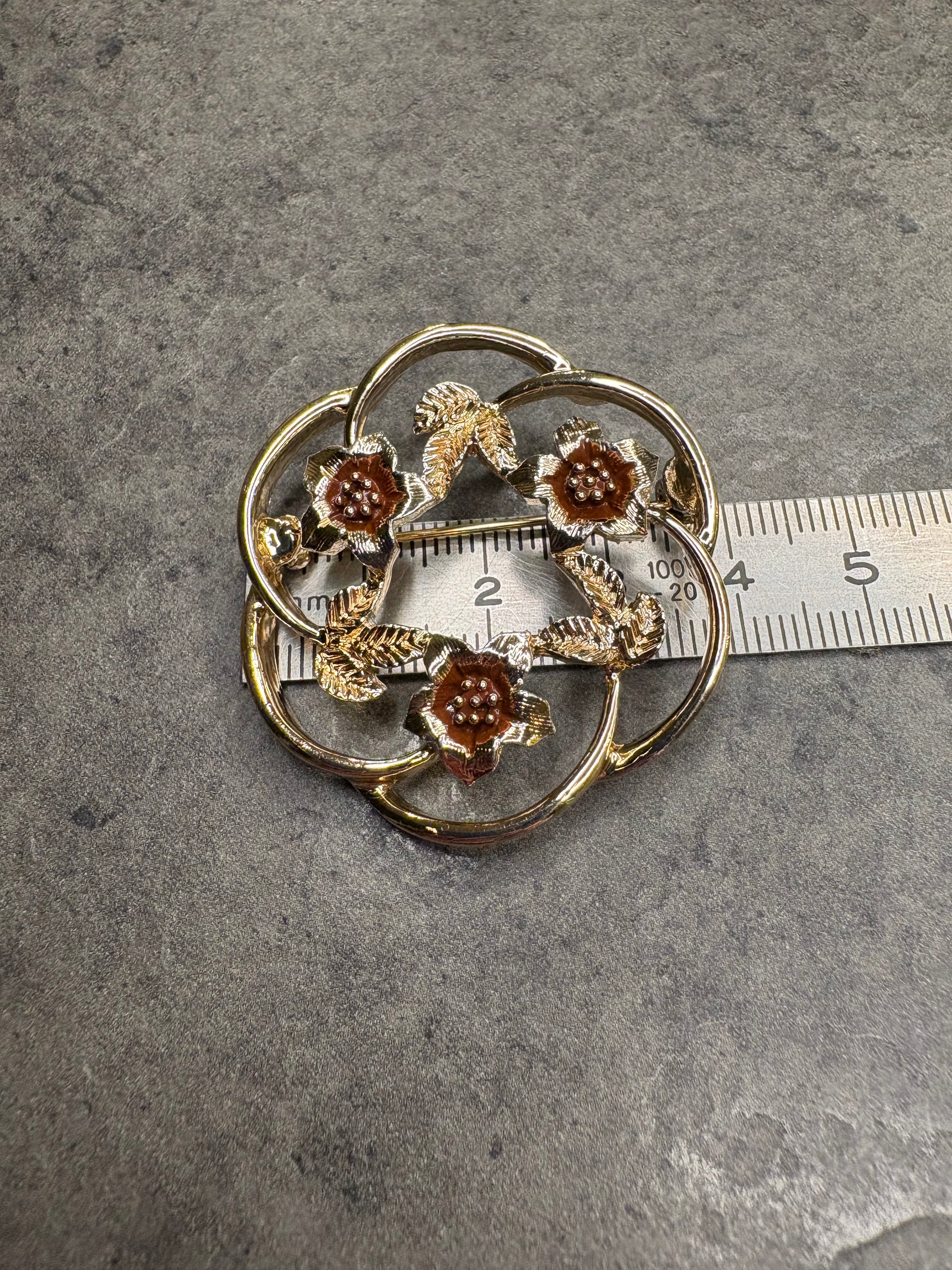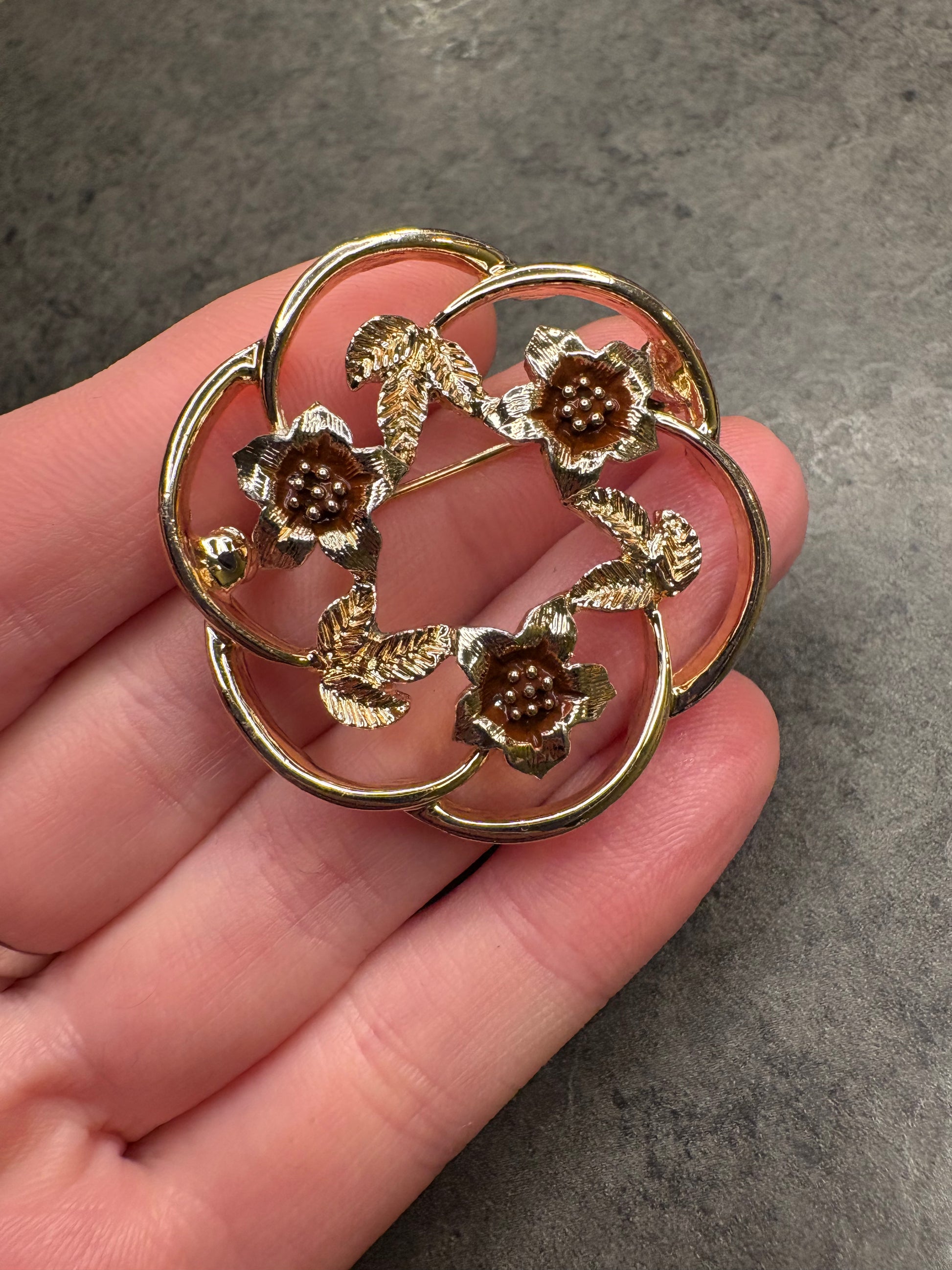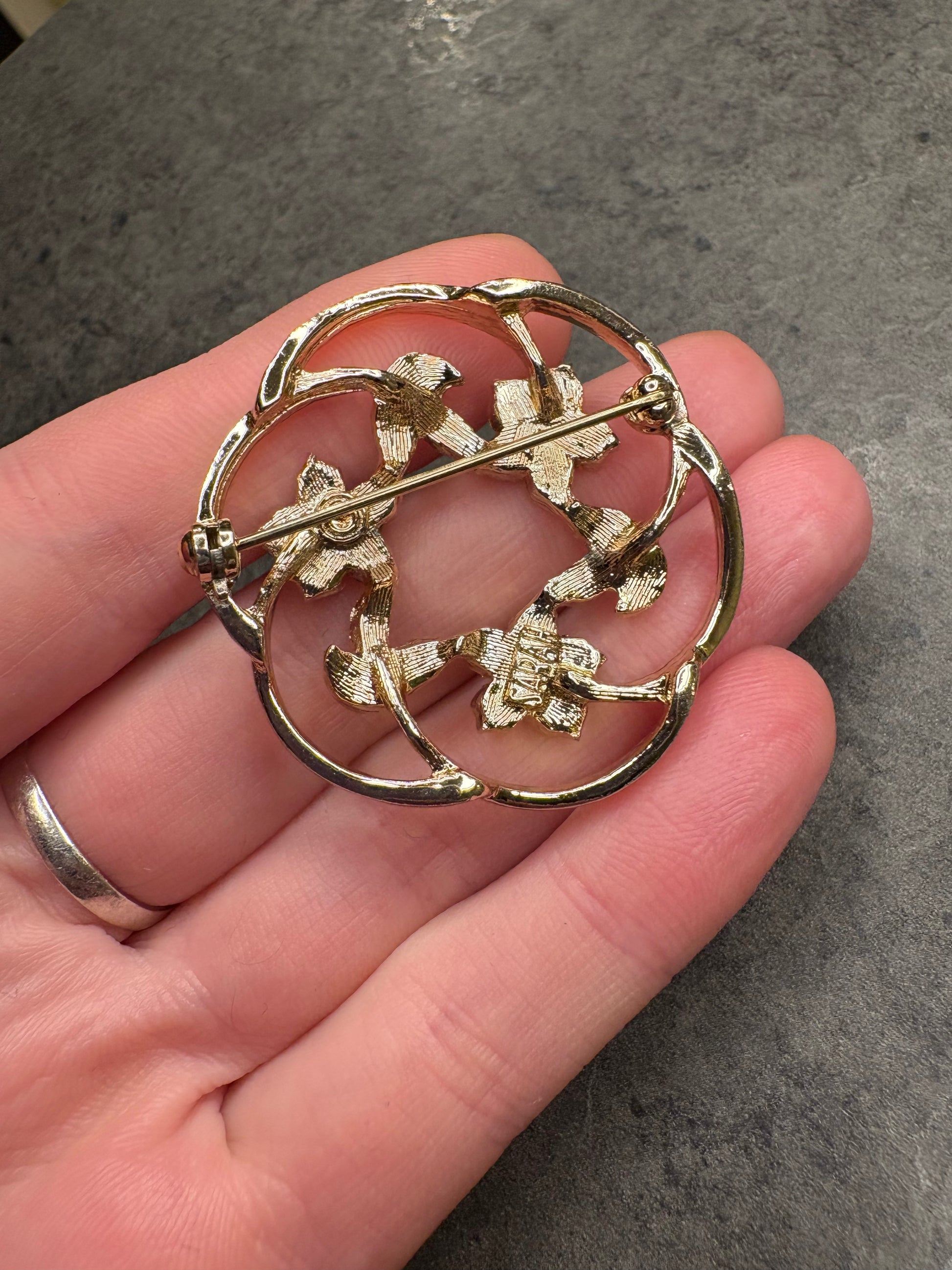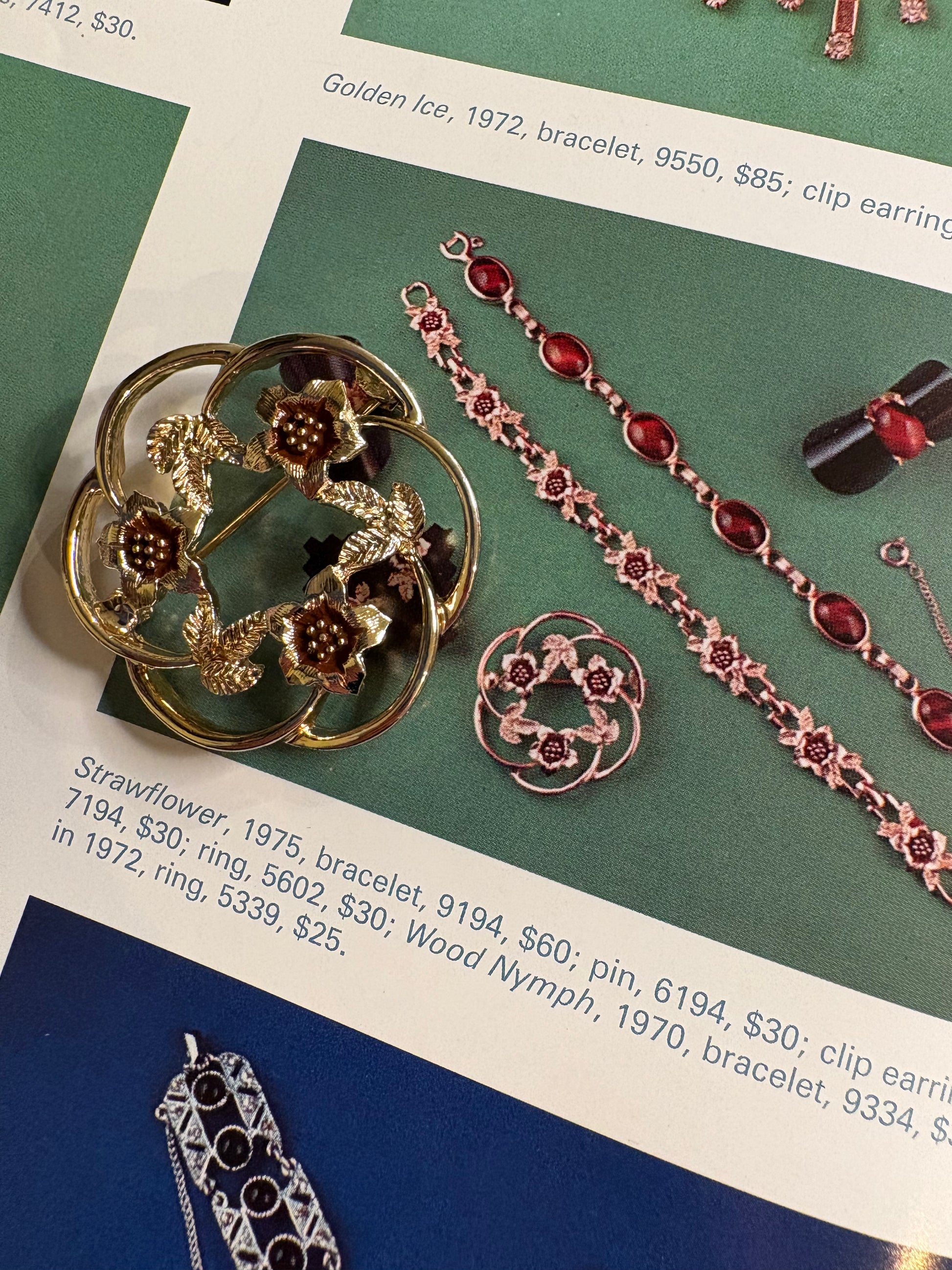 Deliziosa spilla vintage di Sarah Coventry, modello “Strawflower” del 1975, un raffinato esempio dello stile elegante e naturale tipico del marchio negli anni ’70.