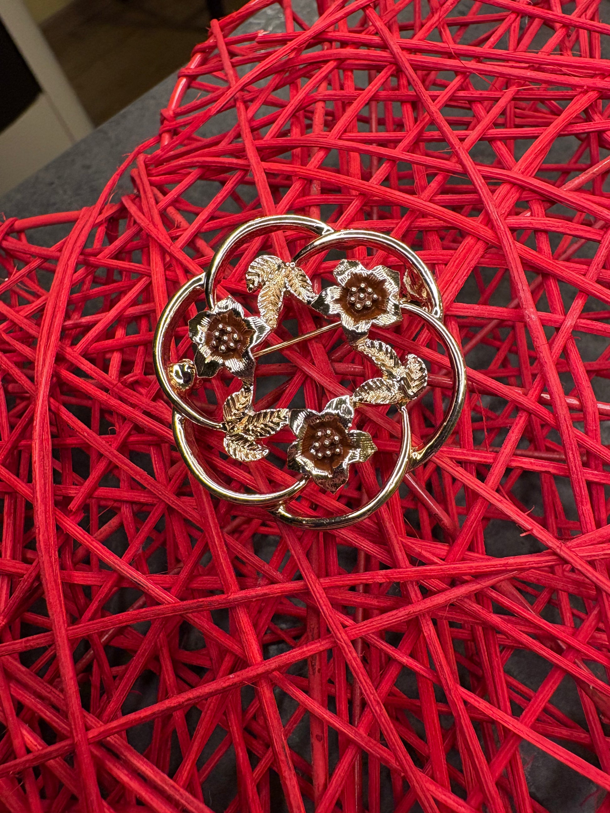 Realizzata in metallo dorato lucido e satinato, presenta un design circolare intrecciato impreziosito da tre fiori in rilievo con petali cesellati e dettagli in rilievo. Le foglie finemente lavorate e i riccioli dorati che uniscono i motivi floreali creano un perfetto equilibrio tra movimento e armonia.