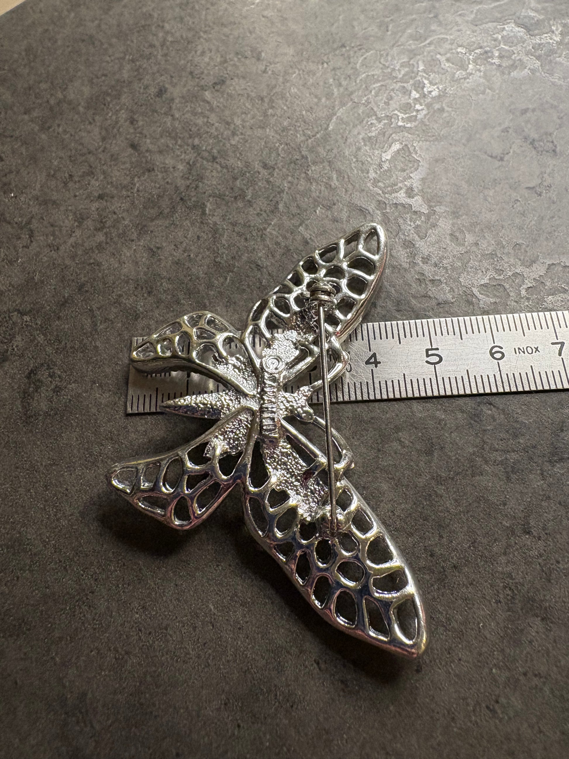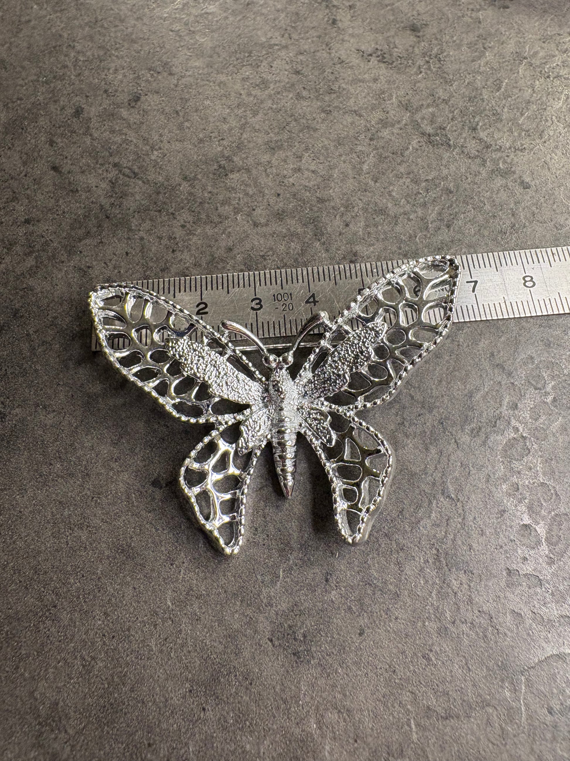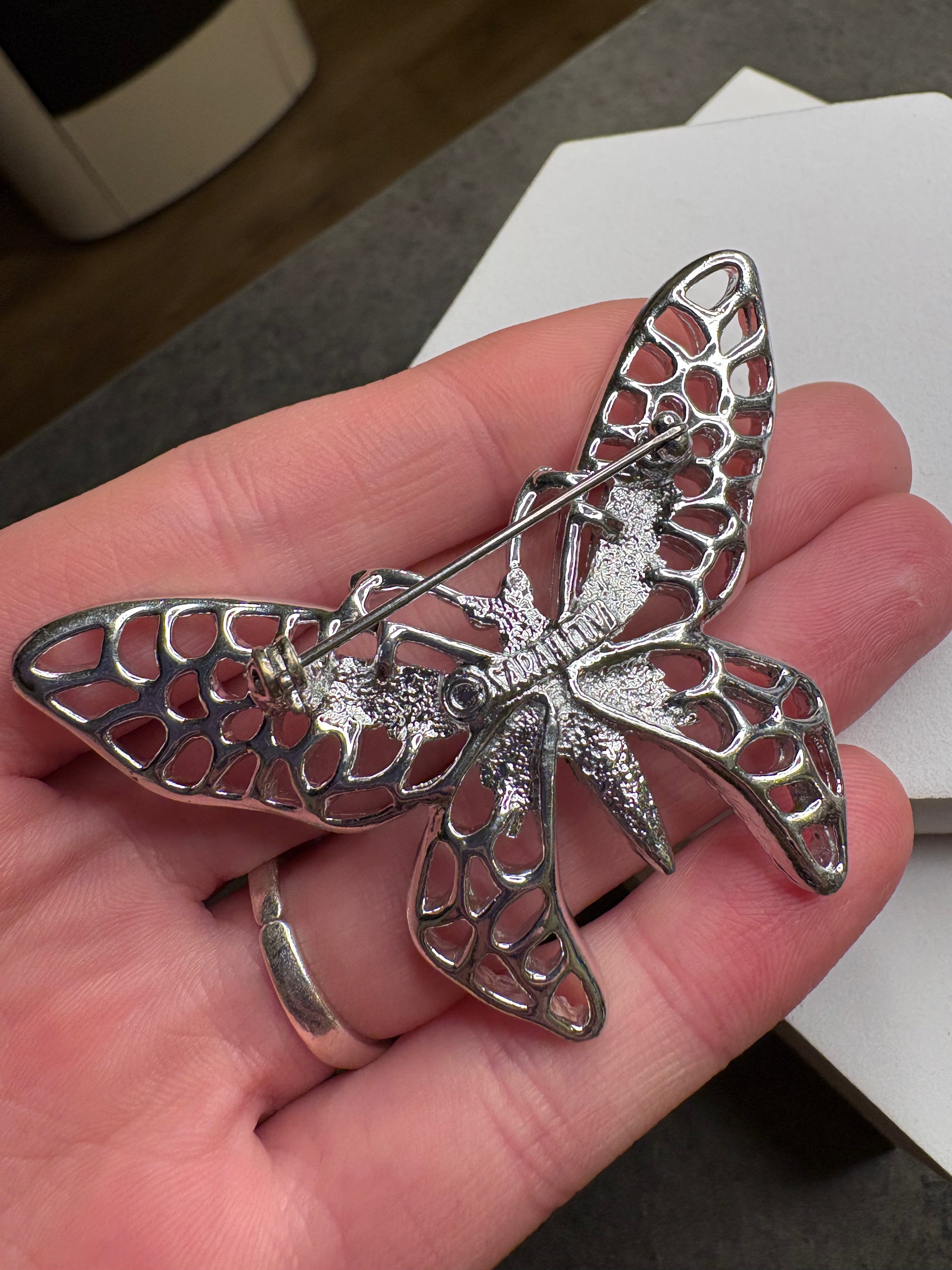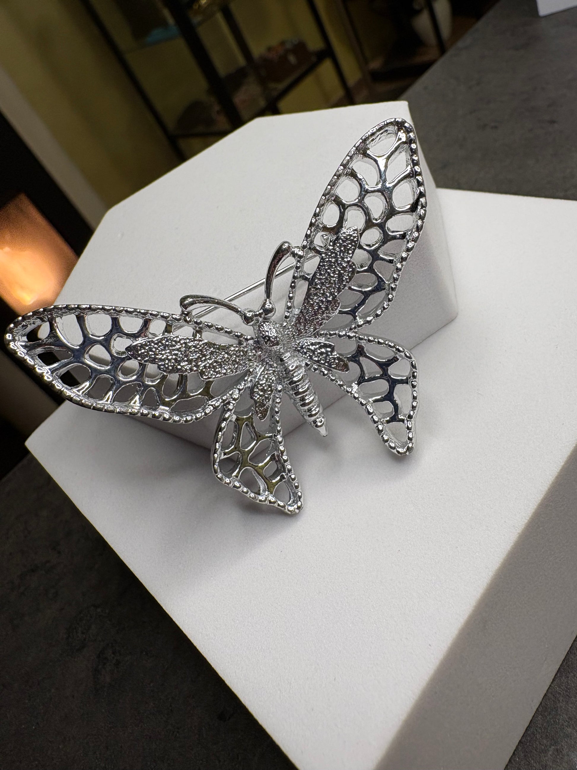 Questa deliziosa spilla a forma di farfalla di Sarah Coventry, appartenente alla collezione “Madam Butterfly” del 1971, è un esempio magnifico di design naturalistico elegante e leggero. Realizzata in metallo color argento, presenta ali finemente traforate con una lavorazione a nido d’ape che crea un effetto arioso e luminoso. Il corpo della farfalla è più compatto e riccamente testurizzato, mentre i bordi delle ali sono delicatamente rifiniti, dando al gioiello un aspetto raffinato ma allo stesso tempo scenografico. La spilla trasmette un senso di movimento e leggerezza ed è un classico esempio dello stile decorativo e femminile che ha reso celebri le collezioni Sarah Coventry degli anni ’70.