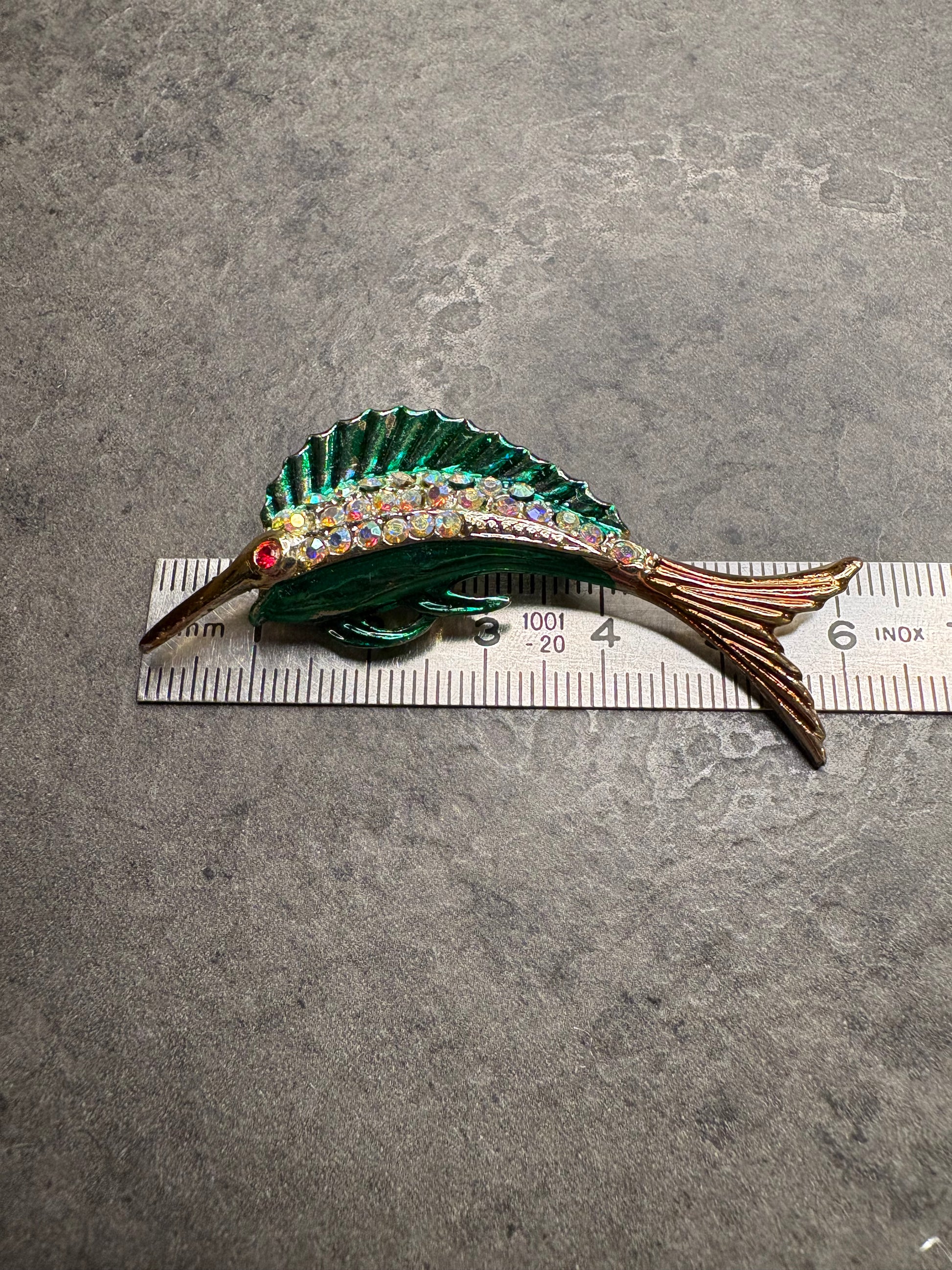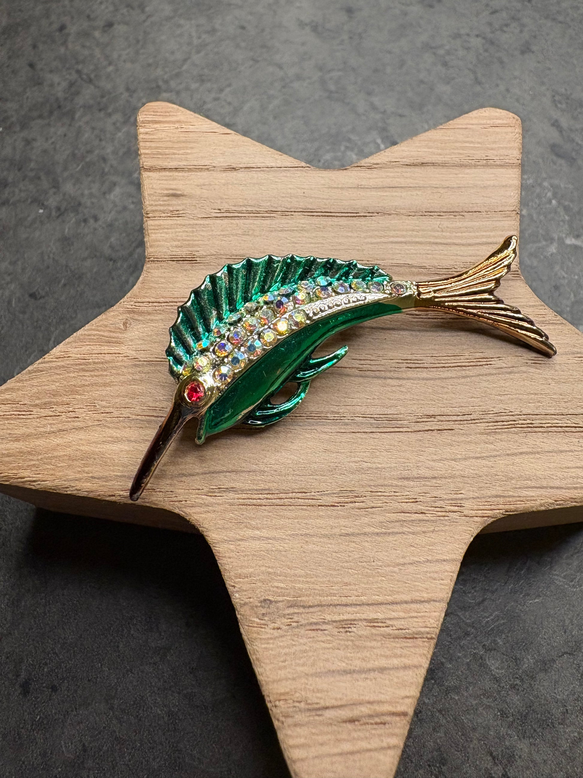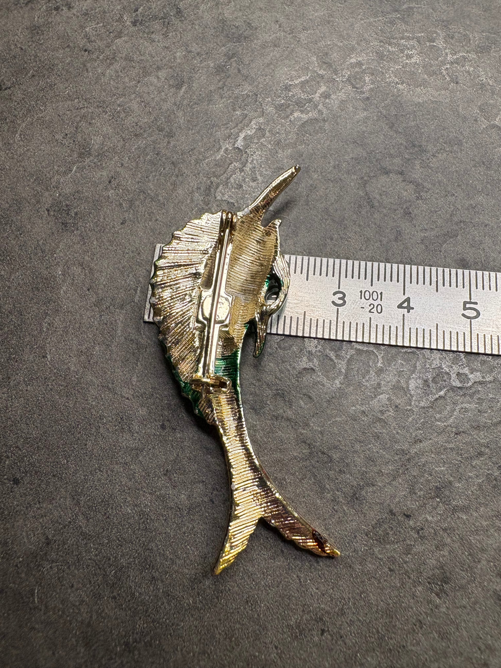 Questa è una deliziosa spilla vintage a forma di pesce spada un soggetto molto popolare nella bijouterie americana ed europea tra gli anni ’50 e ’70.