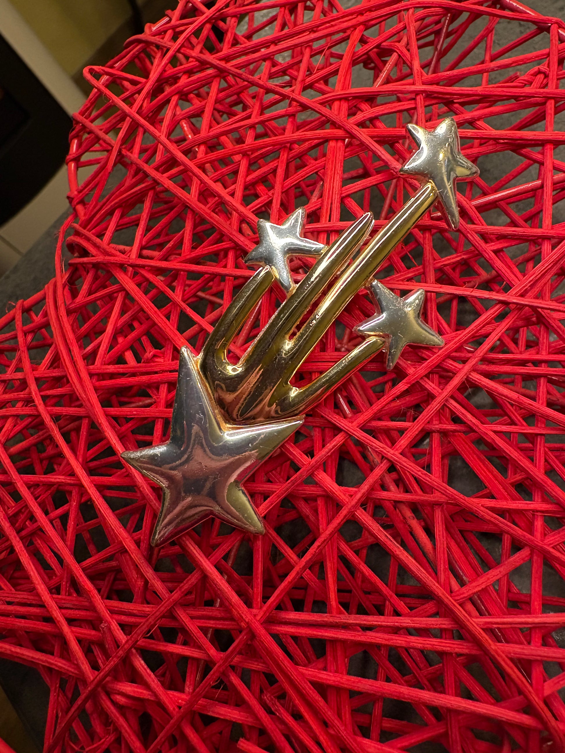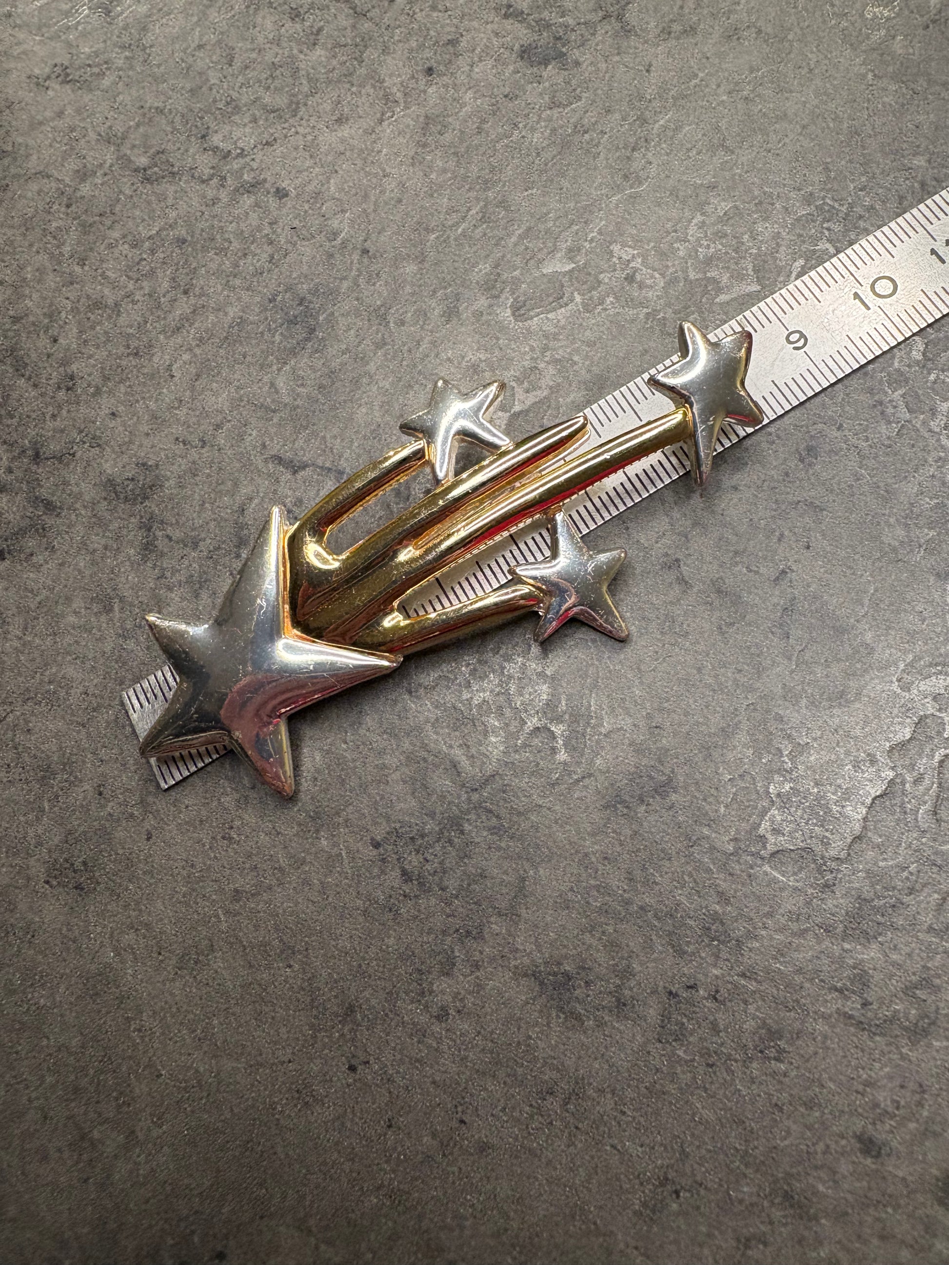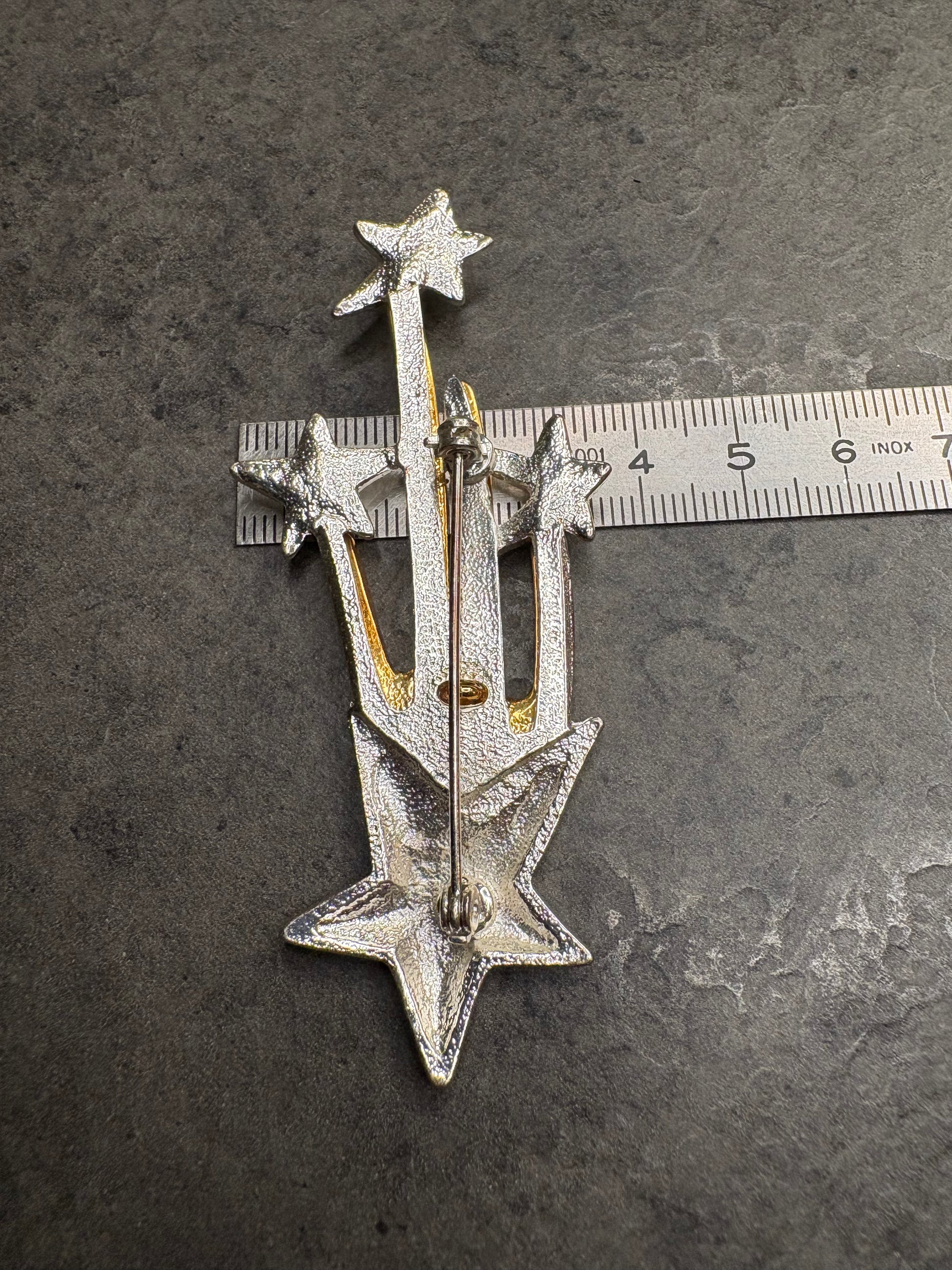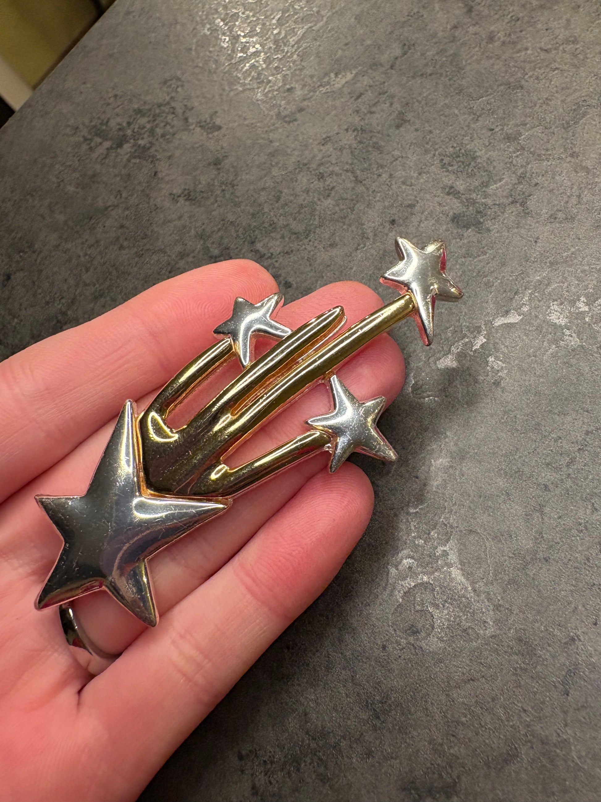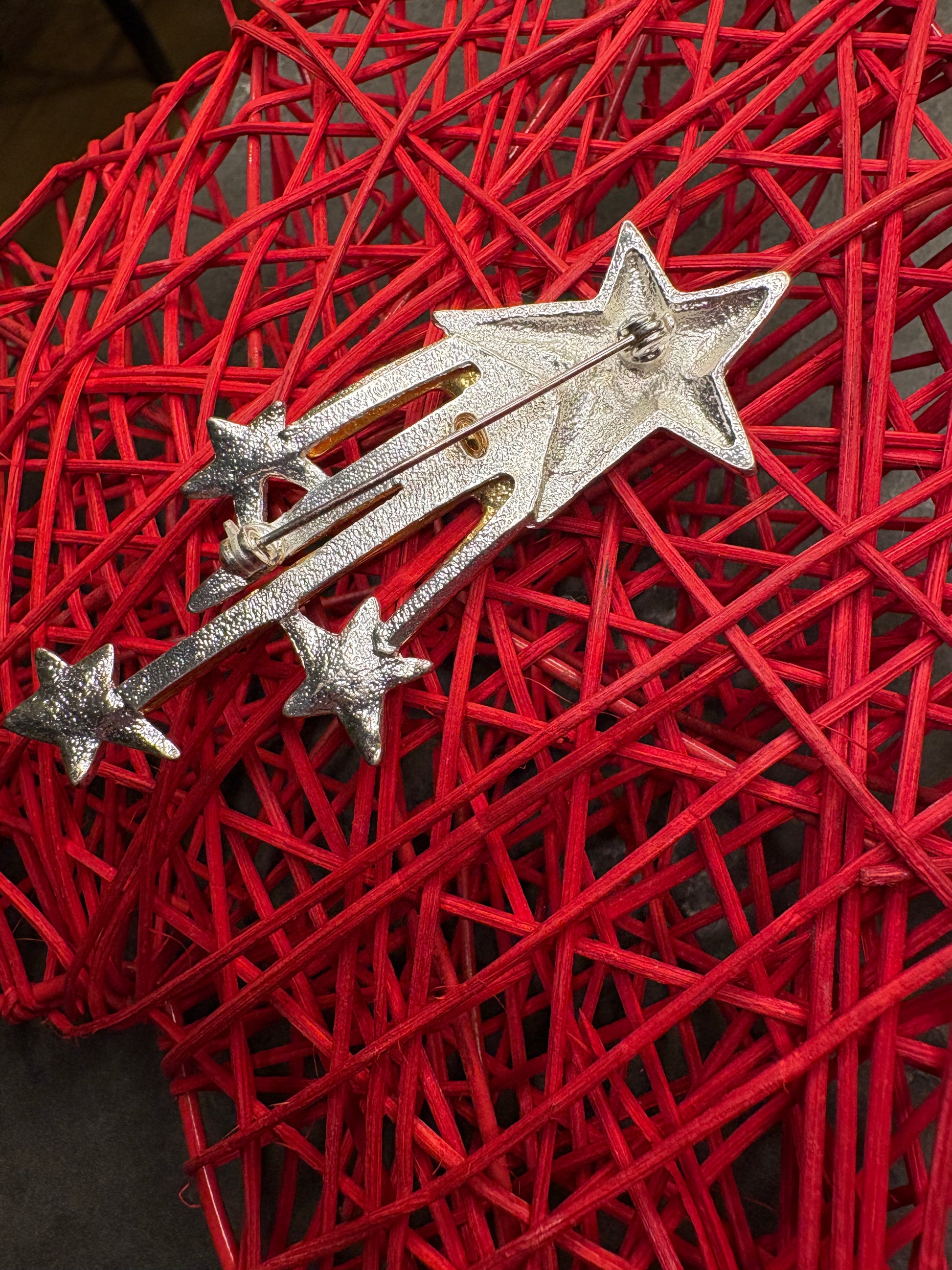 Questa luminosa spilla vintage natalizia presenta un dinamico motivo di stelle comete, realizzato in metallo con una raffinata finitura bicolore oro e argento. La composizione è vivace e moderna: una grande stella centrale, lucida e tridimensionale, guida il movimento di tre stelle più piccole che sembrano sfrecciare nel cielo grazie ai lunghi fasci metallici dorati che simulano la scia luminosa.