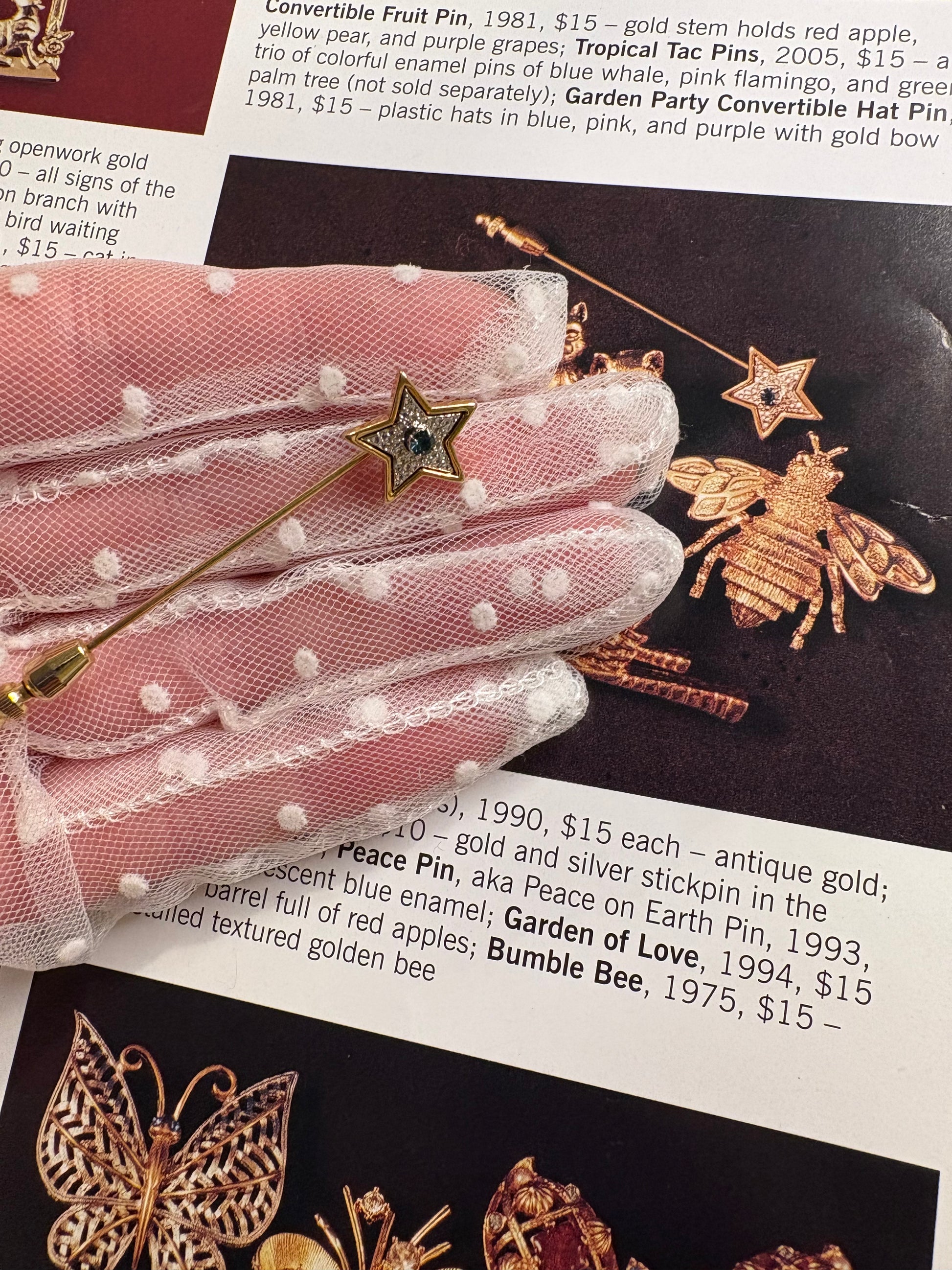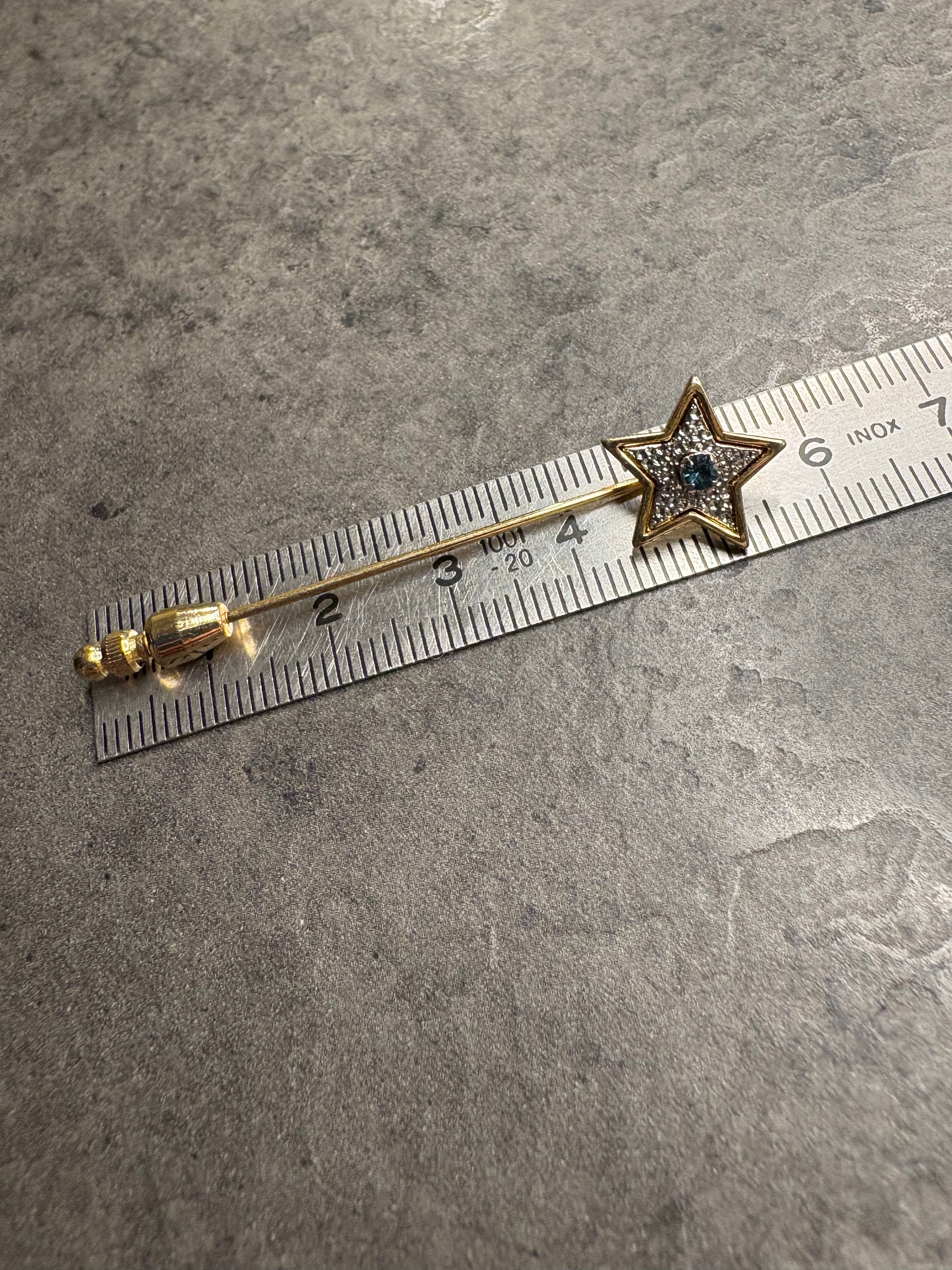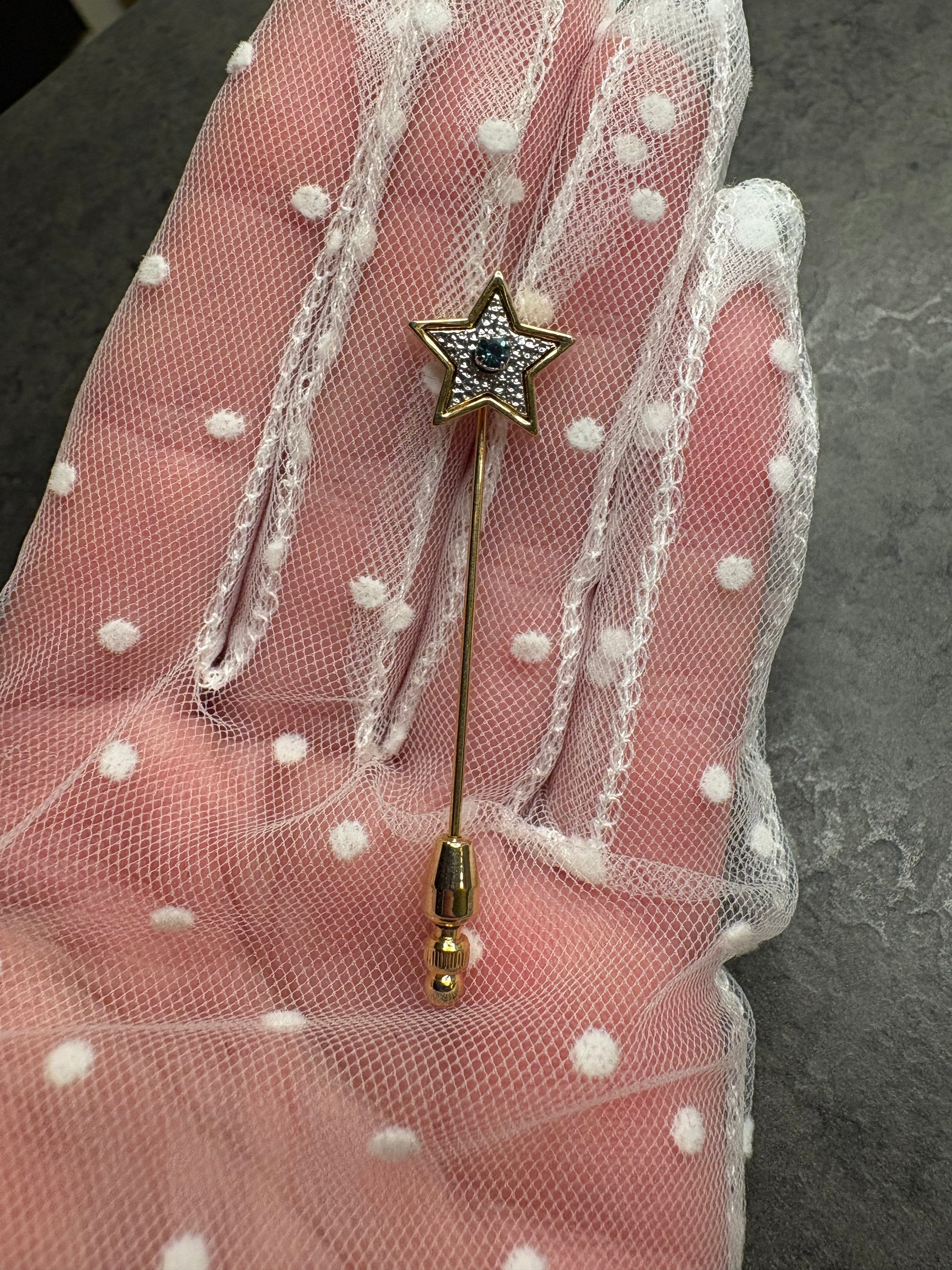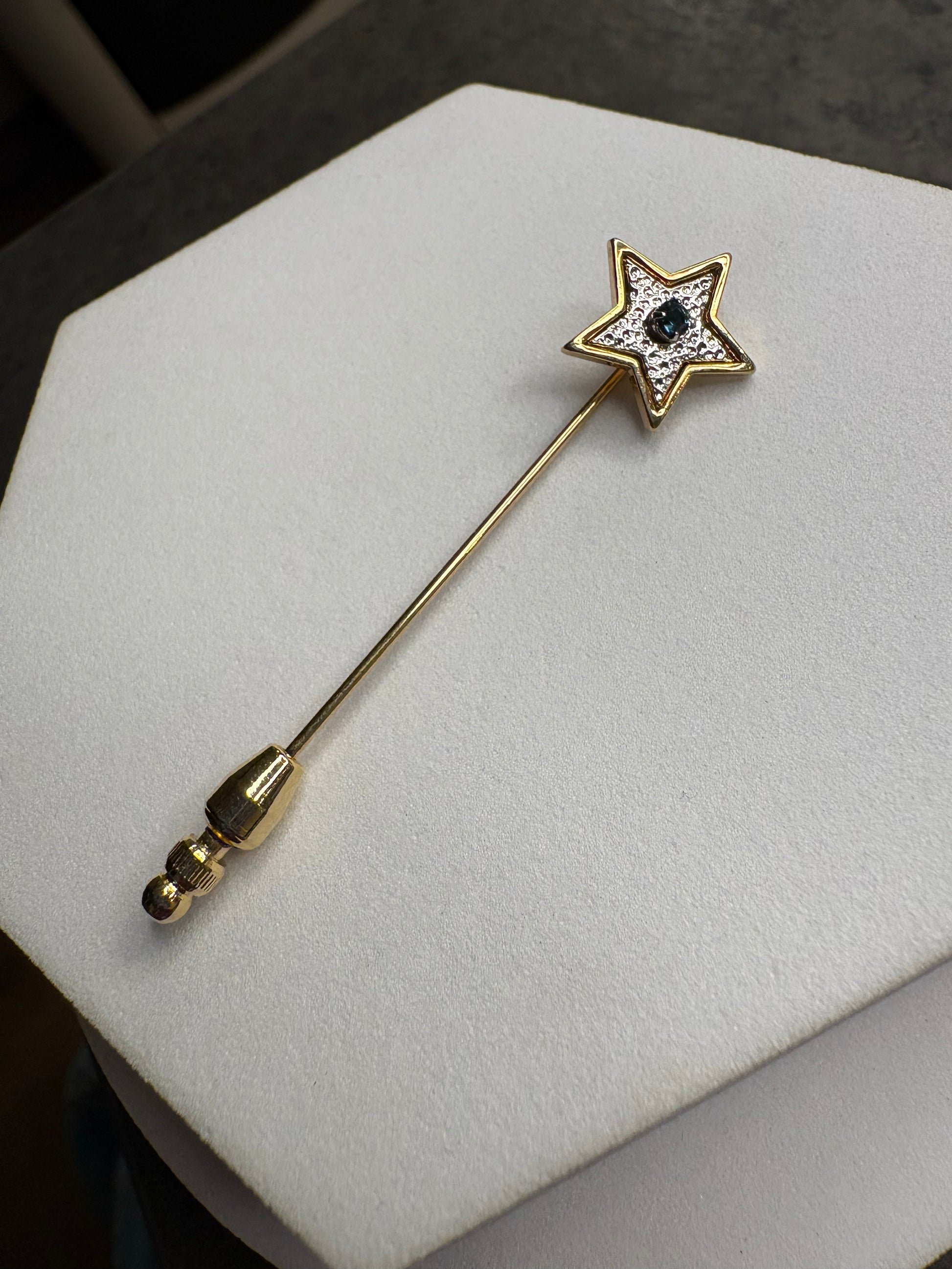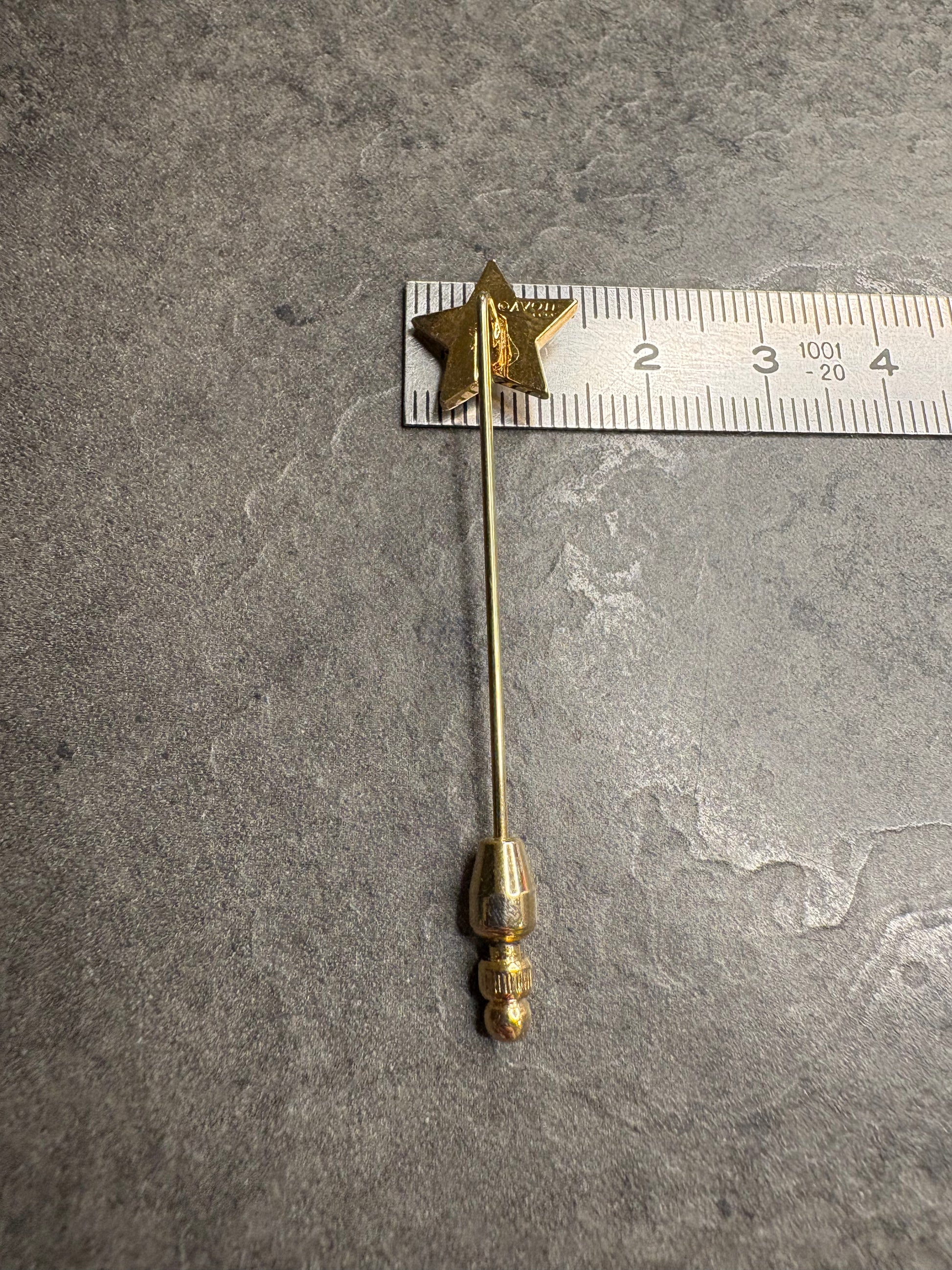 Bellissima spilla stick Avon “Starshine Stickpin” del 1979, realizzata in metallo dorato. L’elemento decorativo è una stella stilizzata con profilo dorato, arricchita internamente da dettagli argentati che creano contrasto e profondità. Al centro spicca un piccolo cristallo blu che dona un punto luce delicato ma brillante. L’ago sottile e lineare la rende ideale per giacche, cappotti o foulard, con uno stile raffinato e discreto.