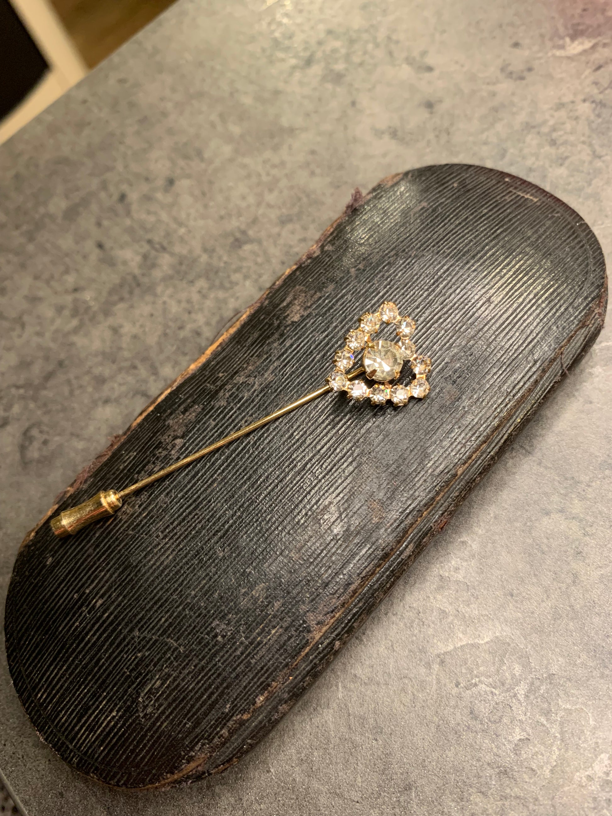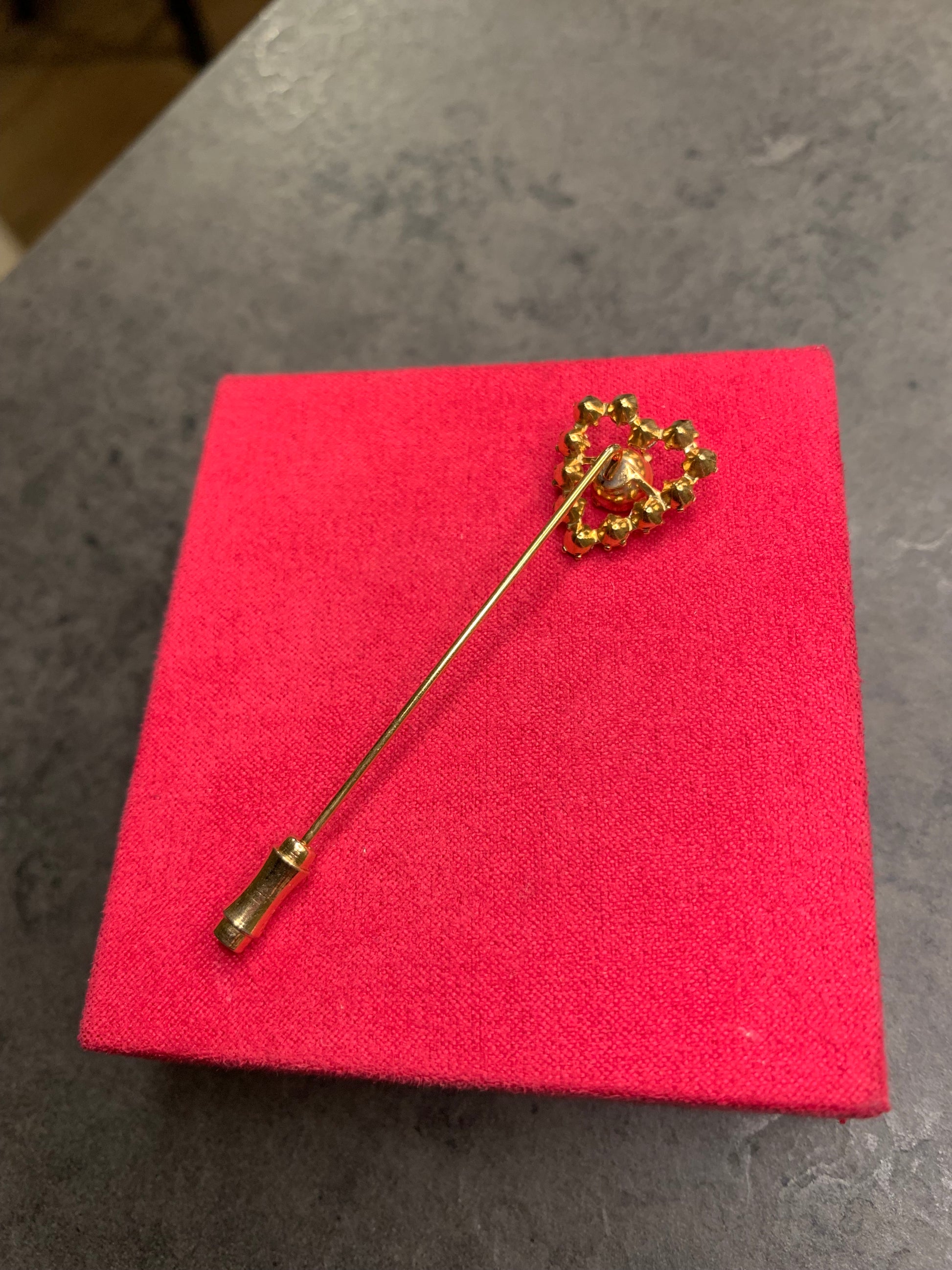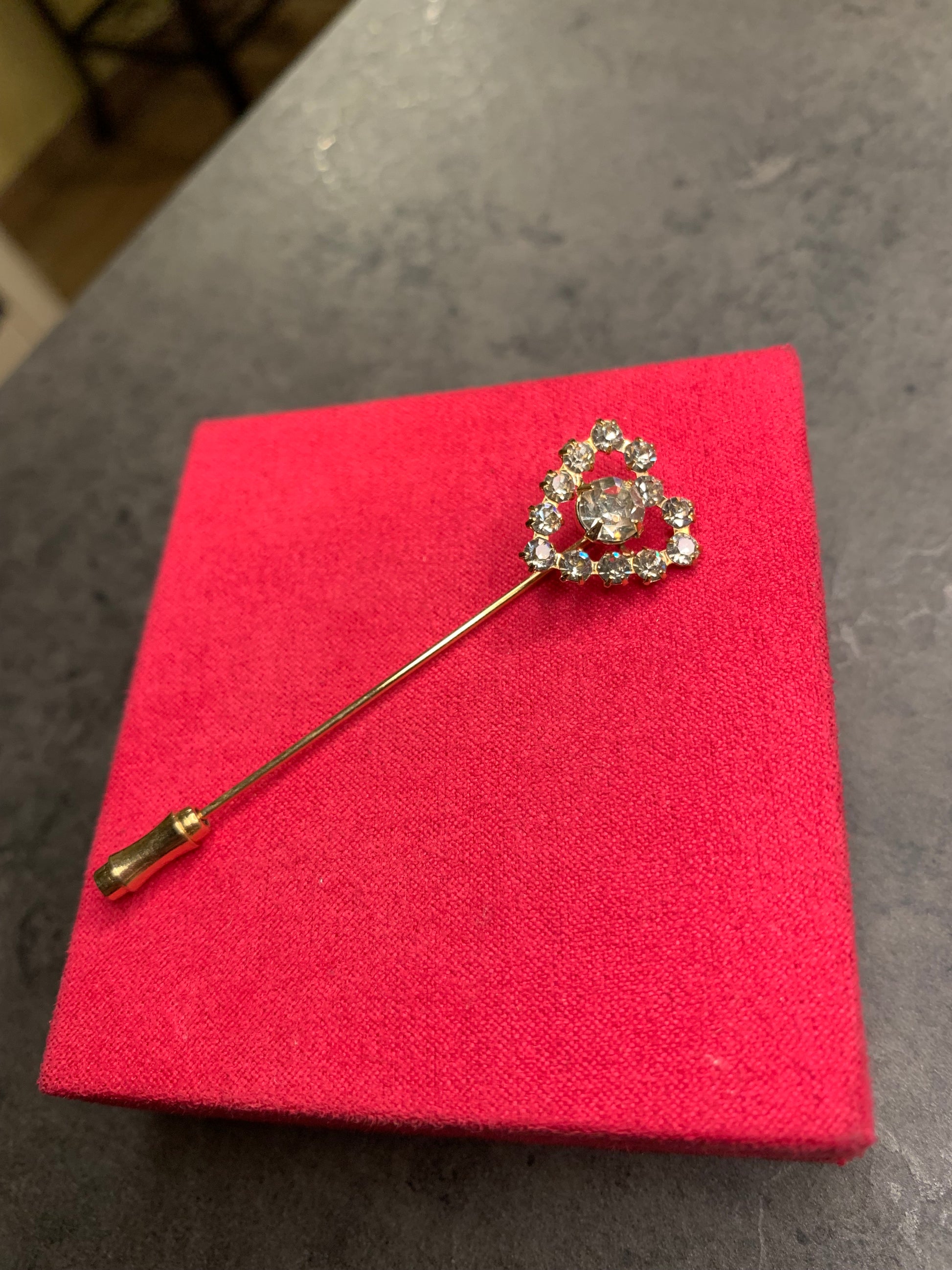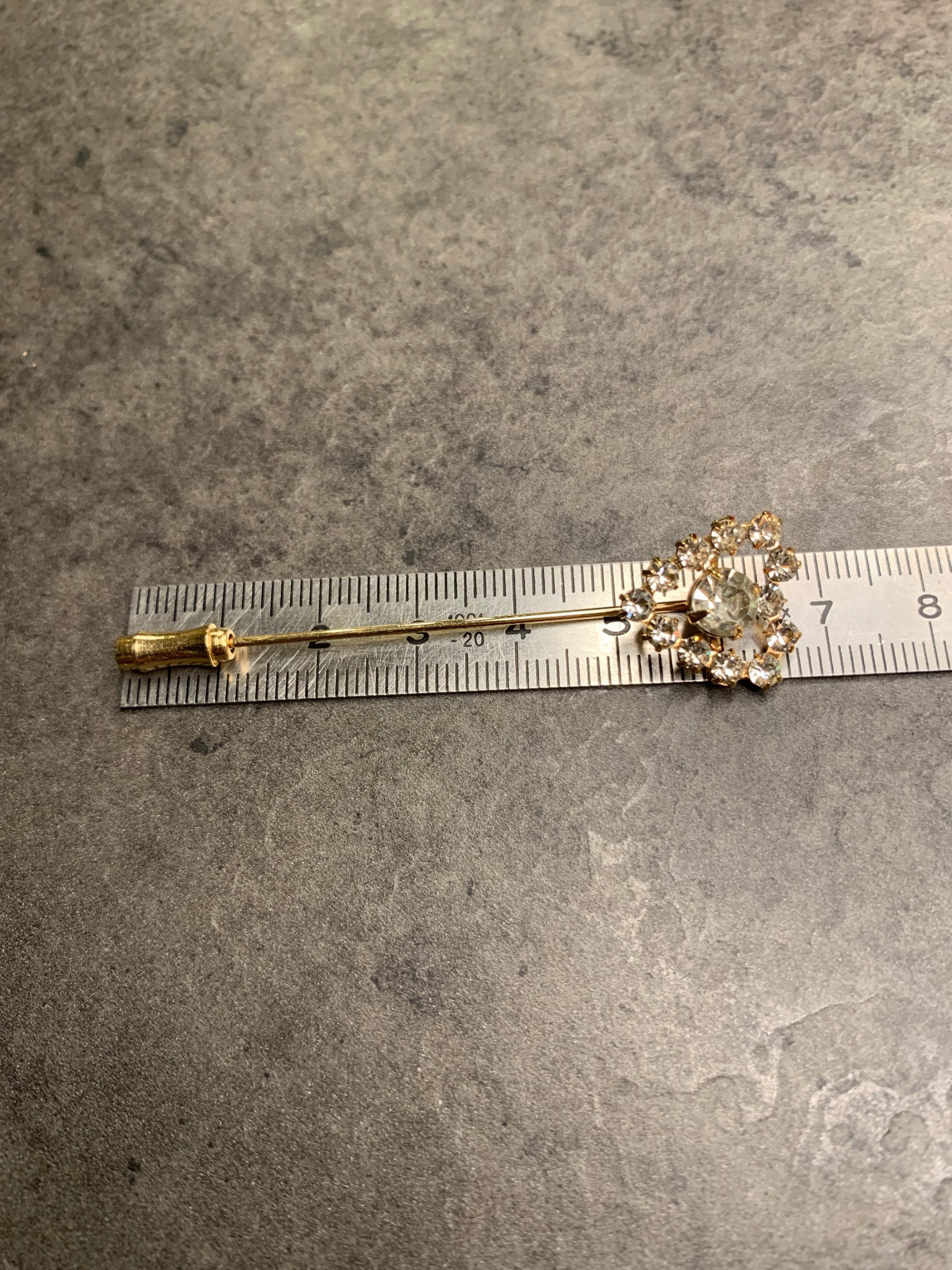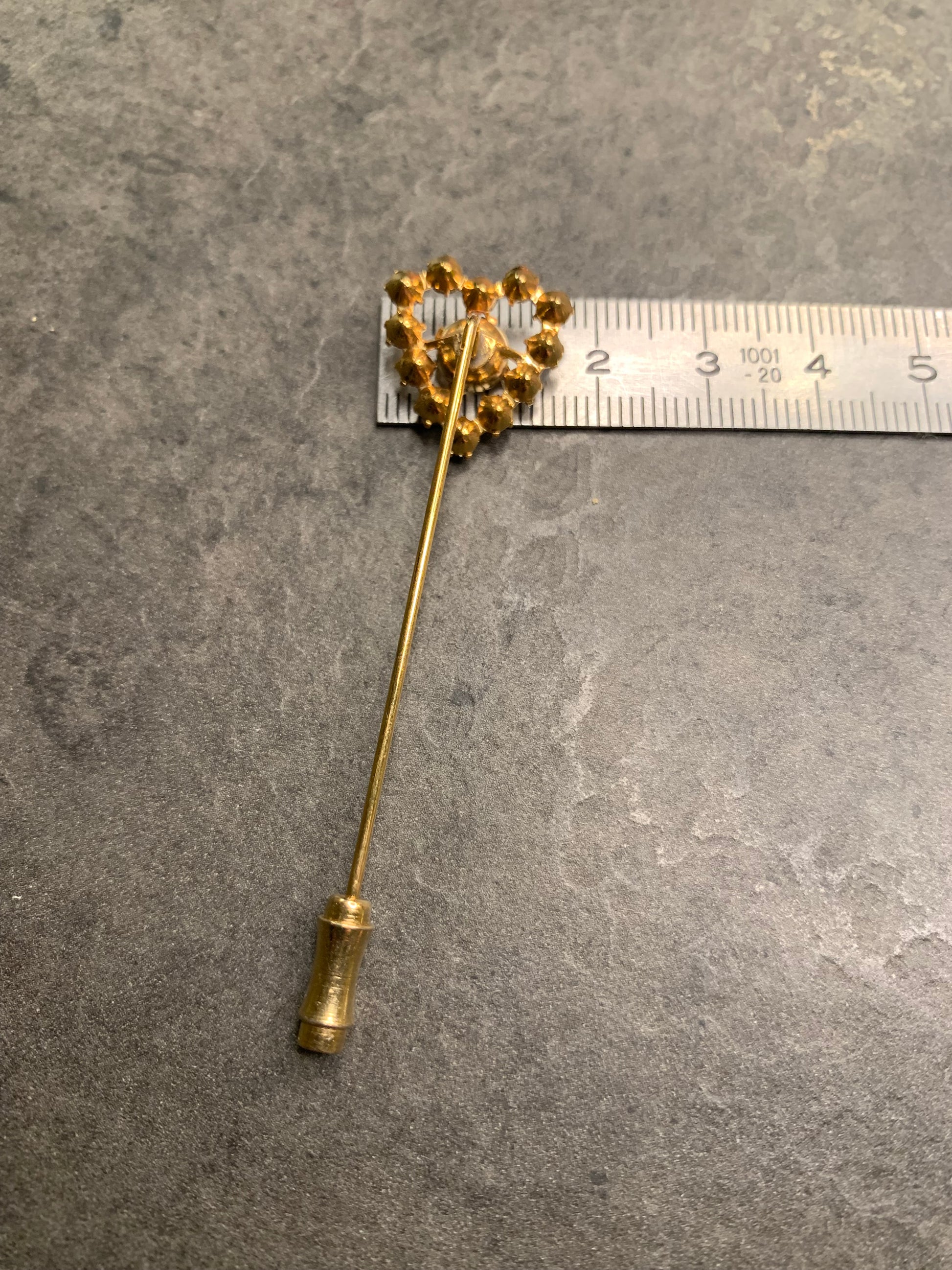 Questa spilla stick vintage presenta un cuore centrale ricoperto di cristalli trasparenti che scintillano con eleganza, incastonati su una base metallica dorata.