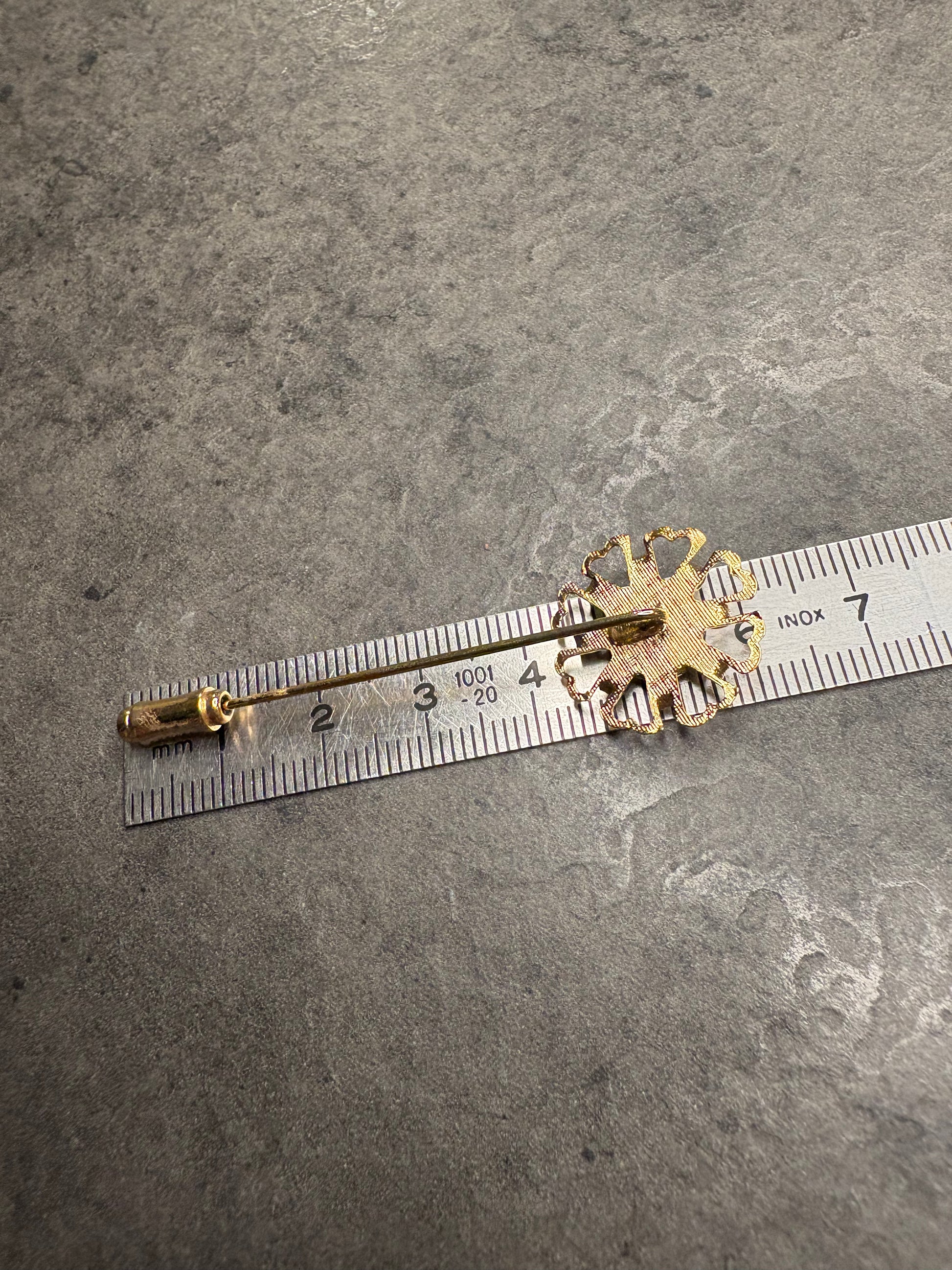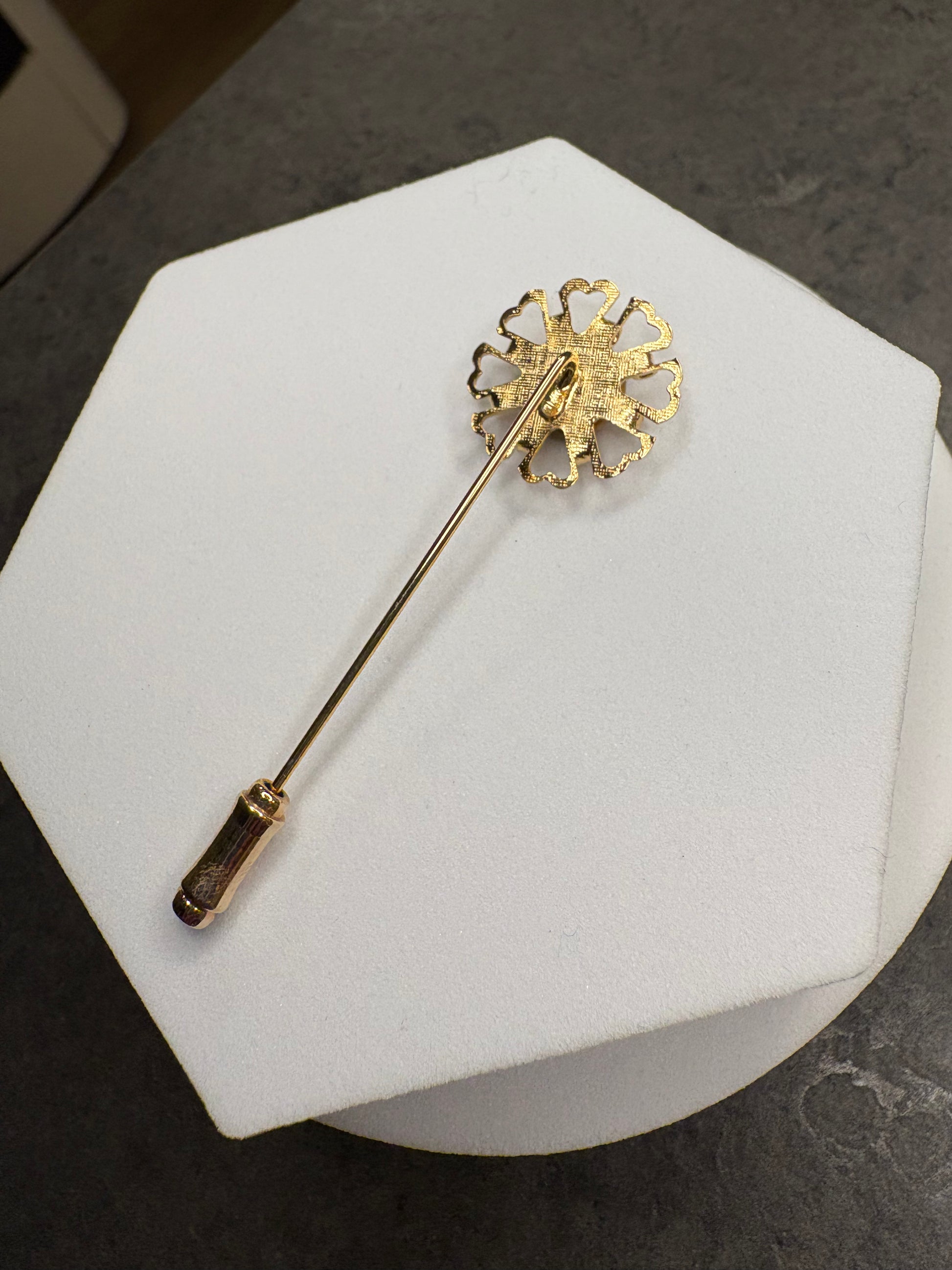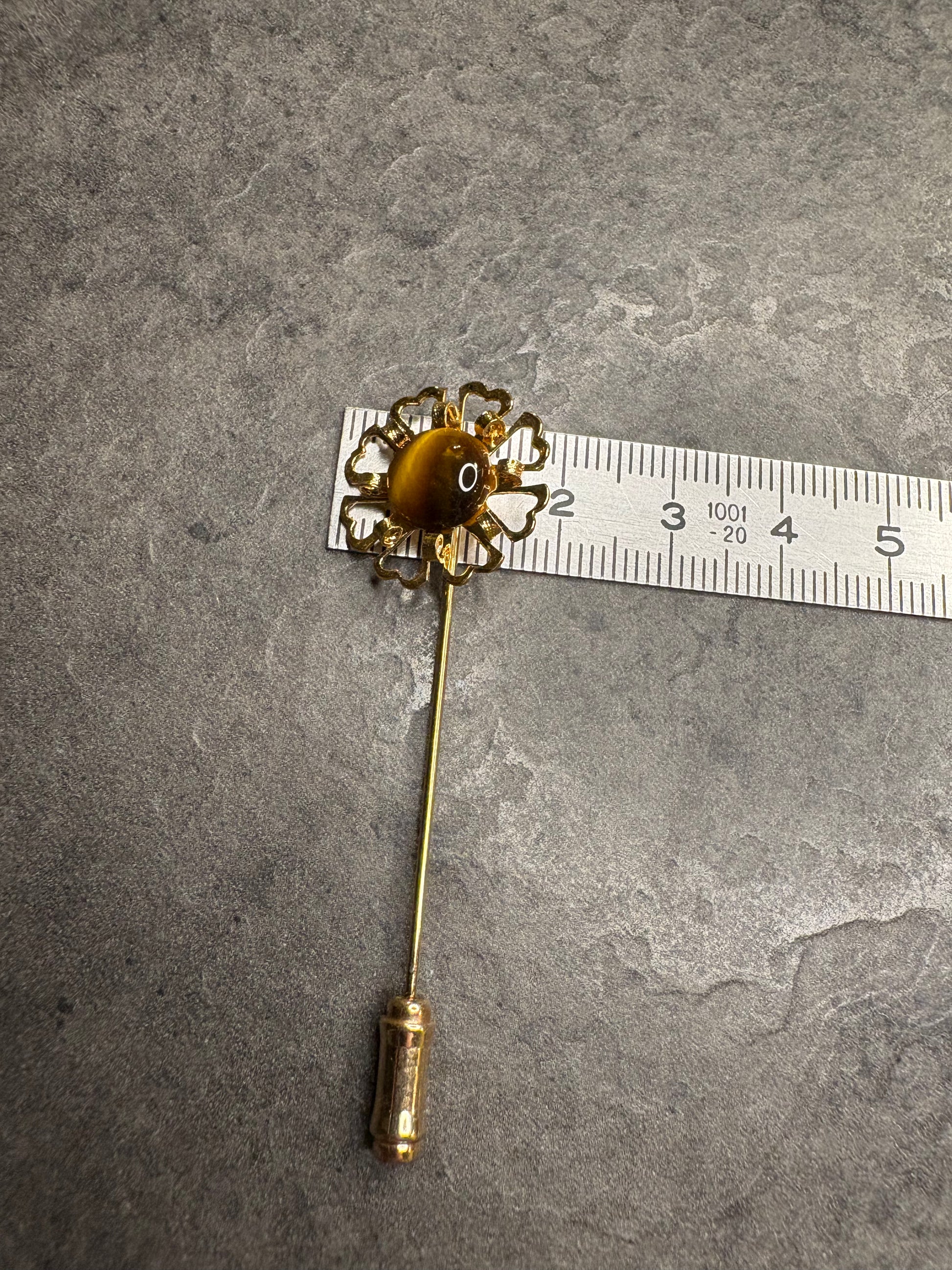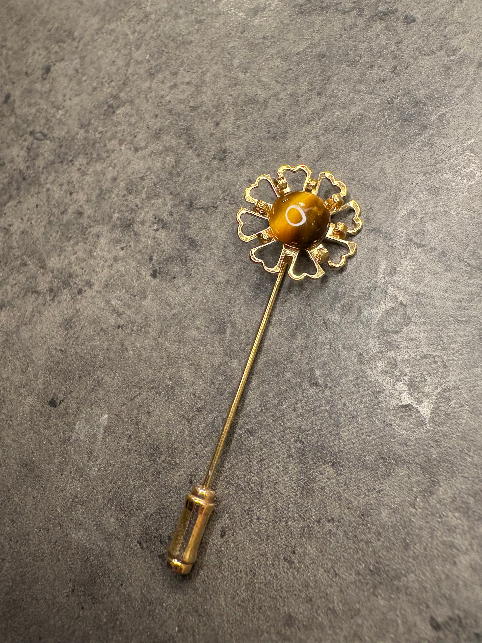 Questa elegante spilla stick realizzata in metallo color oro lucido, raffigura con realismo un delicato fiore al centro impreziosito con cabochon di occhio di tigre, che crea un gioco di luci e ombre sulla superficie dorata.