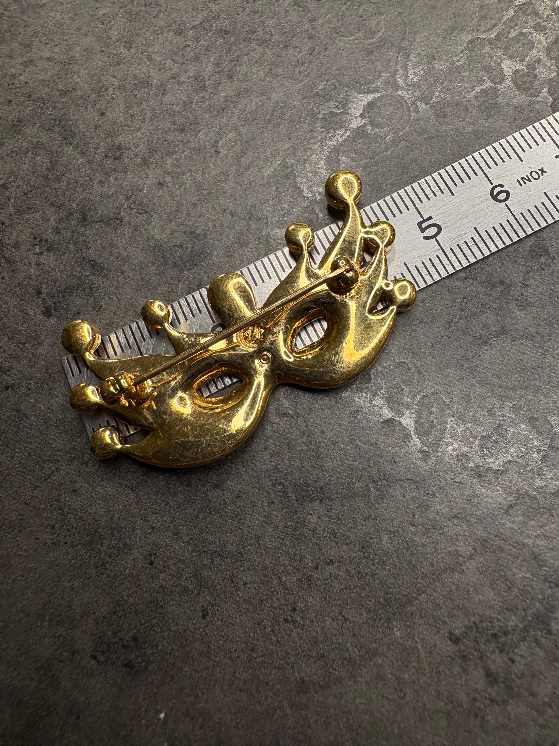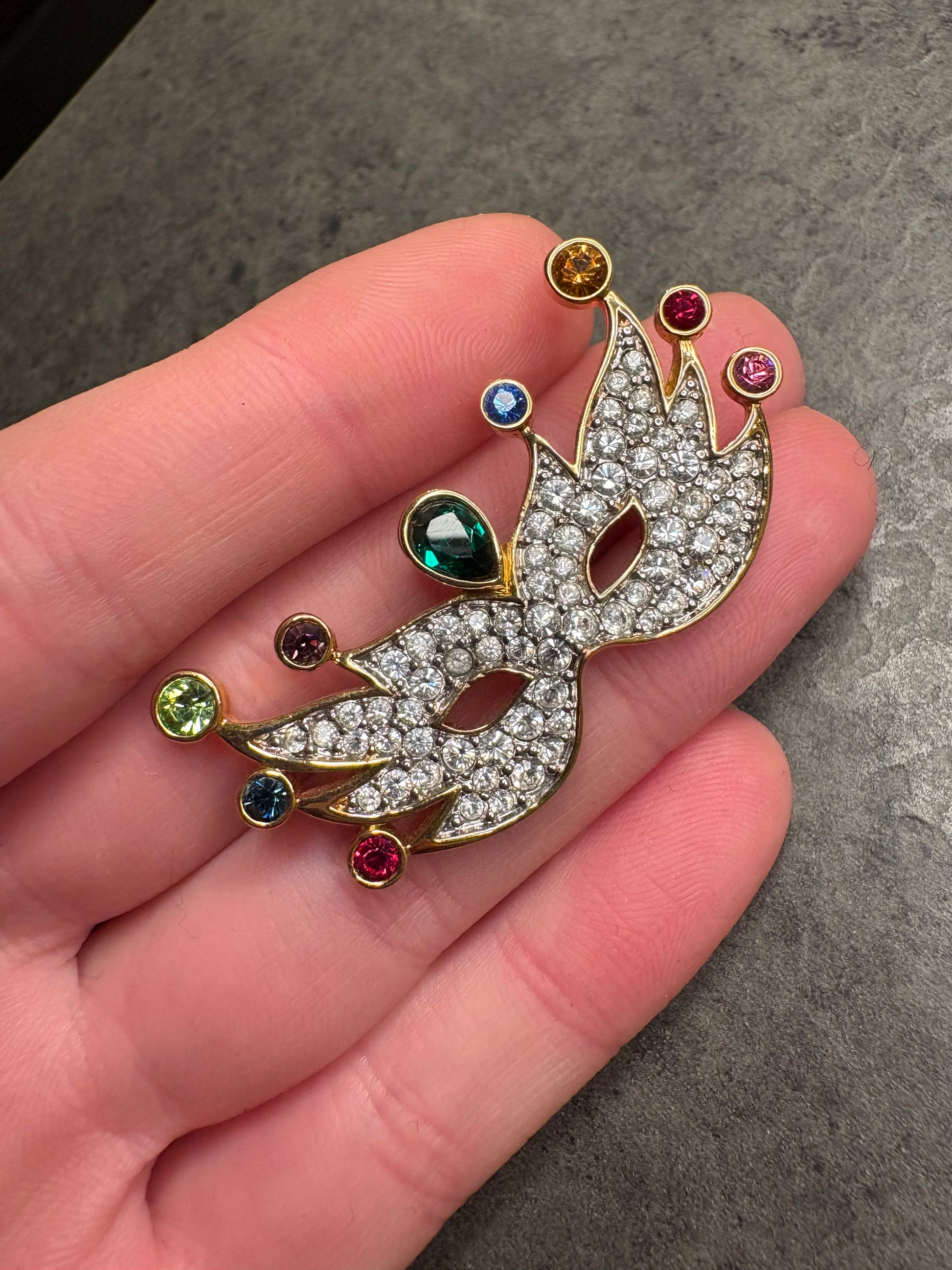 Questa favolosa spilla a forma di maschera firmata Swarovski è un gioiello scenografico e luminoso, ispirato al mondo del teatro e del carnevale. Realizzata in metallo color oro, è interamente ricoperta di cristalli Swarovski trasparenti che donano una brillantezza intensa e sofisticata. La maschera è impreziosita da piccoli cristalli colorati applicati alle estremità, che aggiungono un tocco giocoso e vivace, creando un raffinato contrasto cromatico. Una spilla elegante e originale, perfetta come pezzo statement.