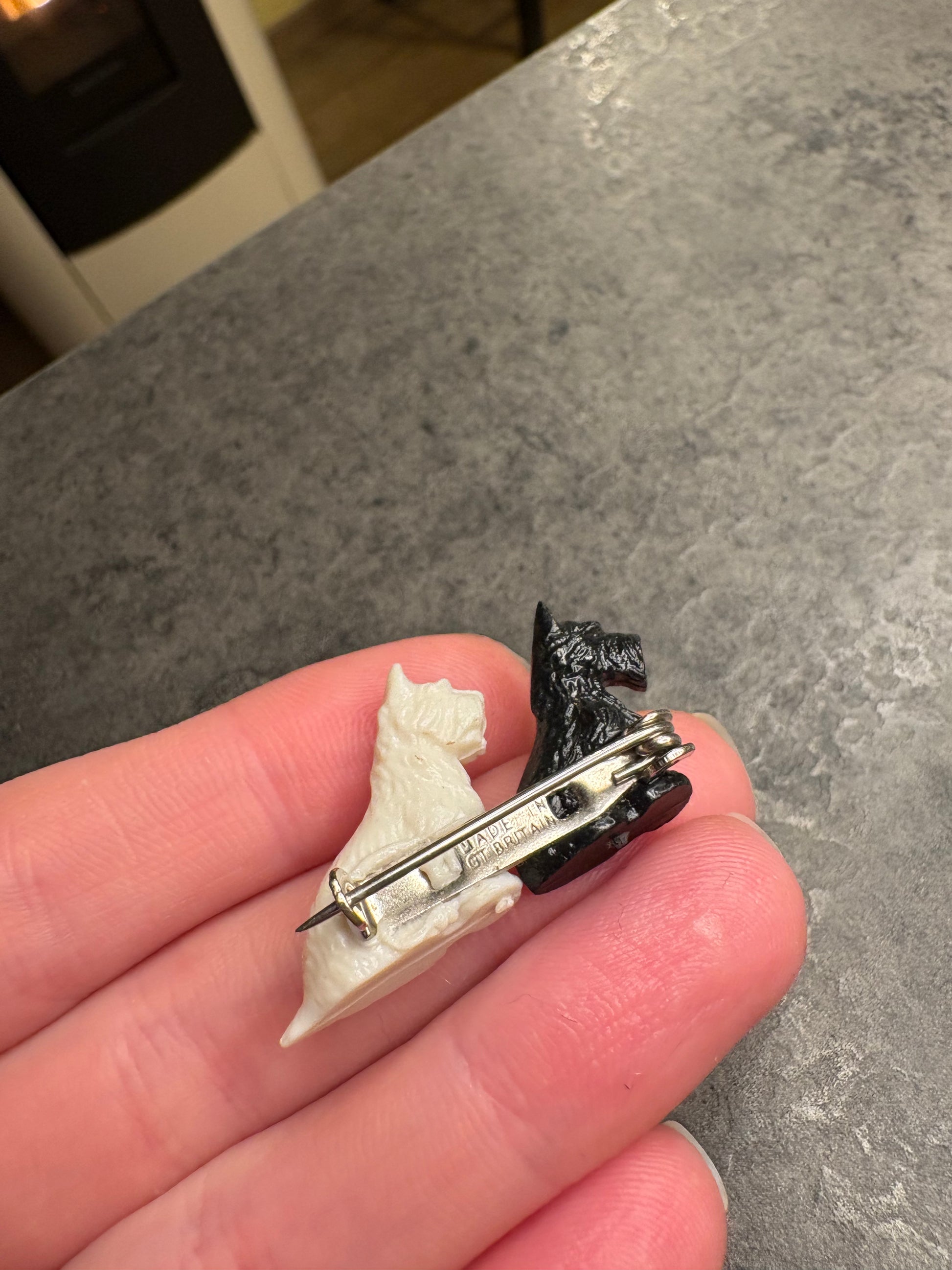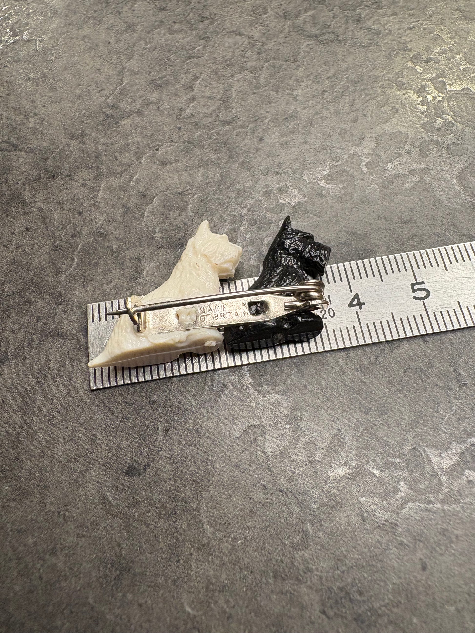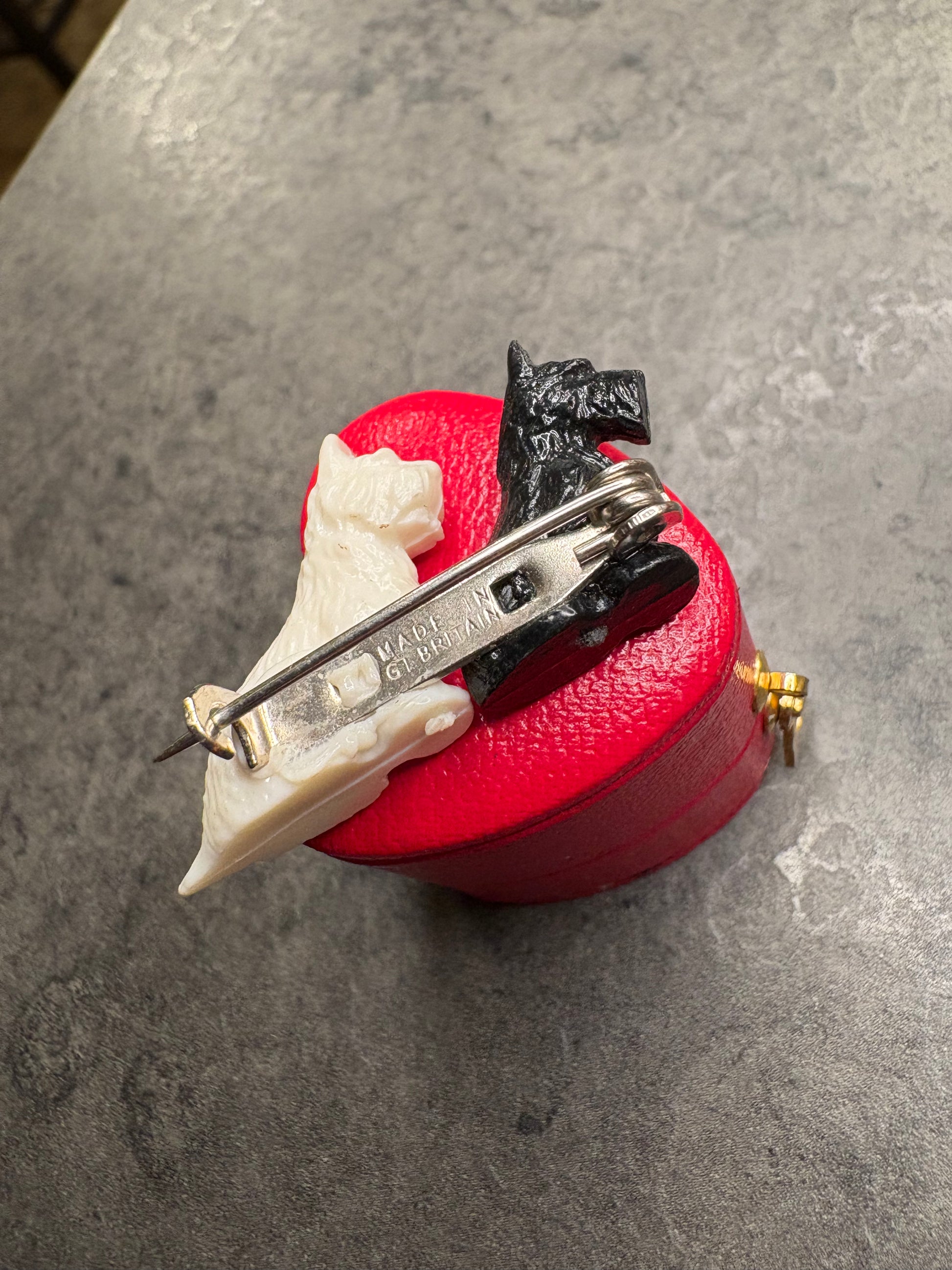 Questa deliziosa spilla vintage inglese raffigura una coppia di piccoli Terrier, uno nero e uno avorio, realizzati in plastica stampata tipica degli anni ’40–’50. I due cagnolini, scolpiti con sorprendente dettaglio nella texture del mantello, sono affiancati come inseparabili compagni, creando una composizione tenera e iconica per gli amanti del mondo dog-themed.