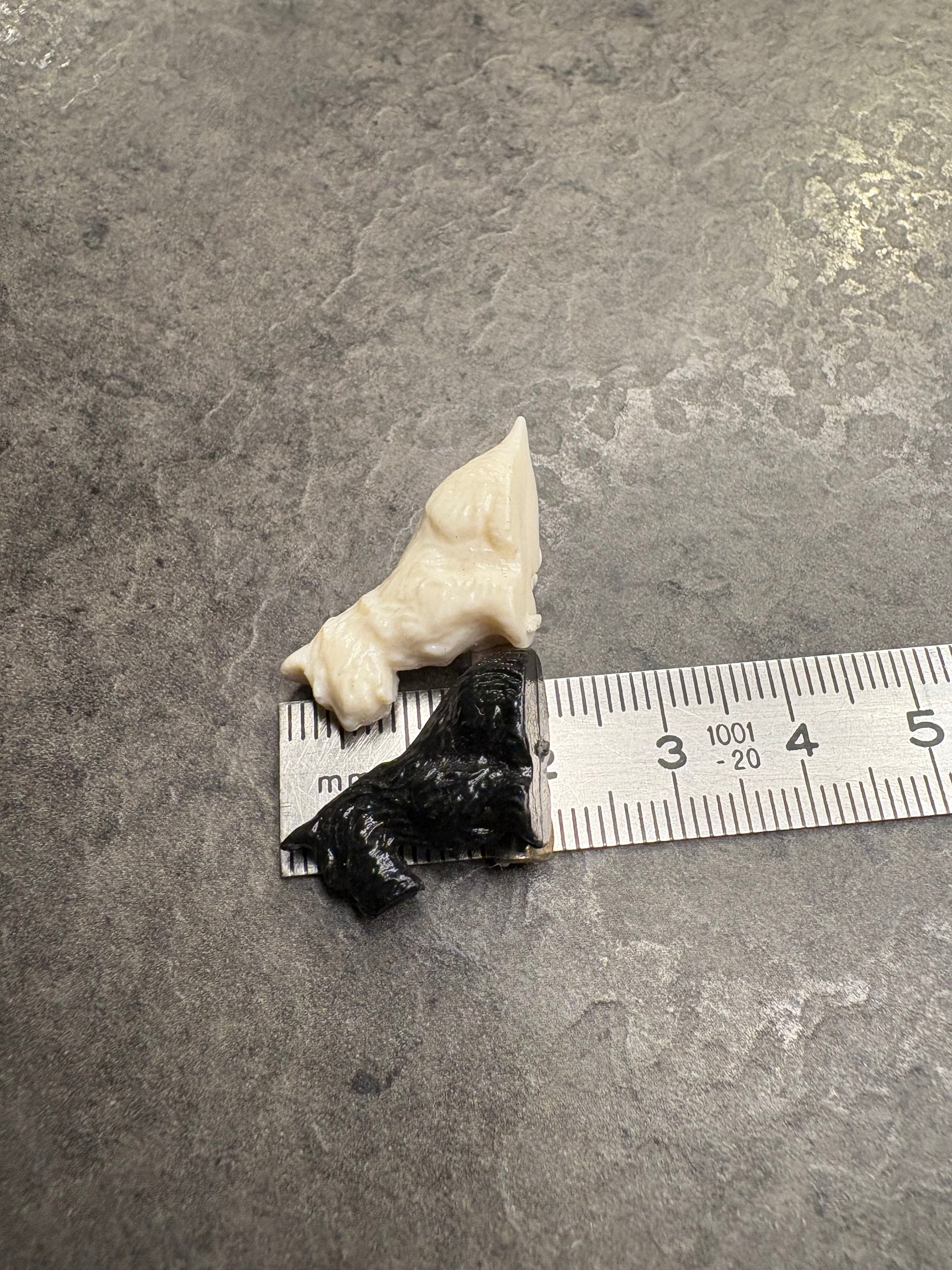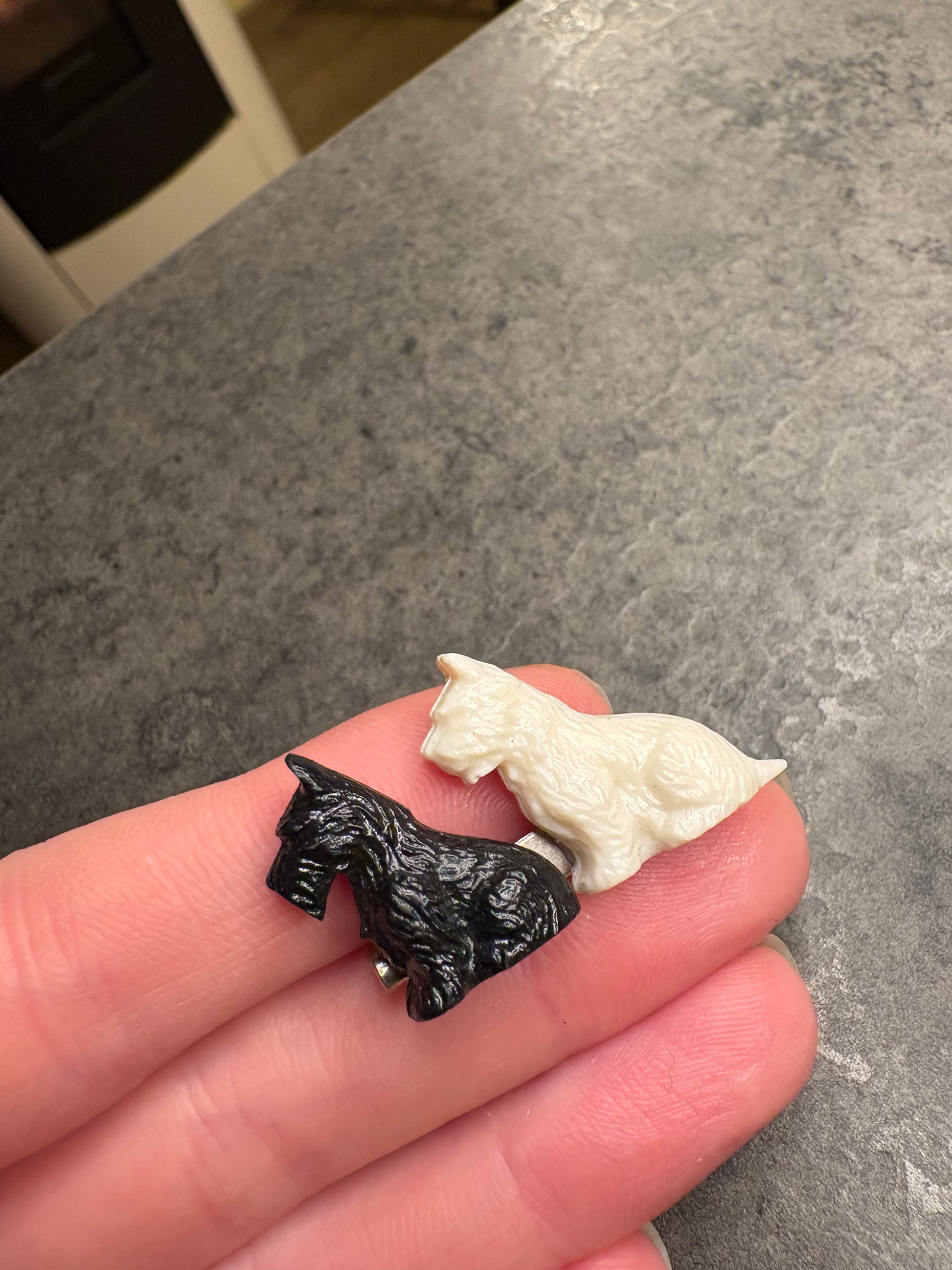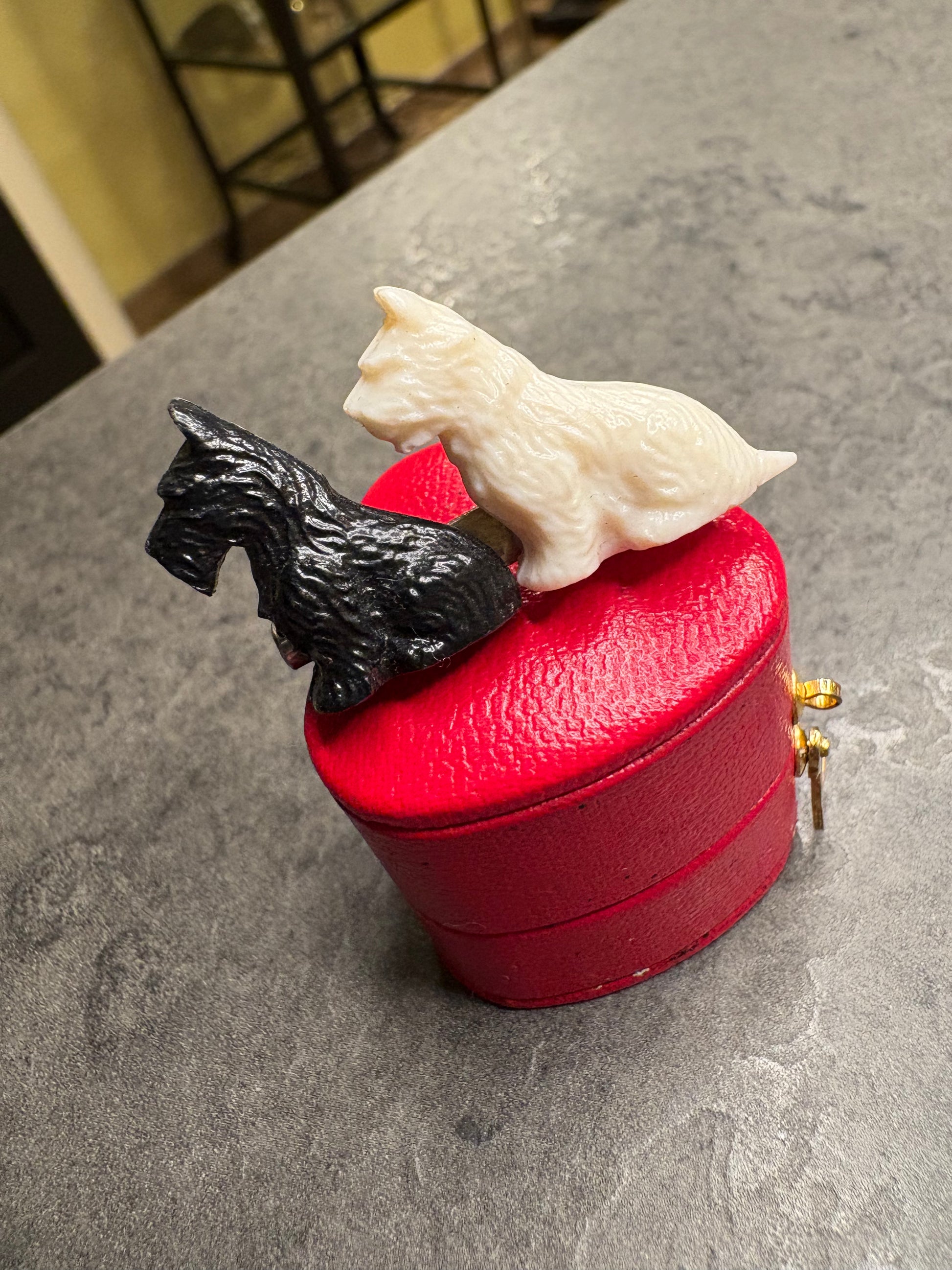 Questa deliziosa spilla vintage inglese raffigura una coppia di piccoli Terrier, uno nero e uno avorio, realizzati in plastica stampata tipica degli anni ’40–’50. I due cagnolini, scolpiti con sorprendente dettaglio nella texture del mantello, sono affiancati come inseparabili compagni, creando una composizione tenera e iconica per gli amanti del mondo dog-themed.