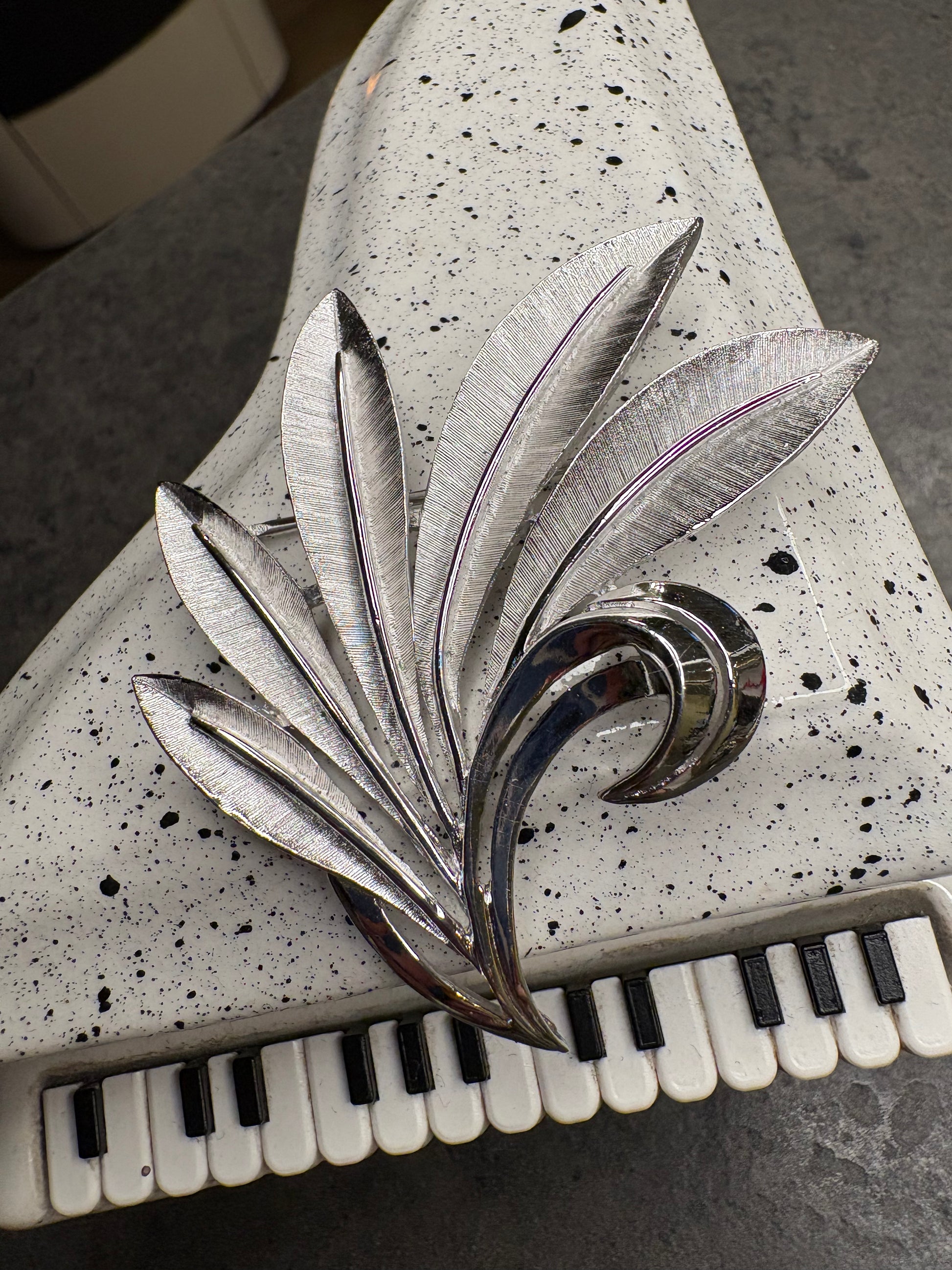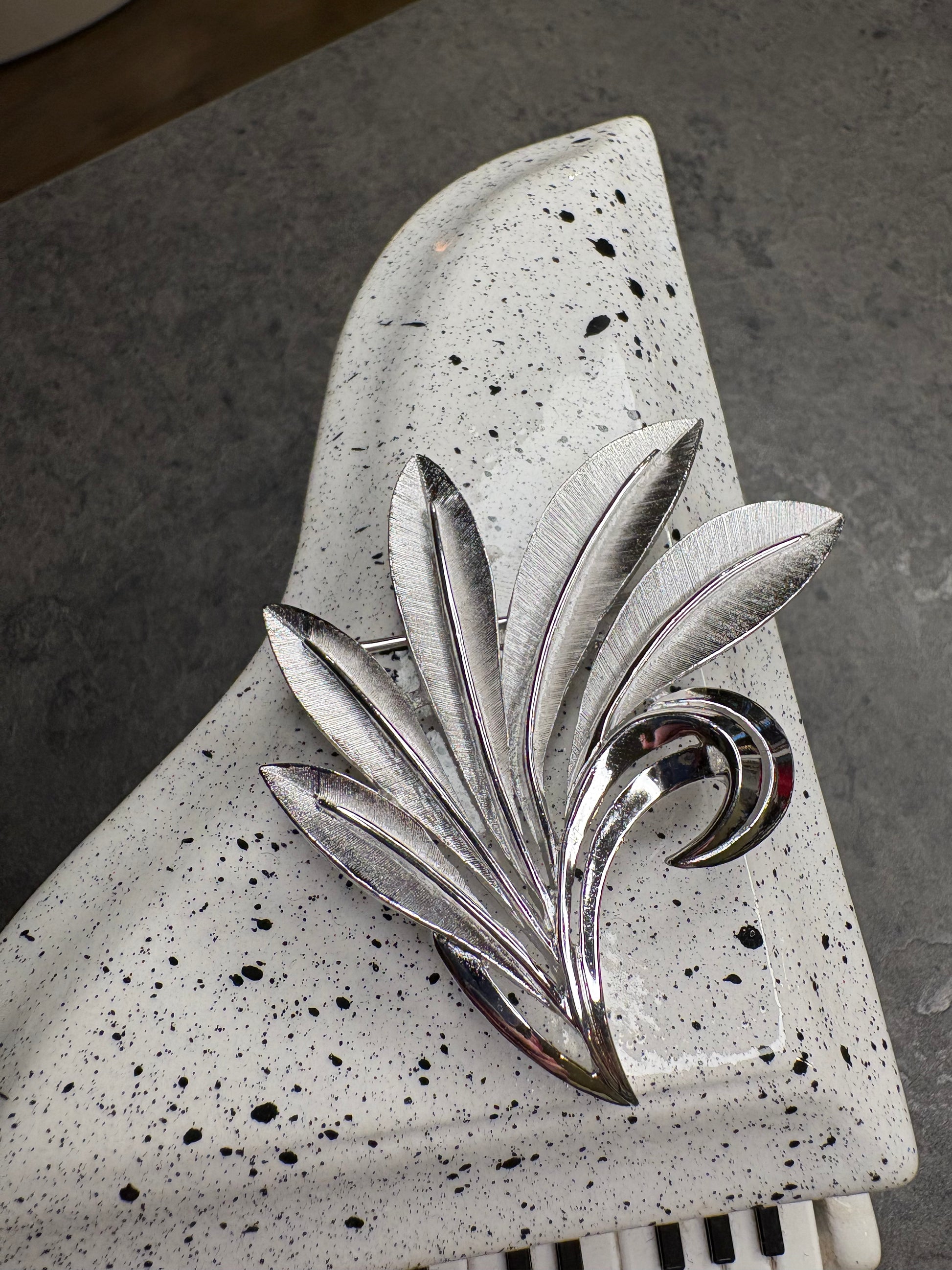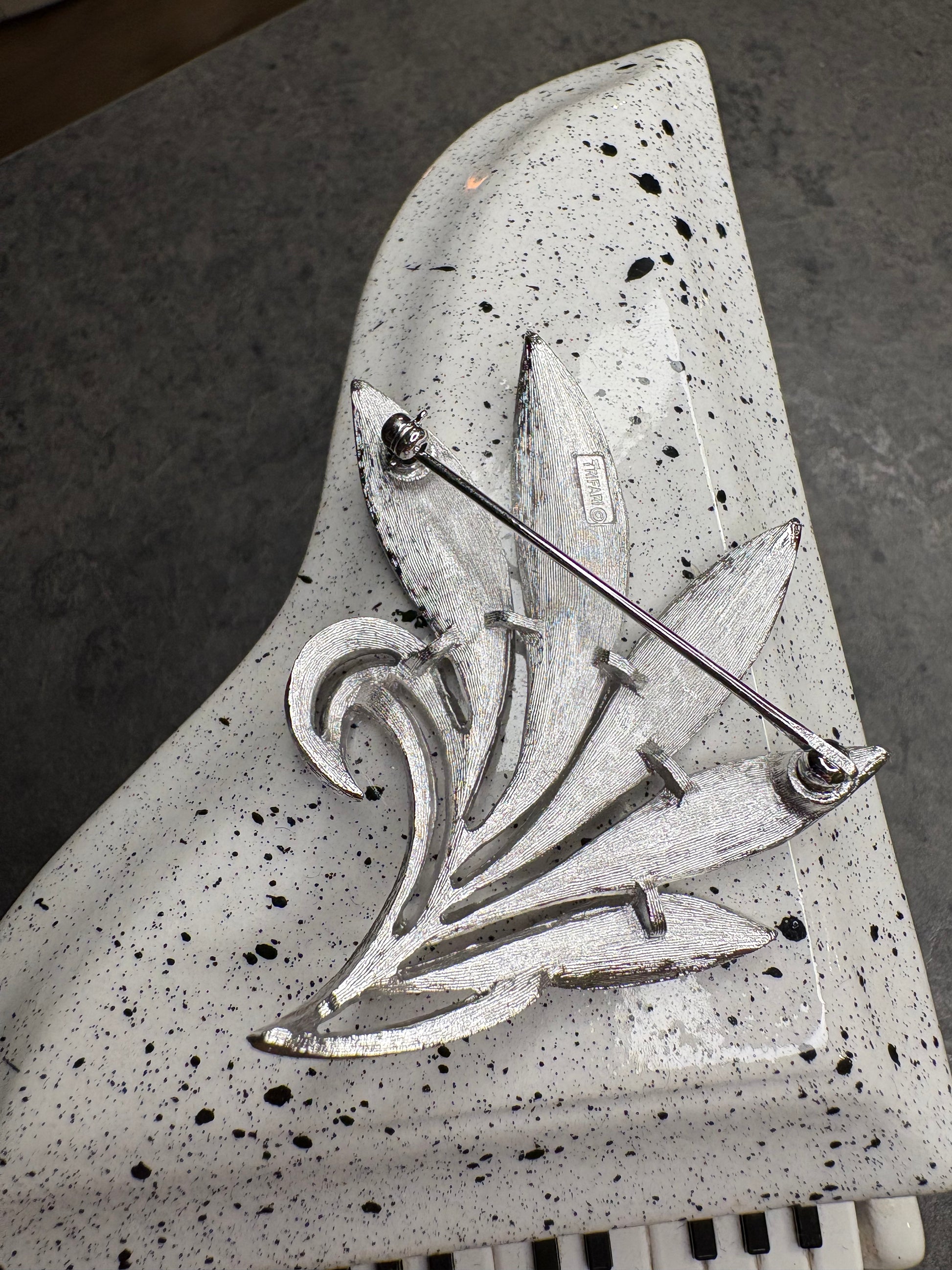 Raffinata e scenografica spilla vintage firmata Trifari, un autentico capolavoro di design degli anni ’60. Realizzata in metallo argentato lucente, presenta una composizione astratta ispirata a un ciuffo di foglie stilizzate, simbolo di eleganza e movimento.