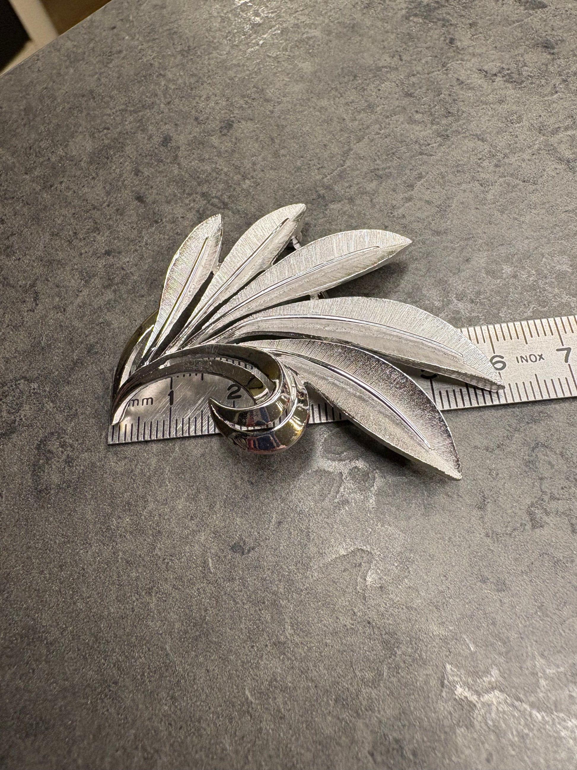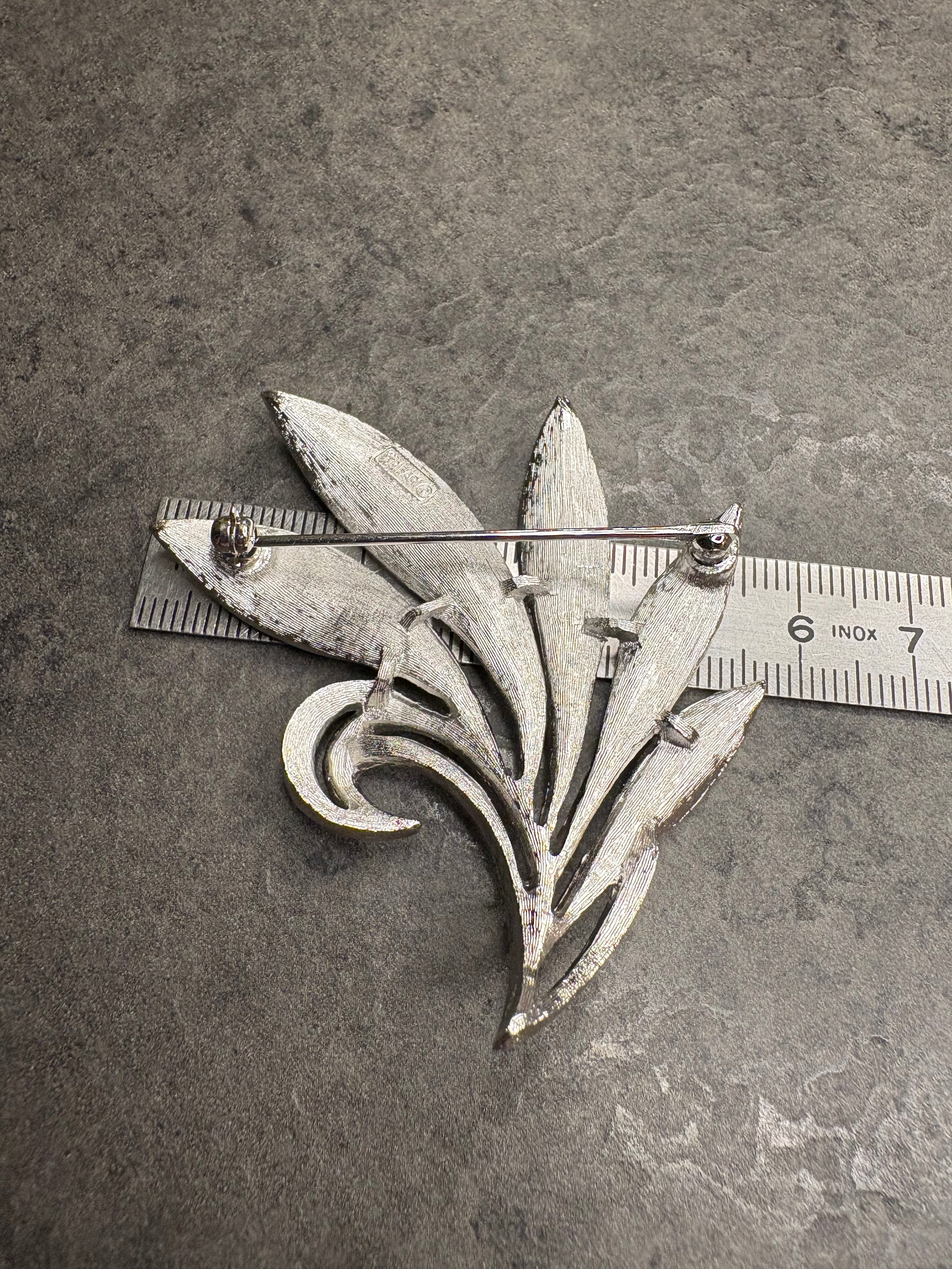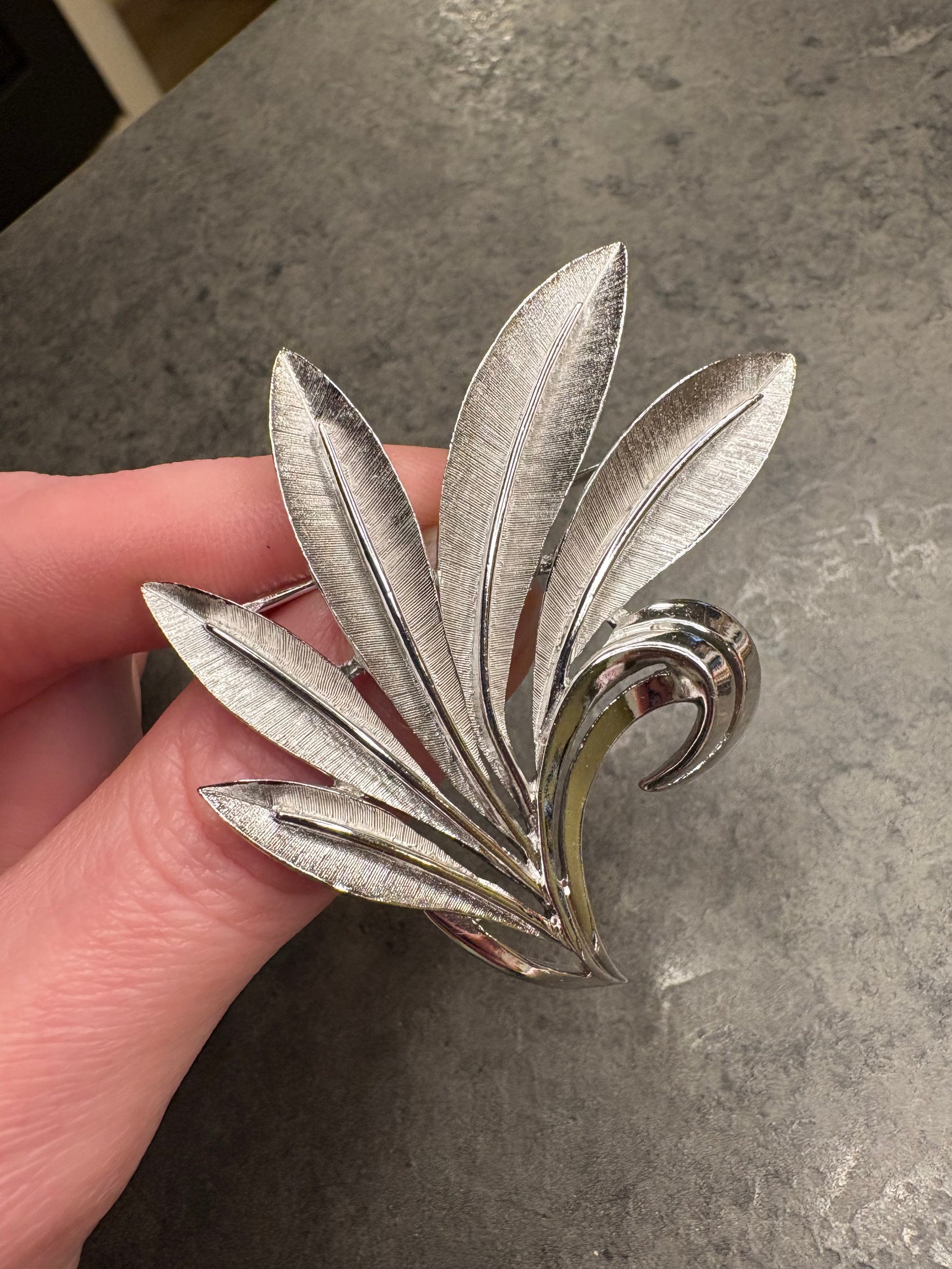 Raffinata e scenografica spilla vintage firmata Trifari, un autentico capolavoro di design degli anni ’60. Realizzata in metallo argentato lucente, presenta una composizione astratta ispirata a un ciuffo di foglie stilizzate, simbolo di eleganza e movimento.