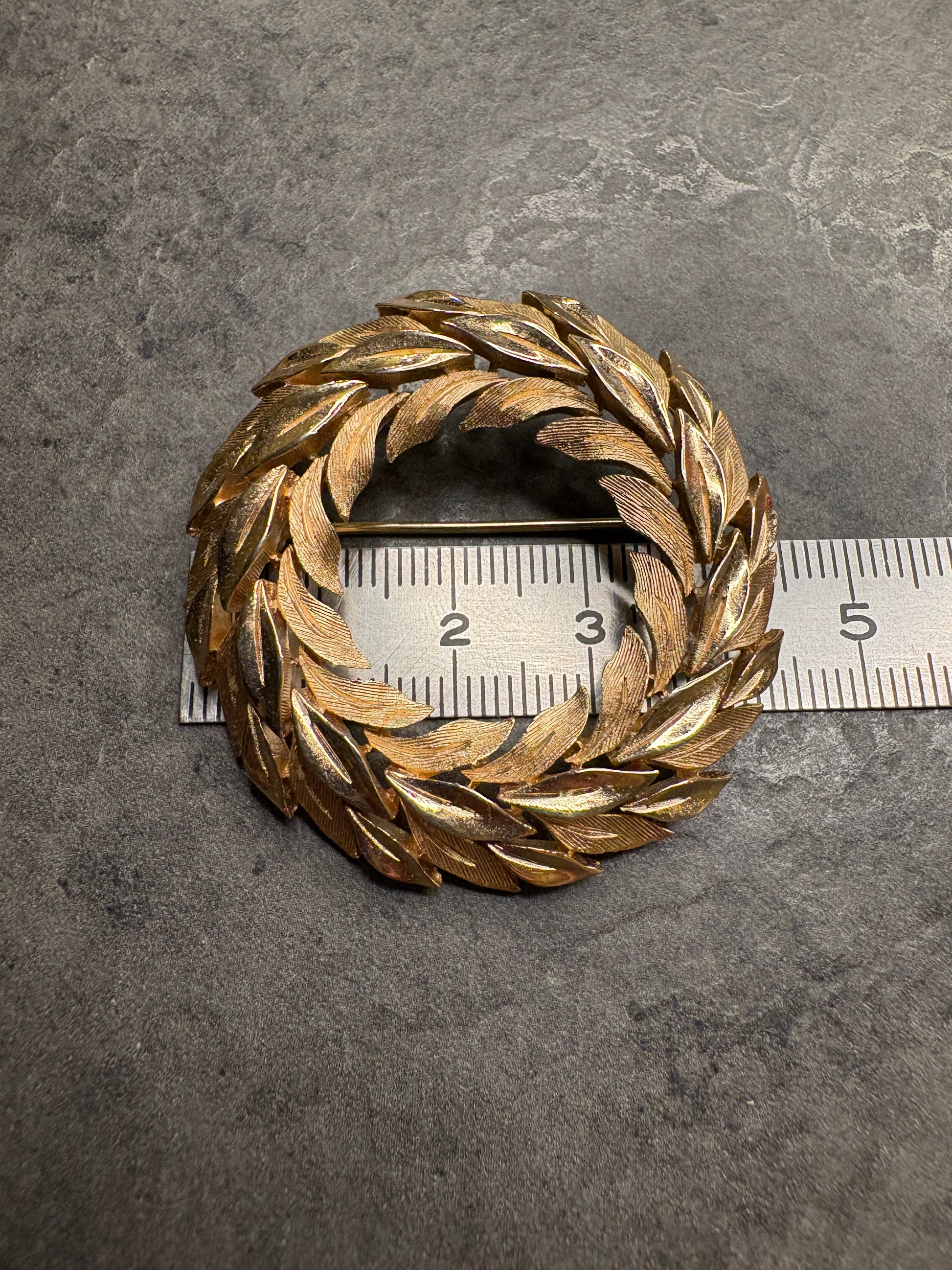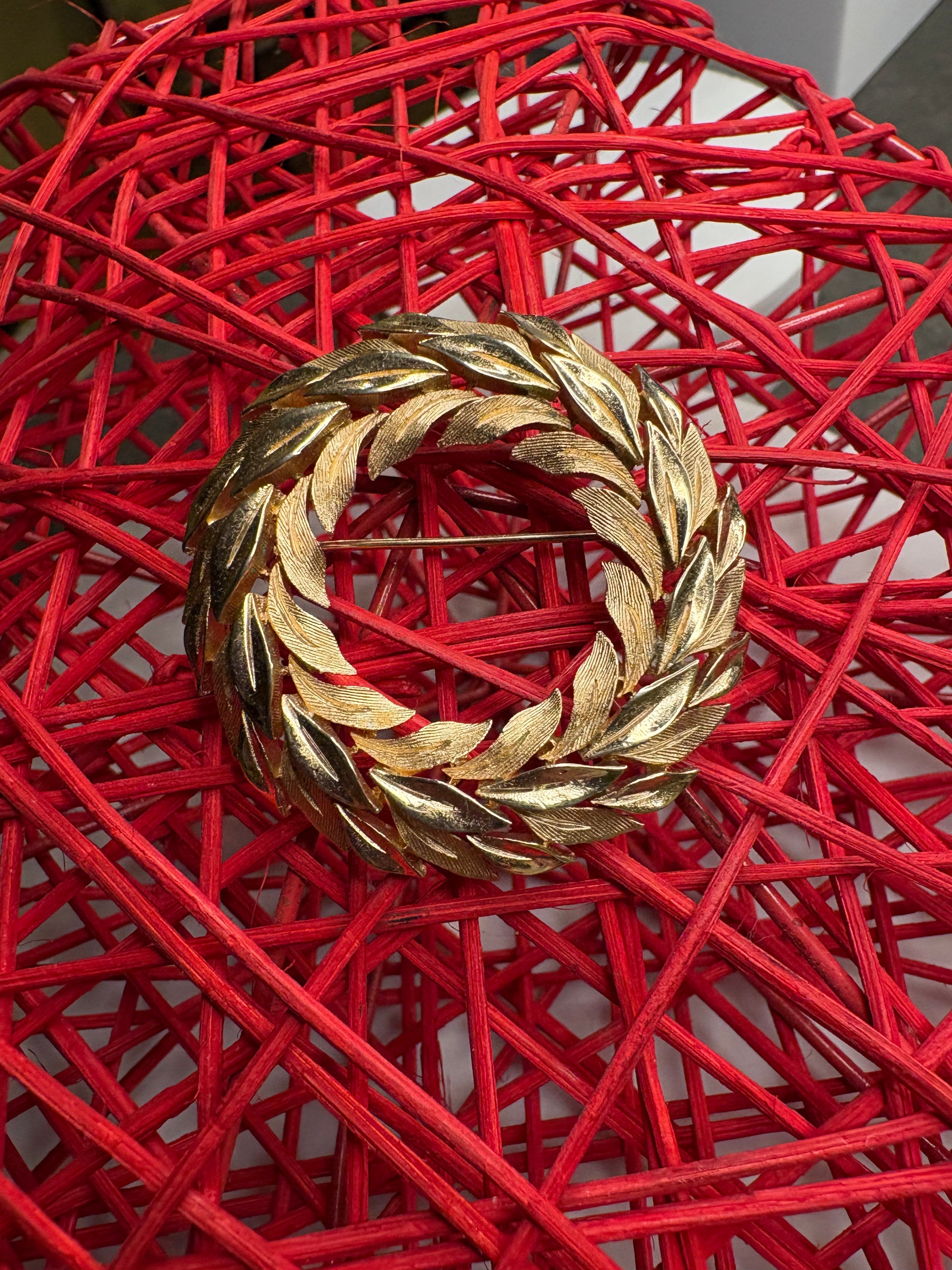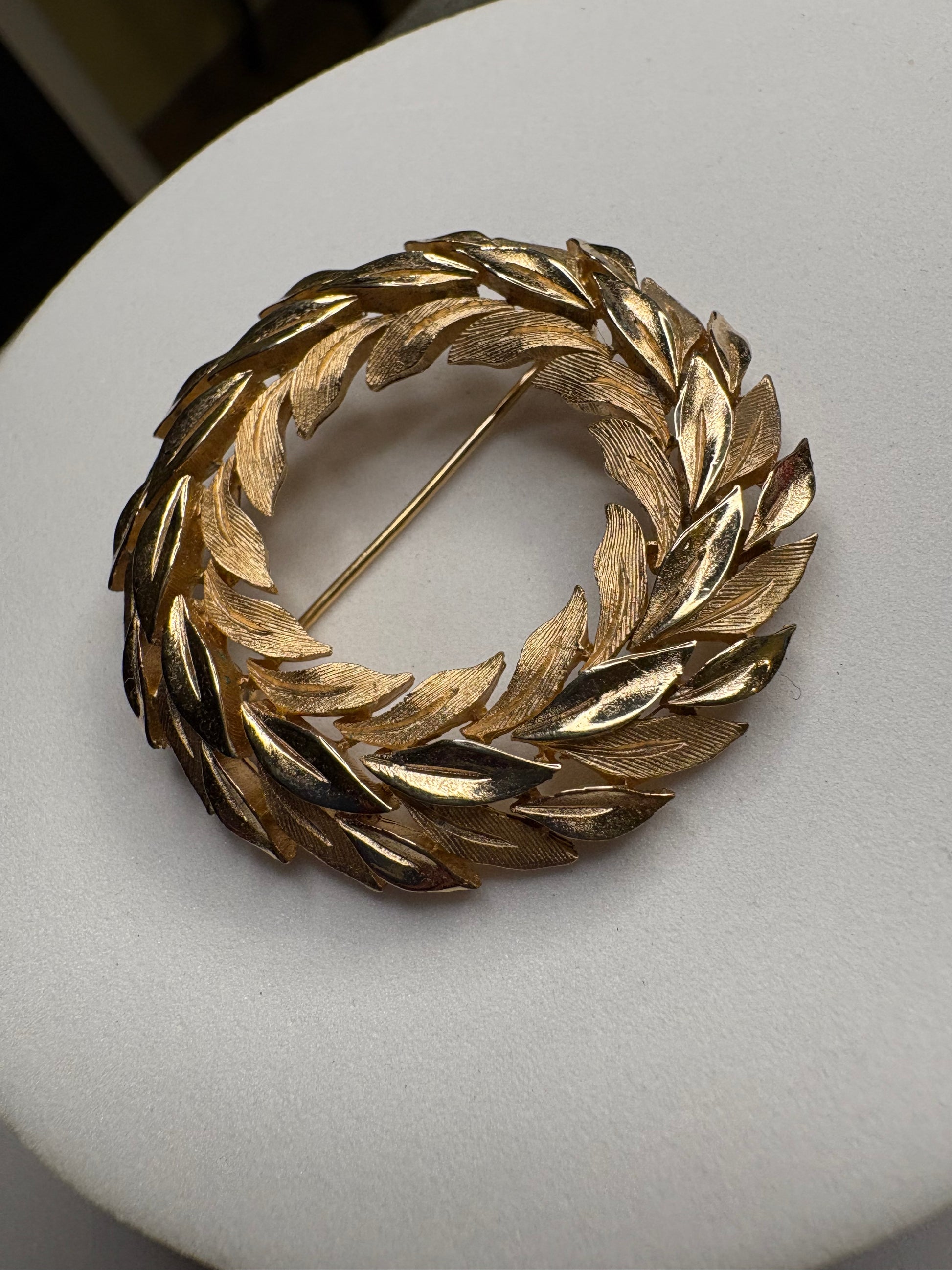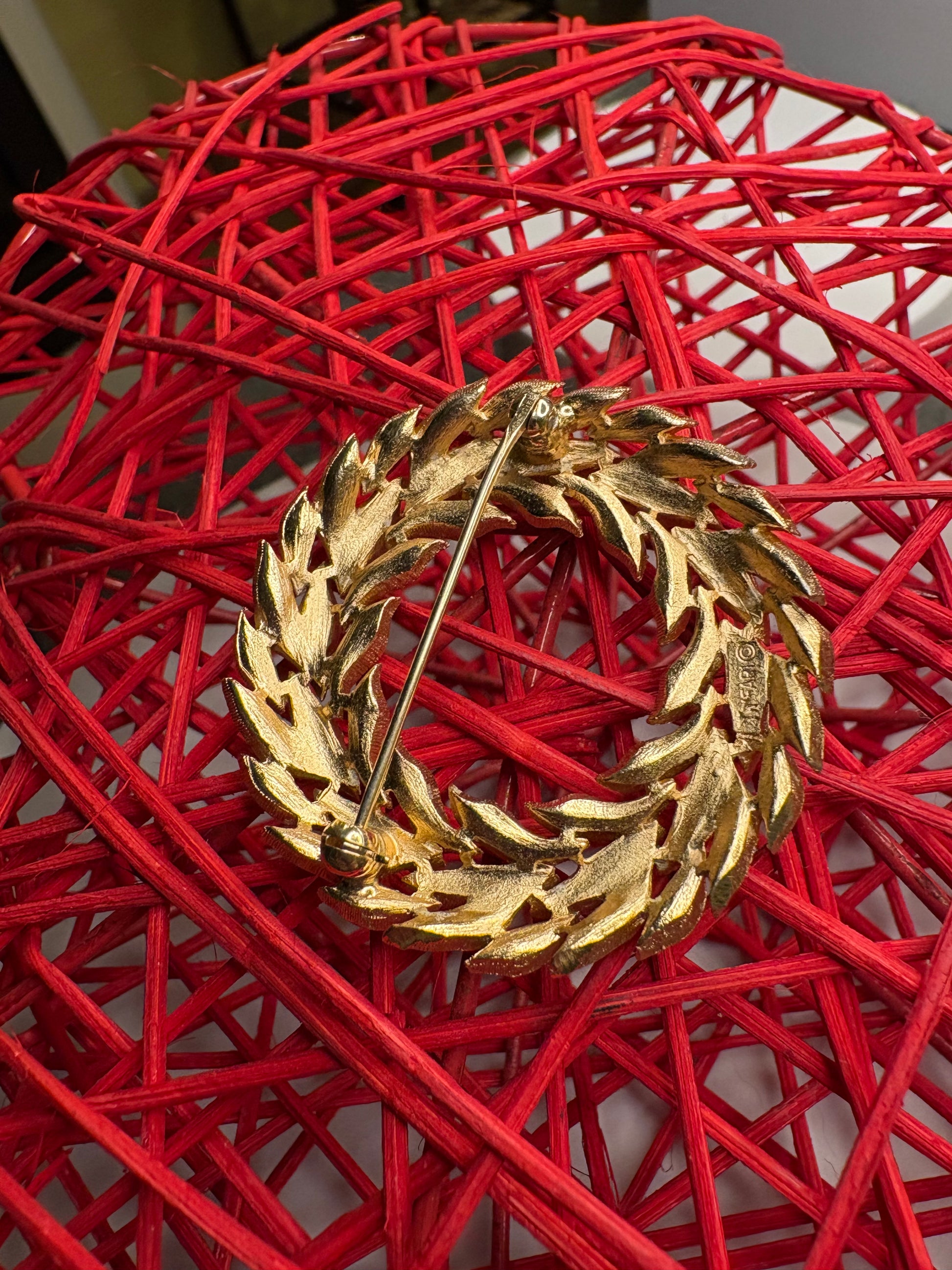 Elegantissima spilla circolare composta da foglie intrecciate in metallo placato oro con alternanza di finiture lucide e satinate che creano profondità e riflessi sofisticati. Il motivo a corona è equilibrato e armonioso, tipico dell’eleganza classica Trifari. Chiusura a perno robusta, pezzo raffinato e molto versatile.