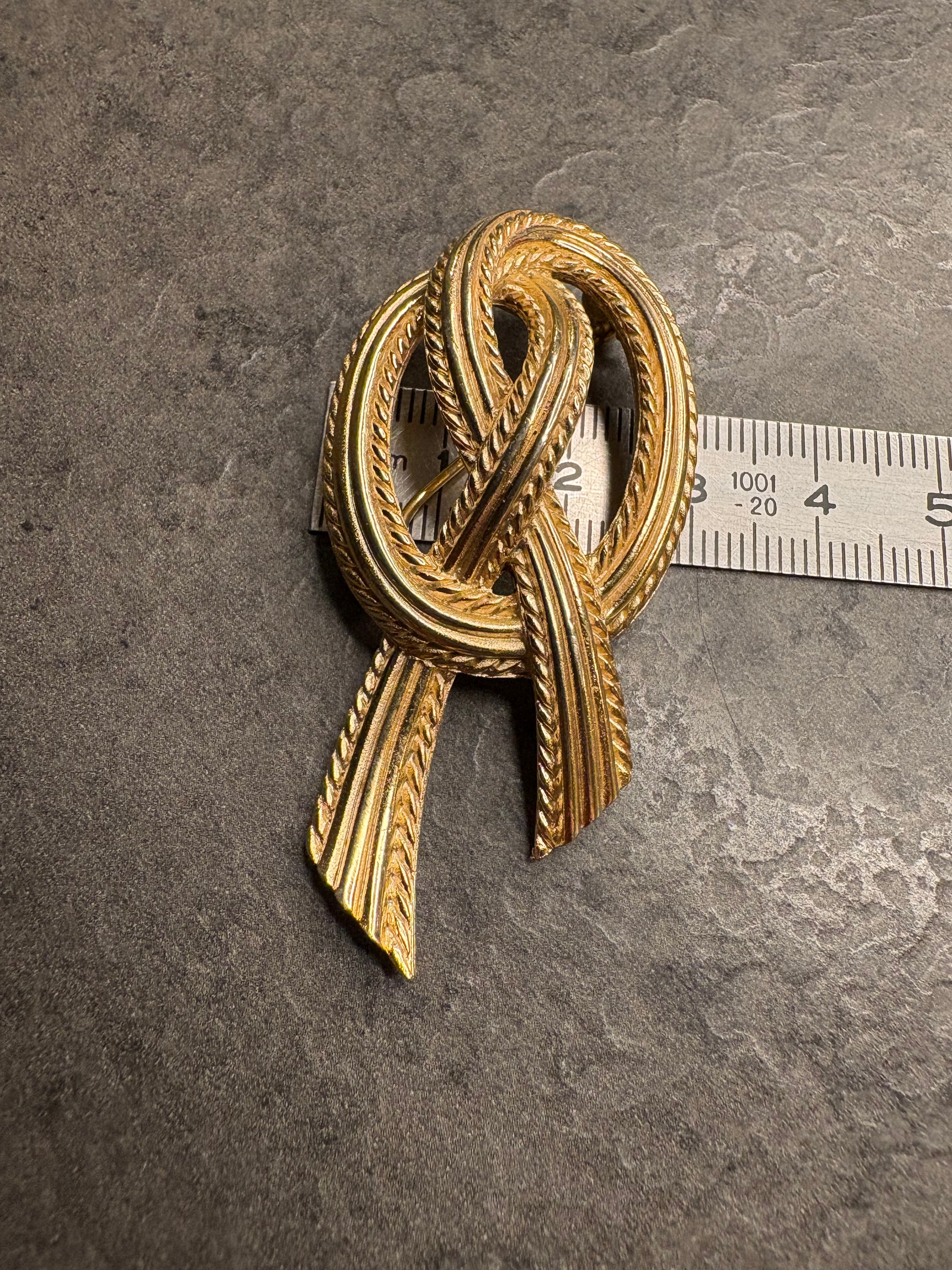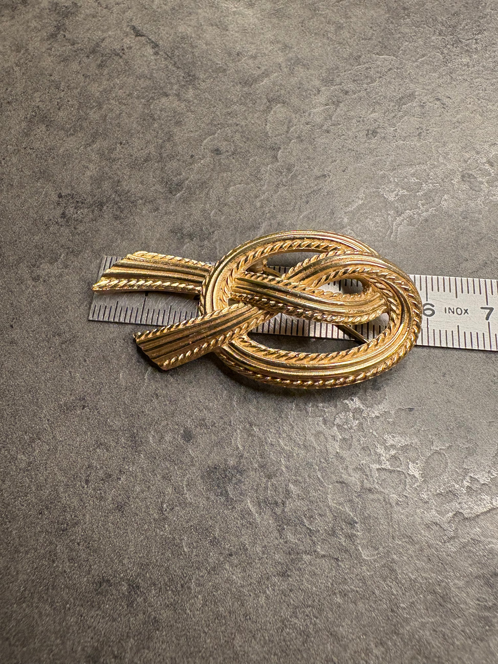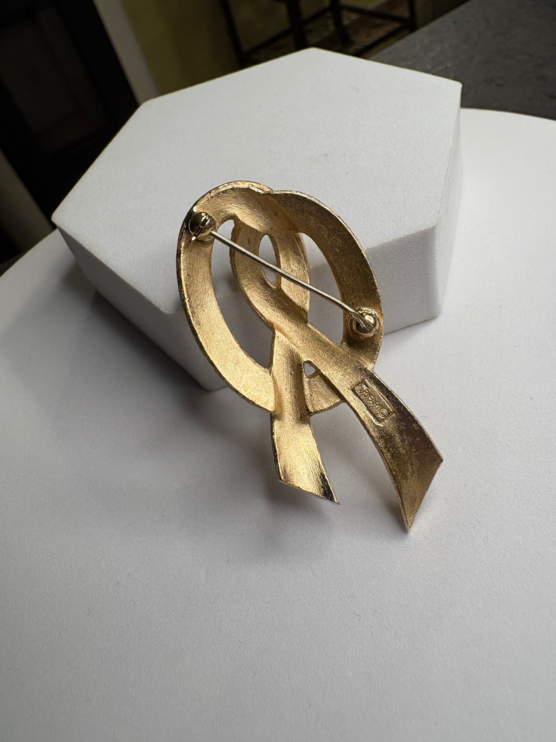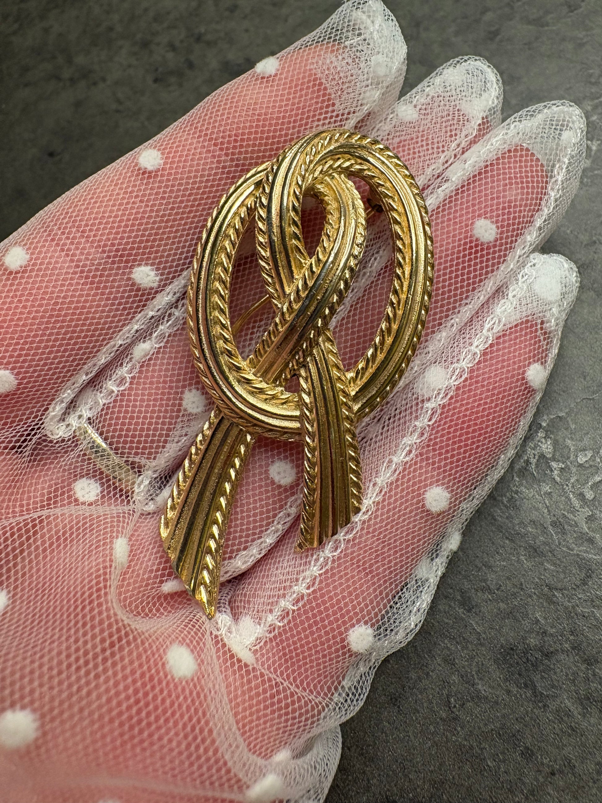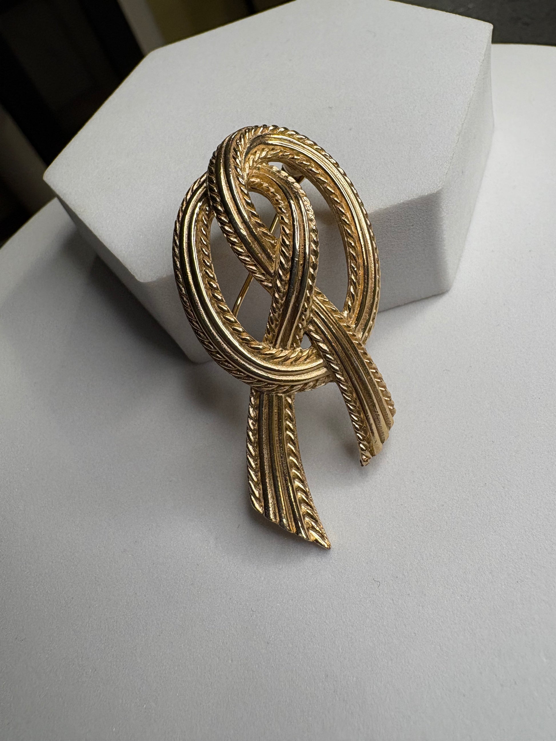 Elegantissima spilla vintage firmata Trifari raffigurante un nodo stilizzato, simbolo di legame e continuità. Realizzata in metallo dorato con finitura satinata, presenta dettagli a cordoncino intrecciato che donano profondità e movimento. Le linee sono morbide ma strutturate, con equilibrio perfetto tra volumi e proporzioni. La satinatura conferisce un aspetto vellutato e sofisticato, tipico della produzione di qualità del brand. Pezzo classico e intramontabile, ideale su blazer o cappotti eleganti.