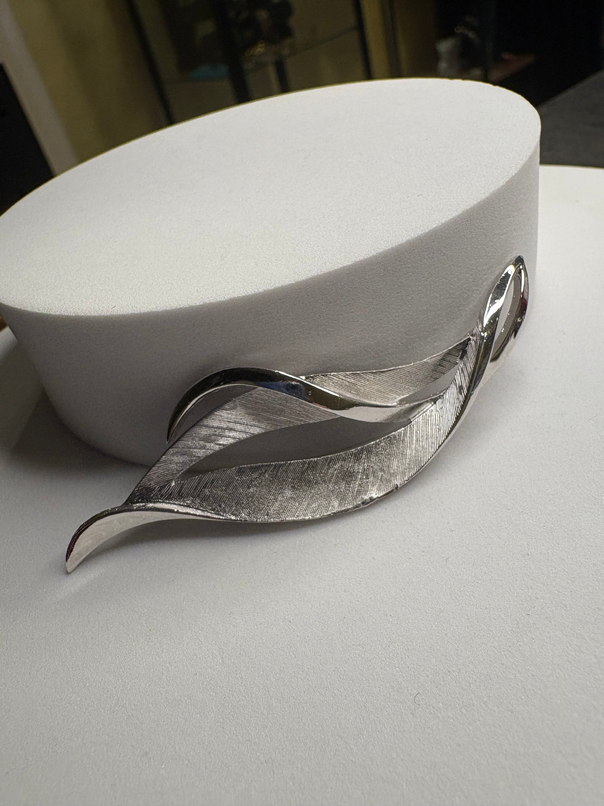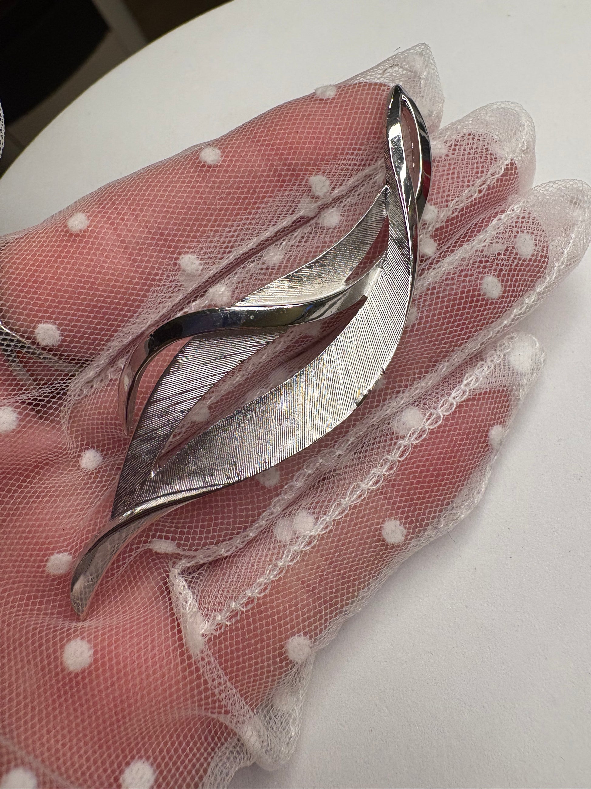 Bellissima spilla i tag di Trifari realizzata in metallo color argento con raffinato contrasto tra finitura lucida e satinata. Le superfici satinate creano un effetto vellutato, mentre i bordi lucidi riflettono la luce con eleganza. Linee fluide e armoniose, tipiche del design Trifari anni ’60. Chiusura sicura e struttura ben bilanciata. Gioiello molto raffinato, perfetto su giacche eleganti o cappotti.