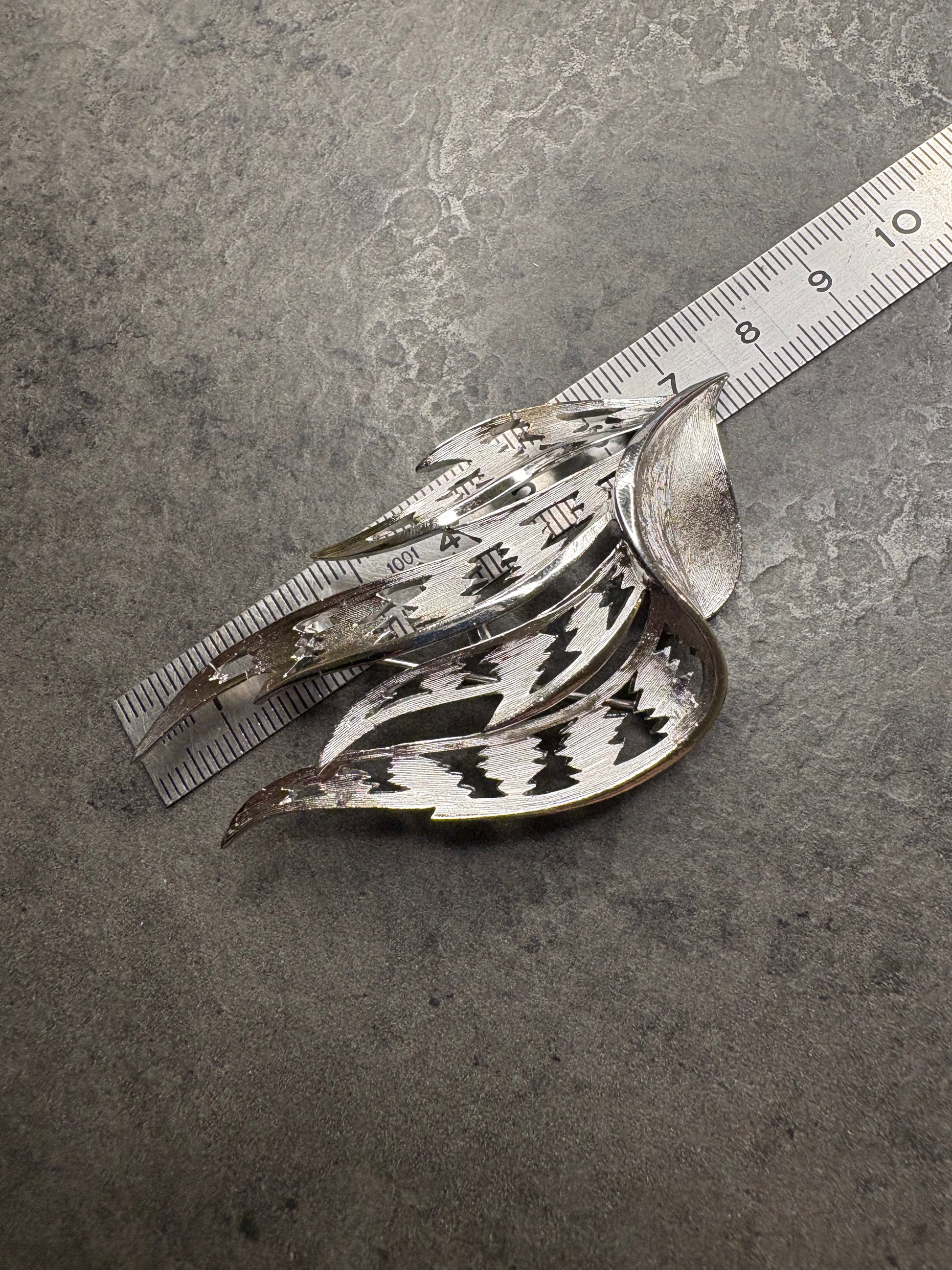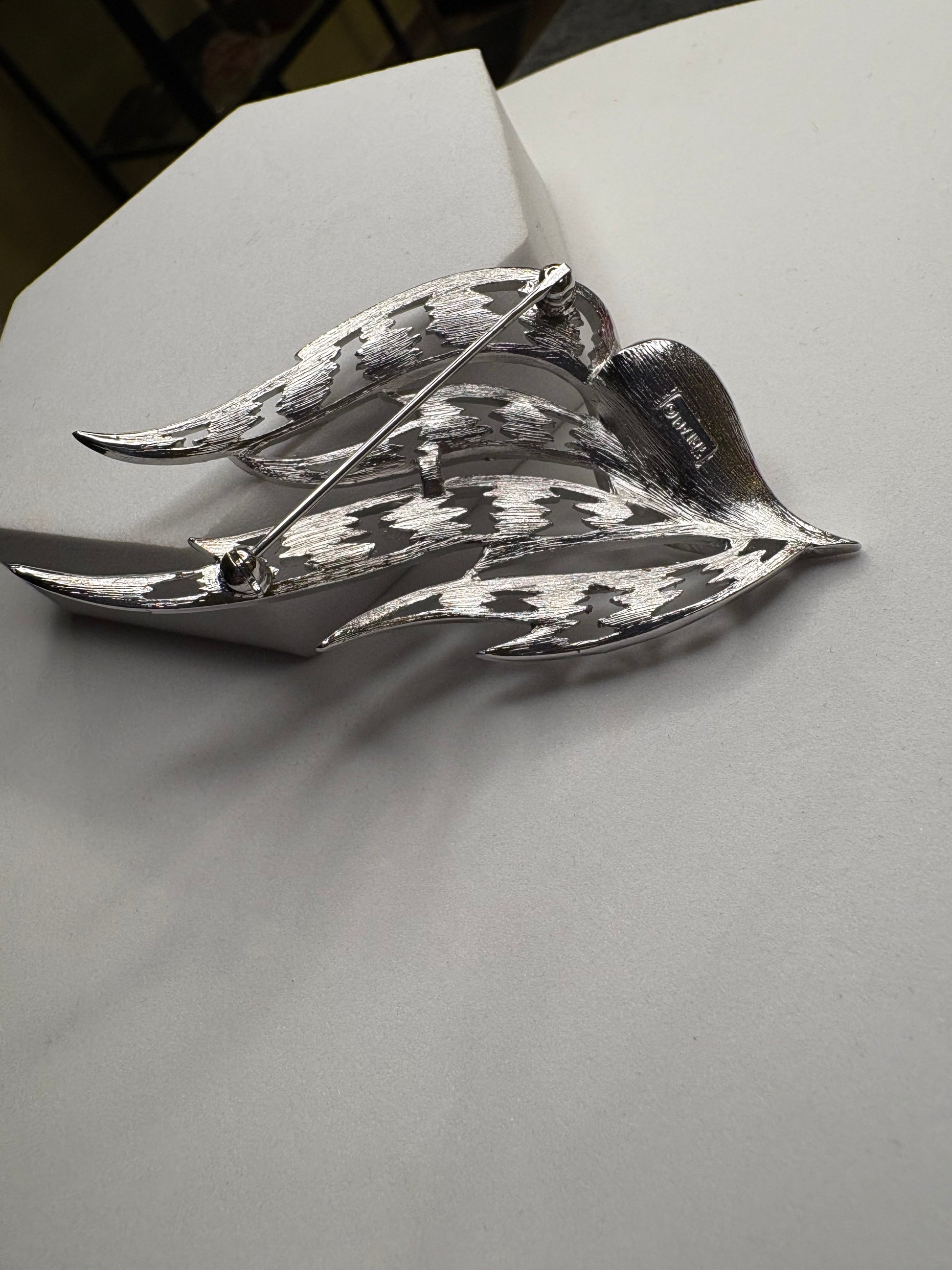 Elegante spilla vintage Trifari dal design scultoreo che ricorda una fiamma stilizzata o ali in movimento. Realizzata in metallo color argento con alternanza di superfici lucide e satinate che creano giochi di luce sofisticati. Le linee fluide e allungate rendono il pezzo molto dinamico e moderno nonostante l’età. Ottima qualità costruttiva tipica del marchio Trifari. Chiusura a perno con fermo. Perfetta su giacche minimal o cappotti eleganti.