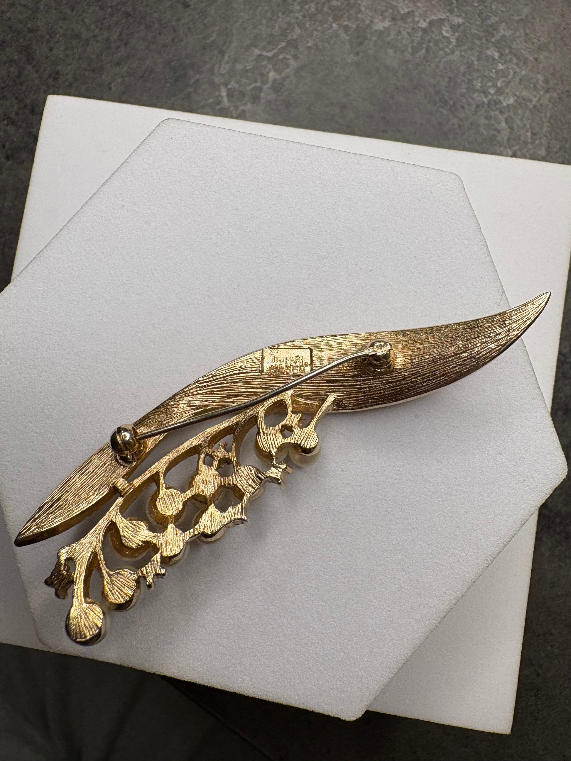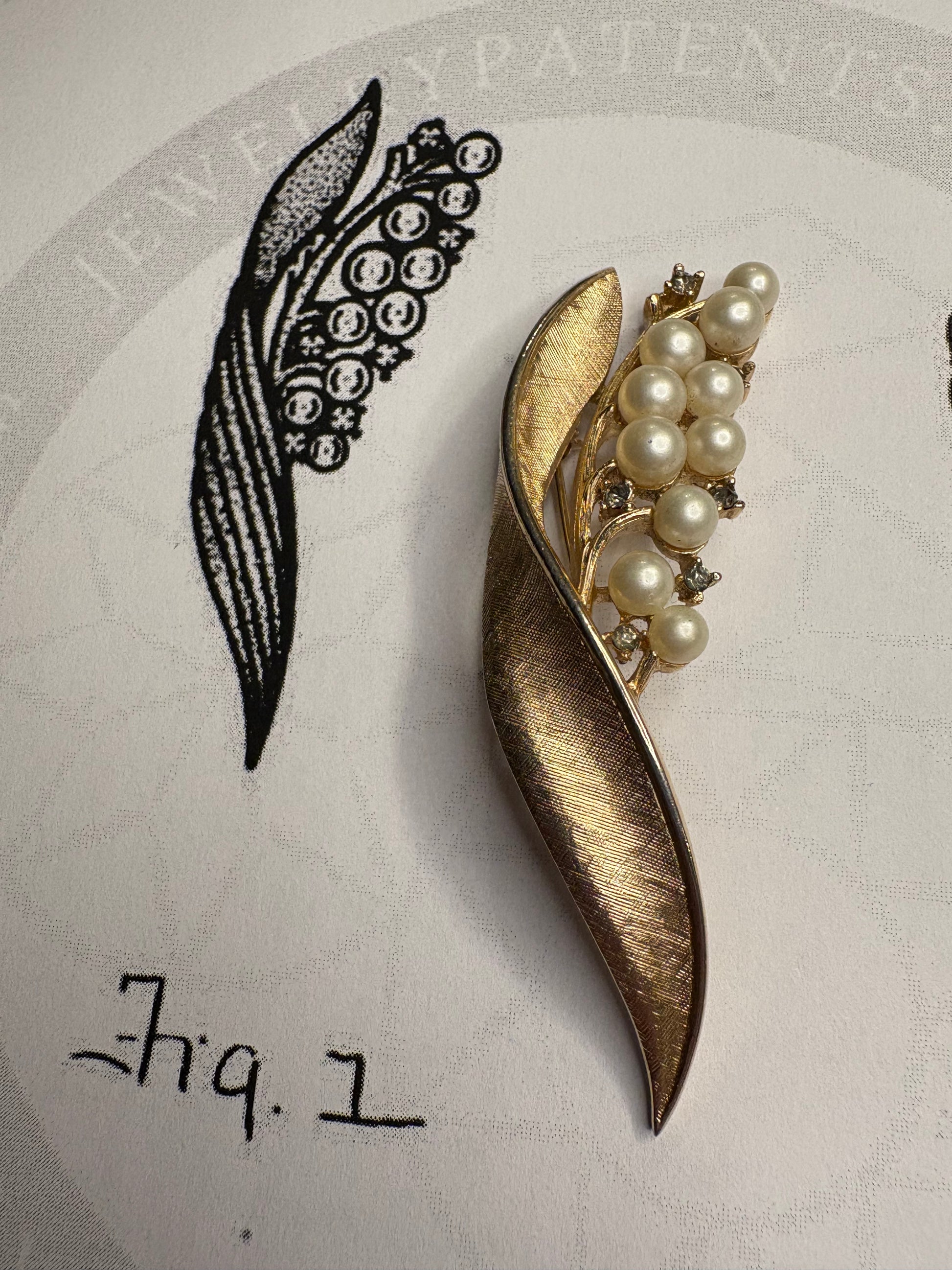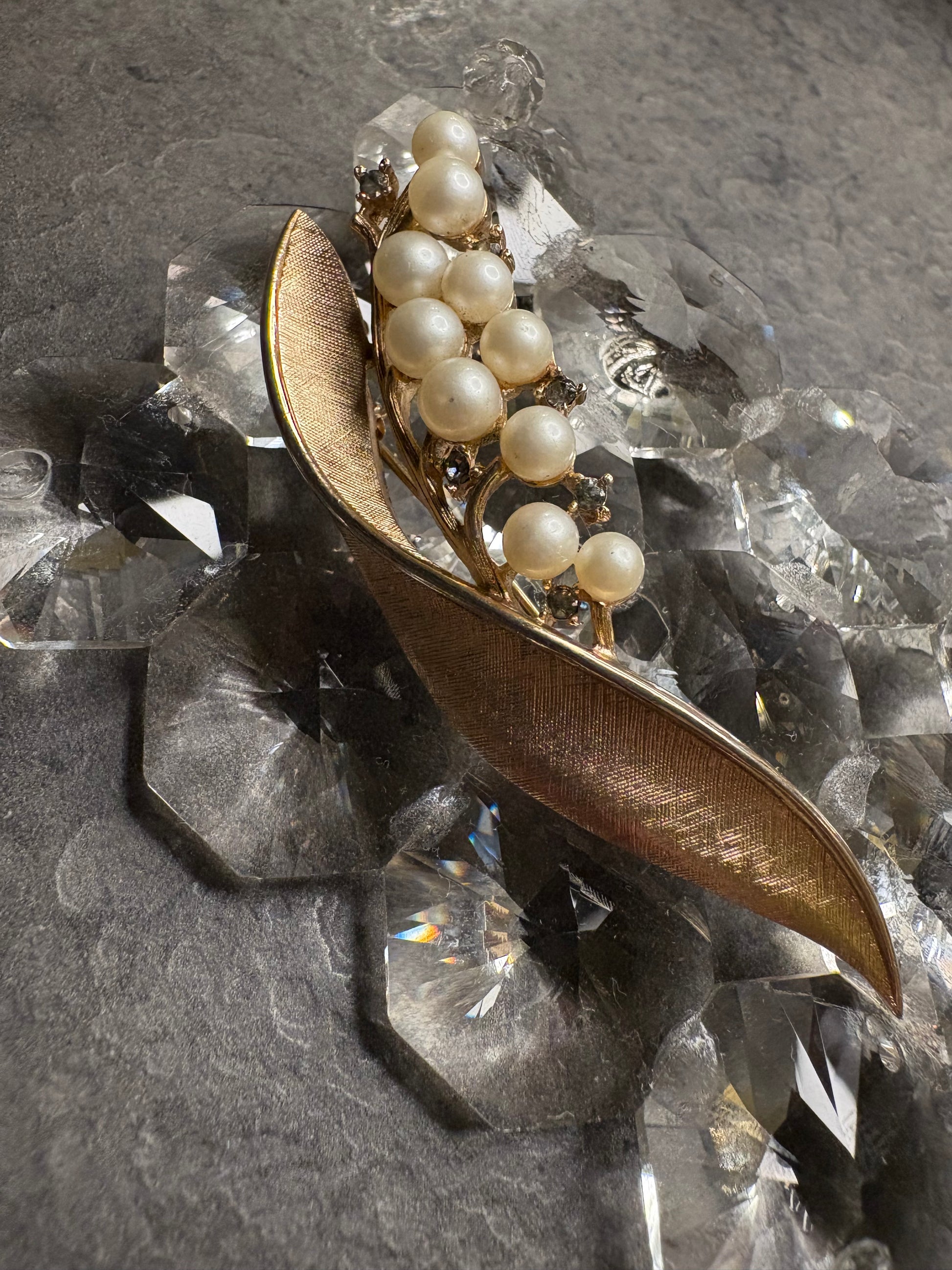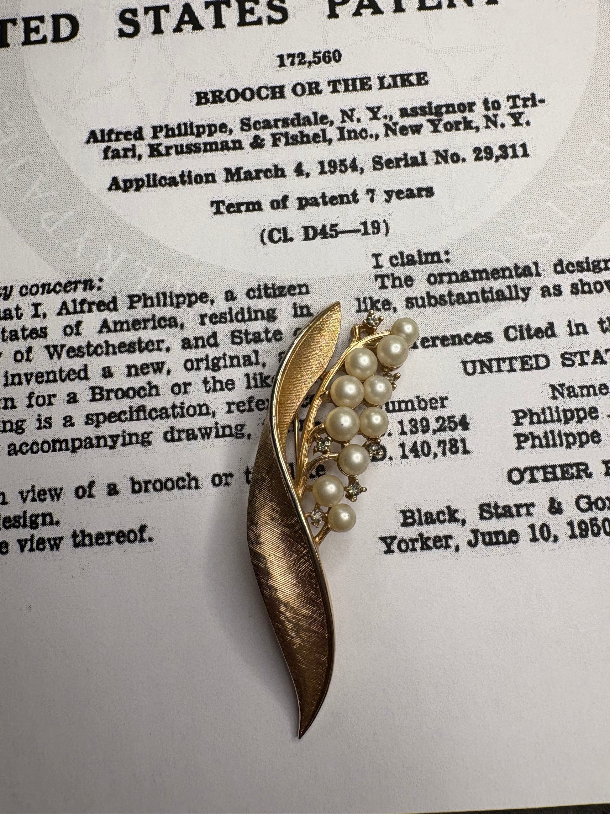 Rara e preziosa spilla vintage firmata Trifari, disegnata dal celebre designer Alfred Philippe e contraddistinta dal numero di brevetto 172560 del 1954. Realizzata in metallo dorato satinato con raffinati contrasti lucidi, questa creazione rappresenta una foglia stilizzata dalla linea sinuosa e dinamica. La superficie alterna zone spazzolate ad aree lucide che esaltano il movimento naturale della forma. La decorazione centrale è composta da un elegante grappolo di perle artificiali luminose, perfettamente bilanciate da piccoli cristalli trasparenti che donano brillantezza discreta e sofisticata. Il design è armonioso e tridimensionale, tipico dello stile ricercato di Philippe per Trifari negli anni ’50. Pezzo raro e da collezione, di grande valore storico e stilistico.