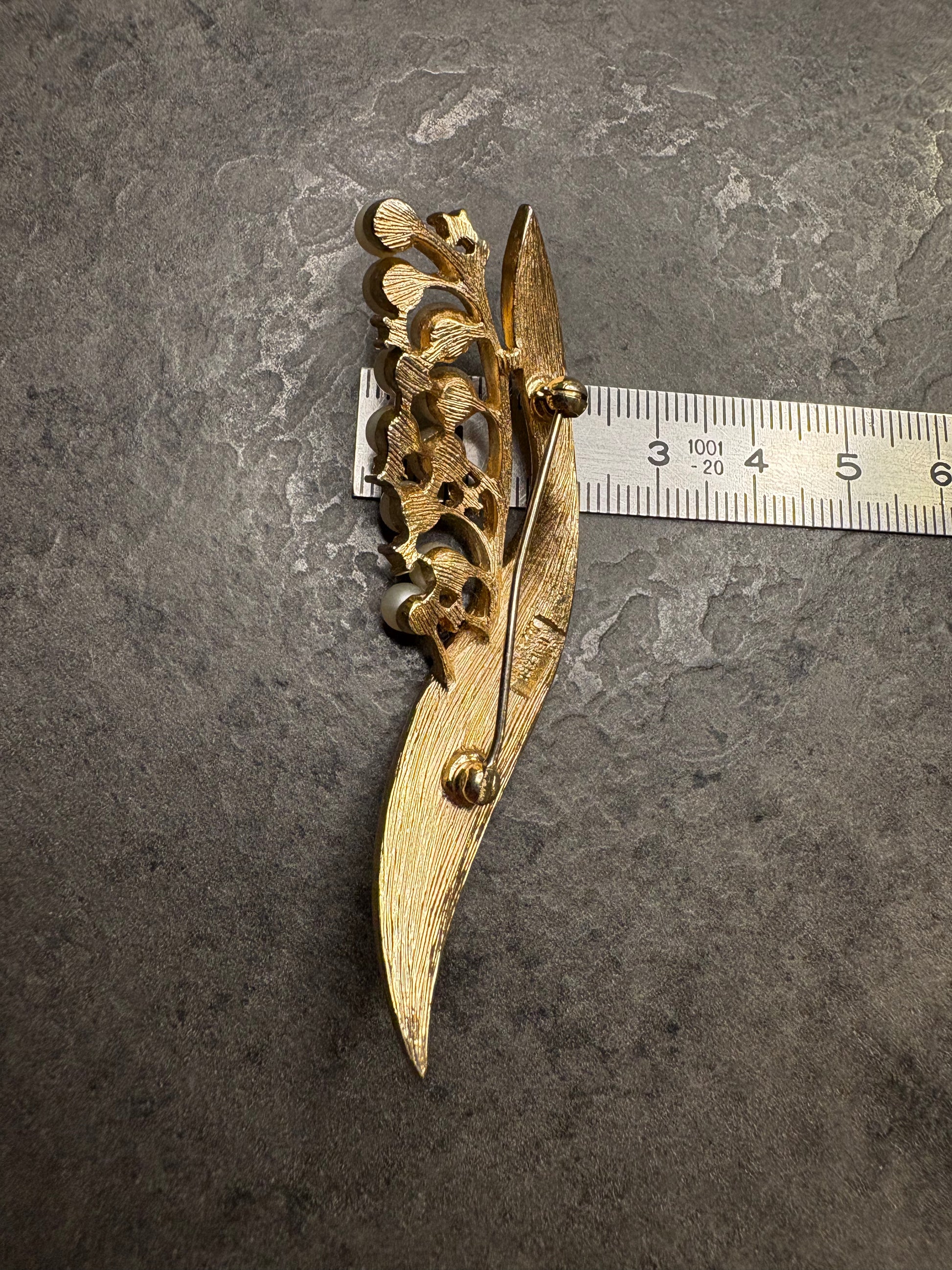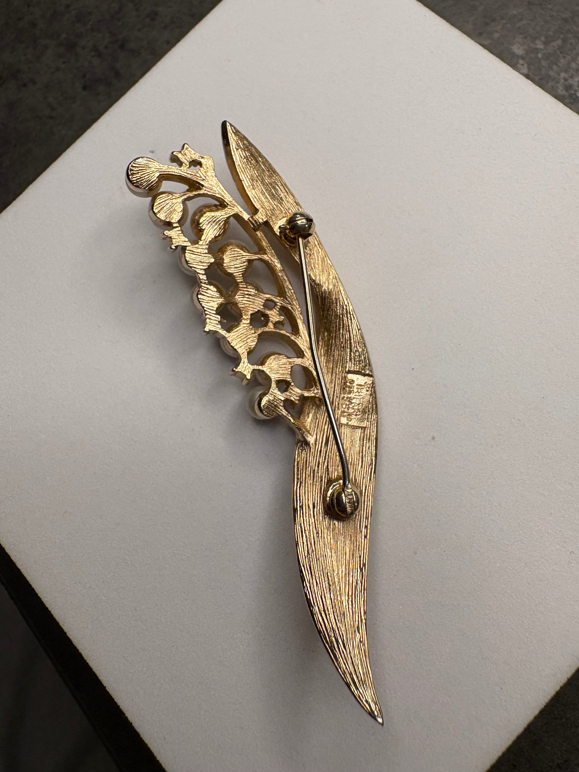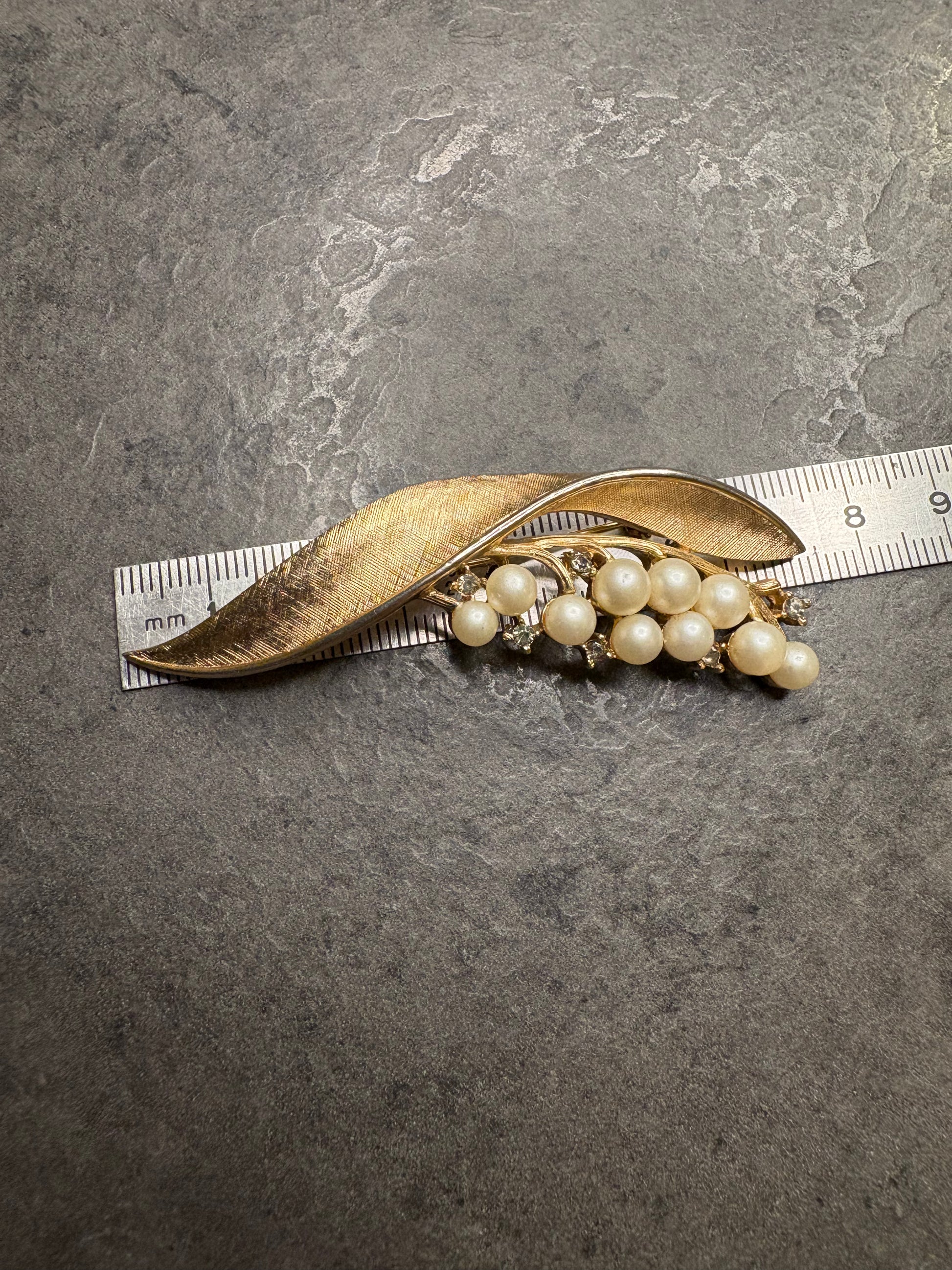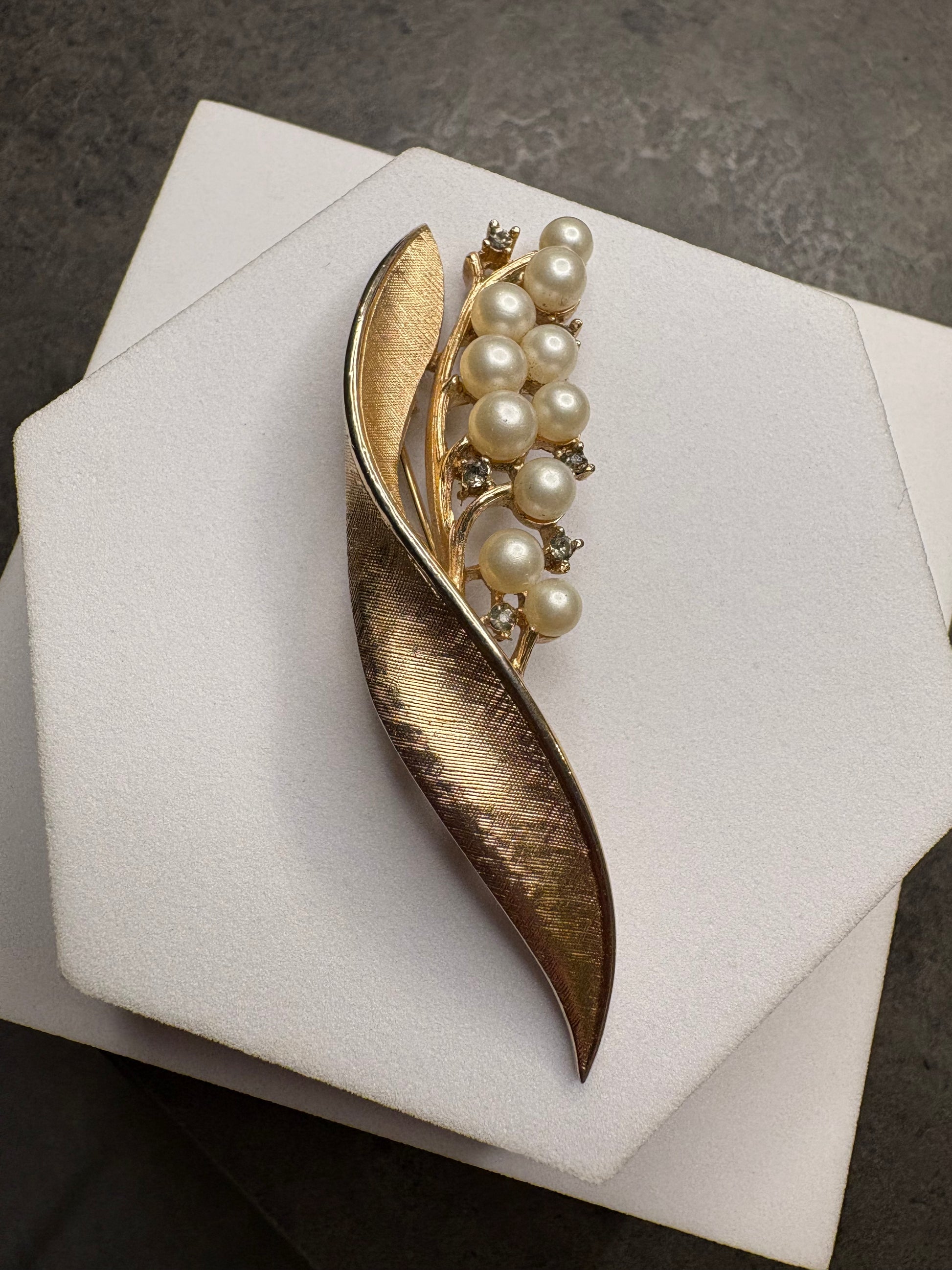 Rara e preziosa spilla vintage firmata Trifari, disegnata dal celebre designer Alfred Philippe e contraddistinta dal numero di brevetto 172560 del 1954. Realizzata in metallo dorato satinato con raffinati contrasti lucidi, questa creazione rappresenta una foglia stilizzata dalla linea sinuosa e dinamica. La superficie alterna zone spazzolate ad aree lucide che esaltano il movimento naturale della forma. La decorazione centrale è composta da un elegante grappolo di perle artificiali luminose, perfettamente bilanciate da piccoli cristalli trasparenti che donano brillantezza discreta e sofisticata. Il design è armonioso e tridimensionale, tipico dello stile ricercato di Philippe per Trifari negli anni ’50. Pezzo raro e da collezione, di grande valore storico e stilistico.