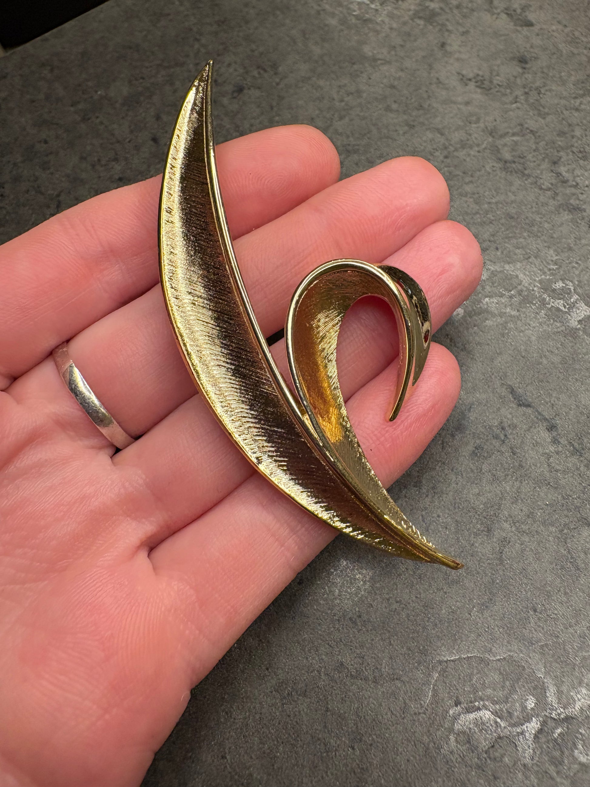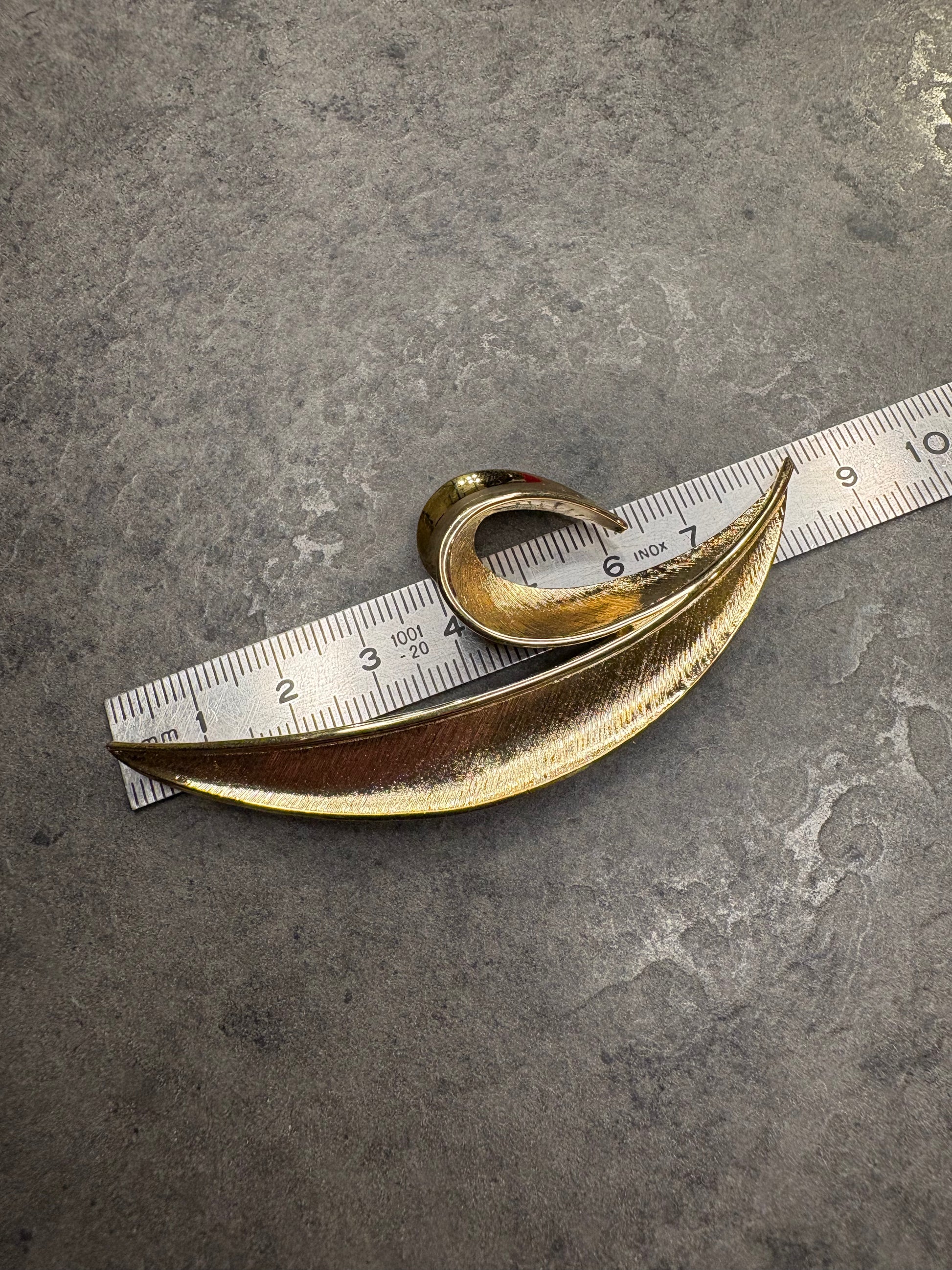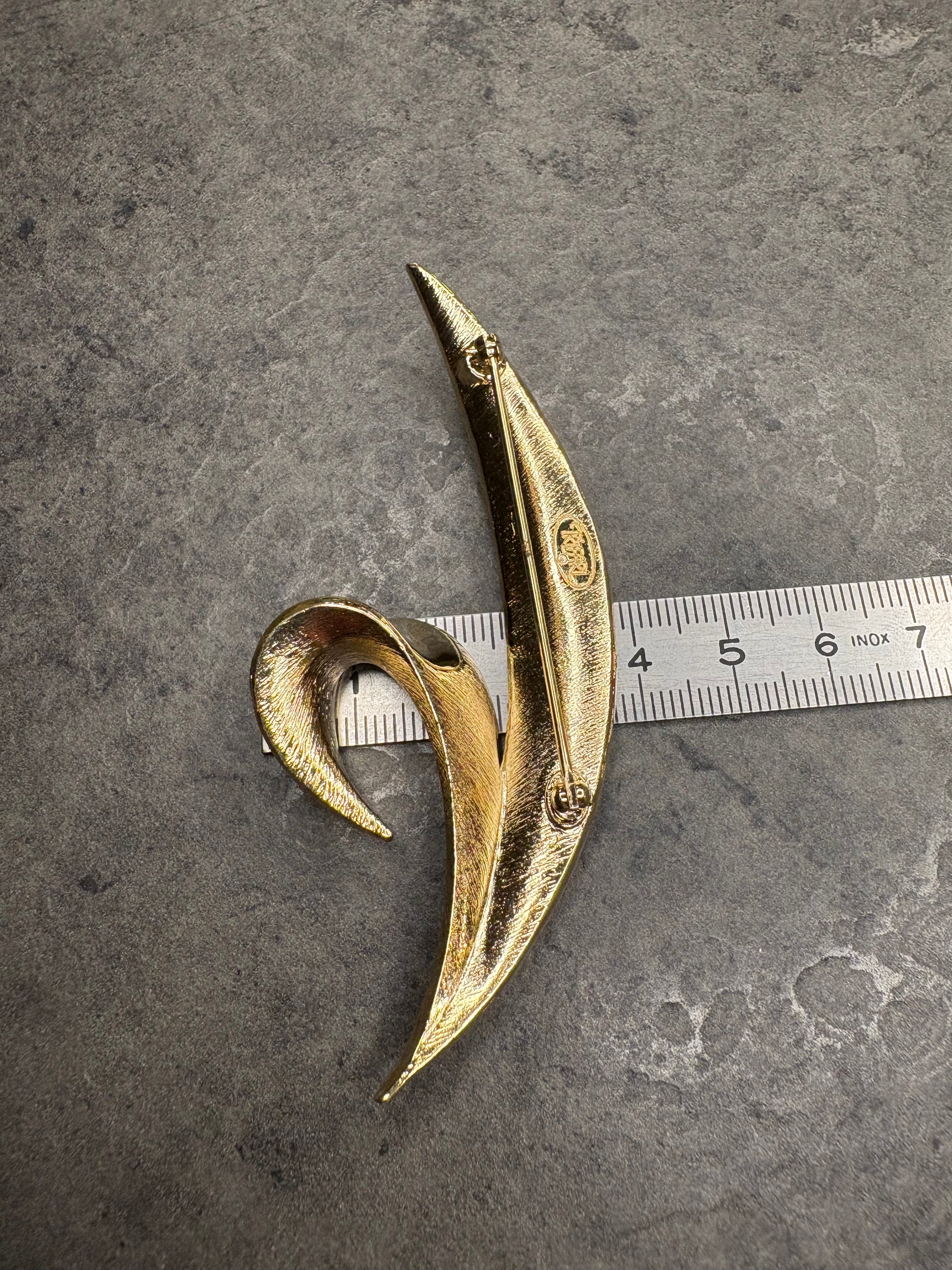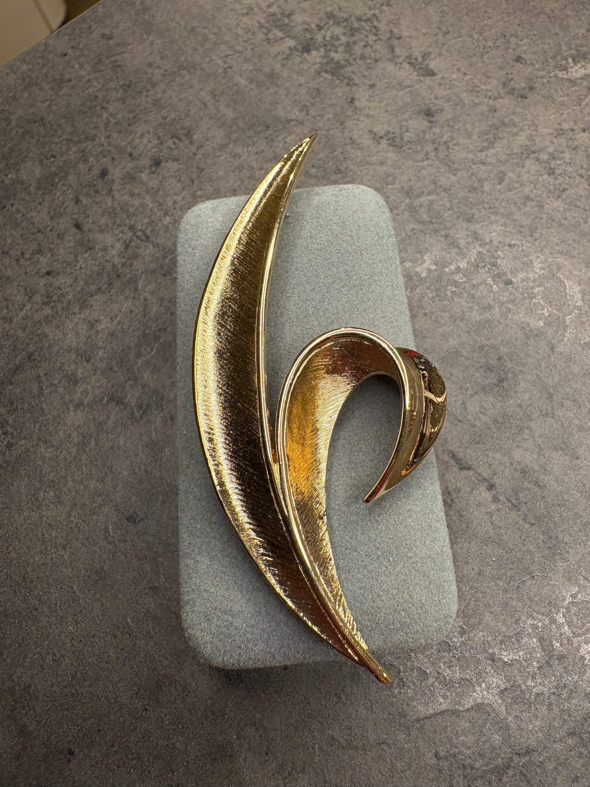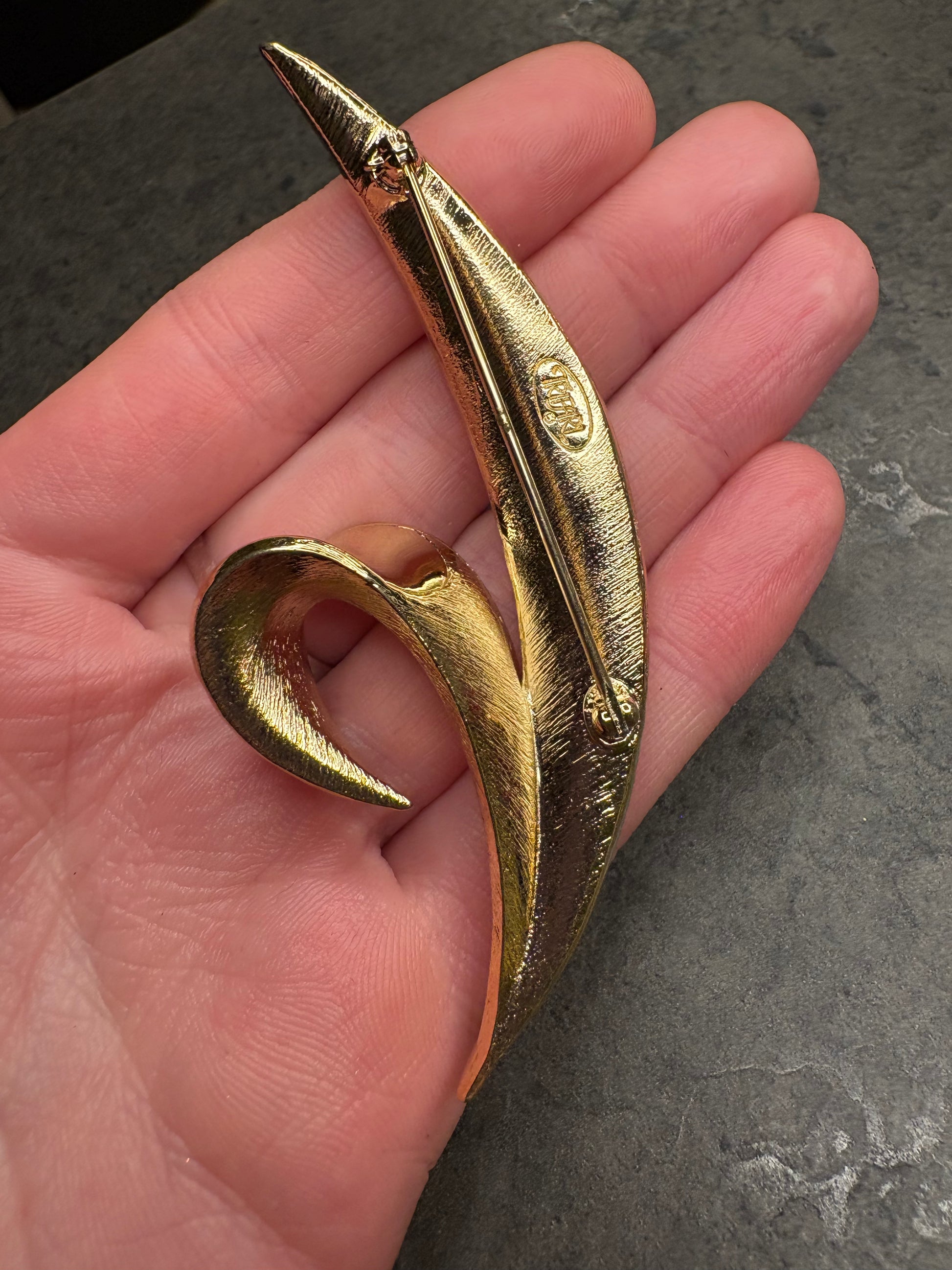 Elegante spilla vintage Trifari risalente agli anni ’70-’80, dal design sinuoso e moderno che riflette perfettamente lo stile sofisticato del marchio in quel periodo. Realizzata in metallo dorato lucido e satinato, presenta una forma astratta a foglia stilizzata dalle linee fluide e dinamiche, simbolo dell’equilibrio tra semplicità e raffinatezza tipico delle creazioni Trifari.