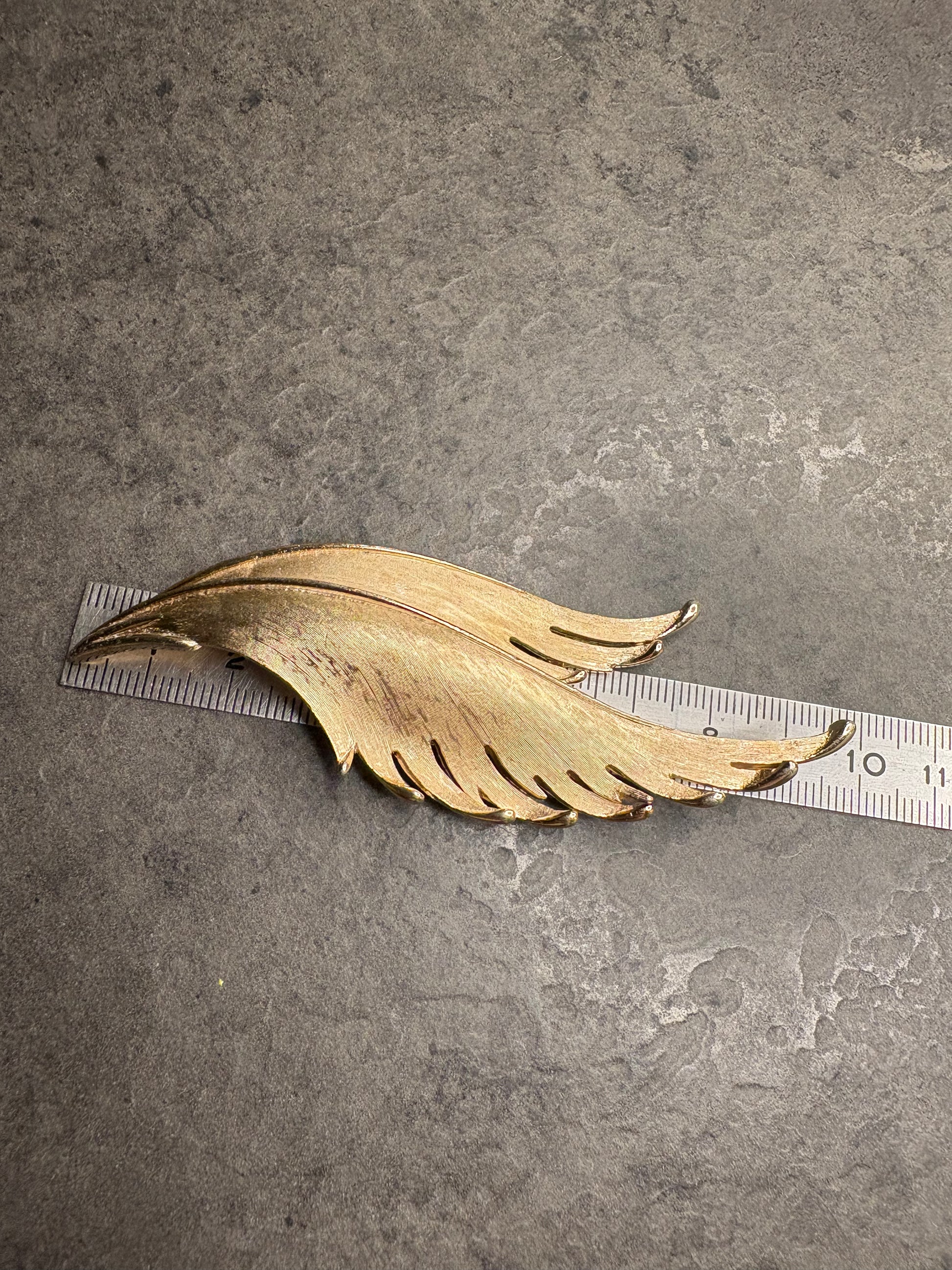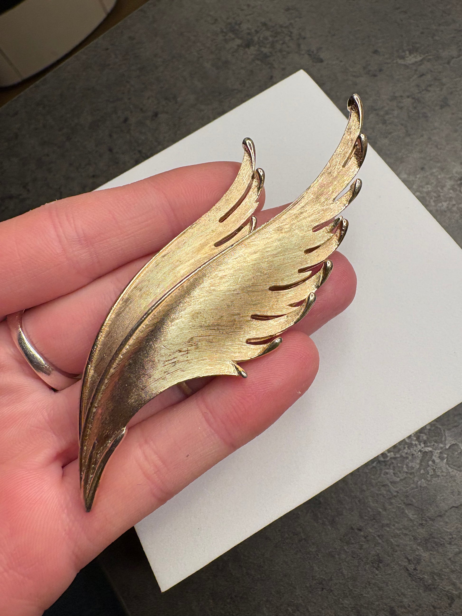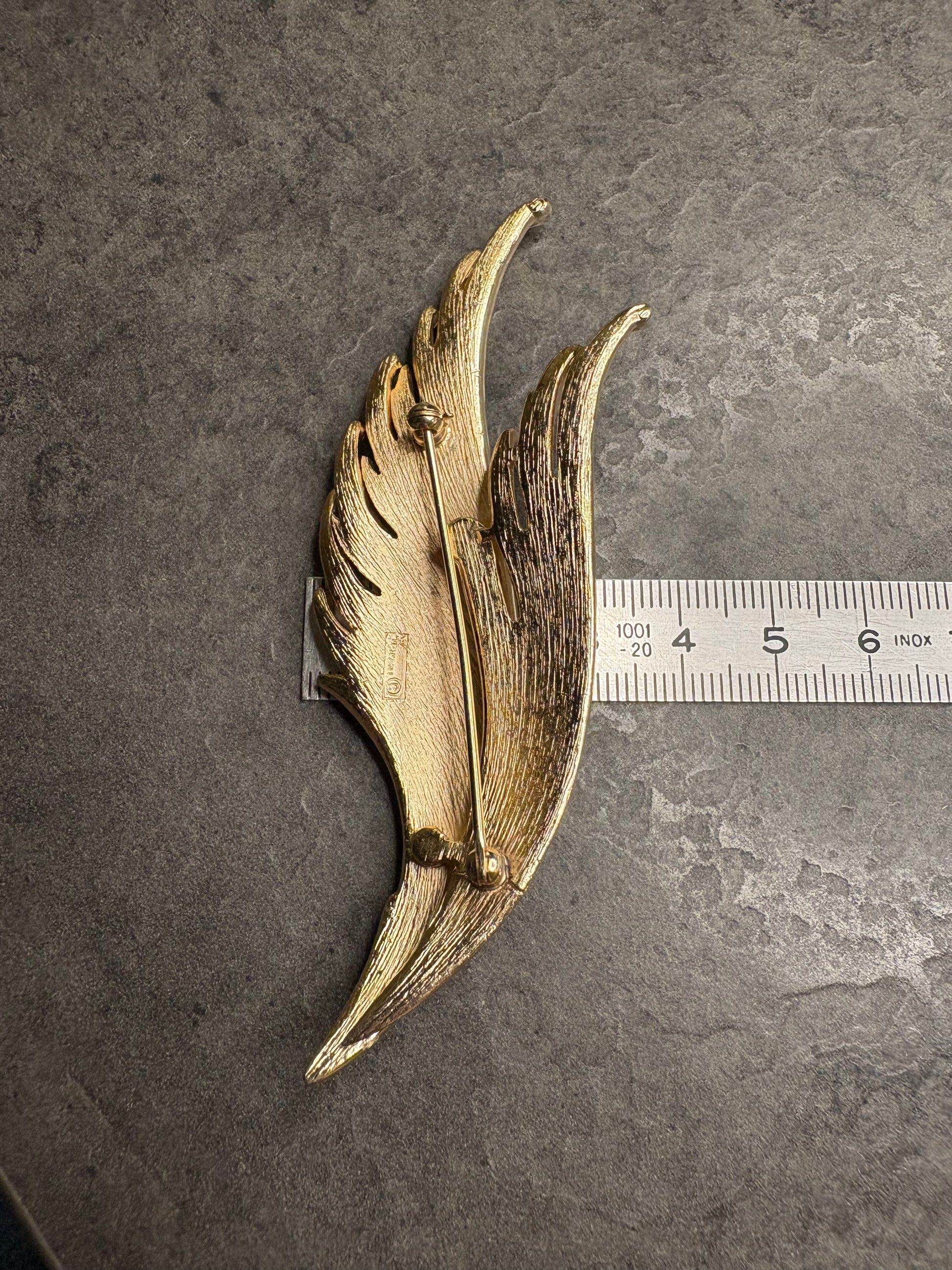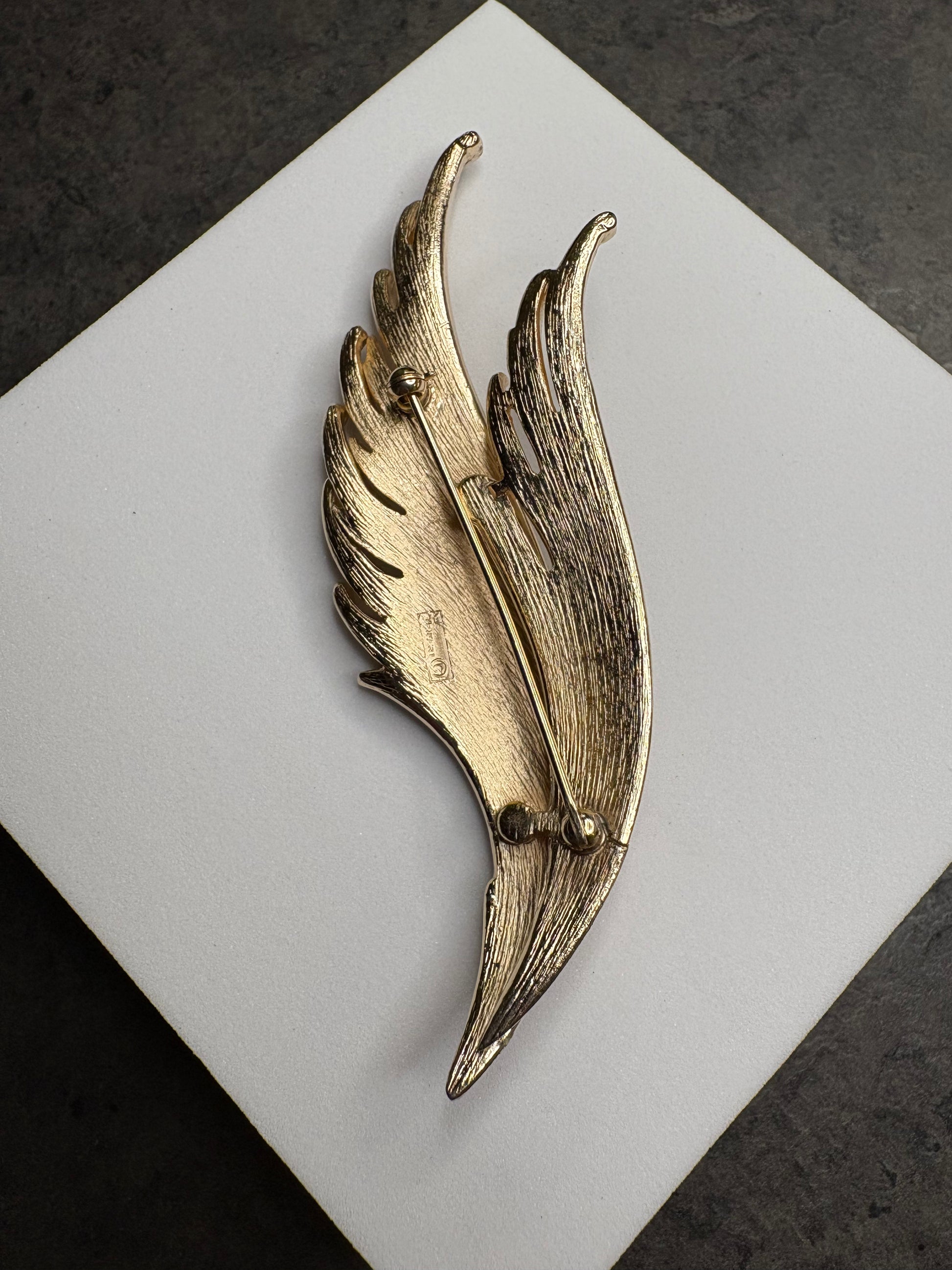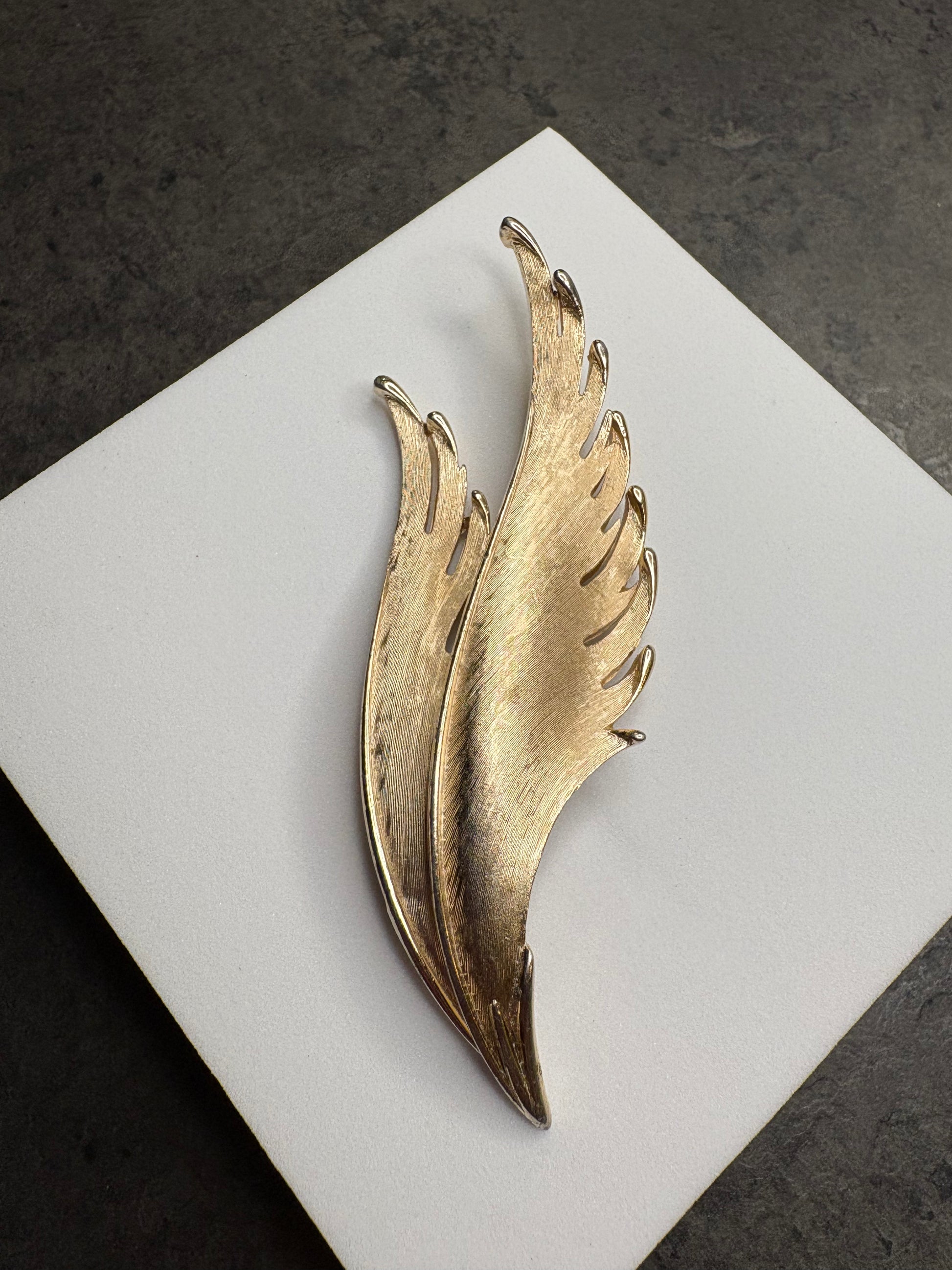 Questa deliziosa spilla vintage di Trifari è ispirata a una ala spiegata o a una grande foglia piumata. La superficie presenta una texture setosa con leggere incisioni che simulano le nervature, creando profondità e movimento. Le punte affusolate e la curvatura fluida conferiscono dinamismo al design, rendendo questa spilla particolarmente scenografica e ideale come pezzo protagonista.