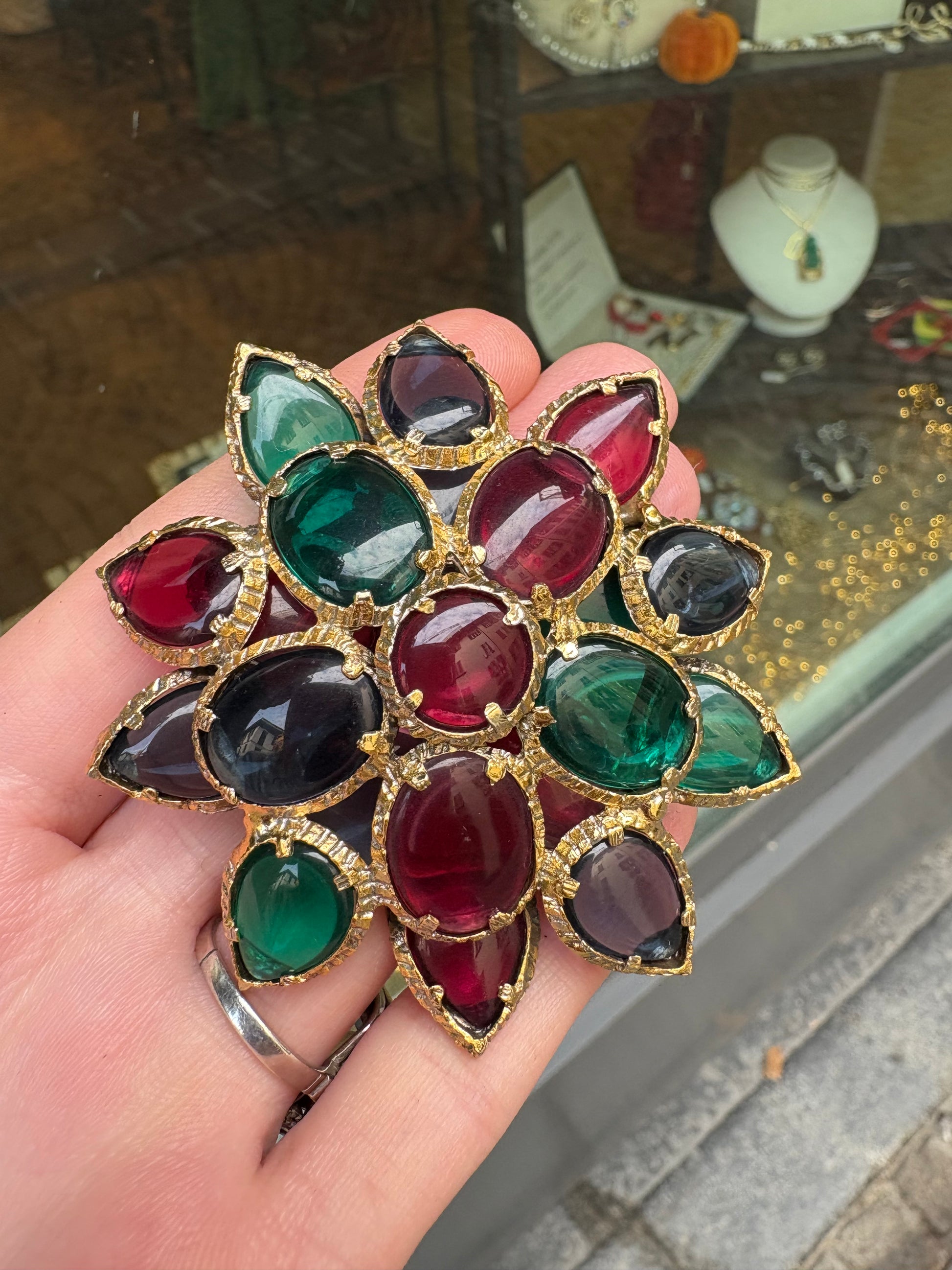 Realizzata in metallo dorato lavorato a rilievo, presenta una composizione floreale di grande impatto scenico, impreziosita da cabochon effetto vetro color rubino, smeraldo e ametista, incastonati in una raffinata montatura dorata con profili cesellati.