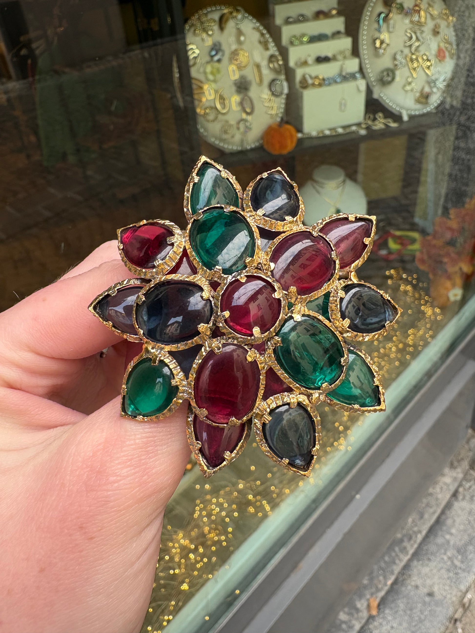 Un autentico capolavoro di bigiotteria d’arte, simbolo dello stile opulento e regale di Trifari, perfetto da indossare su una giacca, un abito elegante o per impreziosire un foulard.